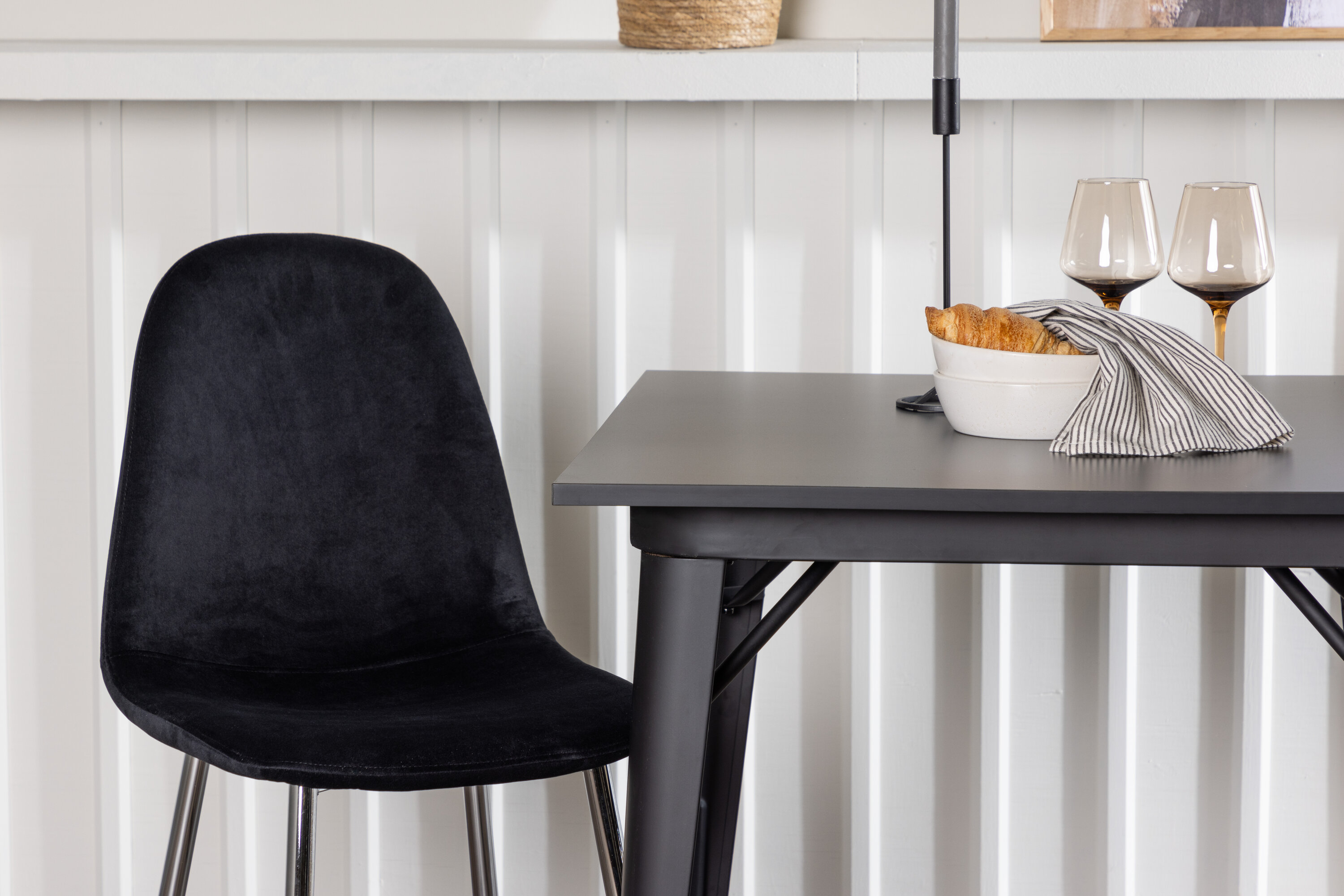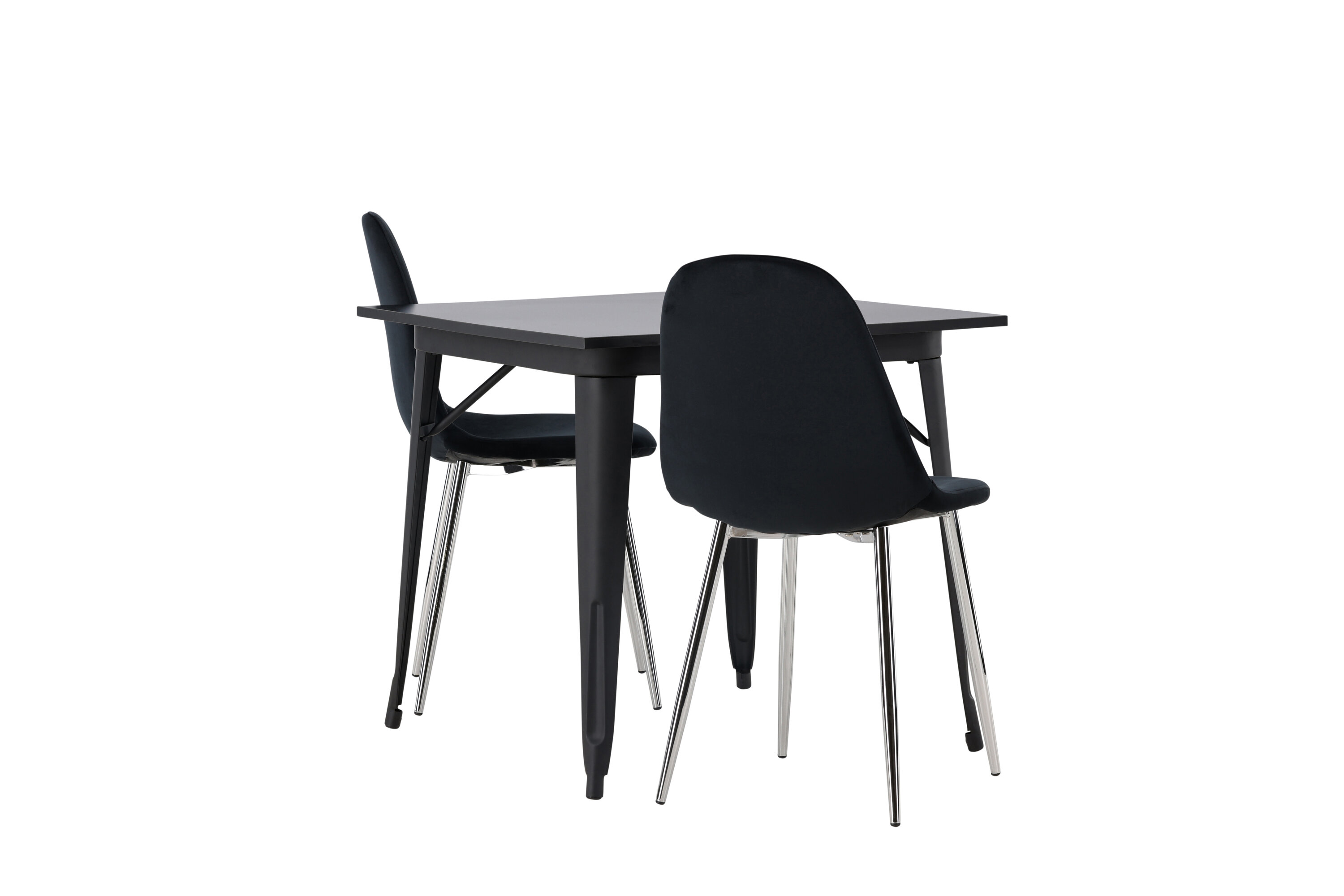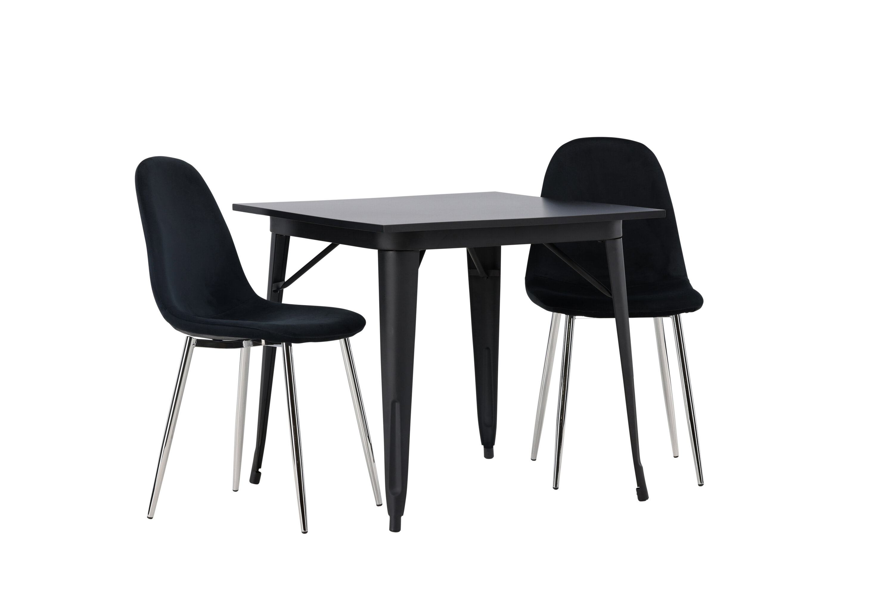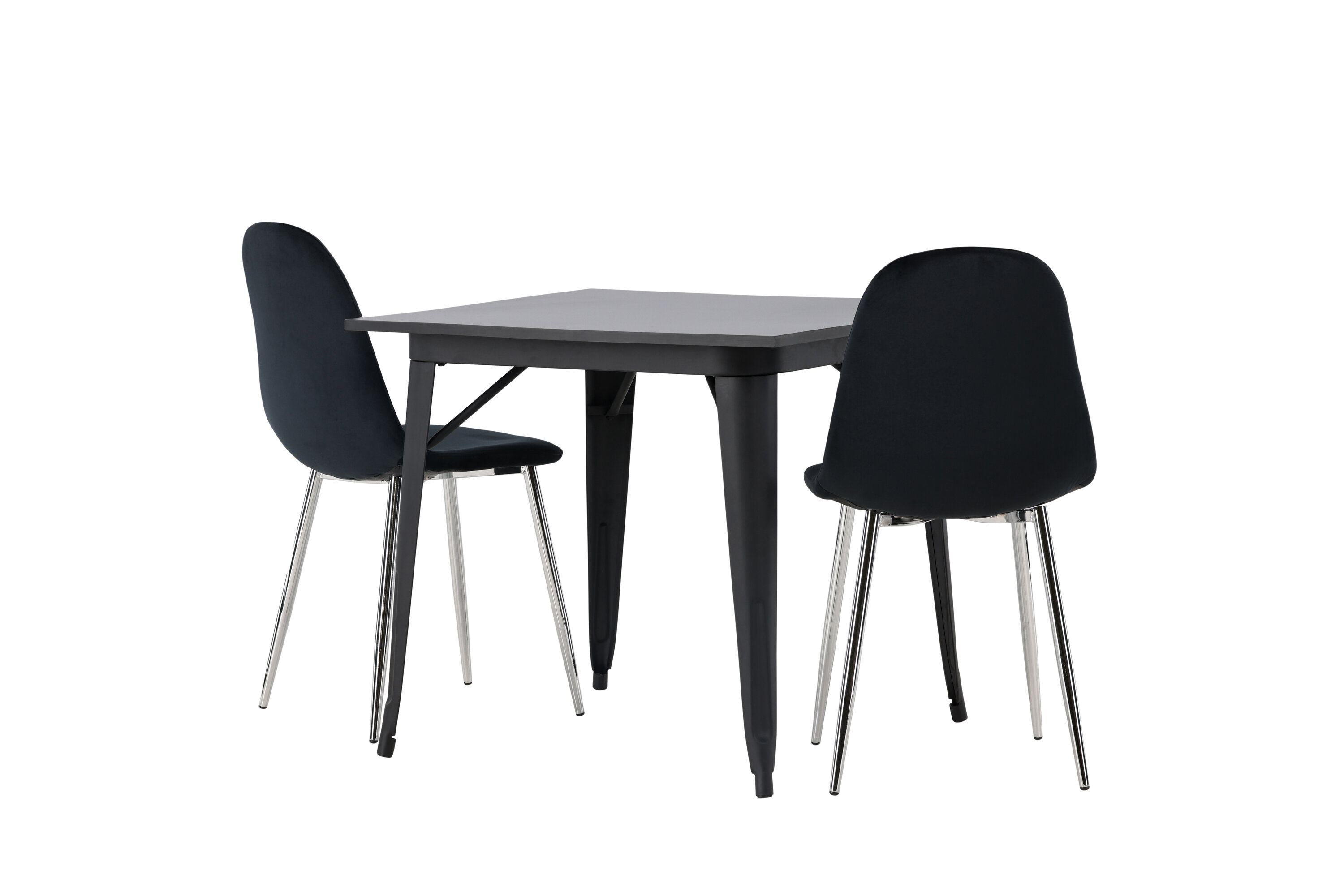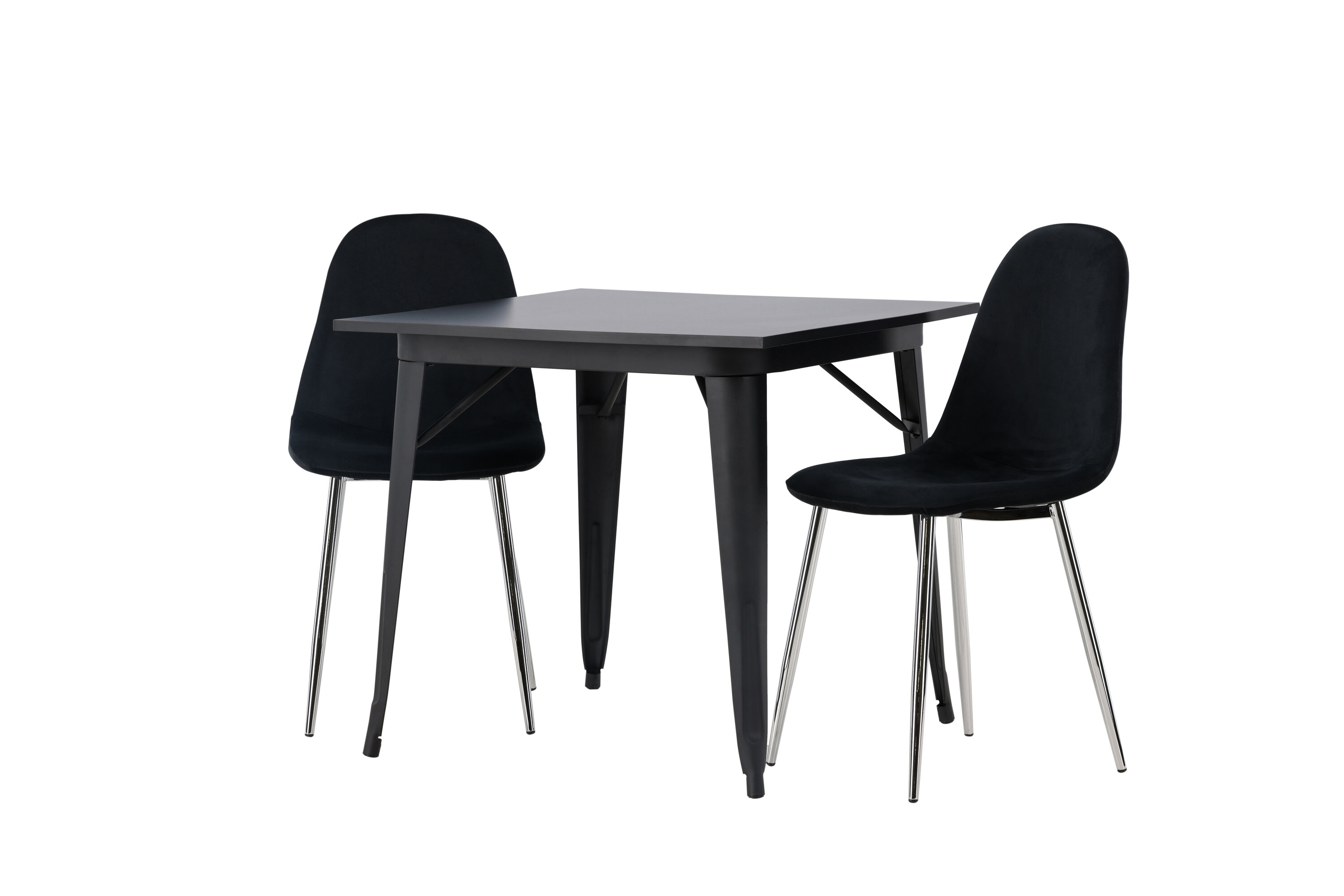 Sitzen Sie bequem in unserer wunderbaren Essensgruppe für zwei! Unser quadratischer Esstisch Tempe hat eine gepflegte Größe und ein trendiges, skandinavisches Design. Hergestellt mit einer Tischplatte aus schwarzem MDF und Tischbeinen aus schwarzem Metall. Hier in moderner Kombination mit schwarzen Esszimmerstühlen aus der Serie Polar. Der Stuhl hat ein vollständig gepolstertes Design mit Beinen aus verchromtem Metall, einer leicht abgerundeten Rückenlehne und einem Sitz aus elegantem schwarzem Samtstoff mit weicher Polsterung für zusätzlichen Komfort. So stilvoll wie bequem! Tischabmessungen: 80x80cm.