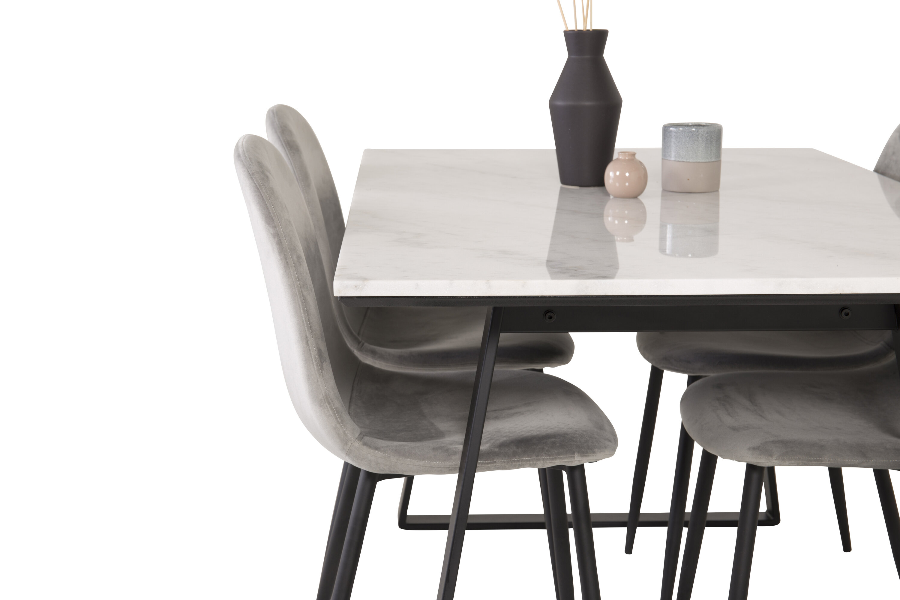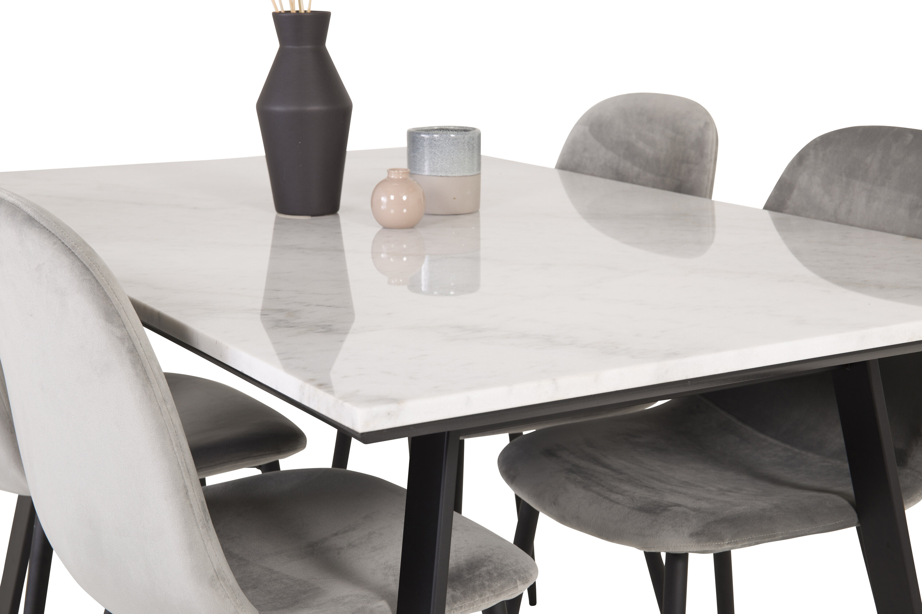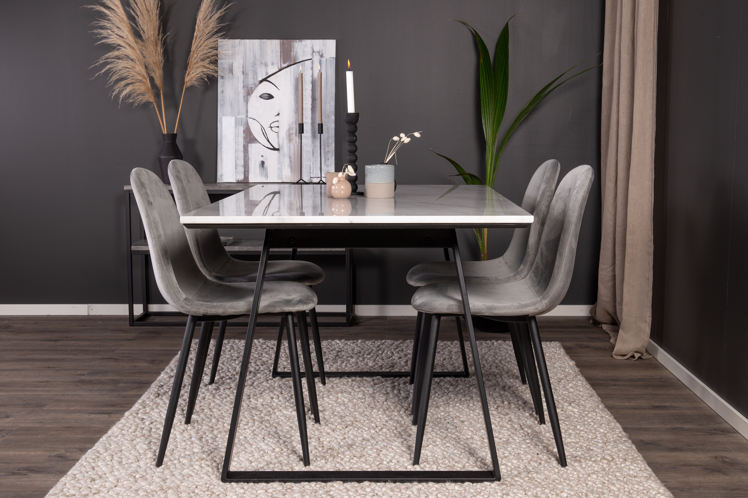 Unser köstlicher Esstisch Estelle in stilvoller Marmor-Optik zusammen mit unseren grauen Esstischen Polar. Verkleiden Sie Ihre Lebensmittelgruppe mit einem anderen Dekor rundum, so gut für den Alltag wie für eine Party!