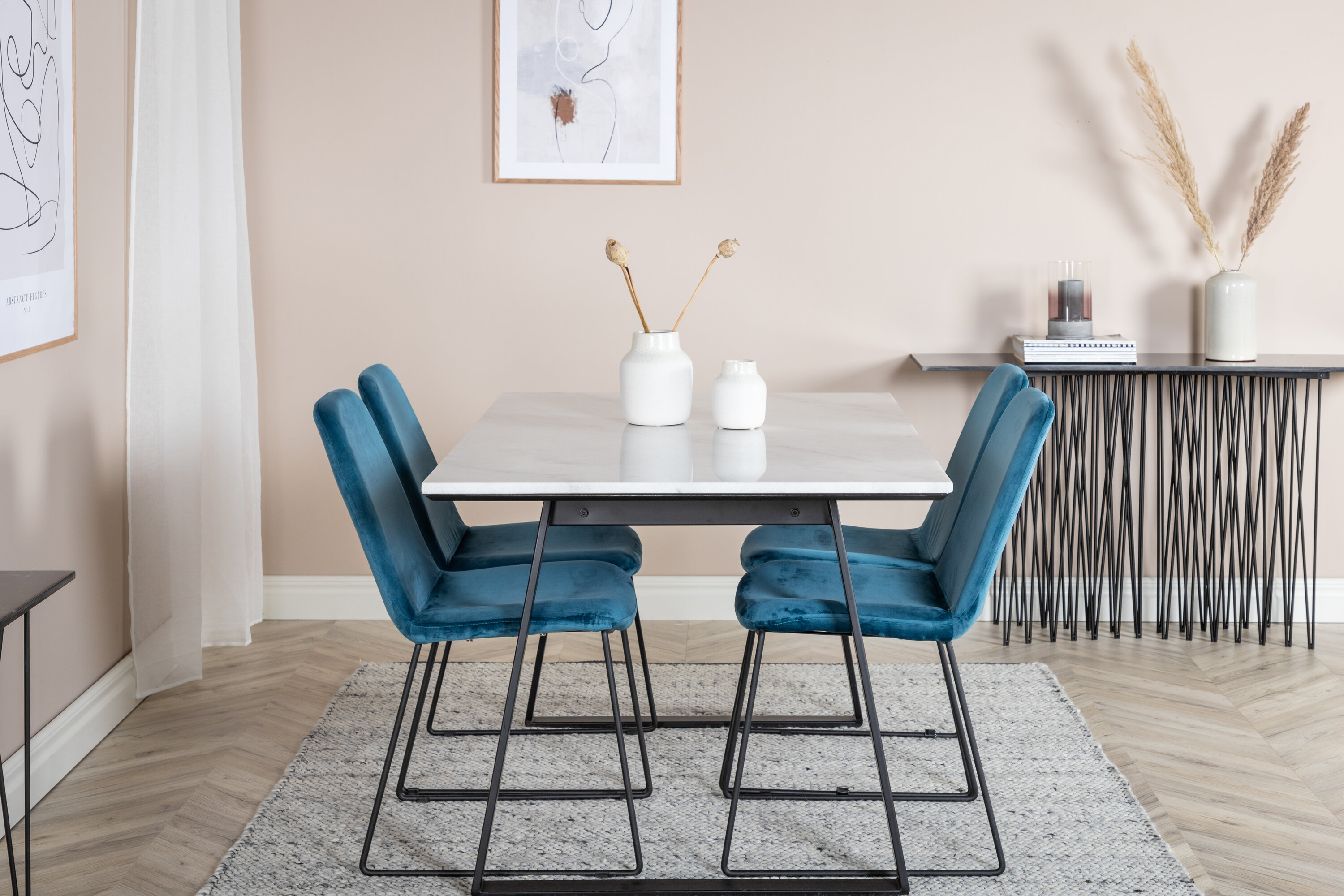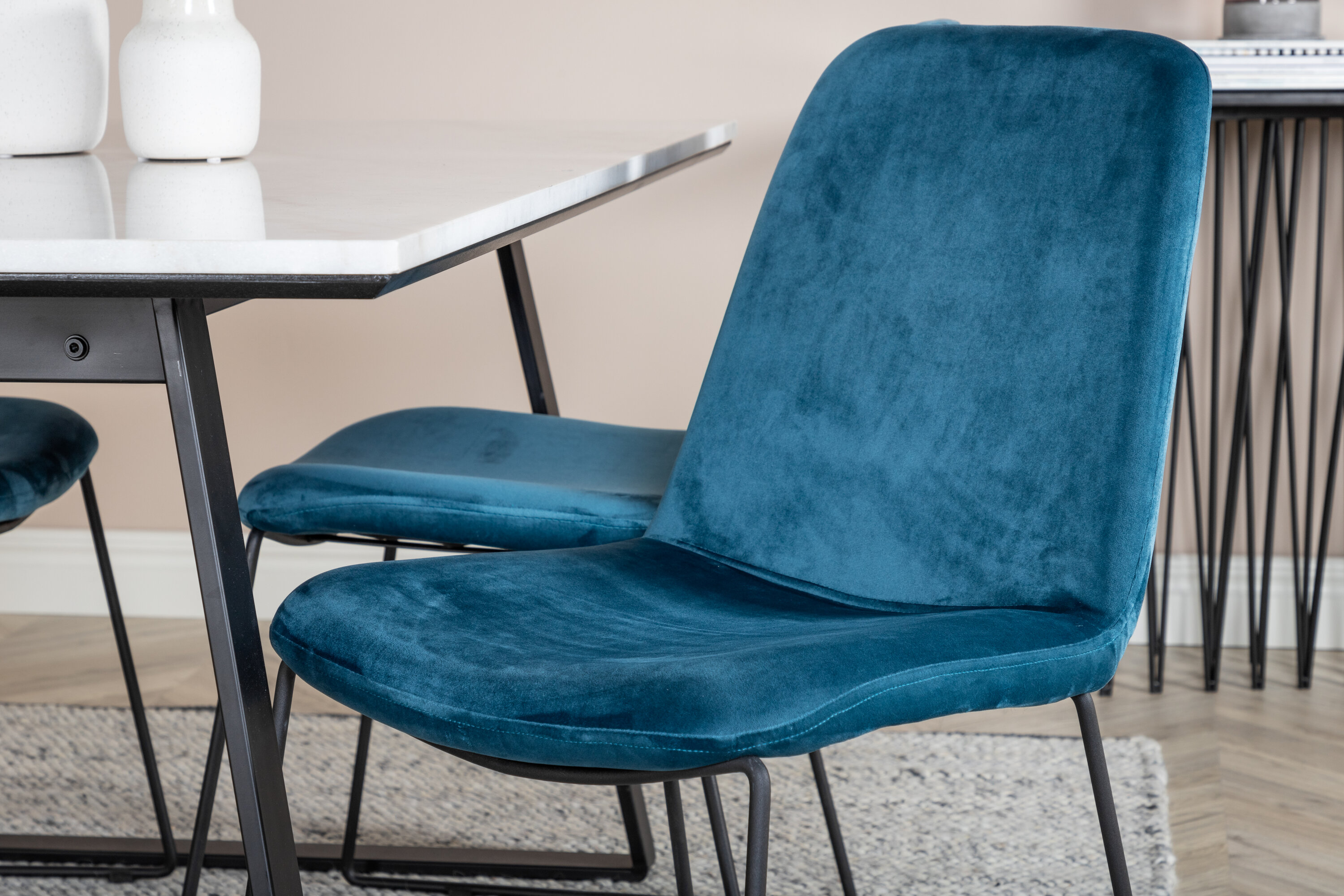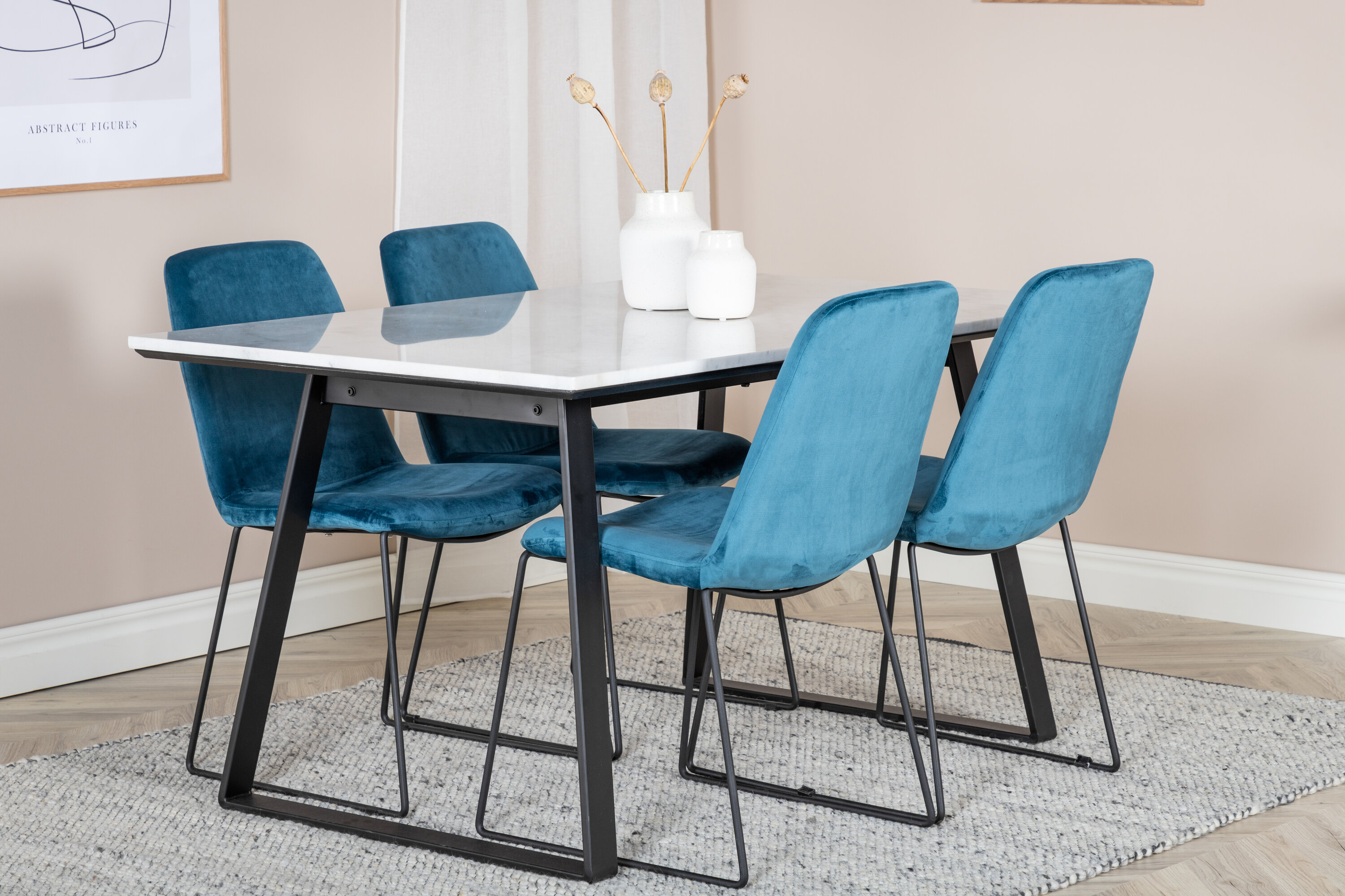 Esstisch Estelle zusammen mit Essstühlen der Serie Muce - bequem, gemütlich und einladend! Schöne Farben, die Raum im Raum schaffen und zu vielen wunderbaren gesellschaftlichen Momenten einladen.