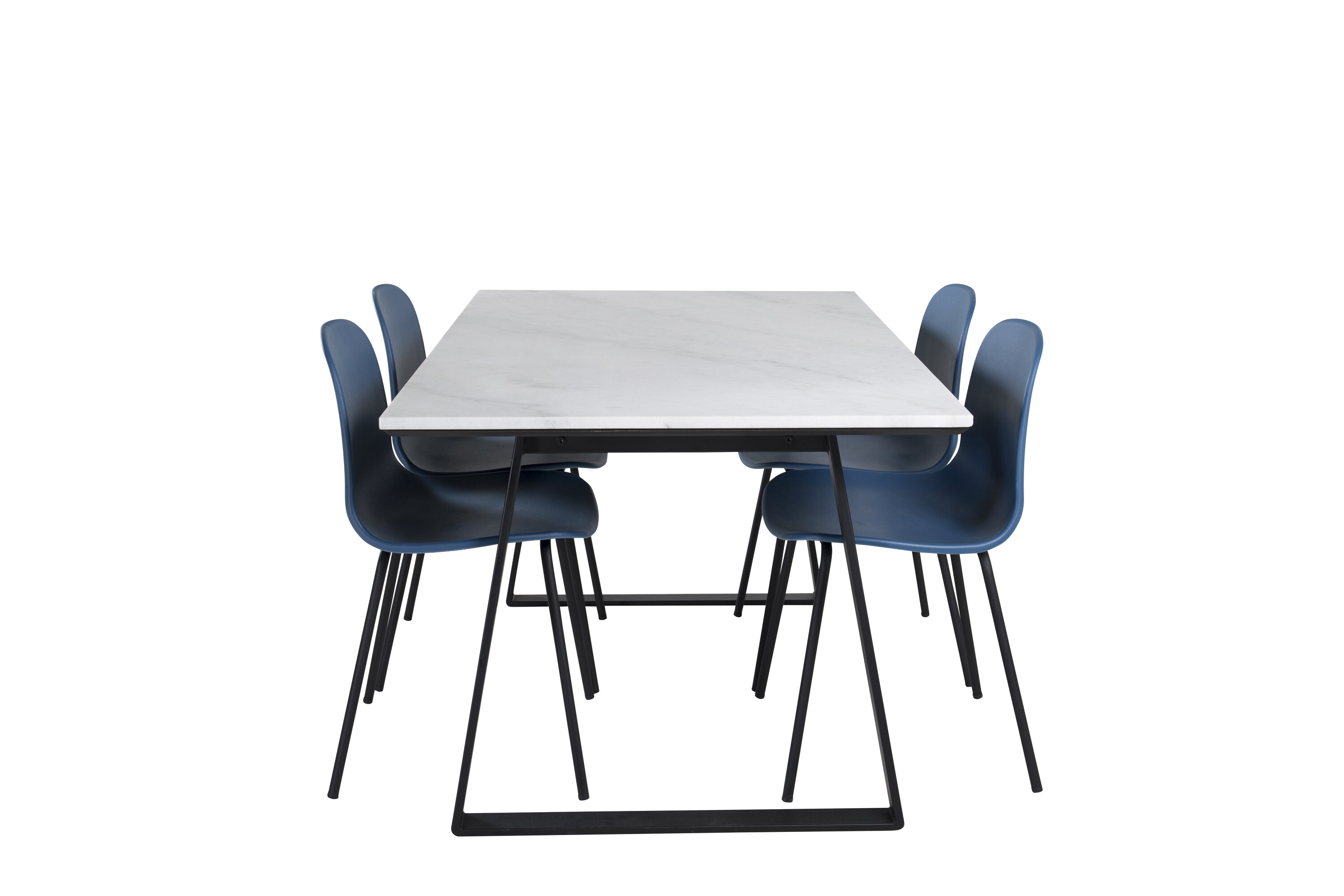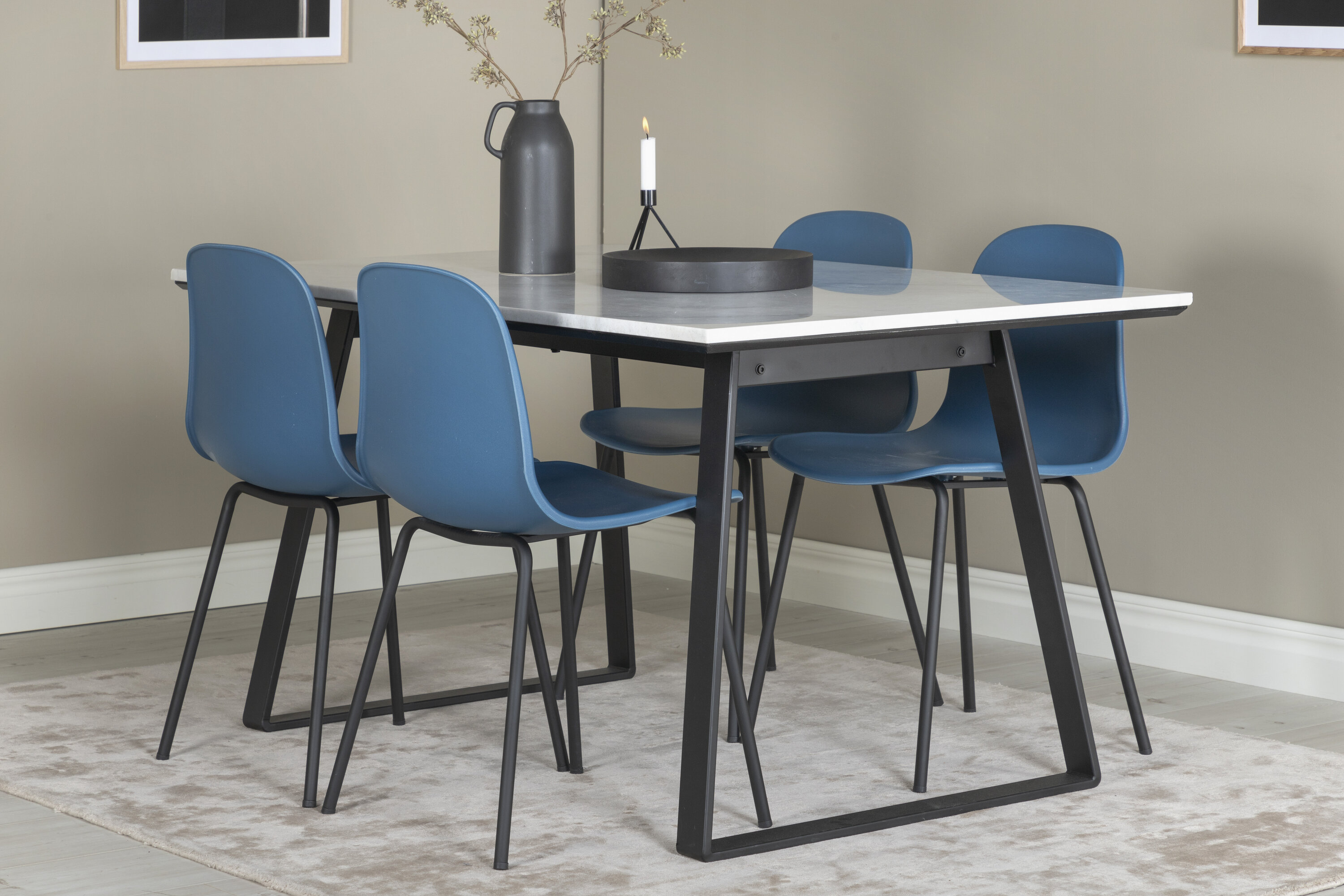 Unser schöner Marmor-Esstisch mit den blauen Esszimmerstühlen Arctic. Setzen Sie die Farbe des Hauses und laden Sie zu vielen wunderbaren Momenten in der Zukunft ein!