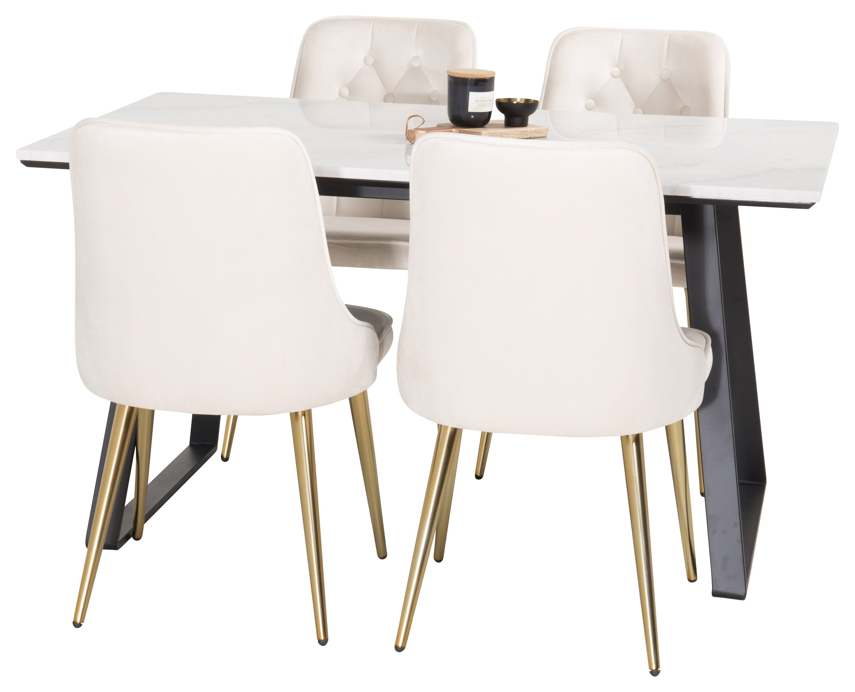 Unser schöner Marmor-Esstisch zusammen mit bequemen Esszimmerstühlen aus der Velvet-Serie. Hier erhalten Sie eine Lebensmittelgruppe, die direkt Luxus und Eleganz vermittelt. Verkleiden Sie Ihre Lebensmittelgruppe mit einem anderen Dekor rundum, so gut für den Alltag wie für eine Party!