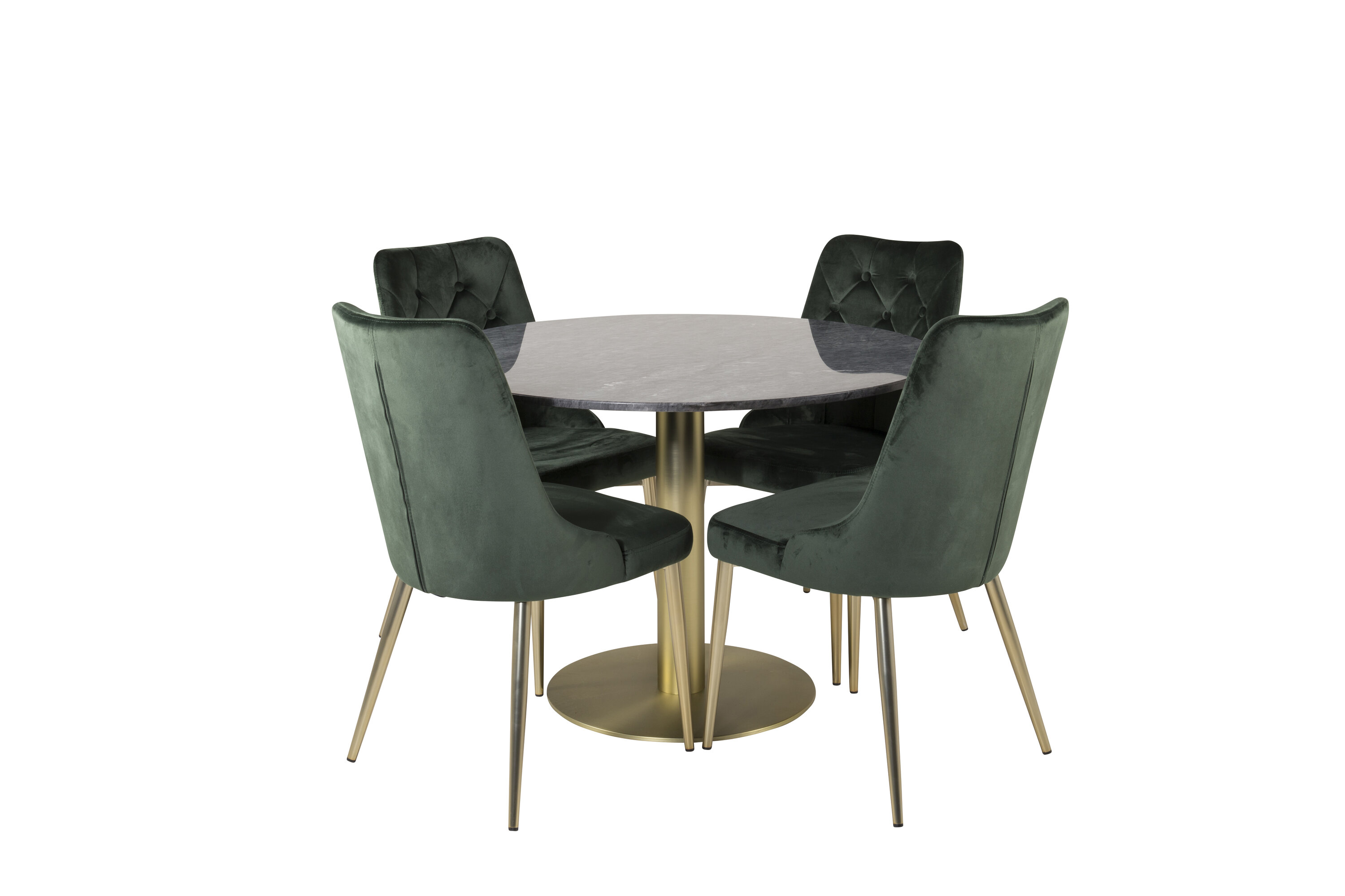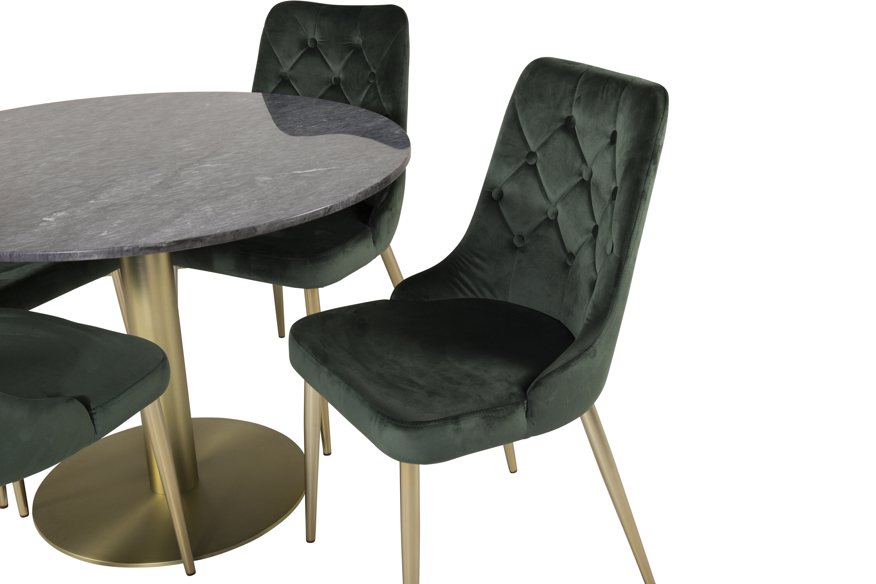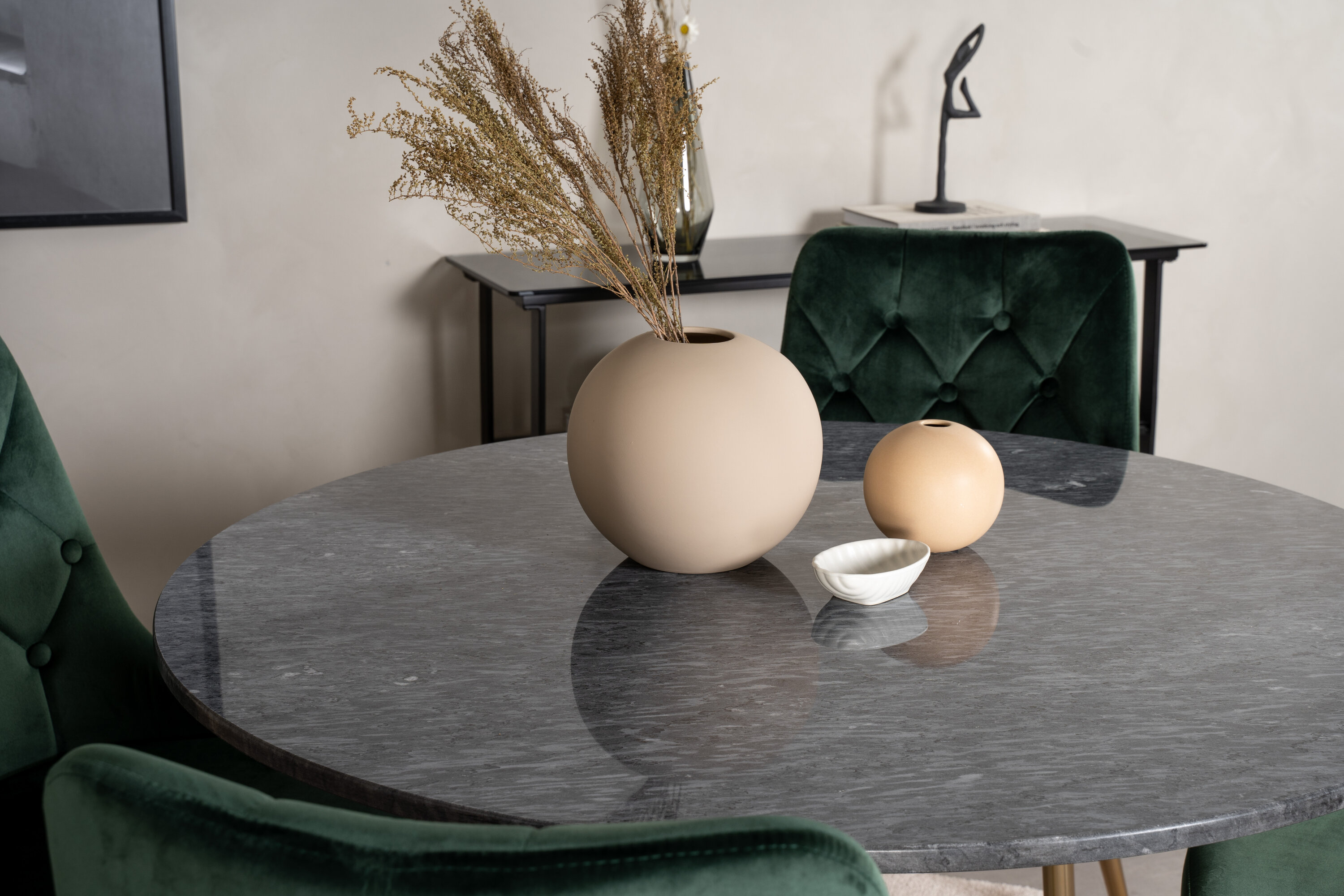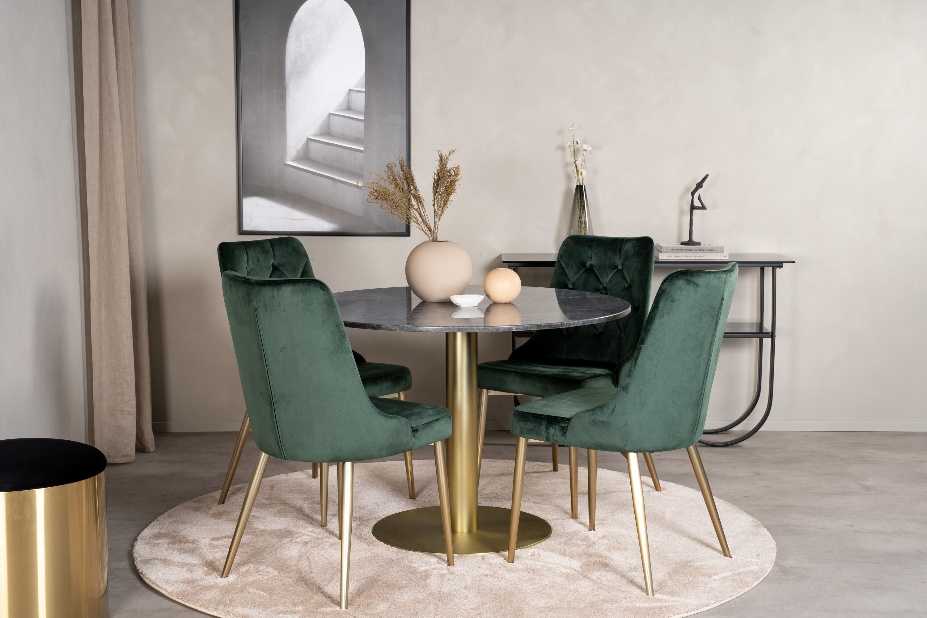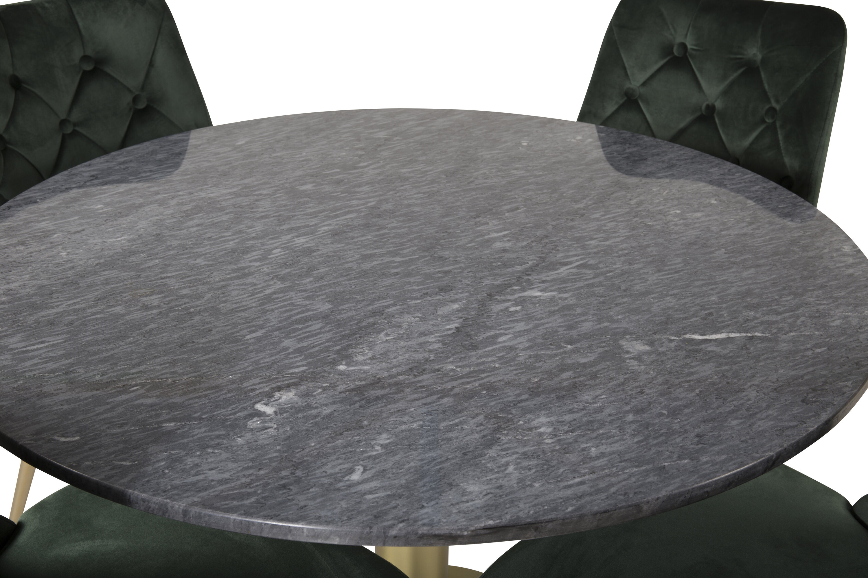 Der elegante Marmor-Esstisch der Serie Estelle wird hier mit den bequemen und stilvollen Esszimmerstühlen der Serie Velvet kombiniert. Eine Lebensmittelgruppe, die sich zu sehr nach Hause sehnt!