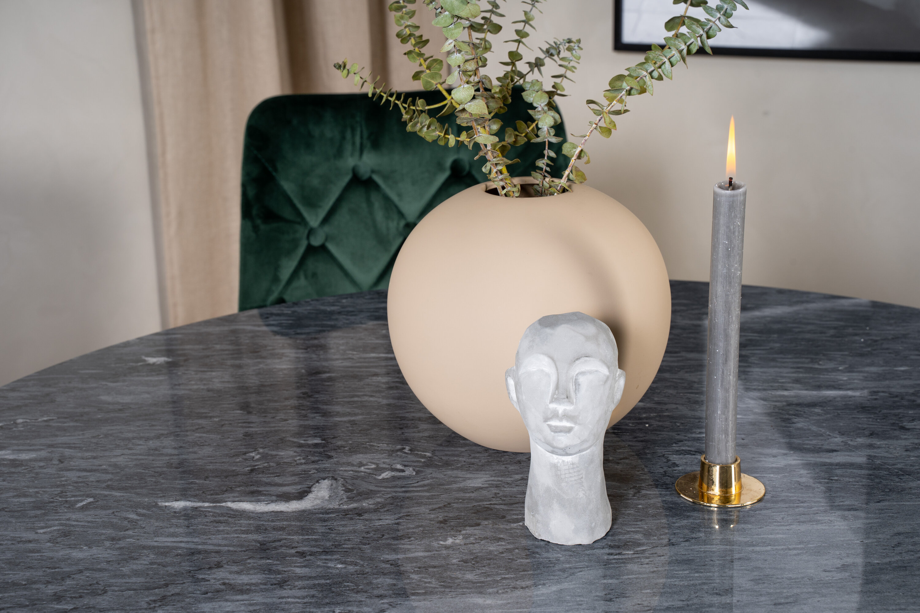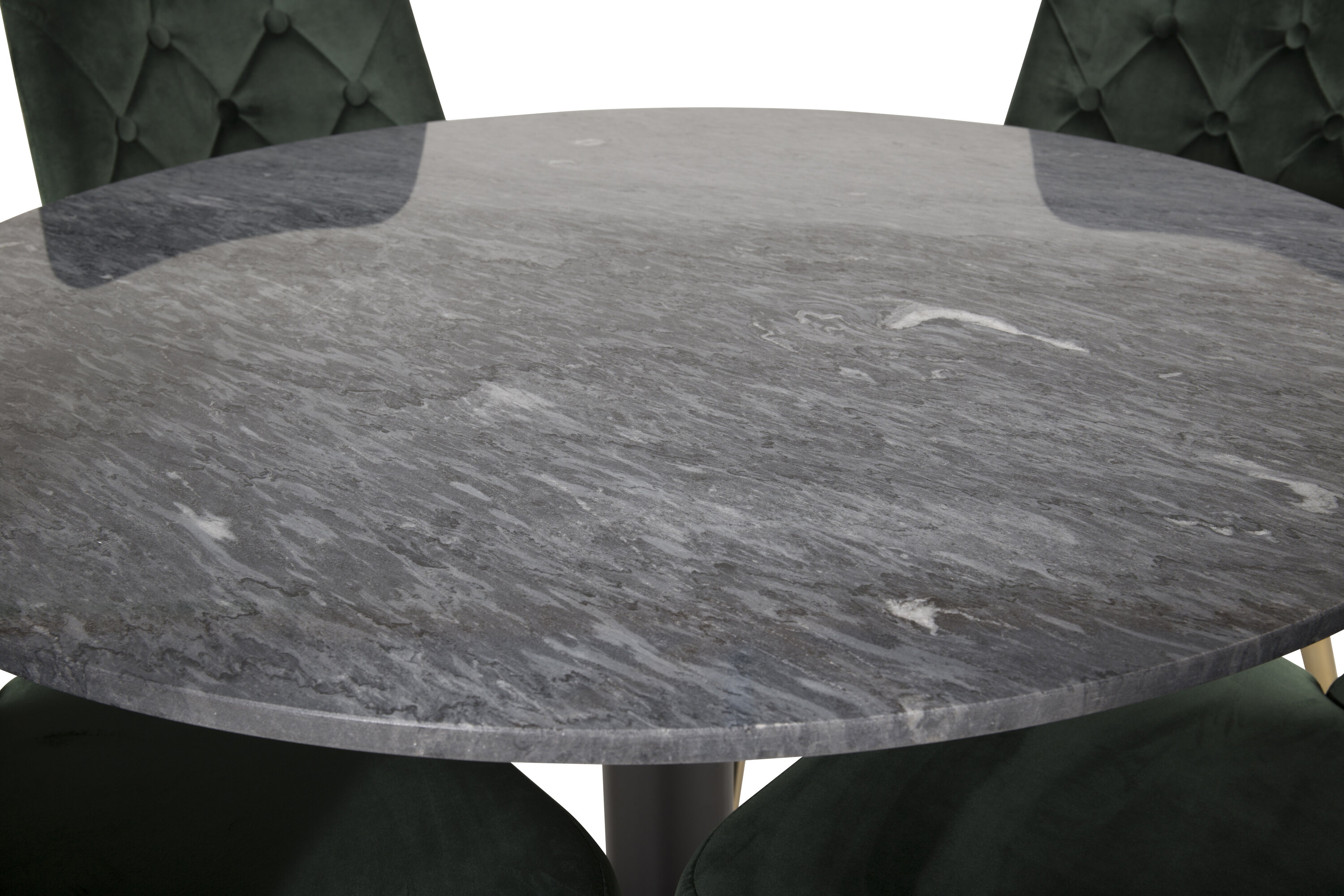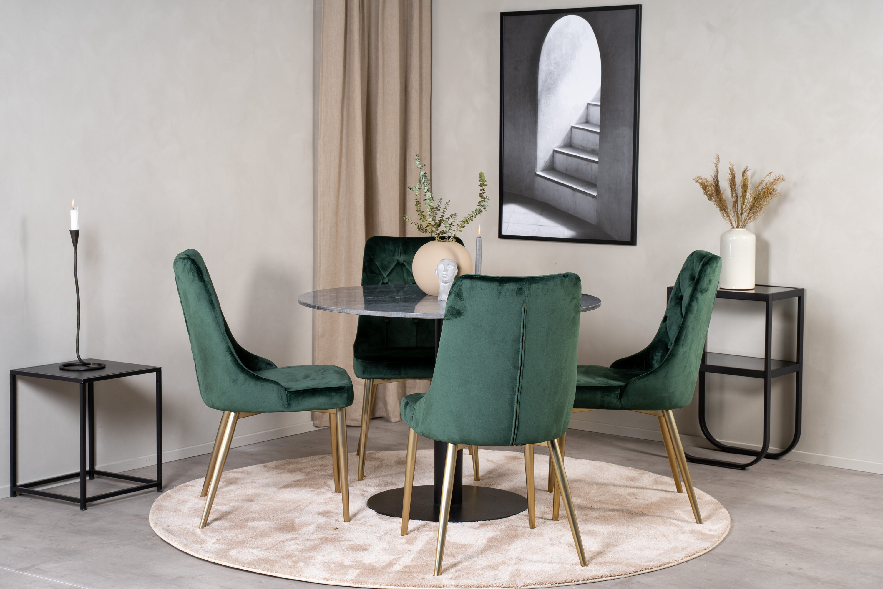 Hier wird der elegante Esstisch aus Marmor in der Serie Estelle mit luxuriösen Stühlen aus der Serie Velvet kombiniert.