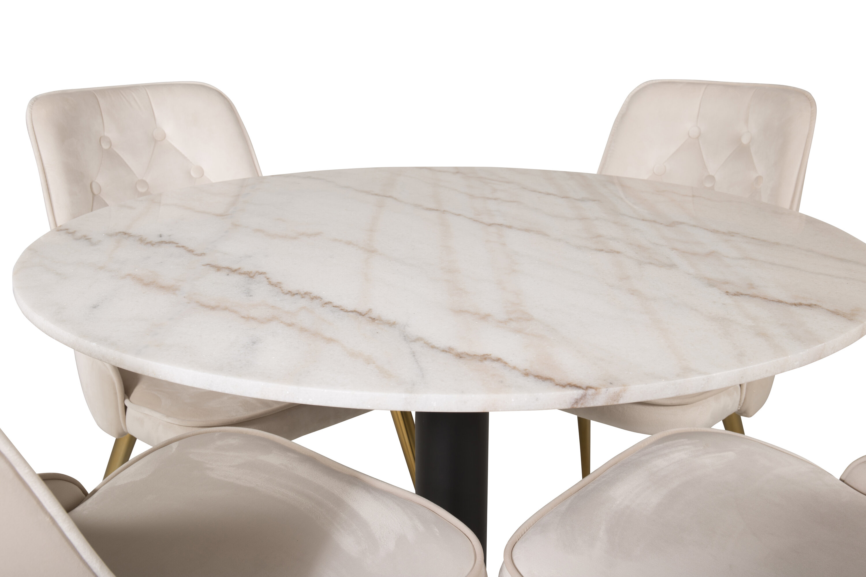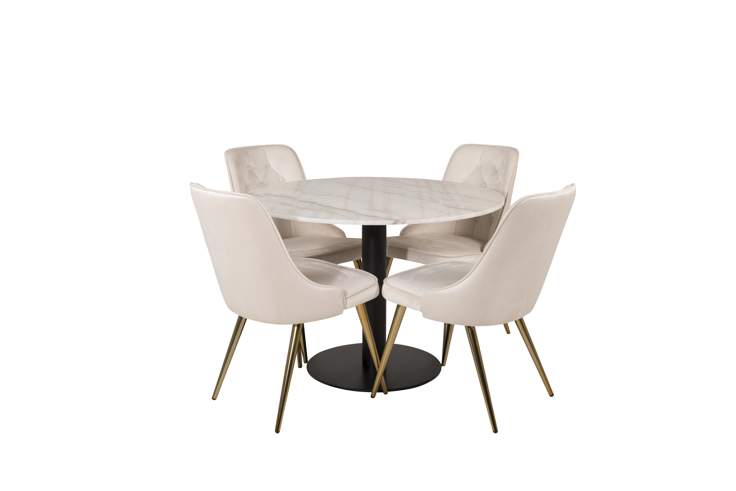 Eine einladende und moderne Essensgruppe mit warmem und familiärem Gefühl! Versammeln Sie die Familie um unseren eleganten Esstisch Estelle. Hier zusammen mit eleganten Esszimmerstühlen der Serie Velvet - lassen Sie die Zeit am Esstisch zu einem der heutigen Highlights werden!