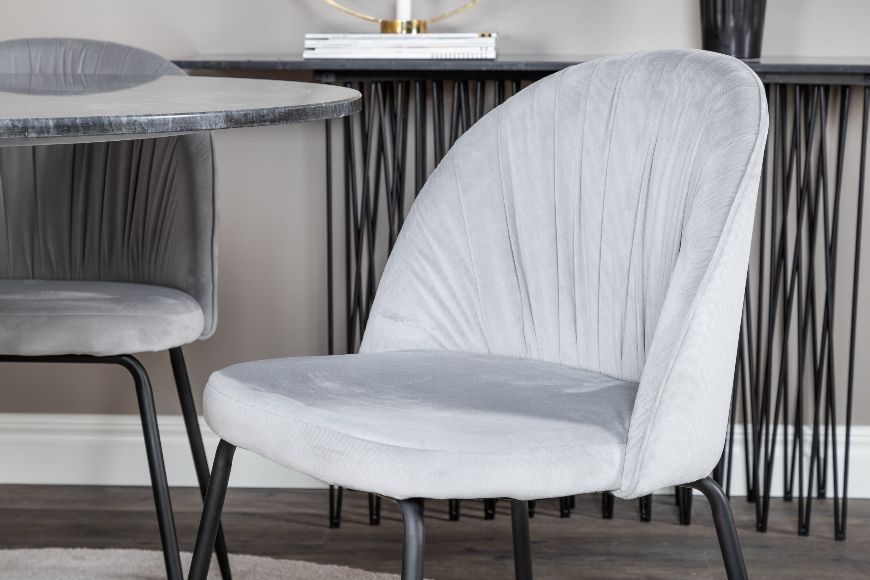 Esstisch Estelle in schlankem Design, dazu stilvolle graue Esszimmerstühle Wrinkles - die perfekte Kombination für alle, die eine trendige Food-Gruppe suchen.