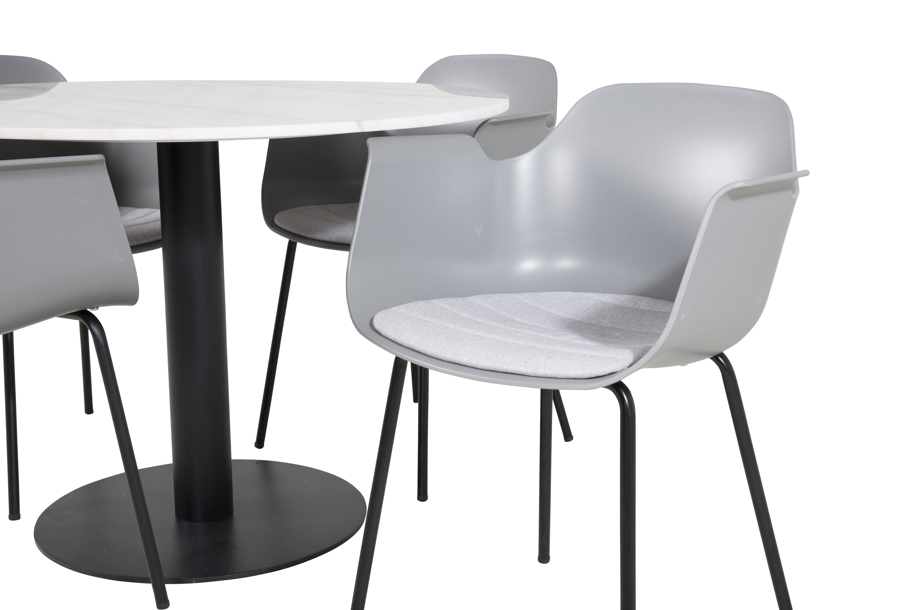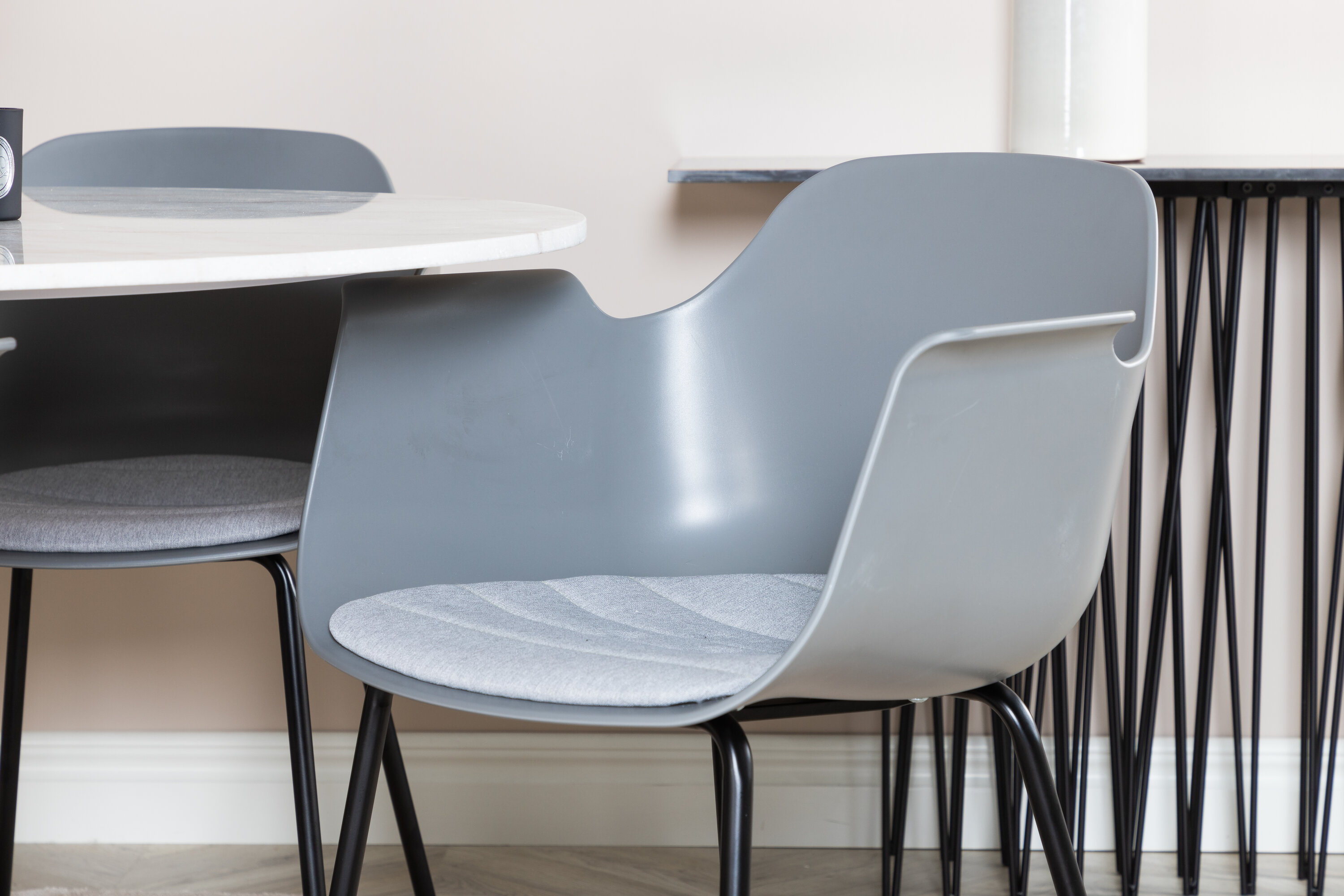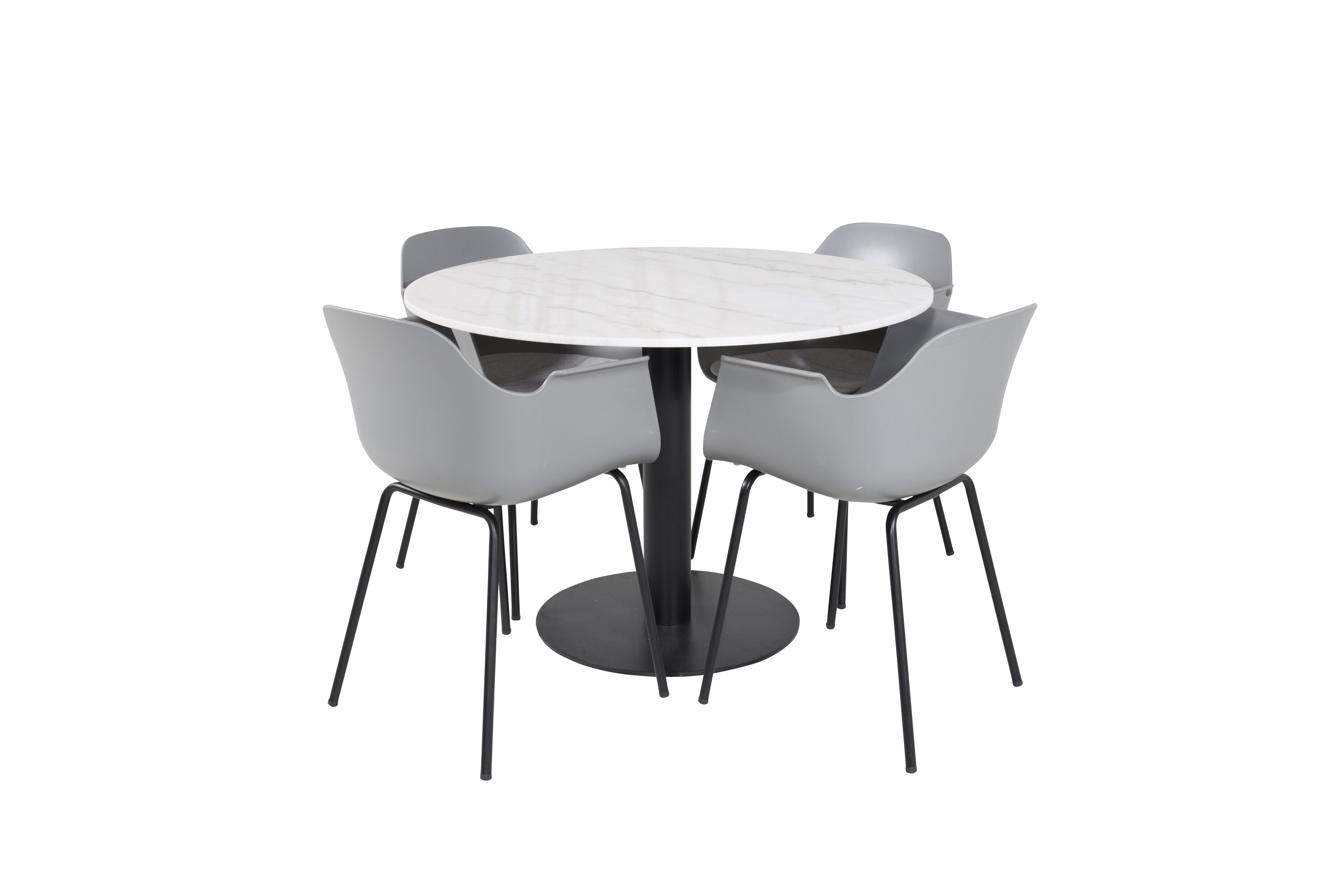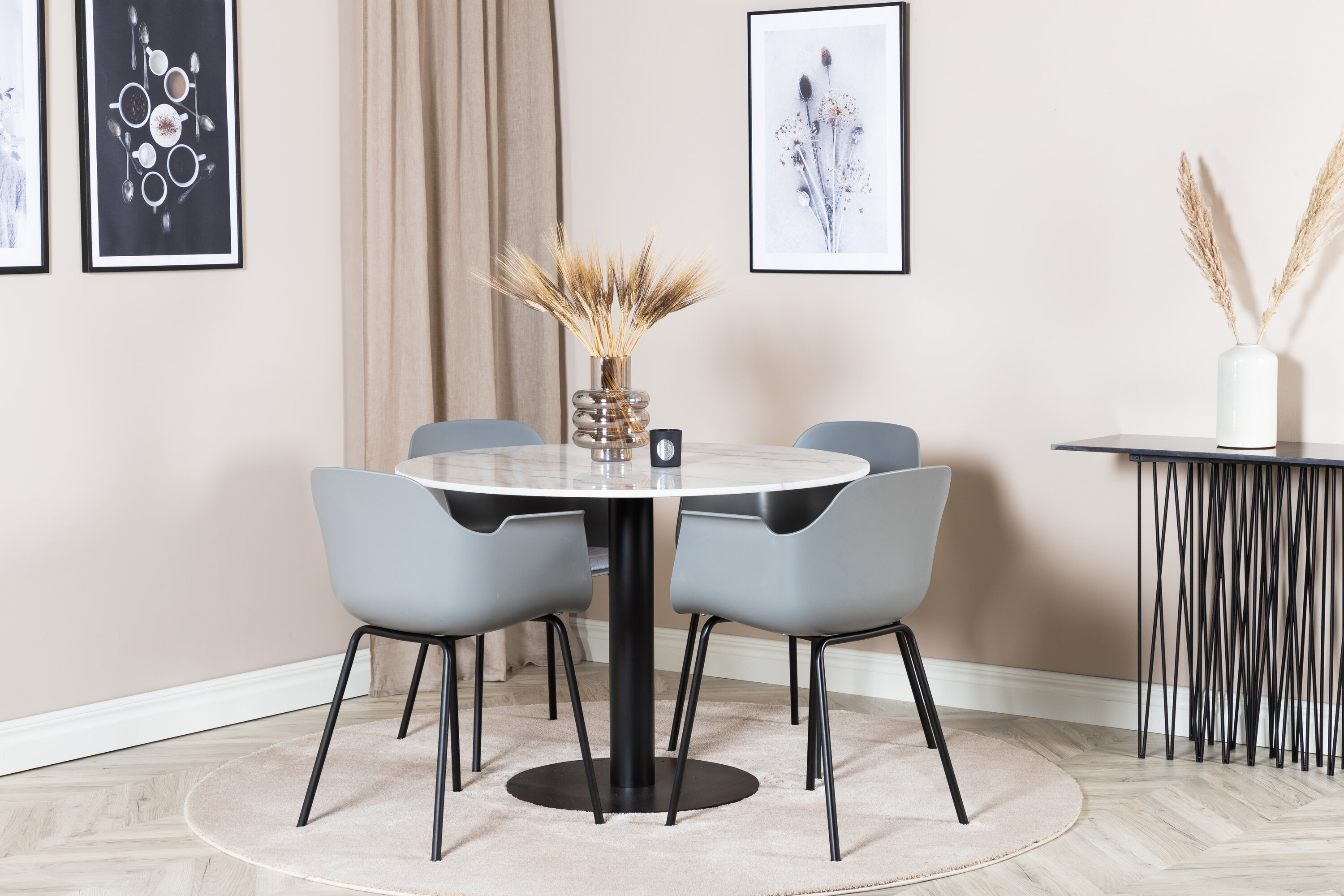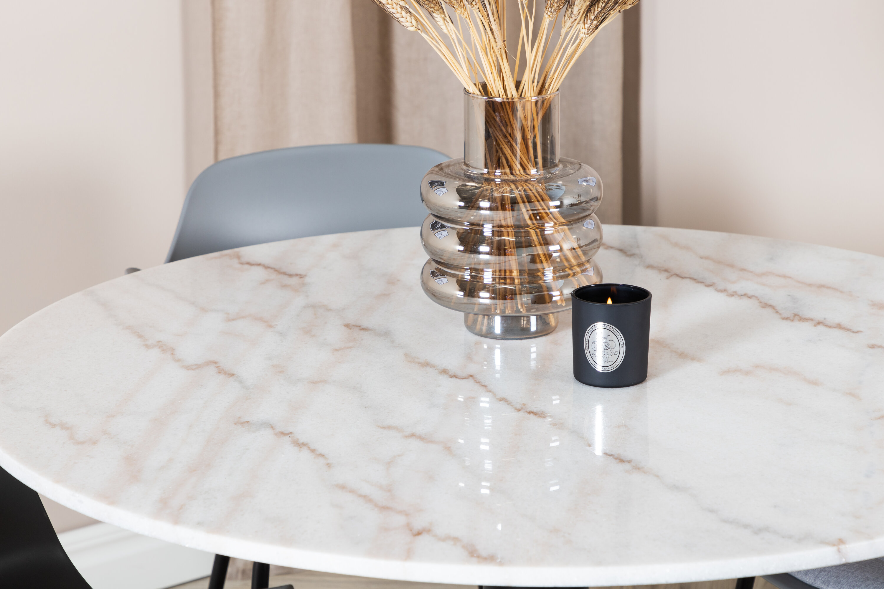 Der elegante Marmor-Esstisch der Serie Estelle wird hier mit Rahmenstühlen der Serie Comfort im trendigen Design kombiniert. Die Lebensmittelgruppe ist wie gemacht für diejenigen, die ein gemütliches und modernes Gefühl zu Hause schaffen wollen.