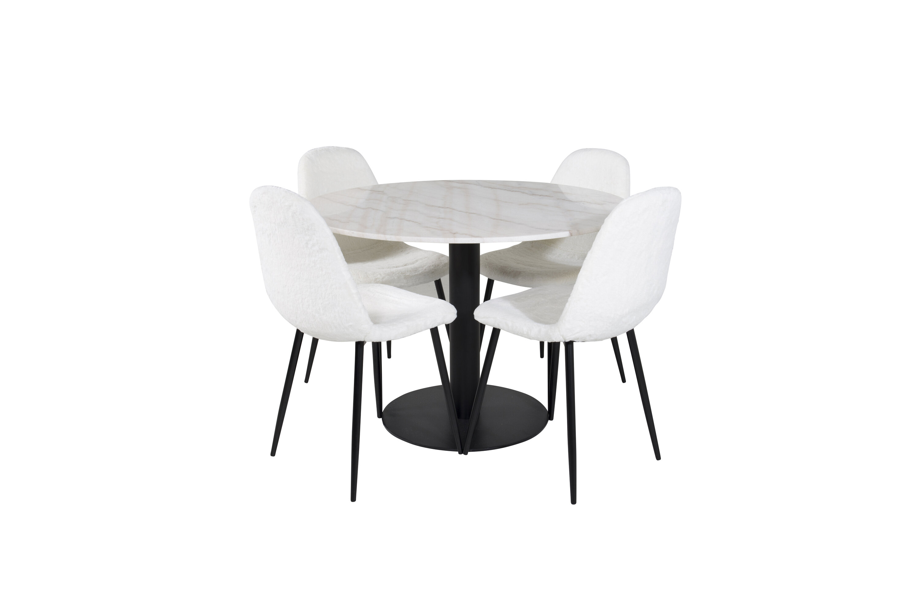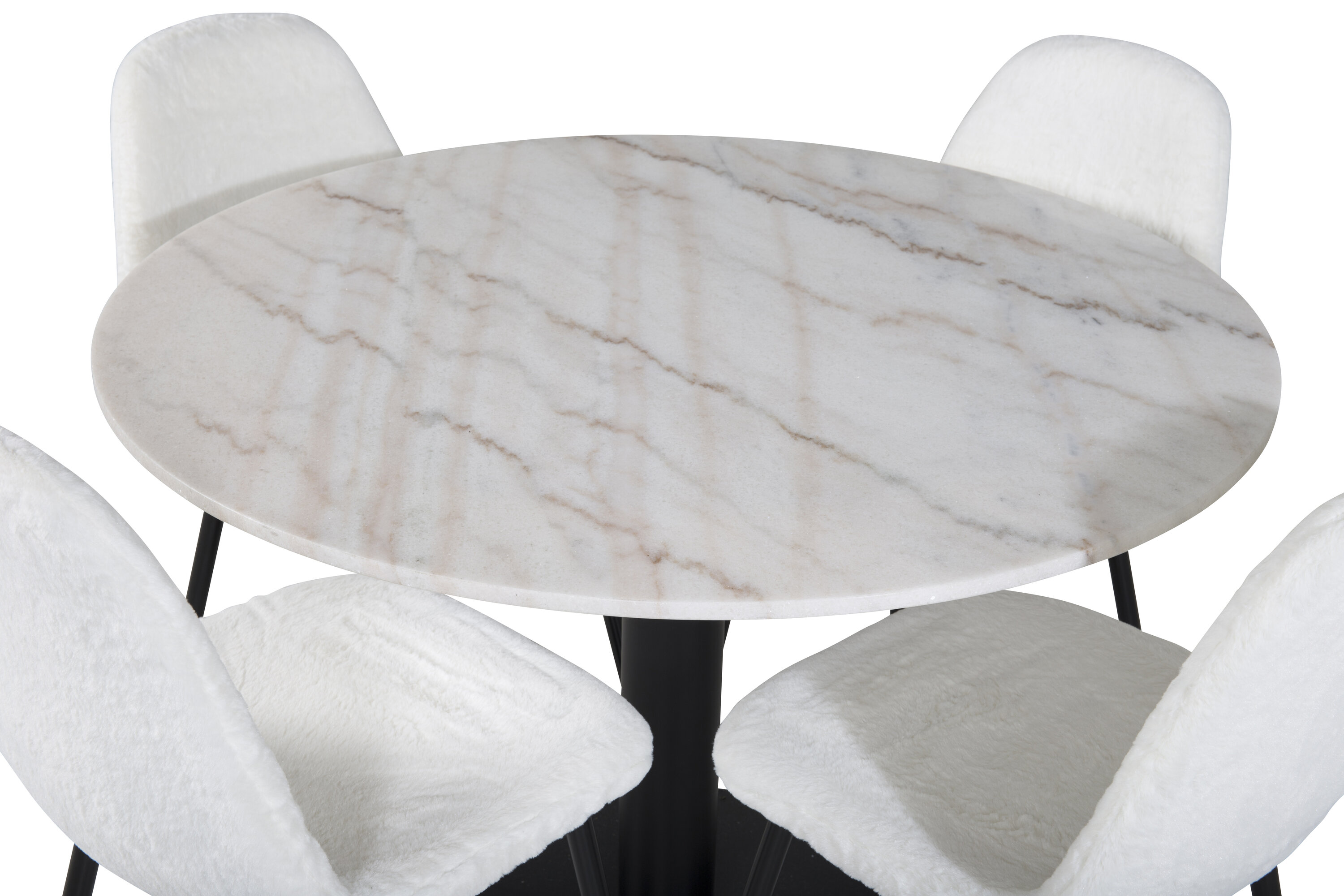 Esstisch Estelle in schlankem Design, dazu Esszimmerstühle Polar aus weißem flauschigem Polyester - die perfekte Kombination für alle, die eine trendige Food-Gruppe suchen. Der hohe Sitzkomfort der Stühle lädt zu langen und wunderbaren Momenten der Geselligkeit ein!