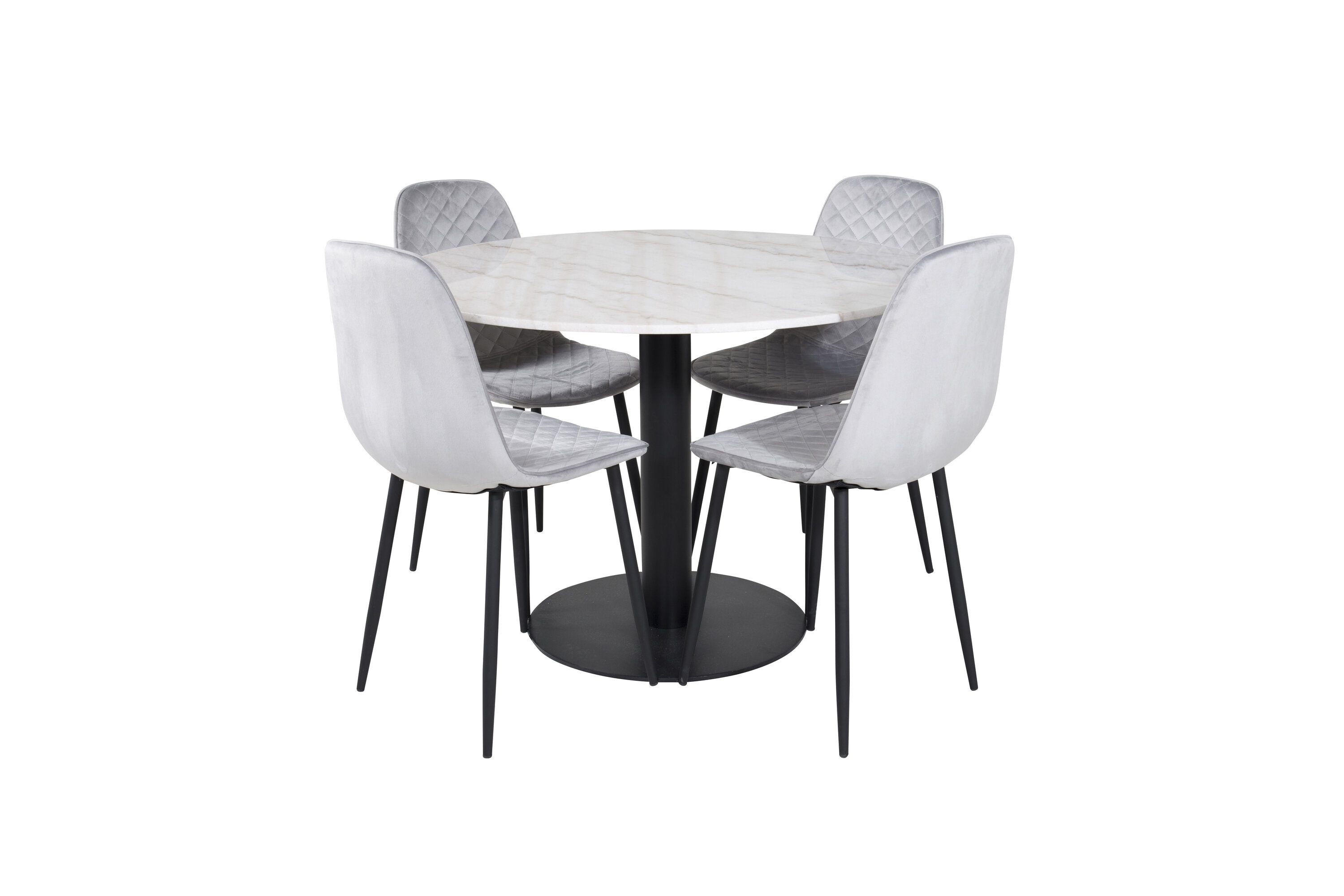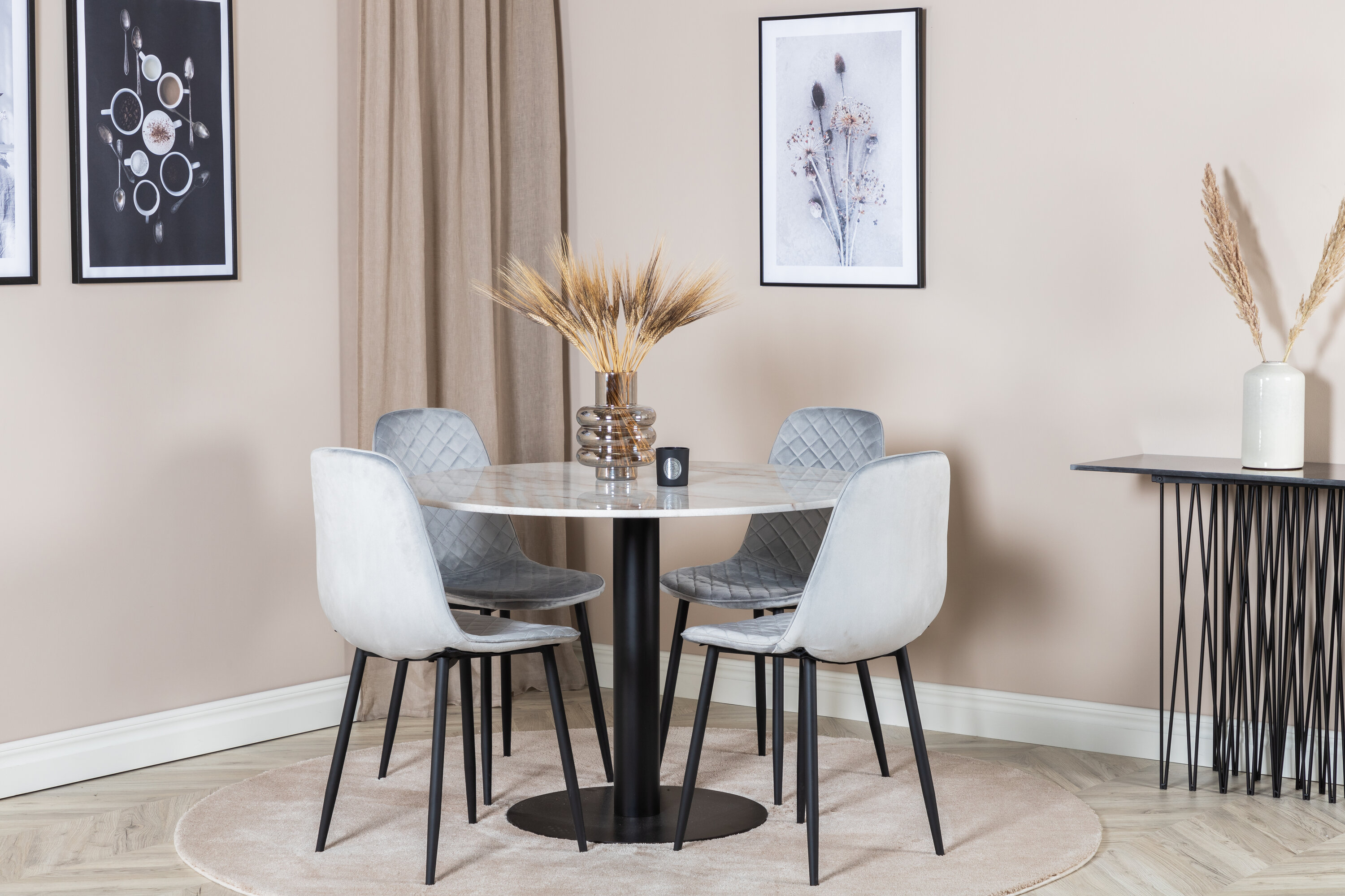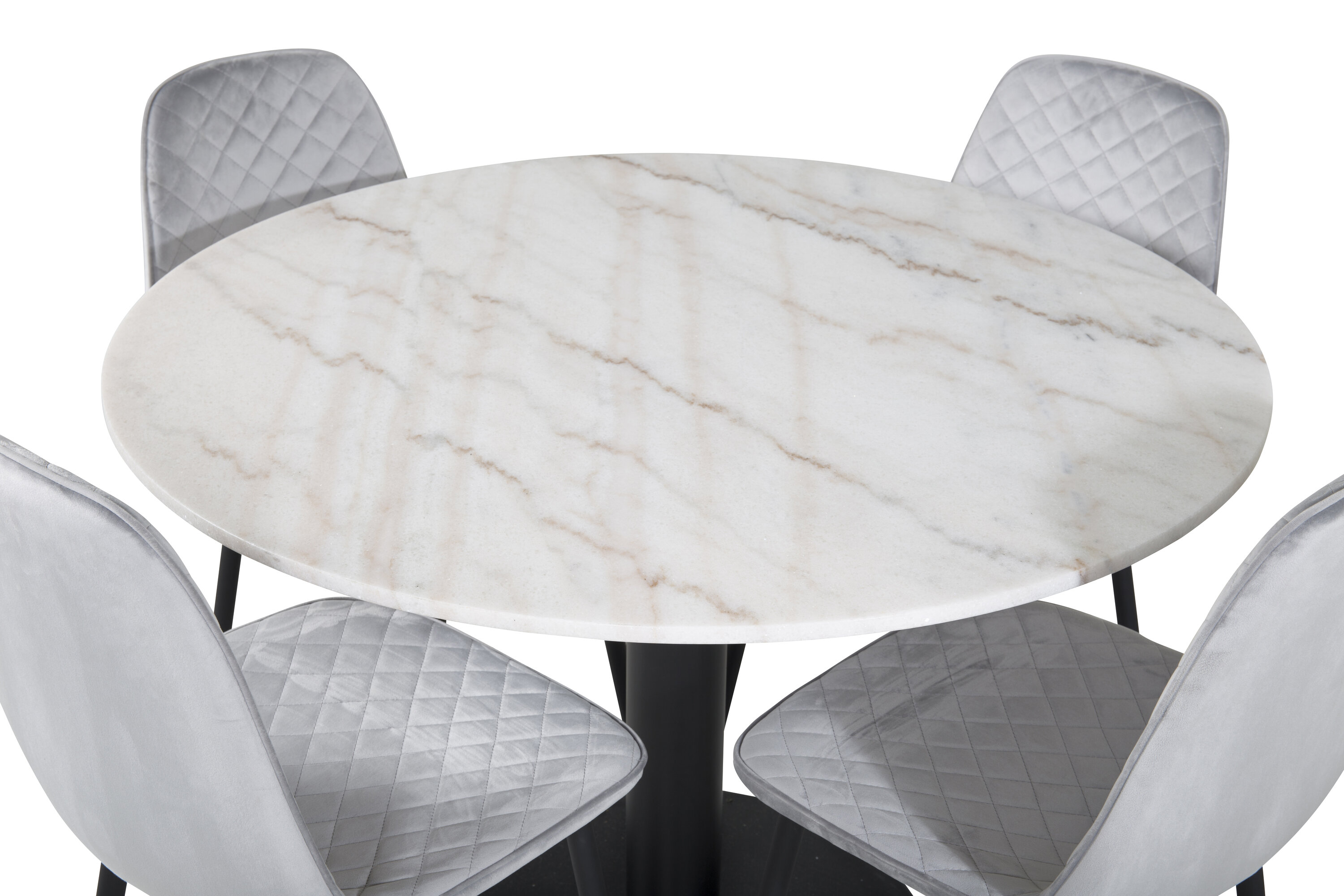 Der elegante Esstisch aus schönem Marmor in der Serie Estelle zusammen mit stilvollen Esszimmerstühlen in der Serie Polar - eine Lebensmittelgruppe, die Luxus inspiriert und zu vielen wunderbaren gesellschaftlichen Momenten einlädt.