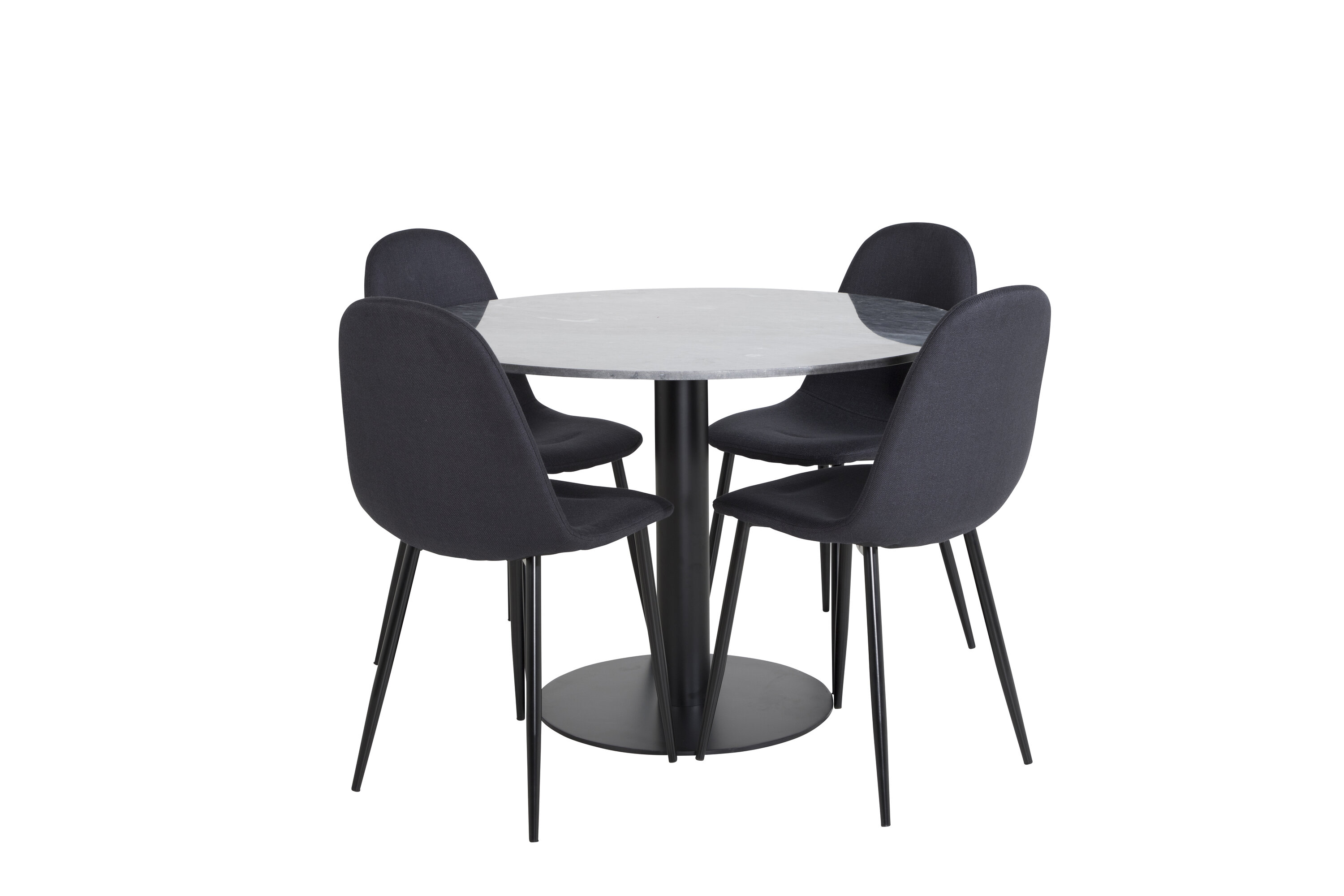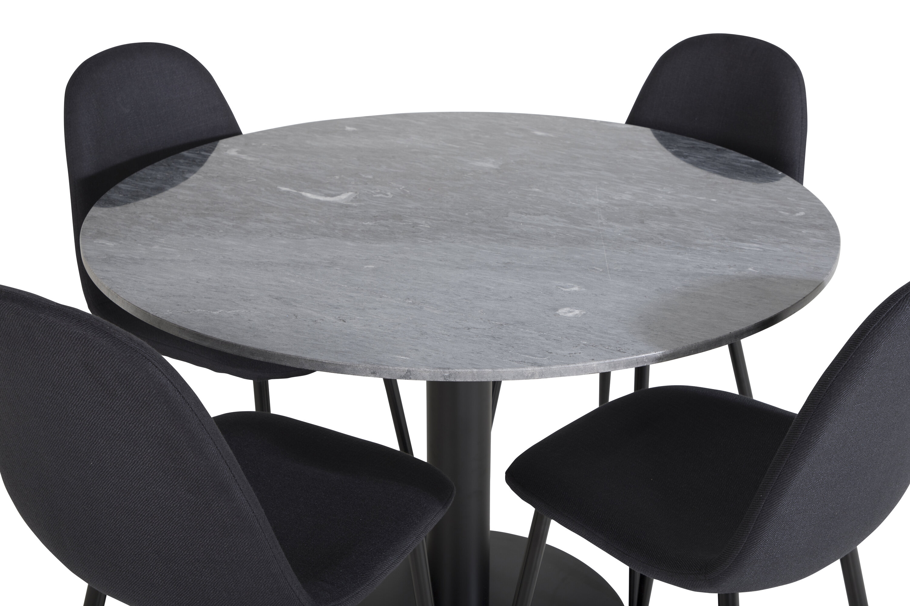 Ein gepflegter Esstisch mit Marmorplatte der Serie Estelle wird hier mit stilvollen Stühlen der Serie Polar kombiniert. Die Lebensmittelgruppe ist wie gemacht für diejenigen, die ein gemütliches und modernes Gefühl zu Hause schaffen wollen.