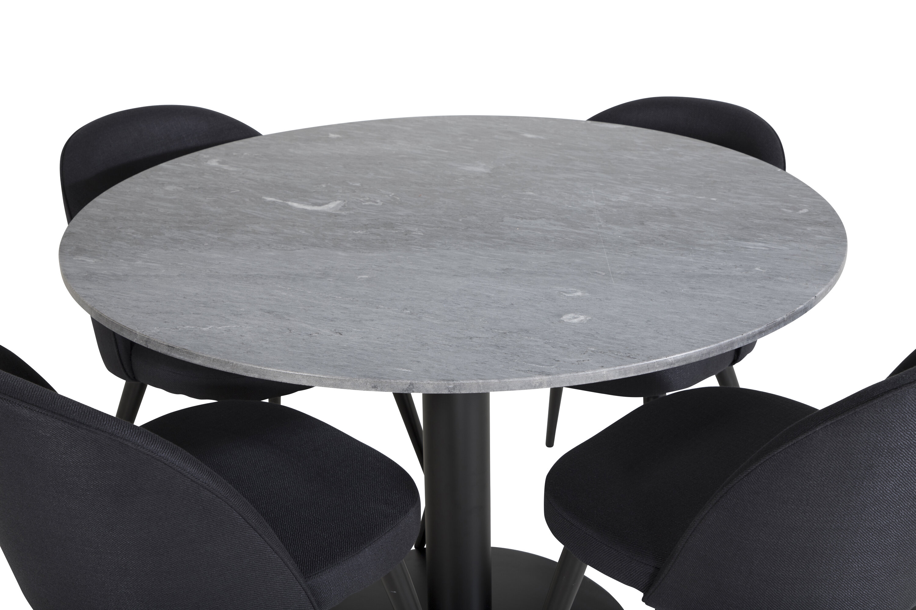 Der stilvolle Esstisch aus schönem Marmor der Serie Estelle zusammen mit weichen und bequemen Esstischen der Serie Velvet. Hier sitzt du gerne lange und genießt die Gesellschaft guter Freunde!