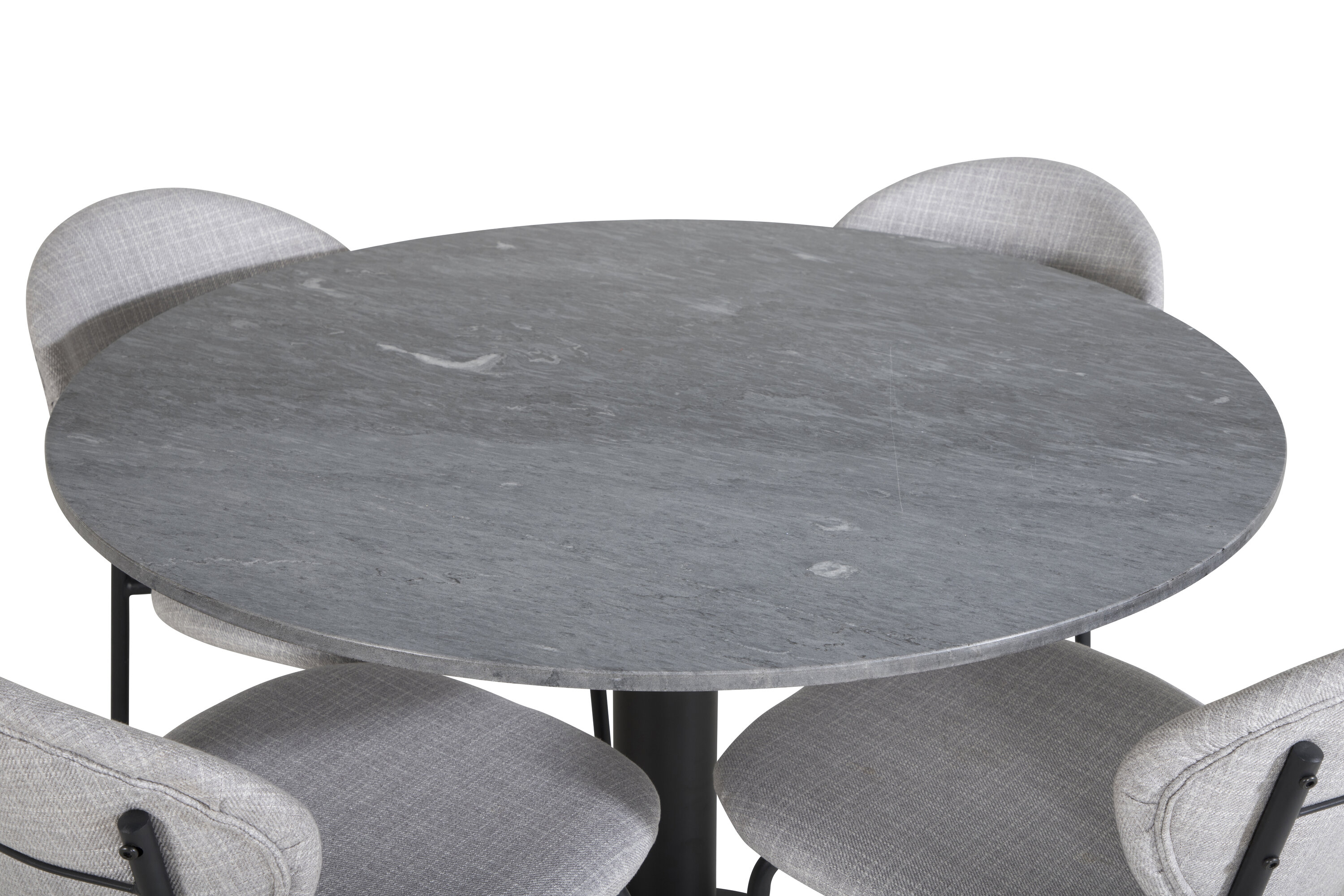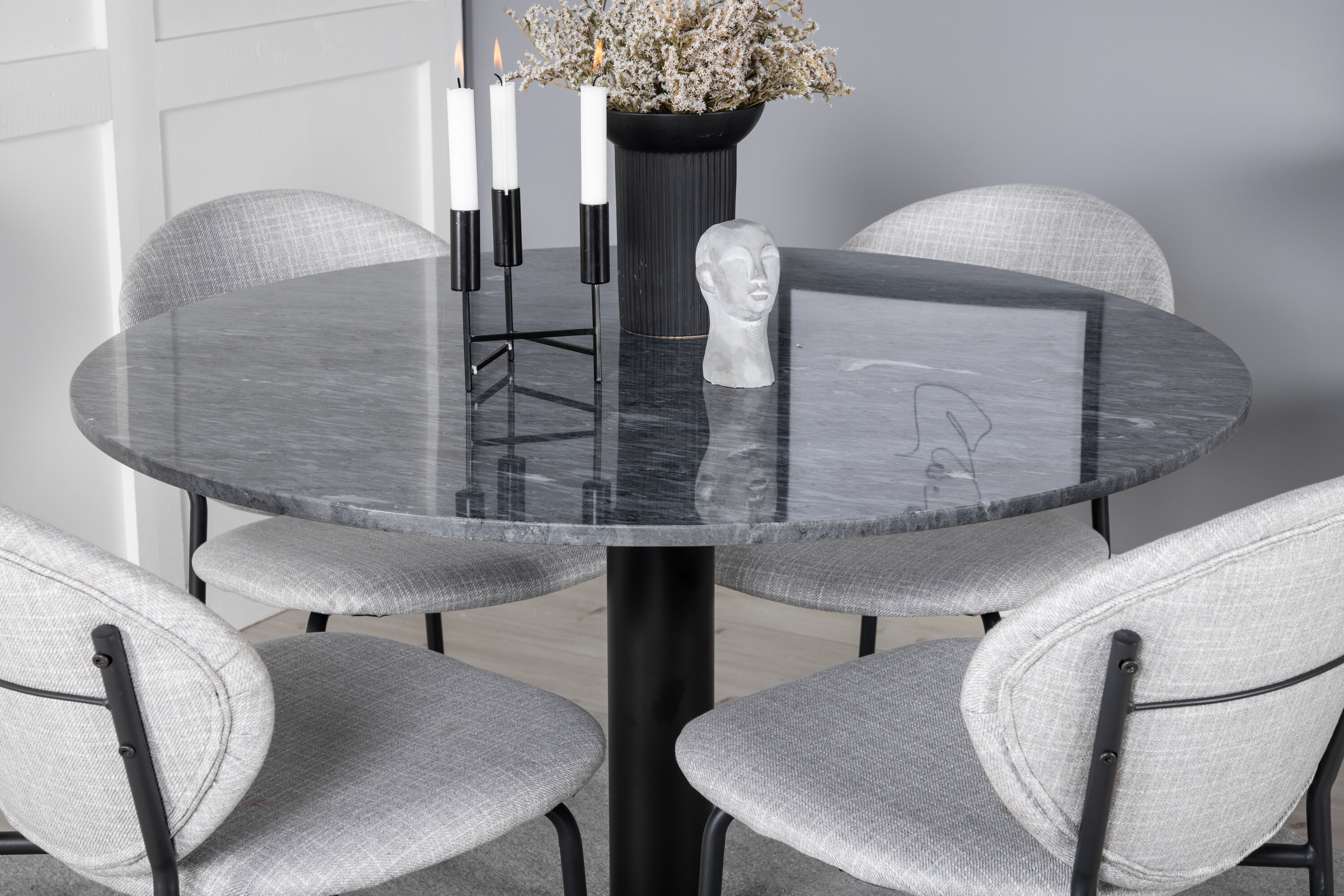 Der elegante Esstisch aus schönem Marmor der Serie Estelle zusammen mit den freundlichen Esstischen der Serie Vault - eine Food-Gruppe, die zu vielen wunderbaren gesellschaftlichen Momenten einlädt.