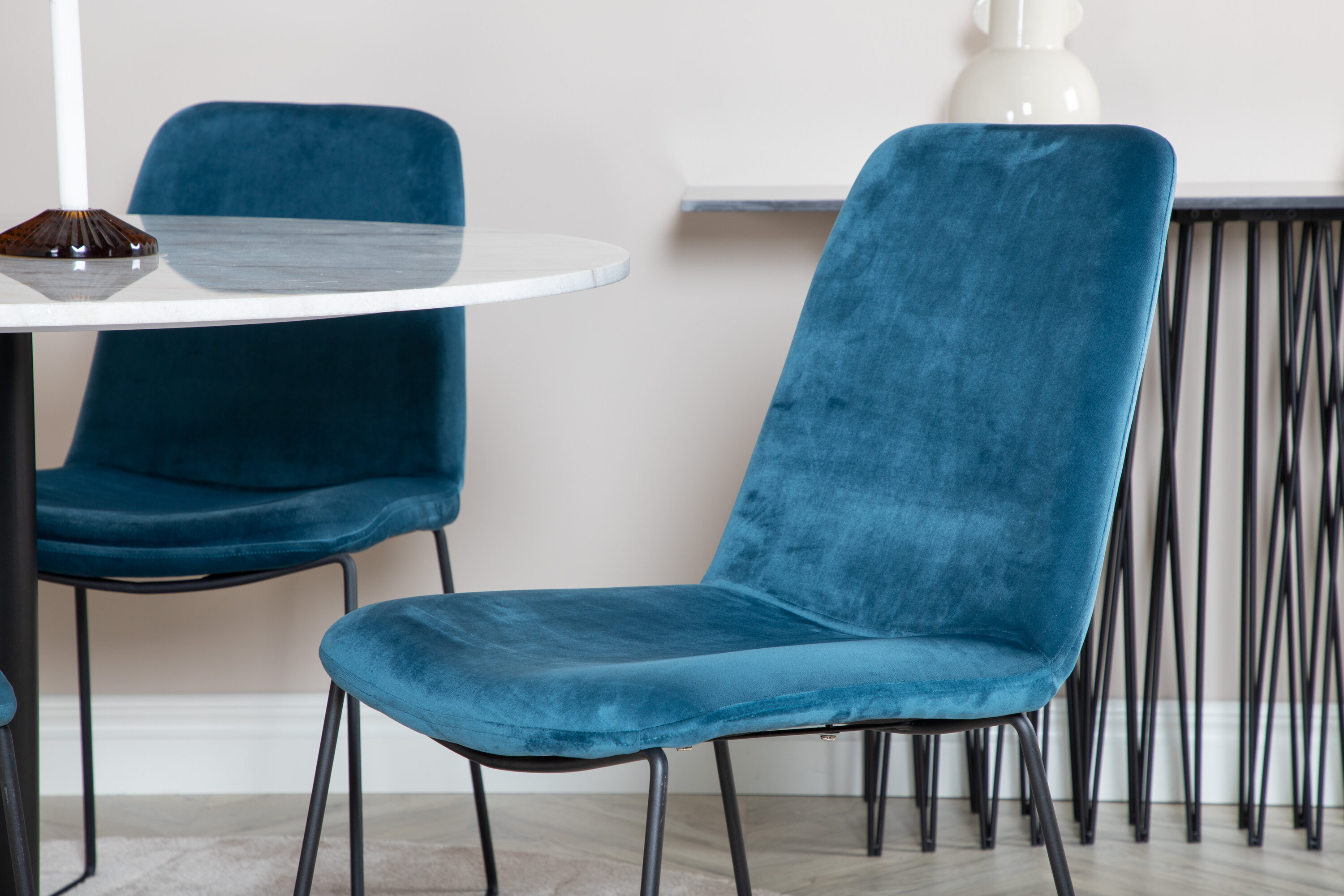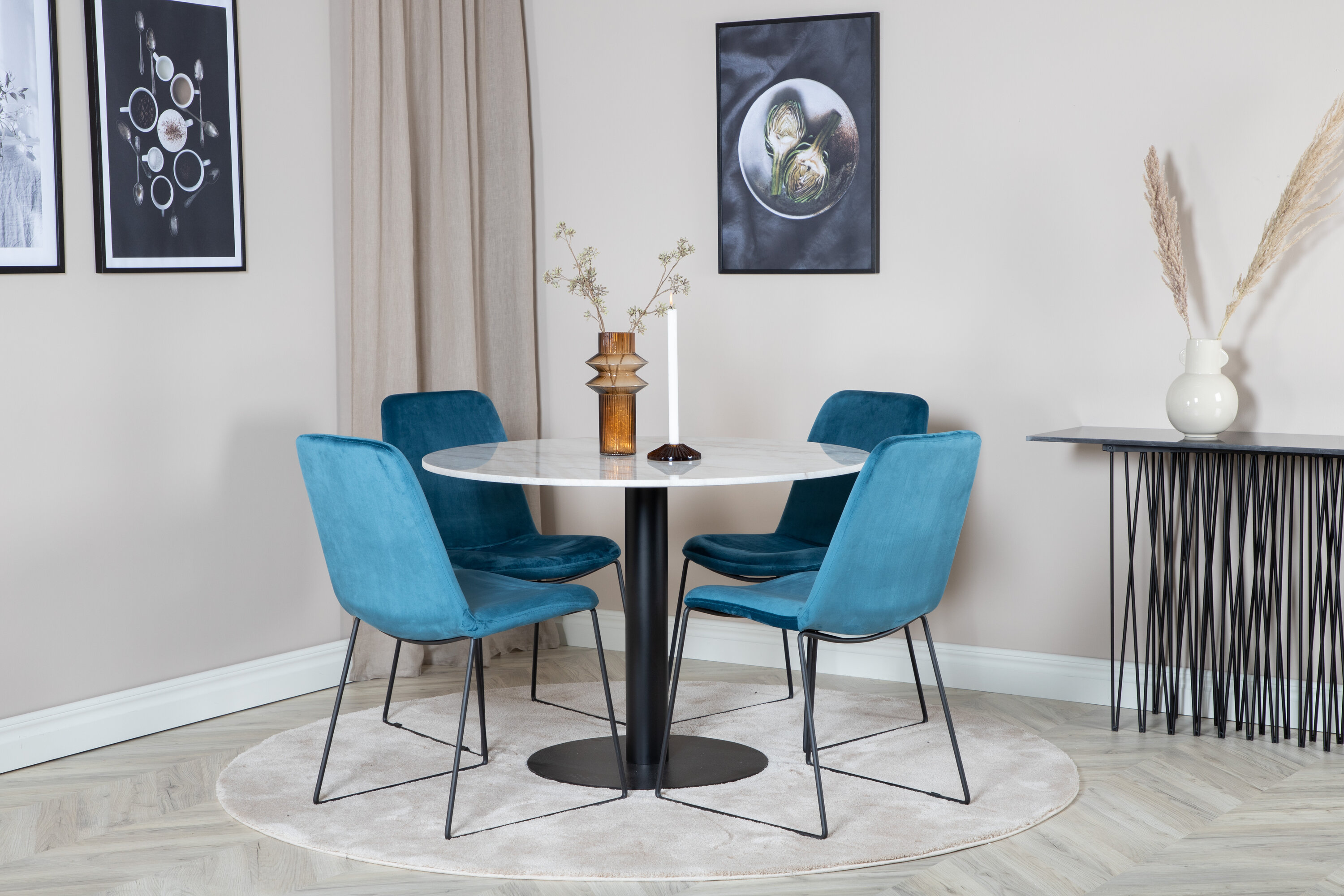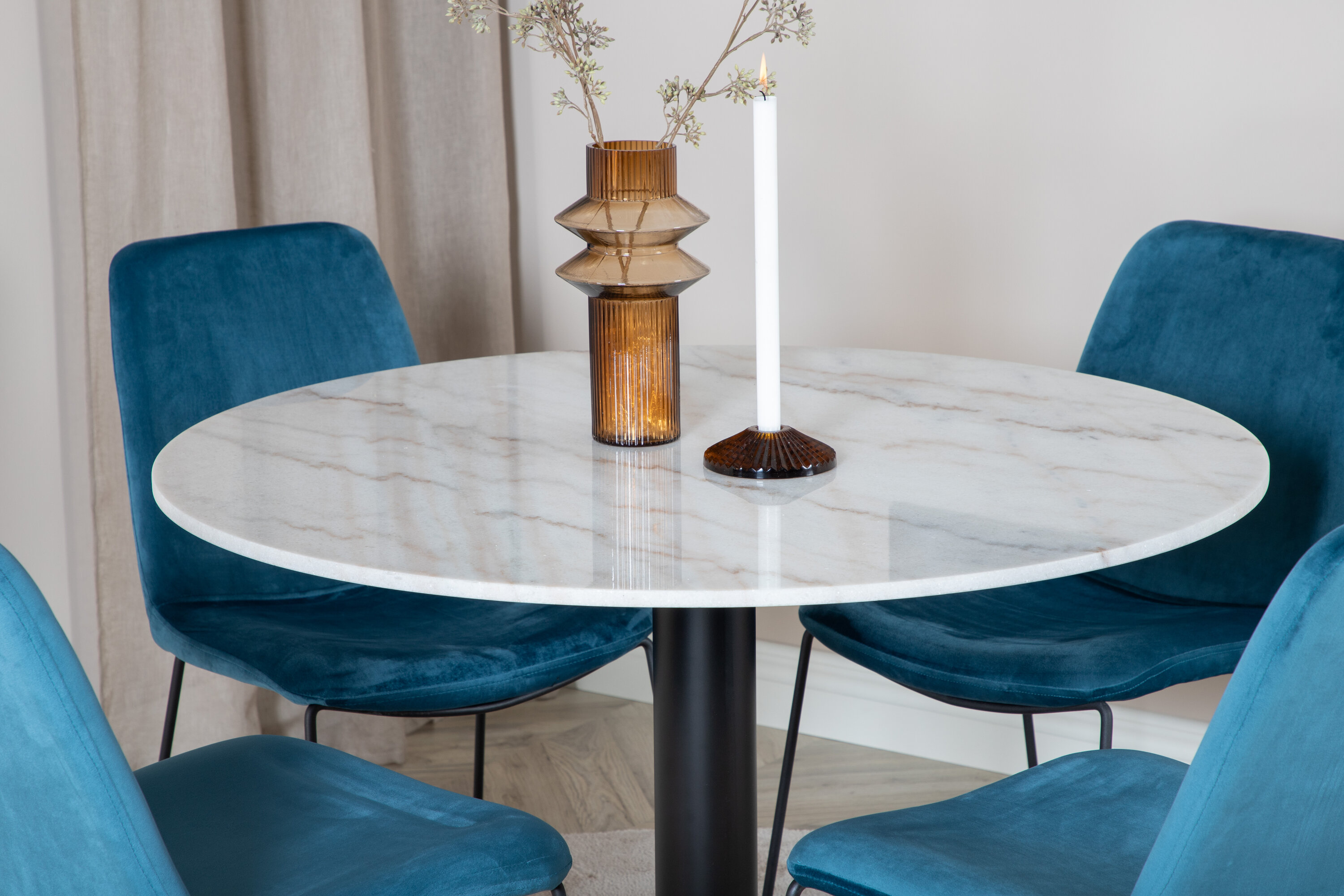 Wow! Unsere trendigen und schönen Esszimmerstühle Muce aus blauem Samt passen hier zu unserem runden Esstisch Estelle aus schönem Marmor. Die Kombination ist für diejenigen gemacht, die sich nach einer Lebensmittelgruppe sehnen!