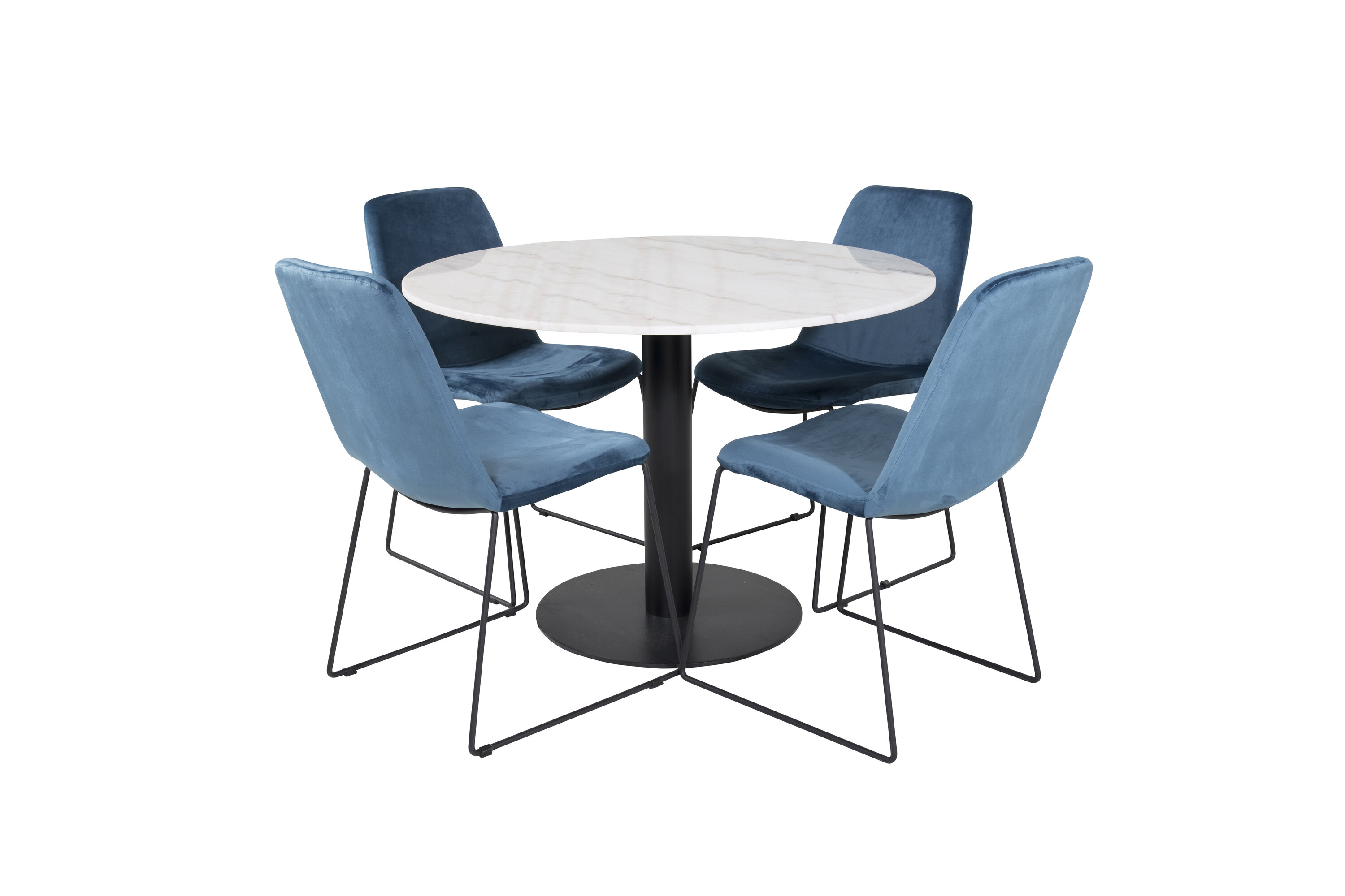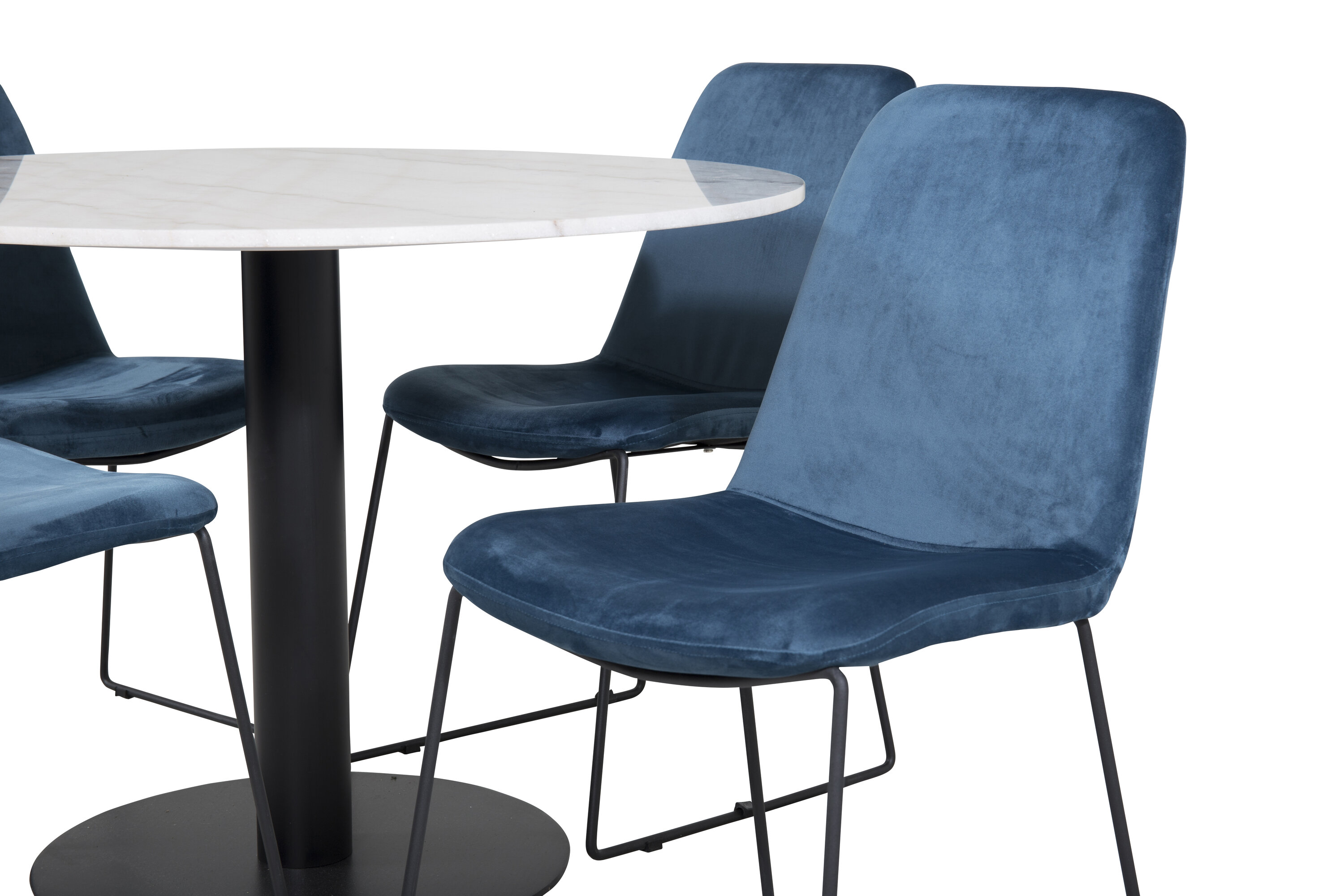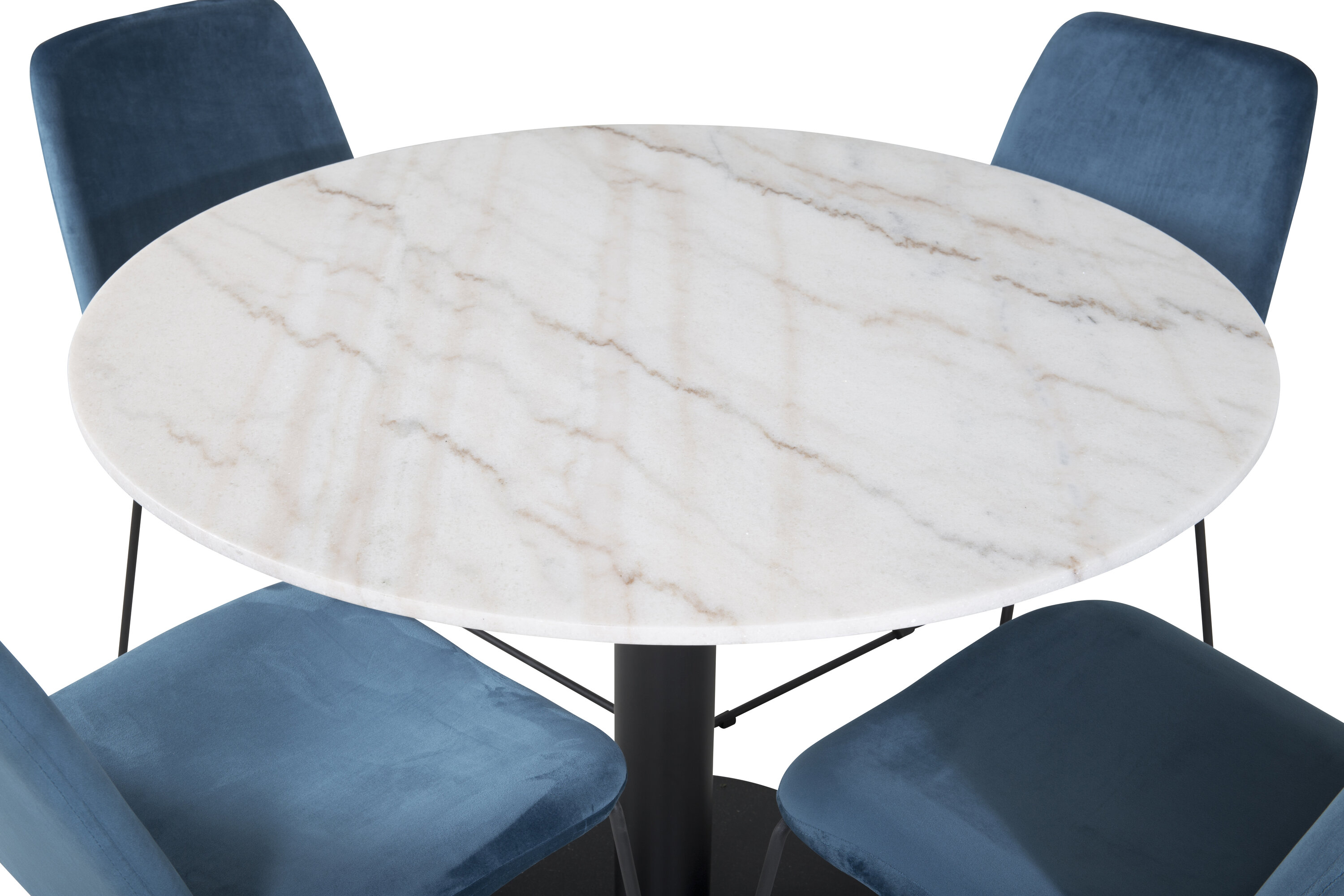 Wow! Unsere trendigen und schönen Esszimmerstühle Muce aus blauem Samt passen hier zu unserem runden Esstisch Estelle aus schönem Marmor. Die Kombination ist für diejenigen gemacht, die sich nach einer Lebensmittelgruppe sehnen!