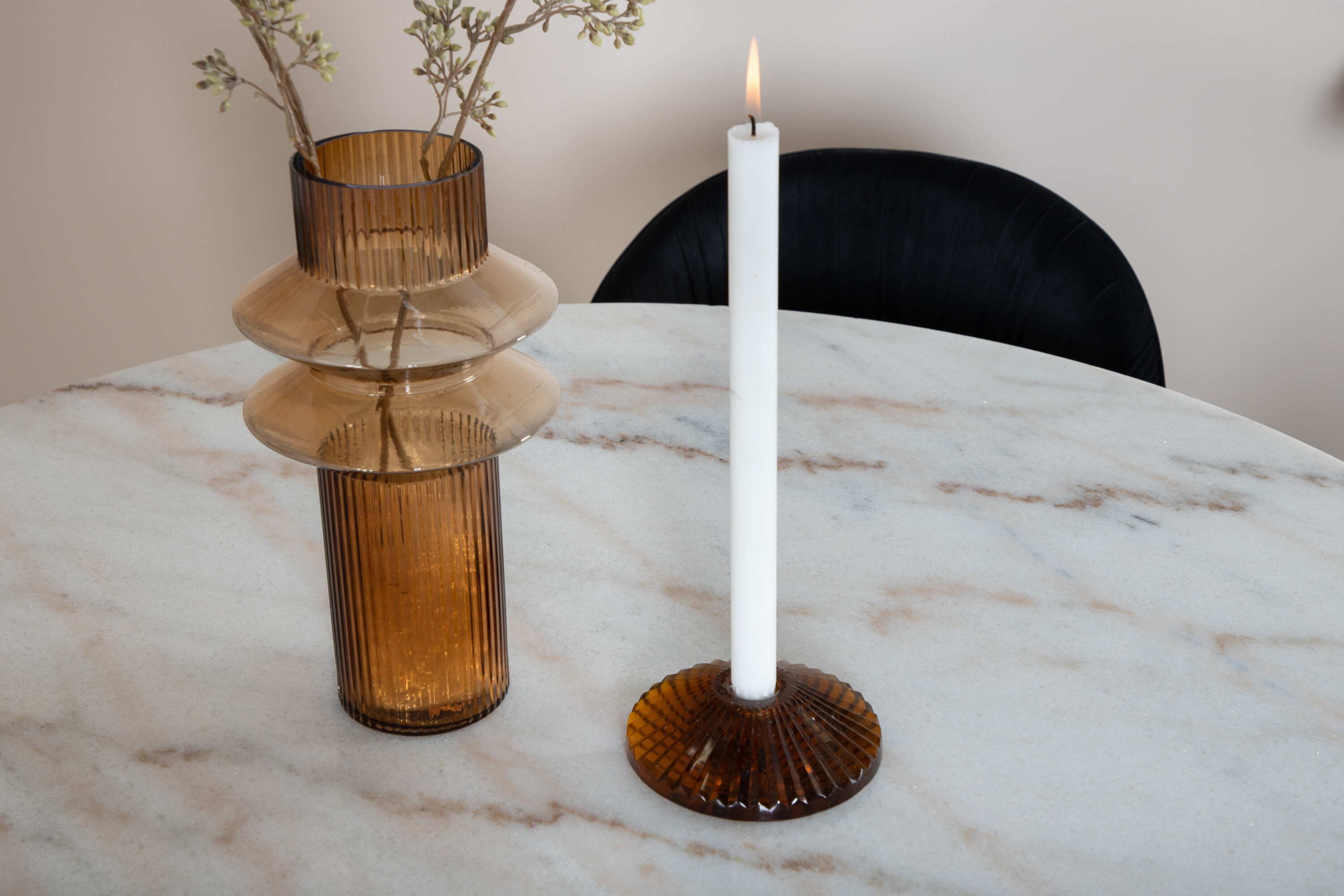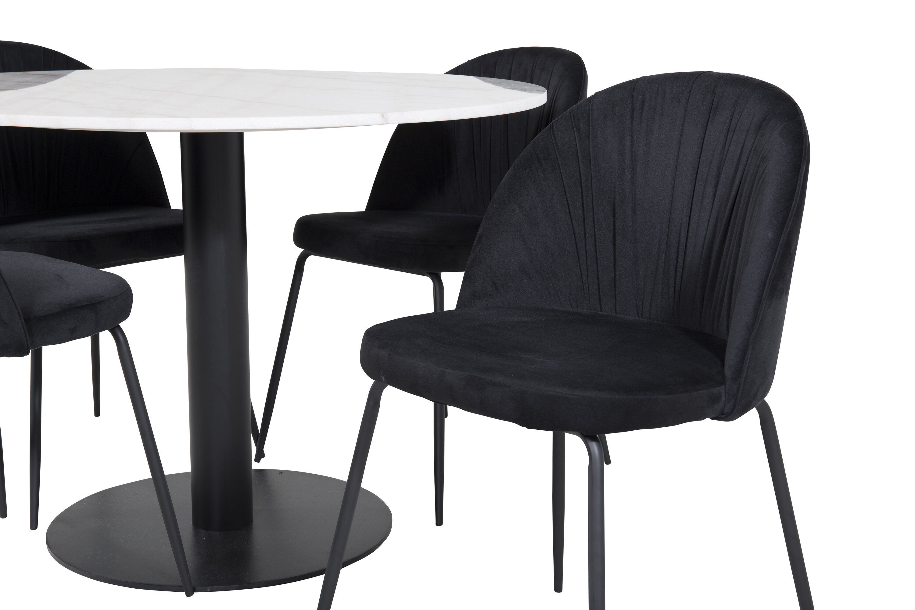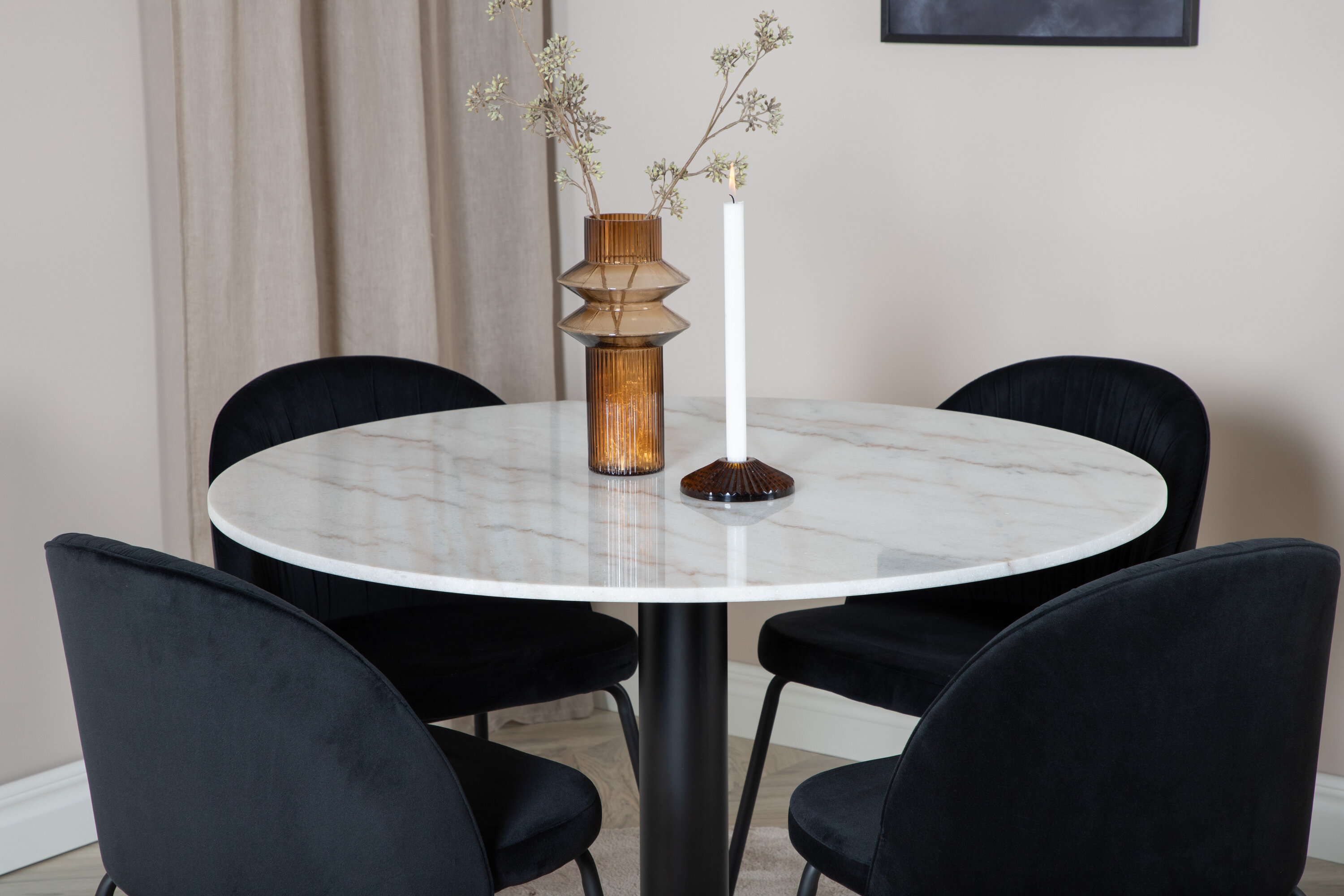 Unser runder Esstisch Estelle aus wunderschönem Marmor mit köstlichen Esszimmerstühlen aus der Serie Wrinkles. Verkleiden Sie Ihre Lebensmittelgruppe mit einem anderen Dekor rundum, so gut für den Alltag wie für eine Party!