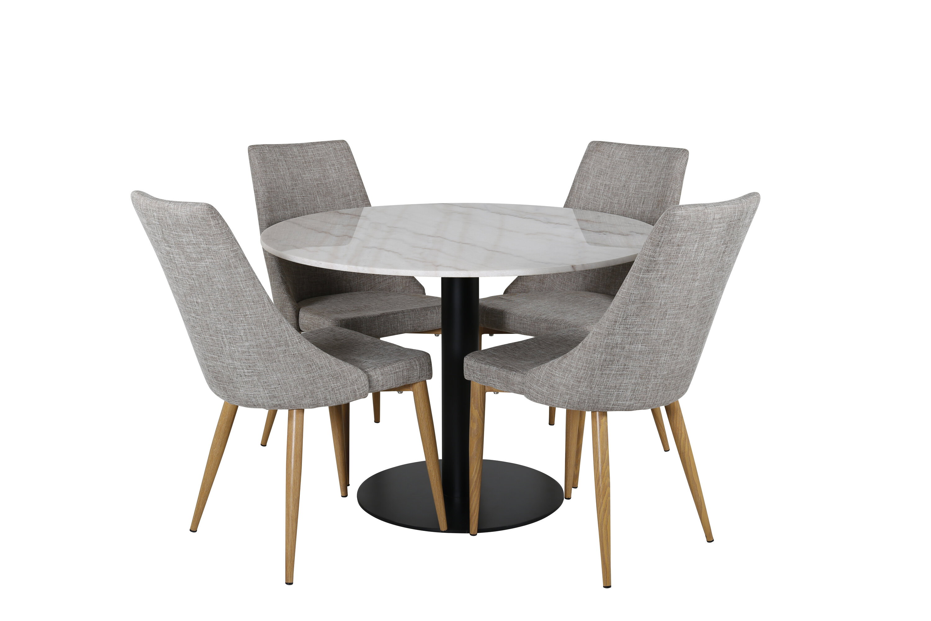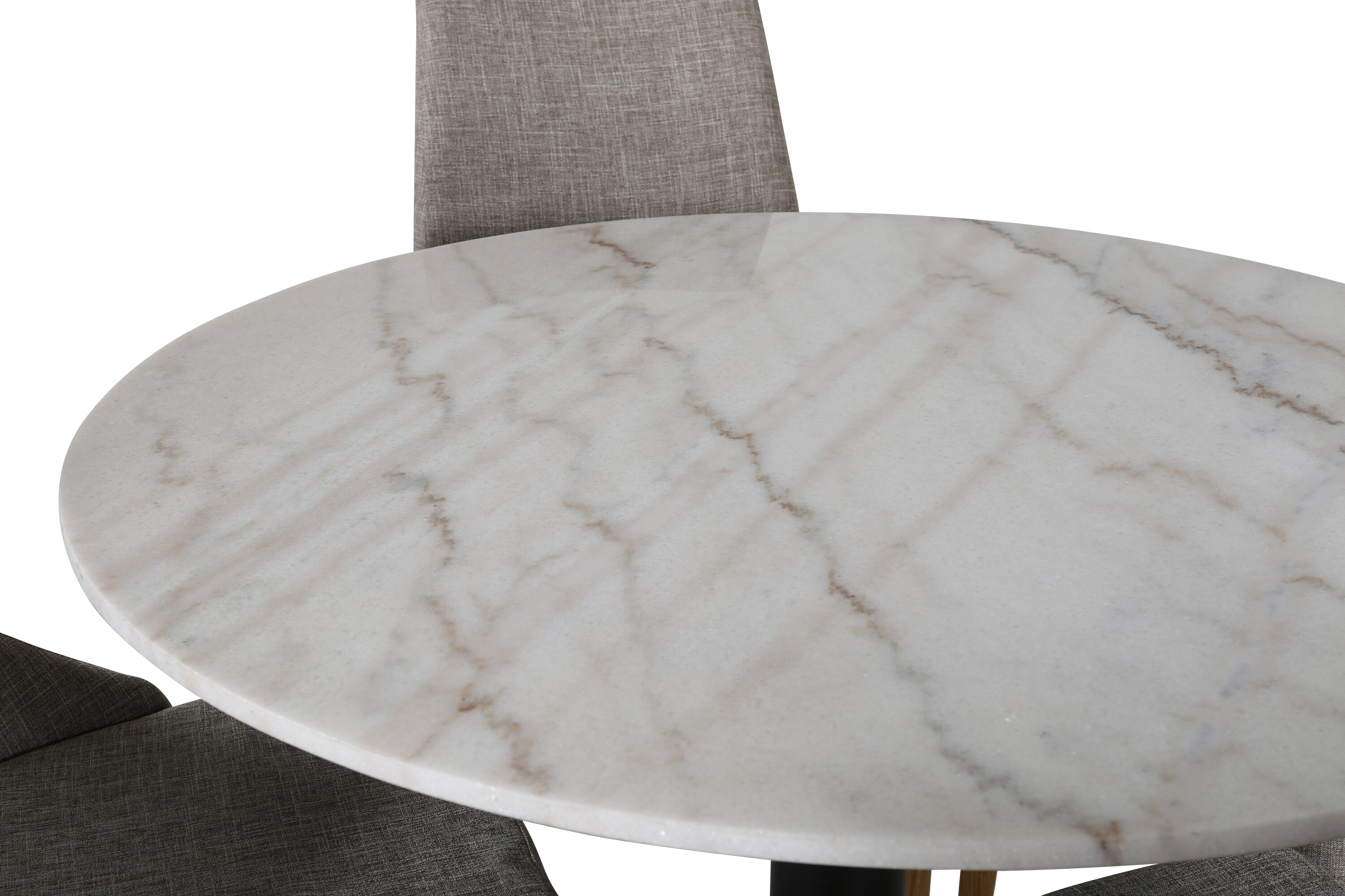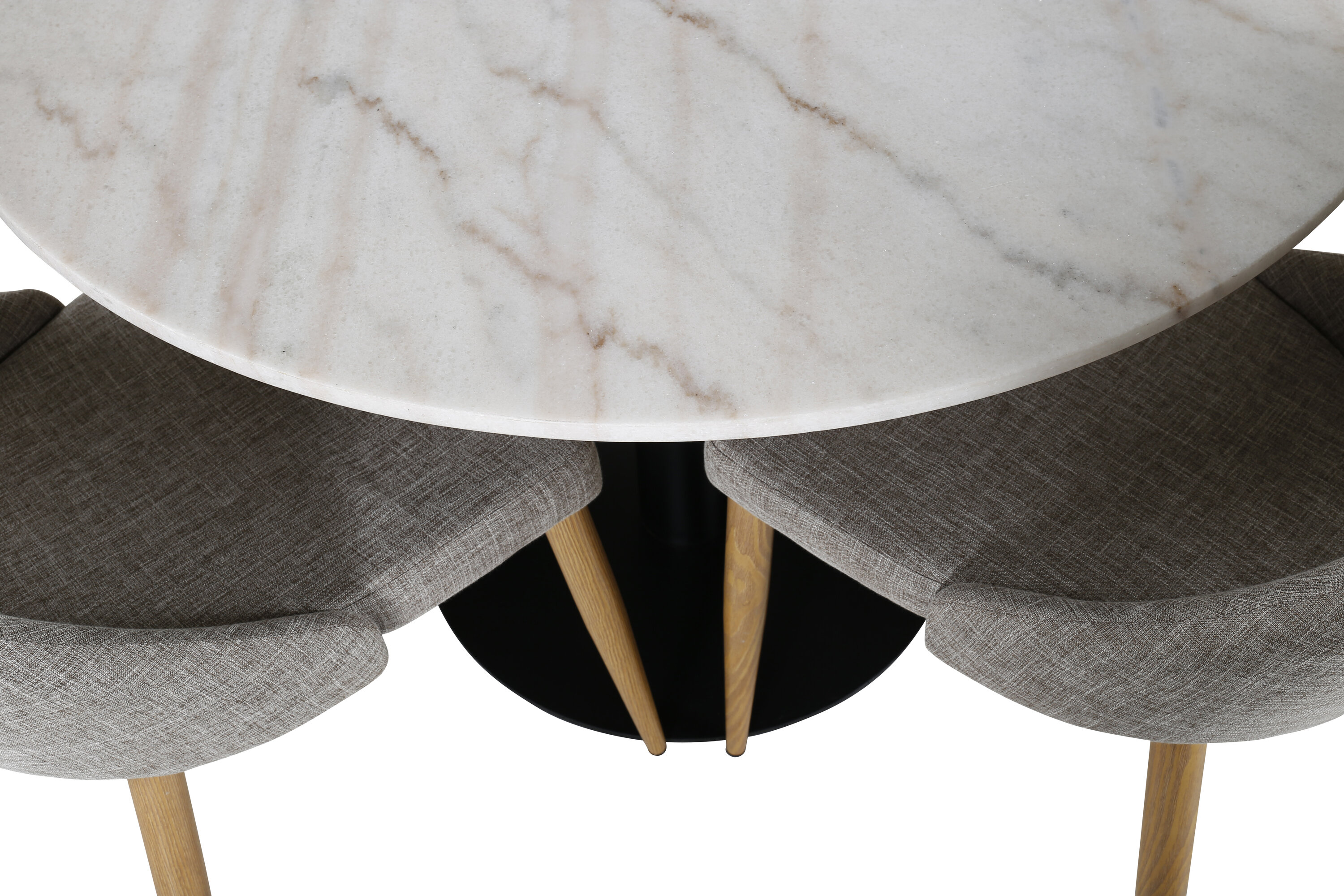 Eine Lebensmittelgruppe in modernem und stilvollem Design. Unser runder Esstisch Estelle ist elegant und praktisch zugleich. Der Tisch hat eine glänzende Tischplatte aus weißem, gesprenkeltem Marmor und ein zylindrisches Untergestell aus schwarzem Metall. Hier in perfekter Übereinstimmung mit Stühlen aus der Leone-Serie. Die Stühle haben ein gut durchdachtes, vollständig gekleidetes Design, das einfach ist, mit Knochen aus Eichenfolienmetall und Rücken/Sitz aus grauem Polyestergewebe mit weicher Polsterung. Keine Kompromisse zwischen Komfort und Blickfang!