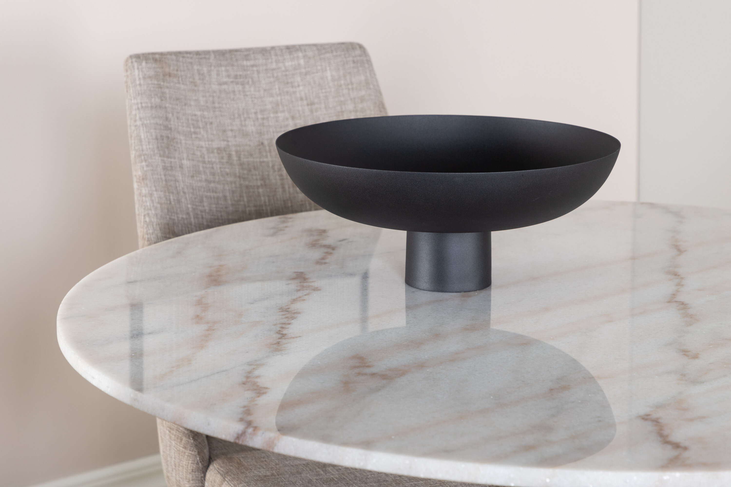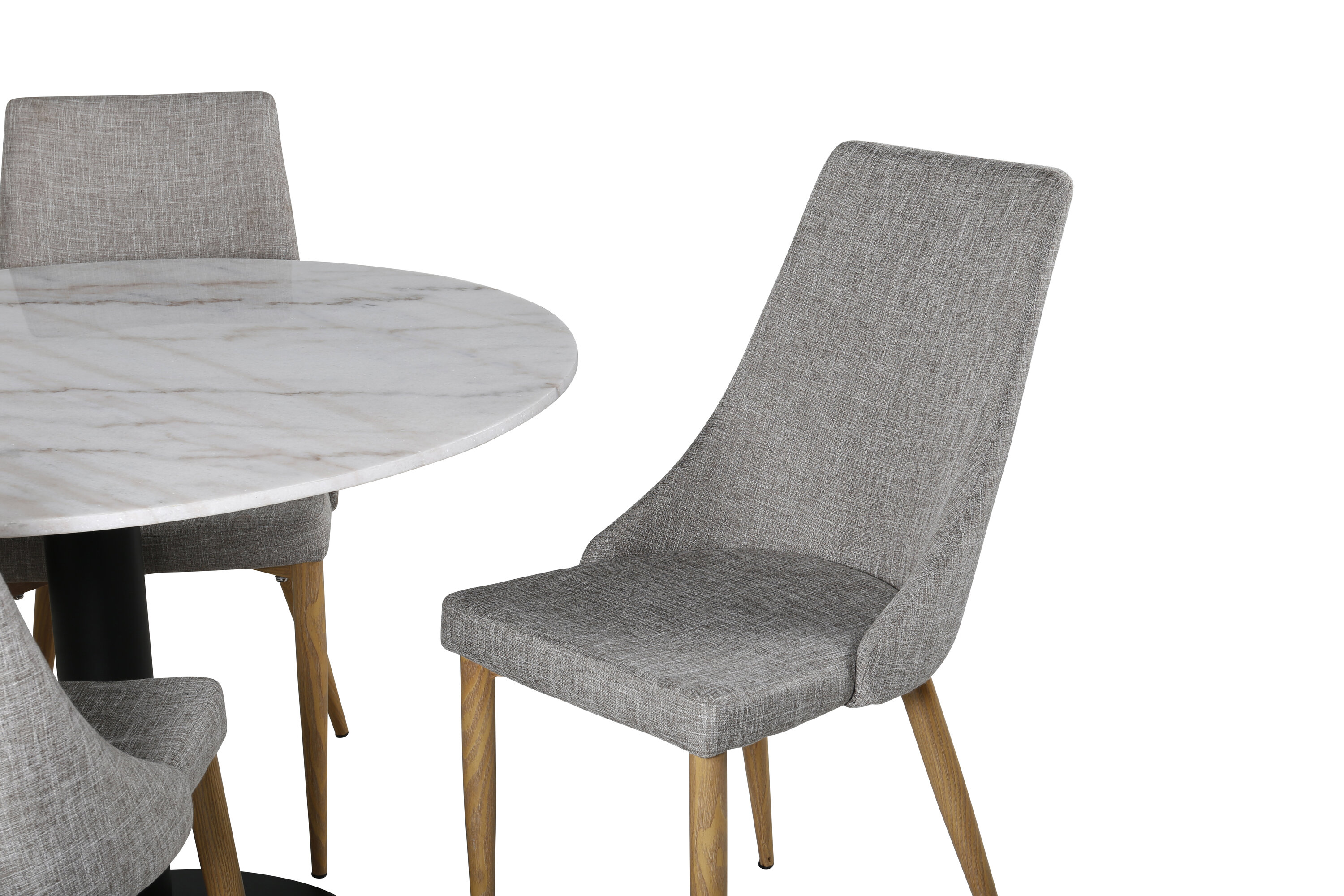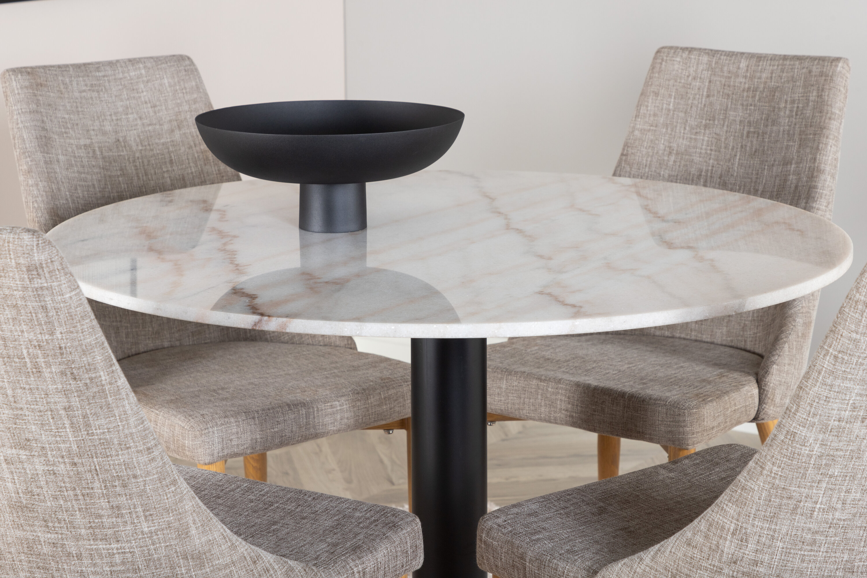 Eine Lebensmittelgruppe in modernem und stilvollem Design. Unser runder Esstisch Estelle ist elegant und praktisch zugleich. Der Tisch hat eine glänzende Tischplatte aus weißem, gesprenkeltem Marmor und ein zylindrisches Untergestell aus schwarzem Metall. Hier in perfekter Übereinstimmung mit Stühlen aus der Leone-Serie. Die Stühle haben ein gut durchdachtes, vollständig gekleidetes Design, das einfach ist, mit Knochen aus Eichenfolienmetall und Rücken/Sitz aus grauem Polyestergewebe mit weicher Polsterung. Keine Kompromisse zwischen Komfort und Blickfang!