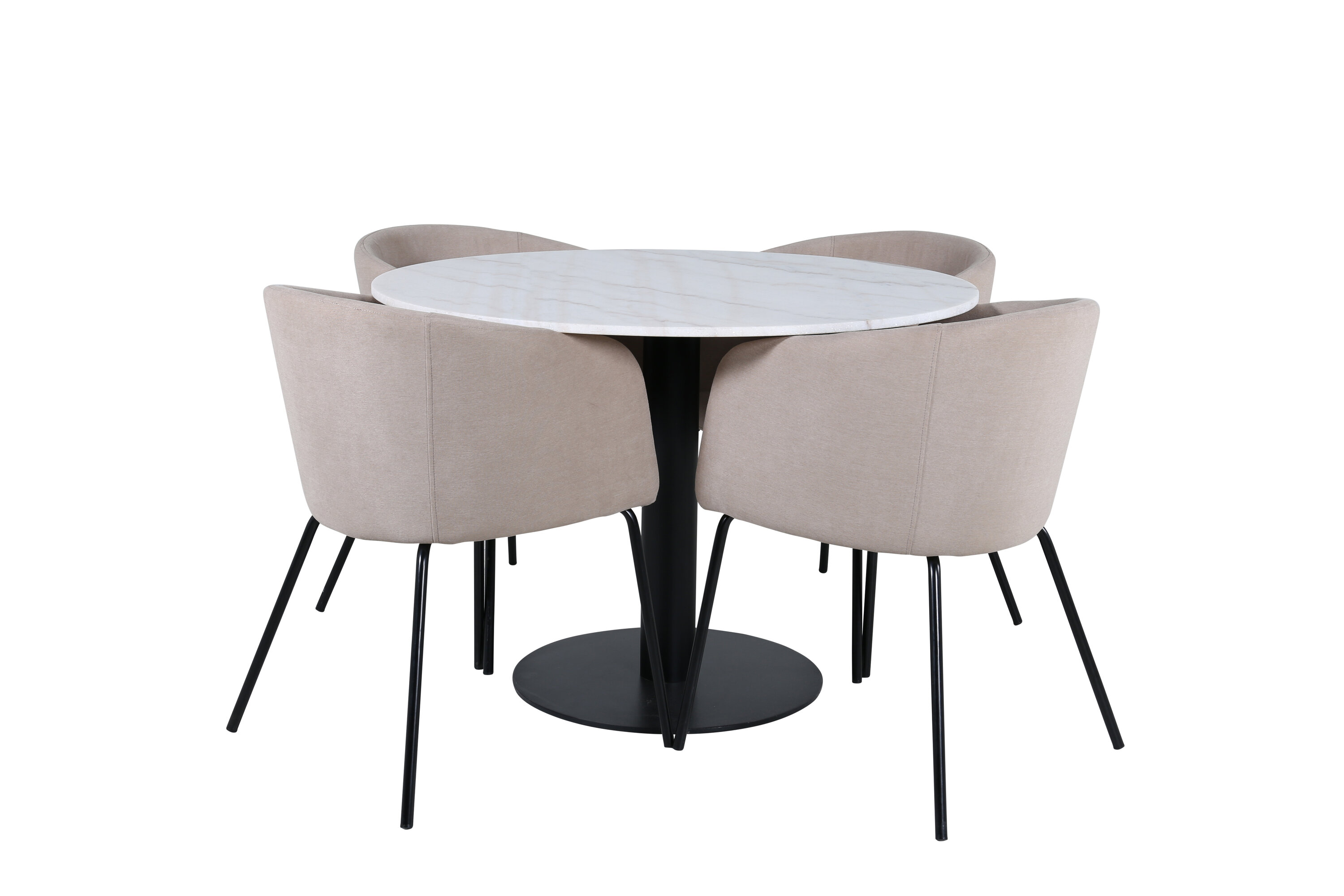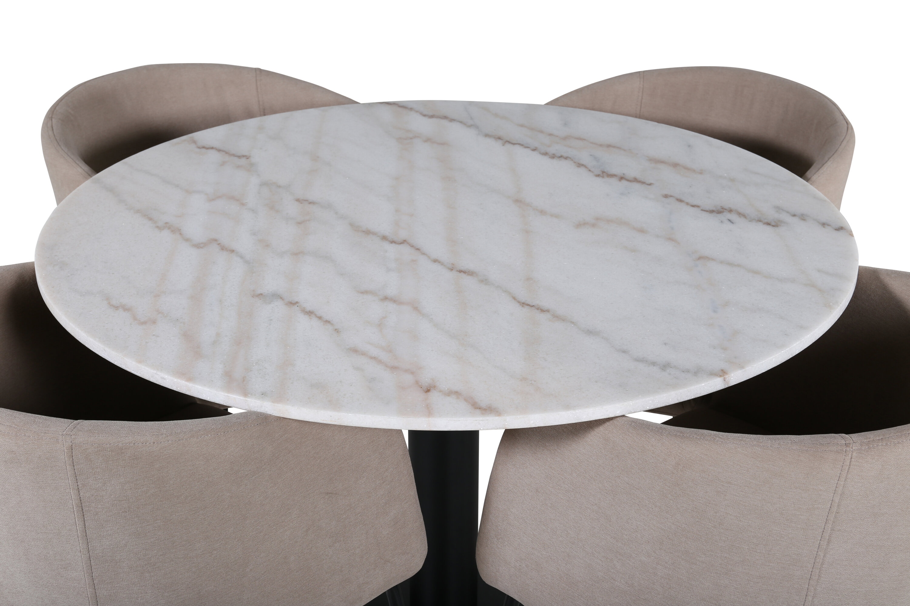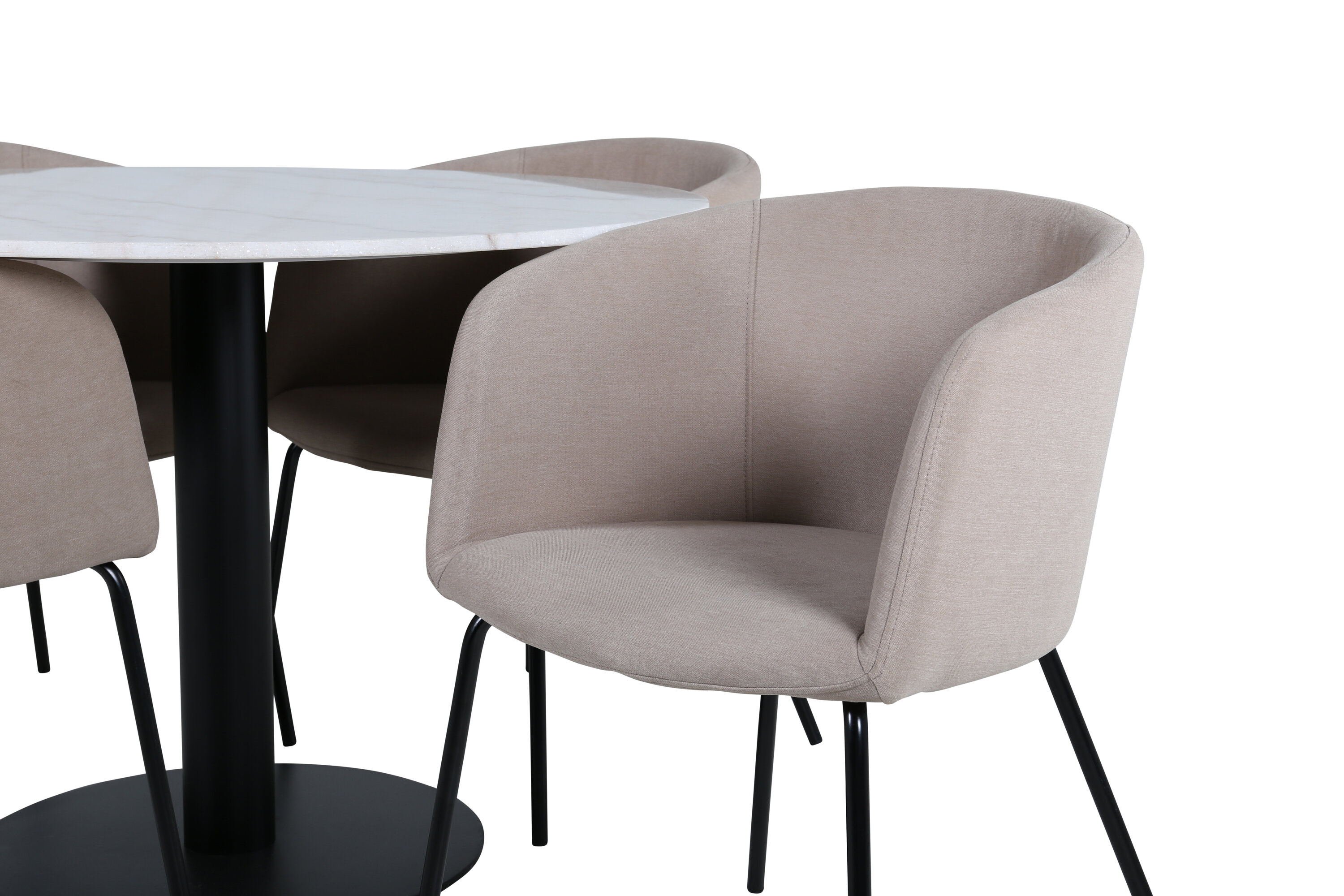 Was will man mehr als eine Lebensmittelgruppe, die sowohl komfortabel als auch stilvoll ist und dem Raum ein luxuriöses Gefühl verleiht? Genau das bietet diese moderne Kombination! Unser runder Esstisch Estelle ist elegant und praktisch zugleich. Der Tisch hat eine glänzende Tischplatte aus weißem, gesprenkeltem Marmor und ein zylindrisches Untergestell aus schwarzem Metall. Hier zusammen mit geschmackvollen Esszimmerstühlen aus der Serie Berit. Die Stuhlbeine sind in schwarzem Eisen und der voll bekleidete Sitz in weichem, beigem Polyester-Bettwäsche. Sitzen Sie bequem und genießen Sie angenehme Mahlzeiten!