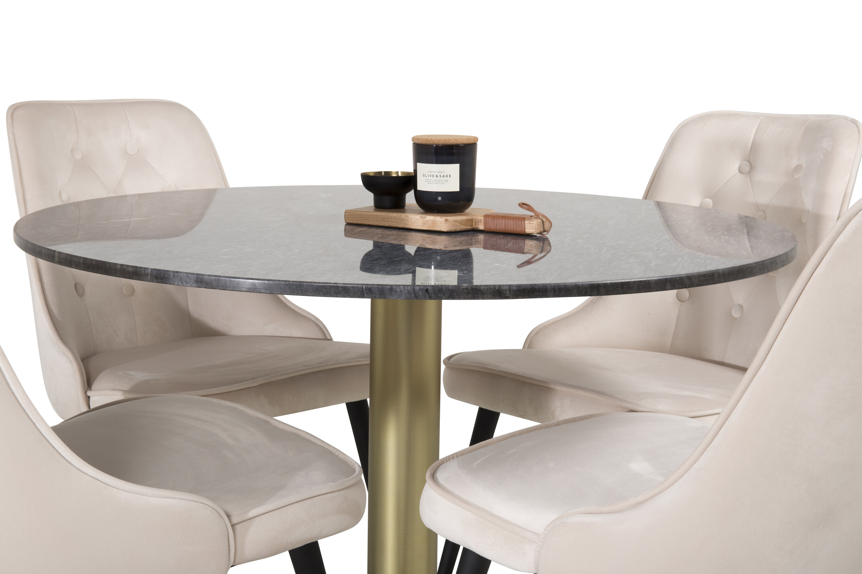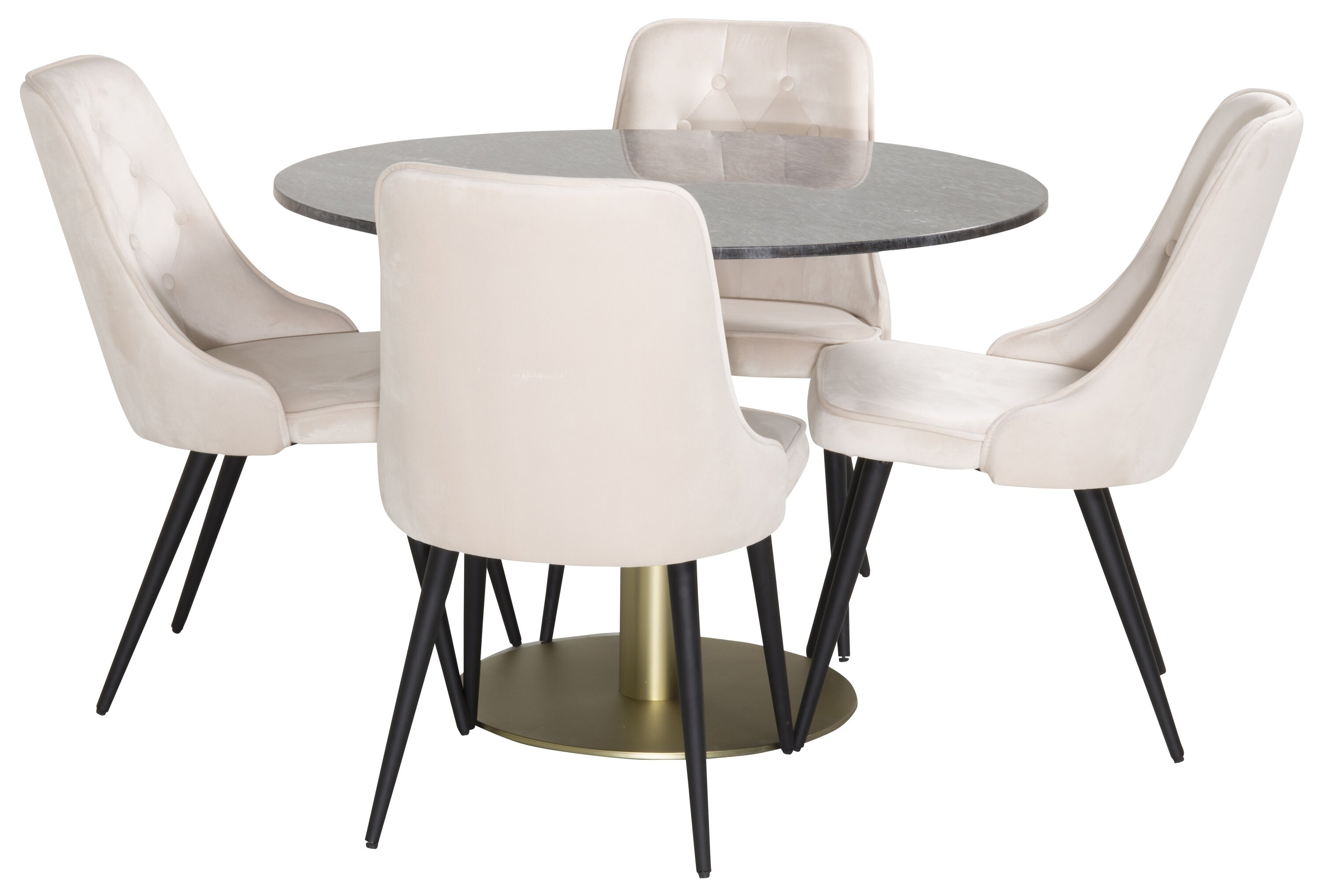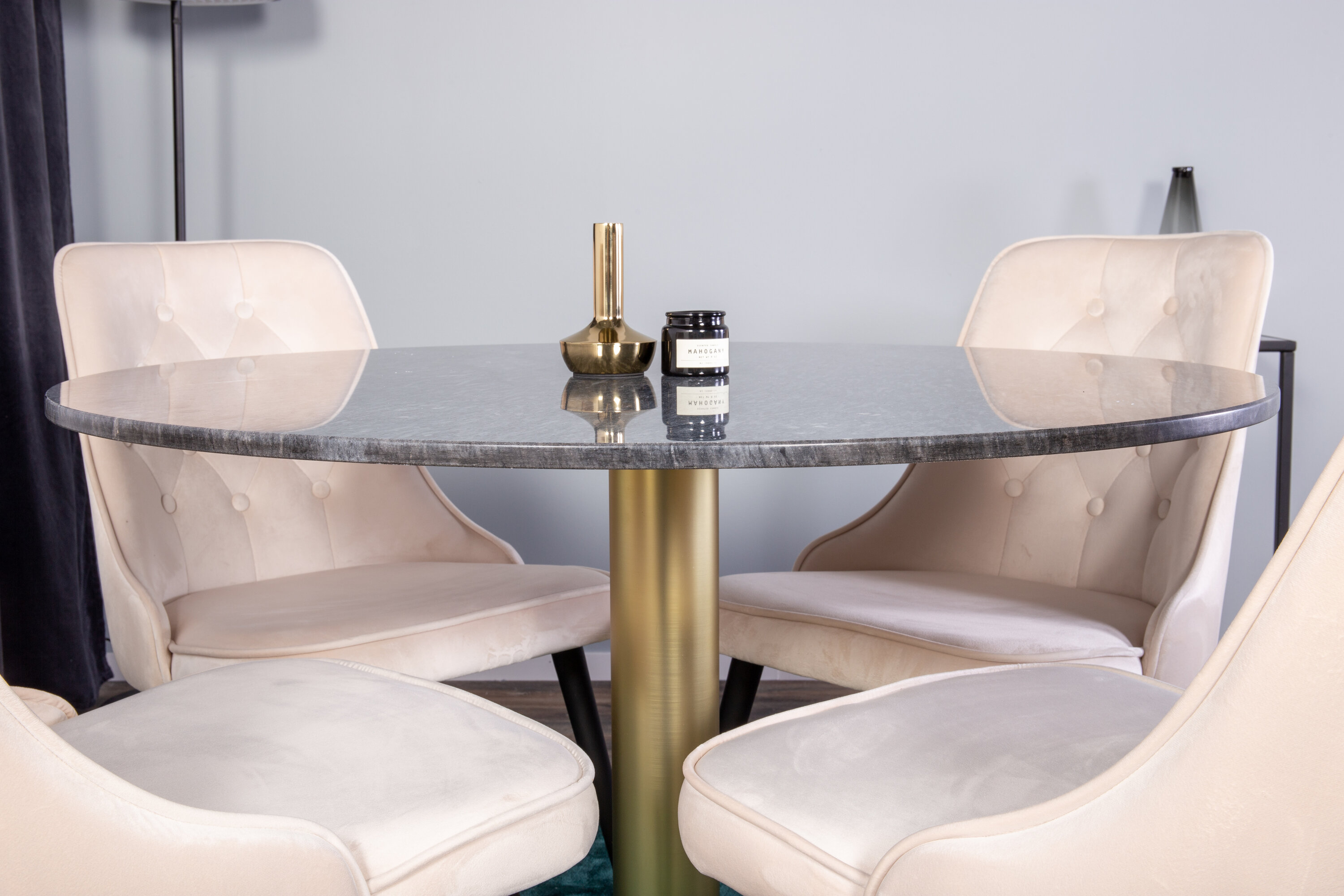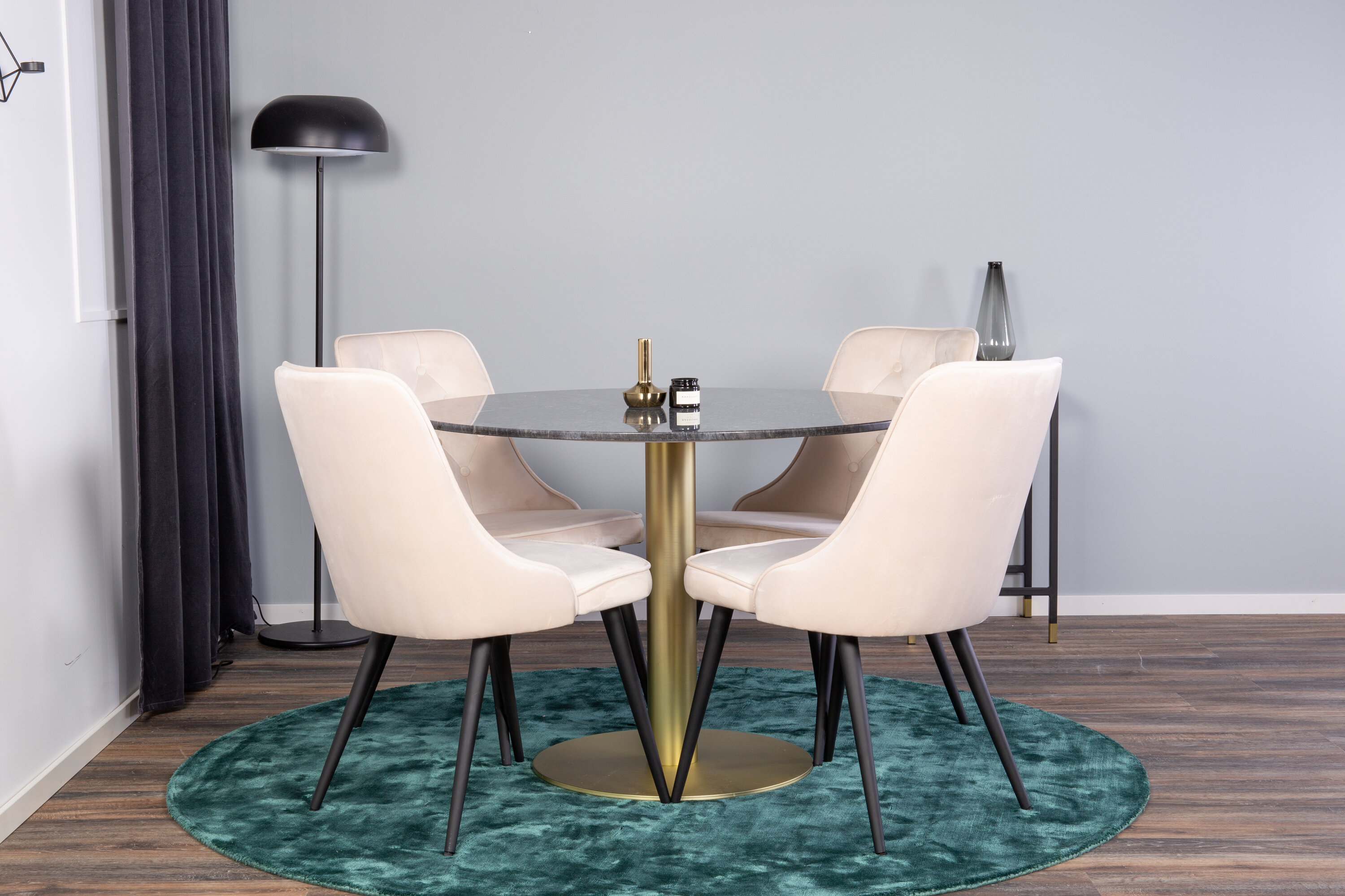 Esstisch Estelle in schlankem Design, dazu beige Esszimmerstühle Velvet - die perfekte Kombination für alle, die eine trendige Food-Gruppe suchen. Der hohe Sitzkomfort der Stühle lädt zu langen und wunderbaren Momenten der Geselligkeit ein!