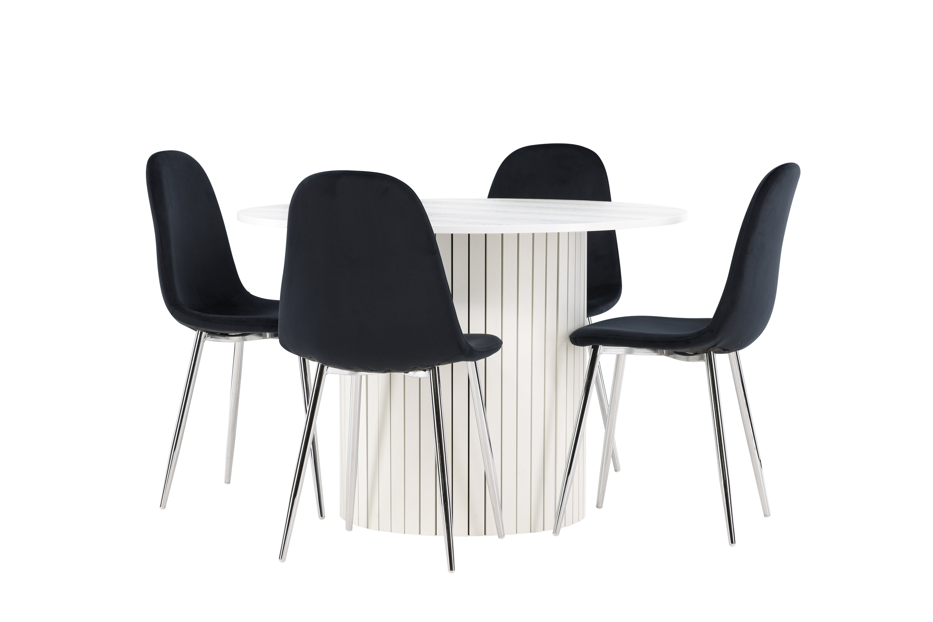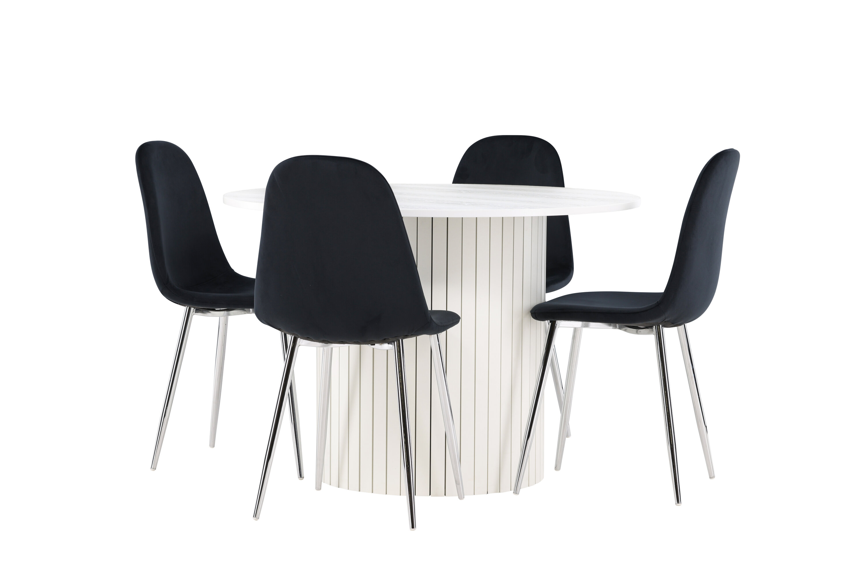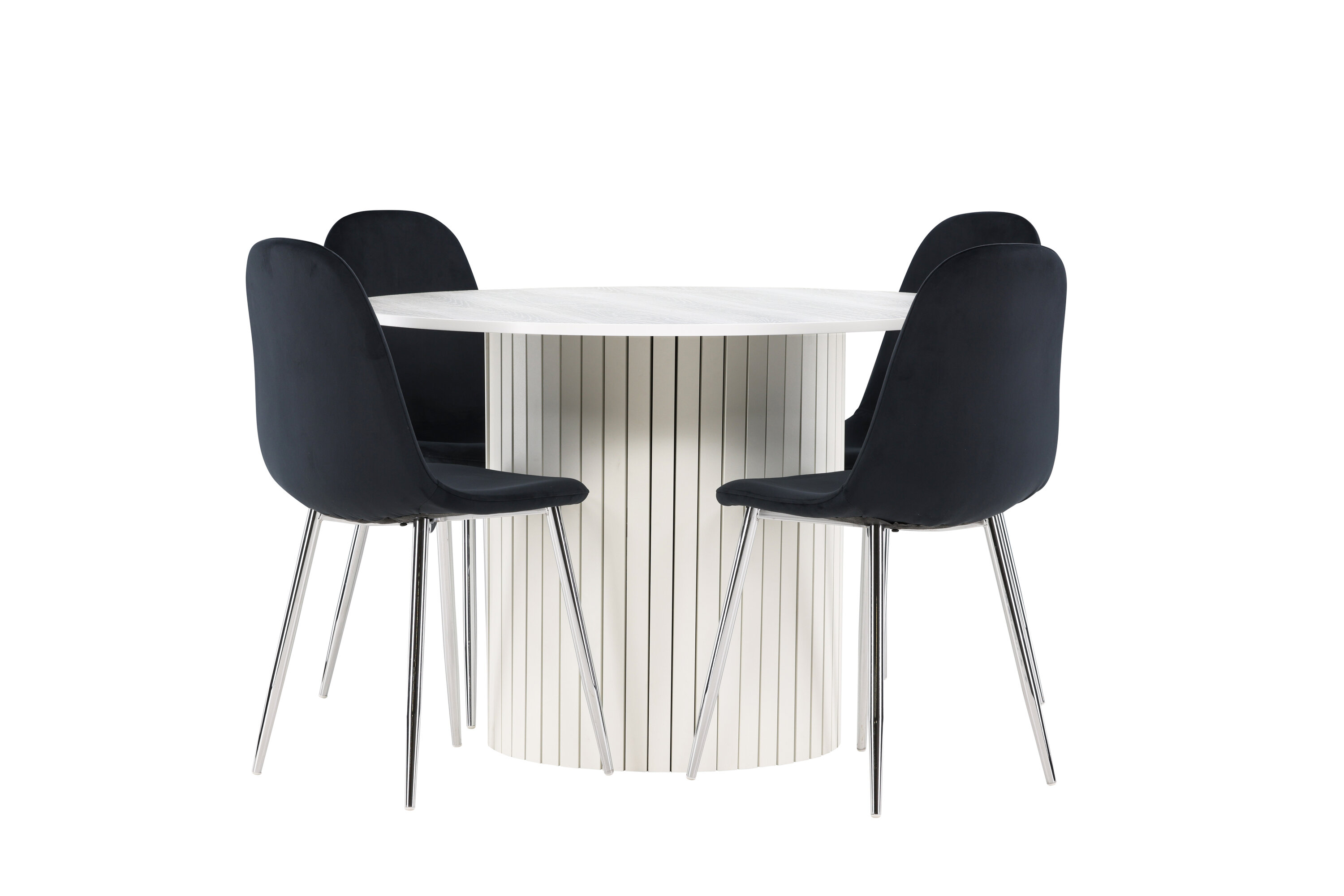 Gestalten Sie einen stilvollen und einladenden Essbereich mit unserem eleganten Ess-Set, das den modernen Häron-Tisch mit den luxuriösen Polar-Stühlen kombiniert. Dieses Ess-Set ist perfekt für alltägliche Abendessen und festliche Anlässe und verleiht Ihrem Esszimmer ein raffiniertes und modernes Ambiente. Der Häron-Tisch aus MDF hat eine reinweiße Farbe, die Ihrem Esszimmer eine helle und frische Atmosphäre verleiht. Mit einem Durchmesser von 110 cm bietet der Tisch viel Platz für Essen und Gespräche, während seine runde Form eine harmonische und ausgewogene Umgebung schafft. Die robuste Konstruktion des Tisches sorgt für langanhaltenden Einsatz und Stabilität. Die vier Polar Stühle ergänzen den Tisch mit ihren eleganten schwarzen Samtsitzen perfekt. Diese Stühle bieten sowohl Komfort als auch Stil und sind daher ideal für lange, angenehme Abendessen mit Familie und Freunden. Ihr modernes Design mit hohen Rückenlehnen und weichen Sitzen verleiht Ihrem Esszimmer eine raffinierte und moderne Note. Dieses Ess-Set ist eine perfekte Mischung aus Ästhetik und Funktionalität und damit eine ausgezeichnete Wahl für diejenigen, die einen eleganten und komfortablen Essbereich suchen. Rüsten Sie Ihren Speisesaal mit der Kombination aus Häron-Tisch und Polar-Stühlen auf und schaffen Sie einen Ort, an dem Erinnerungen und Freude geteilt werden.