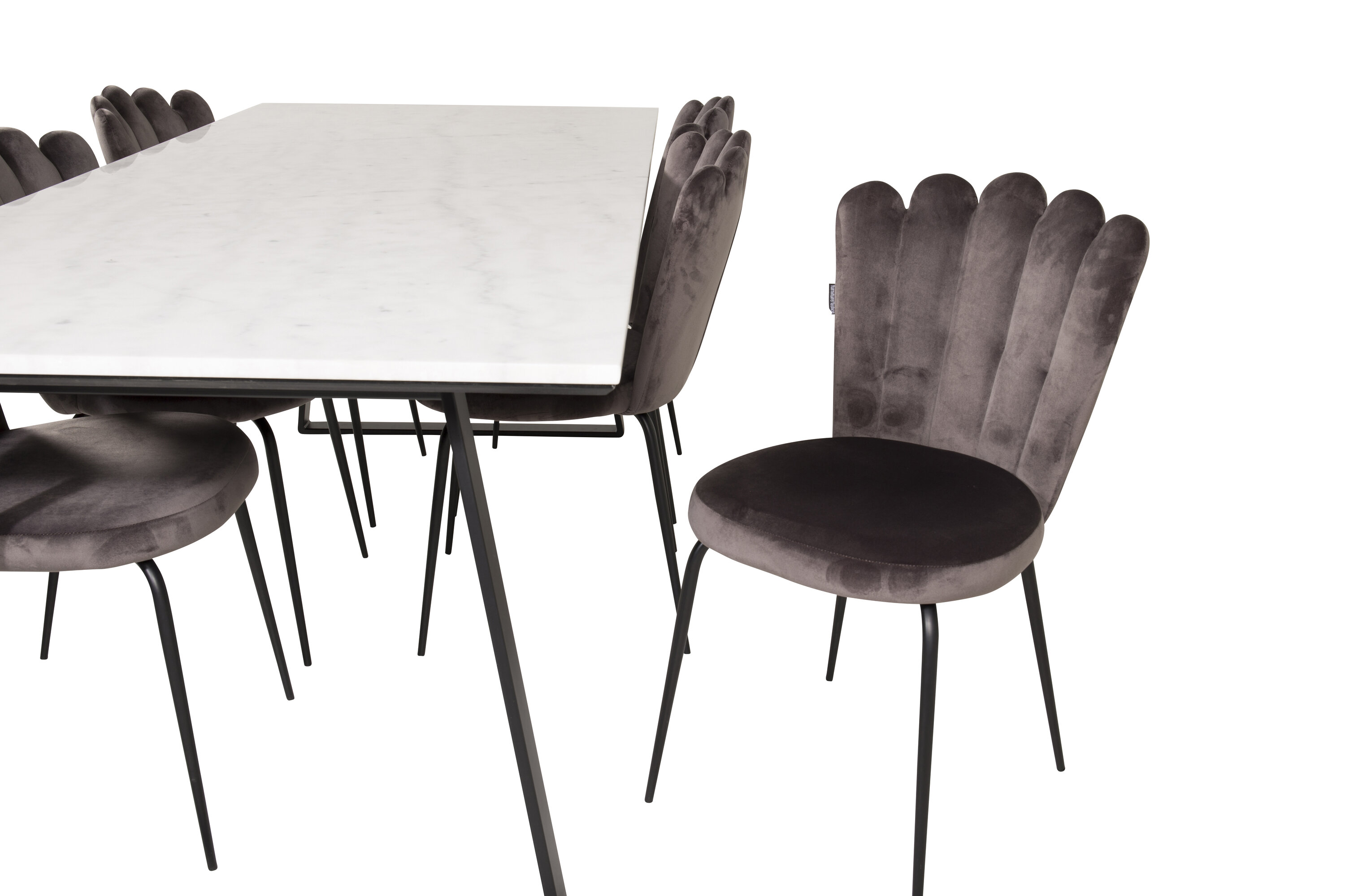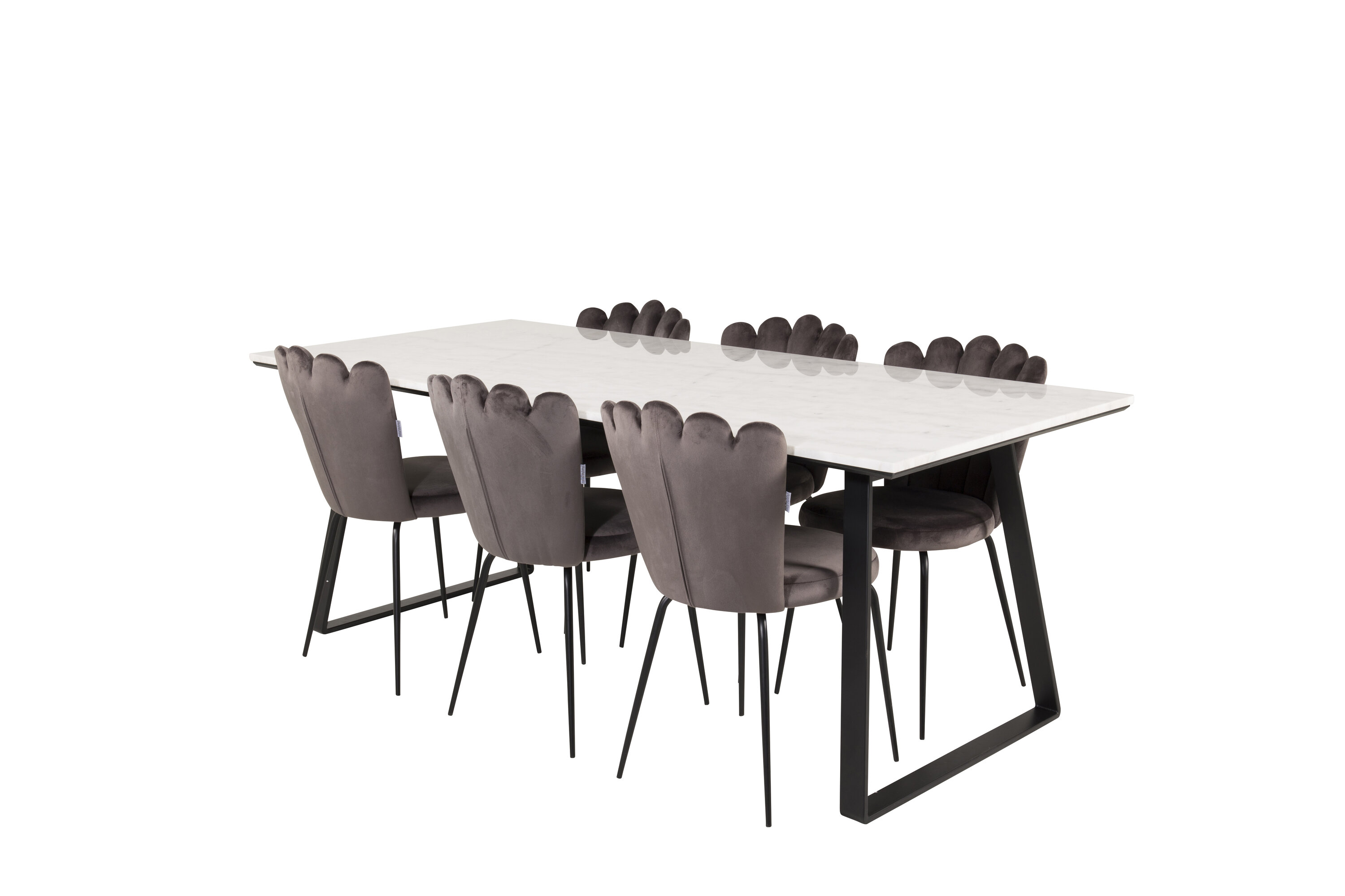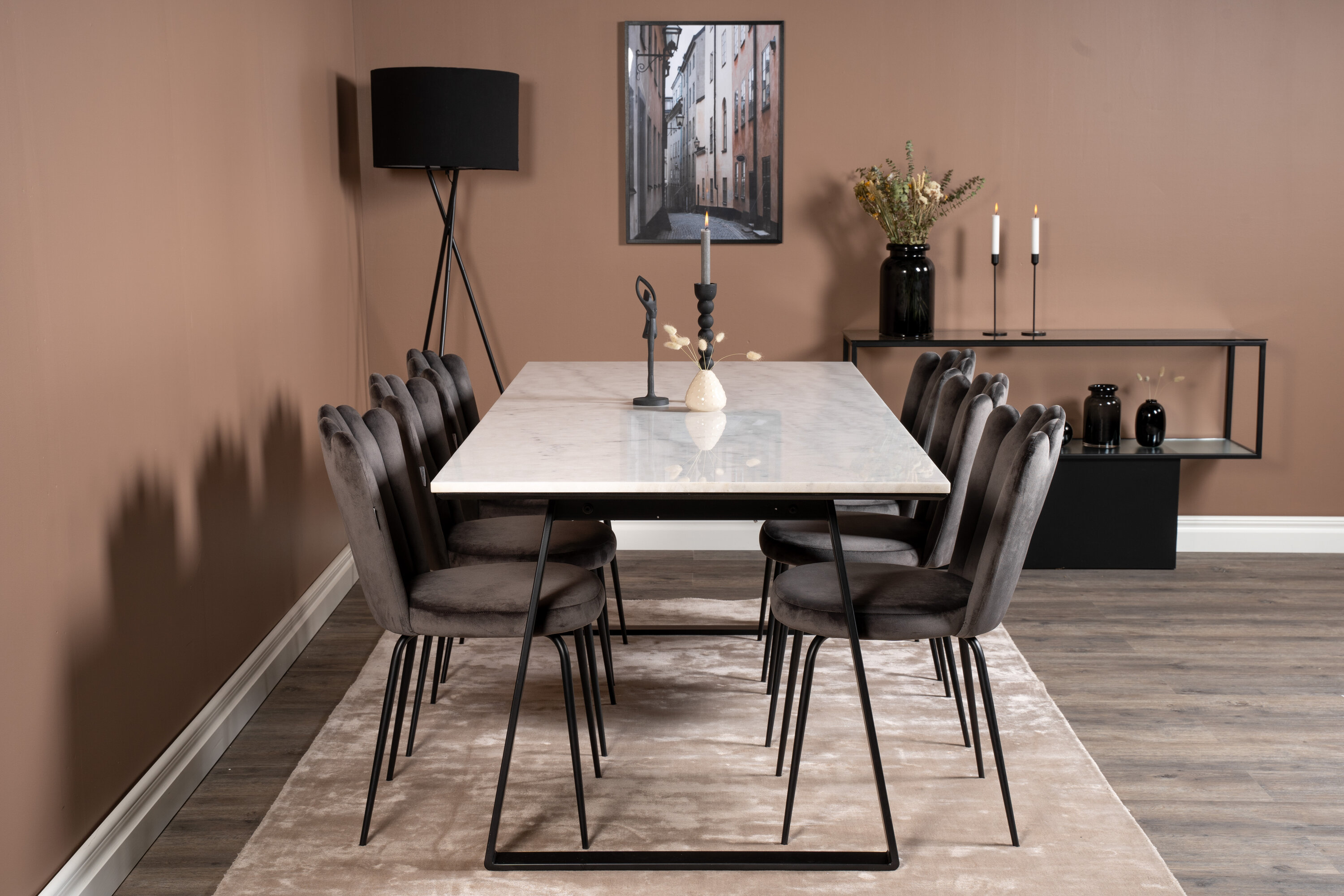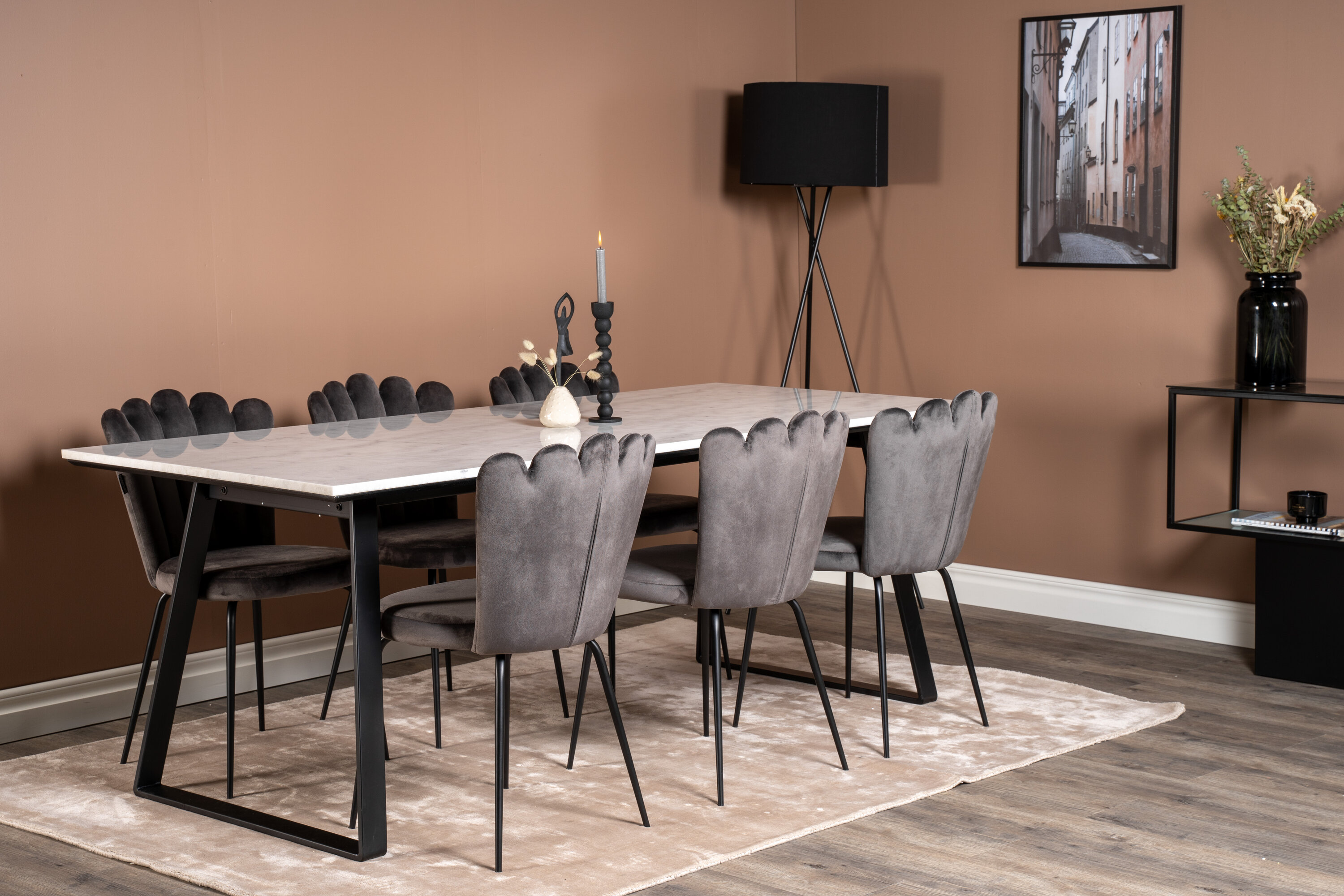 Der elegante Marmortisch der Serie Estelle wird hier mit komfortablen Esszimmerstühlen Limhamn kombiniert. Eine Lebensmittelgruppe, die Luxus vermittelt, der in die meisten Haushalte passt!