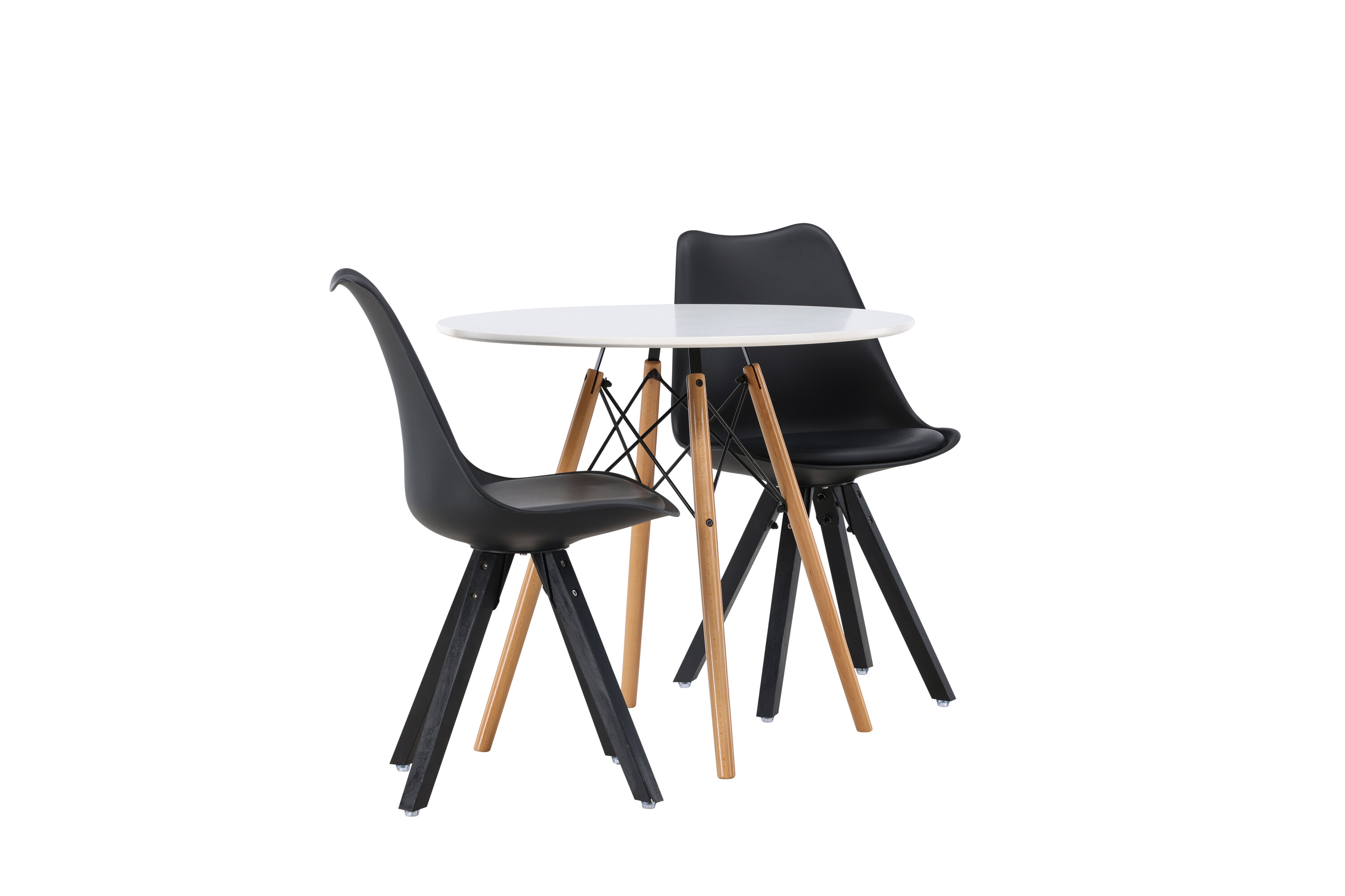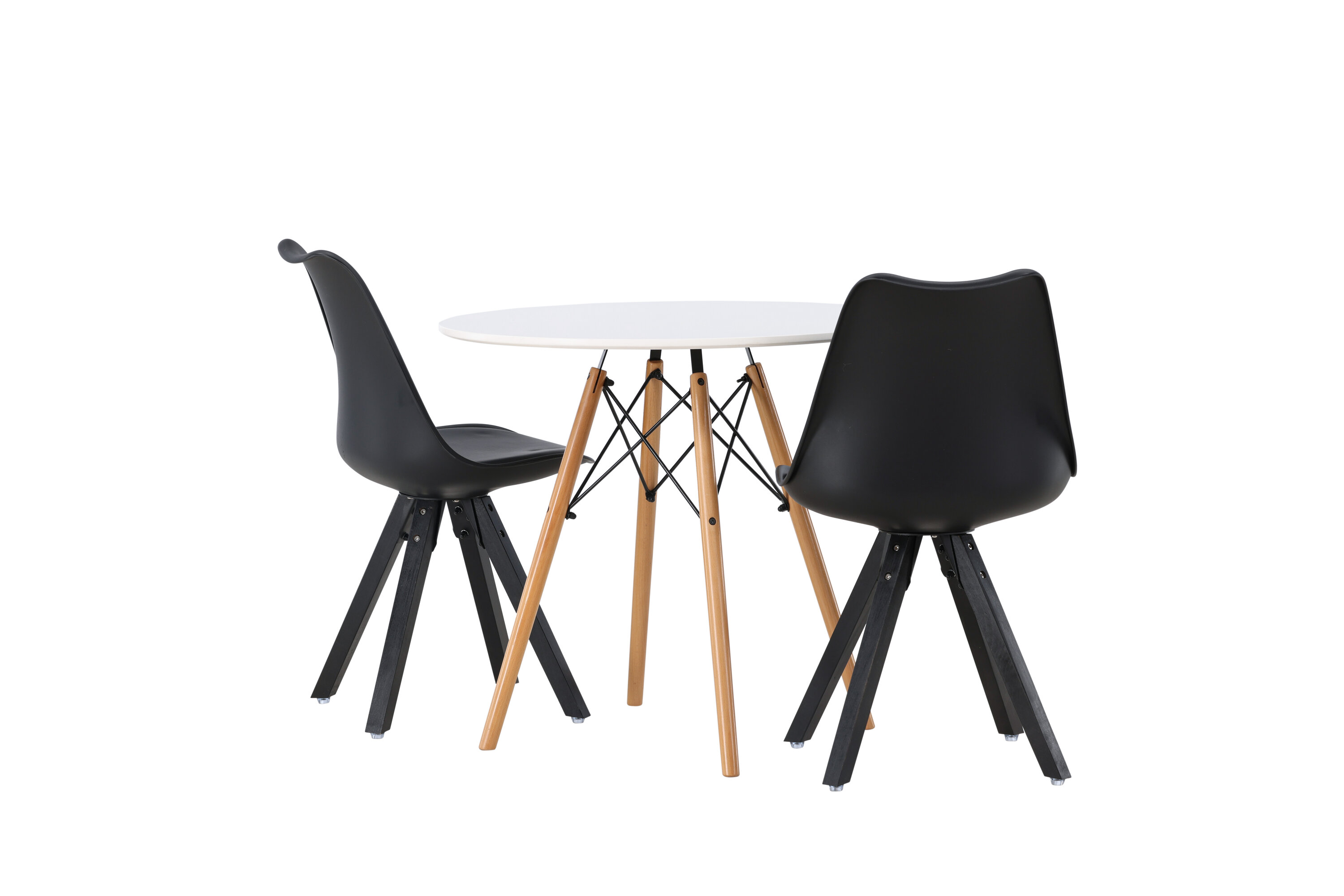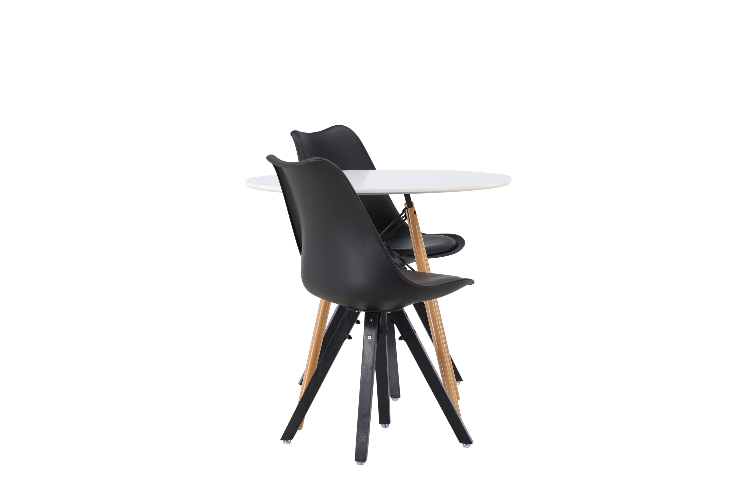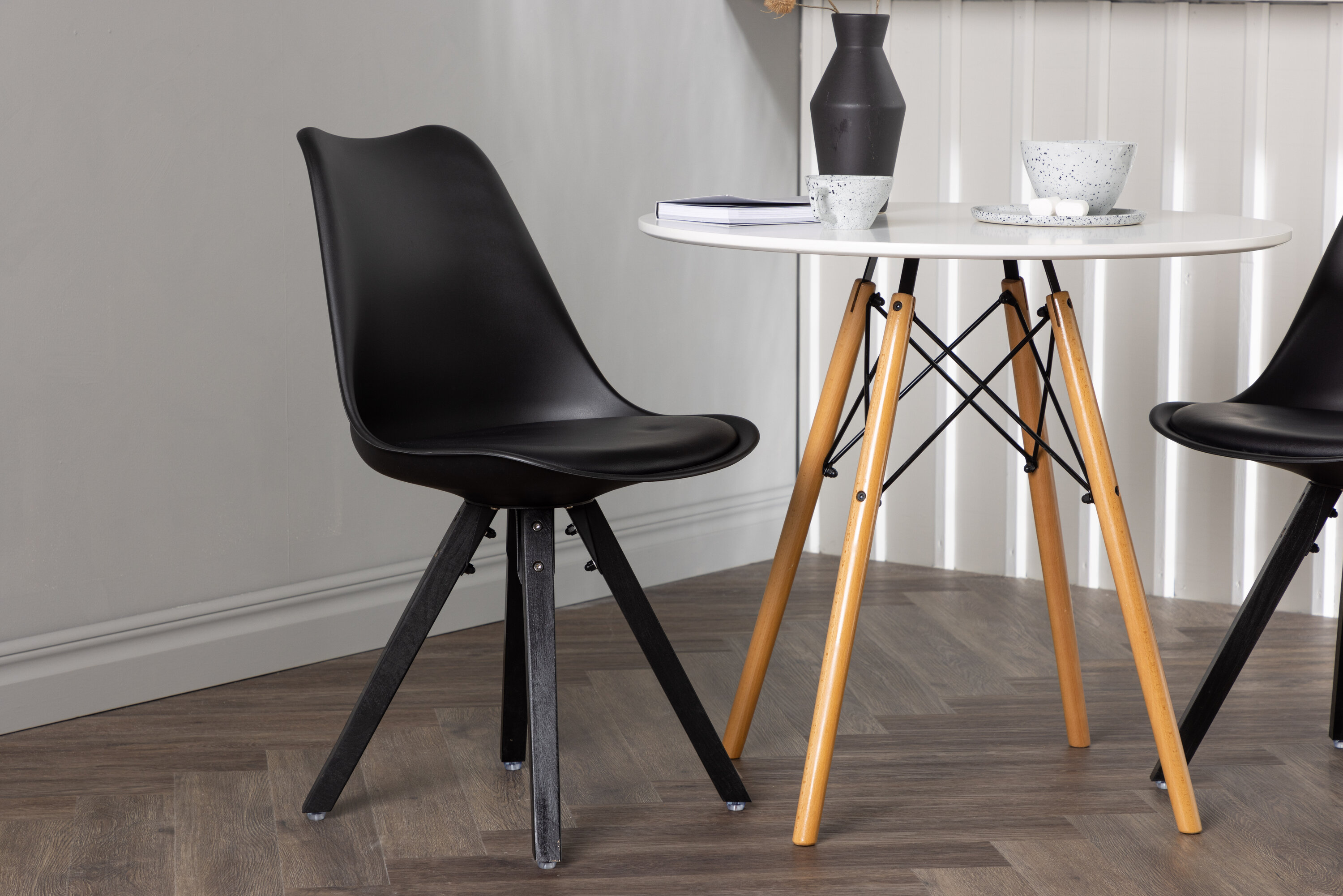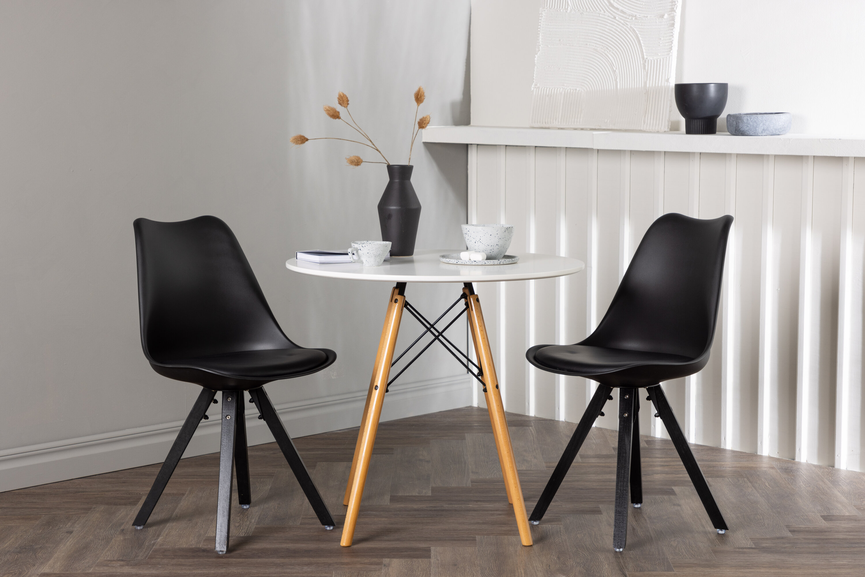 Geben Sie mit einer stilvollen Essensgruppe den Ton an! Der runde Esstisch Danburi hat ein klassisches Design mit einer runden Tischplatte aus weißem MDF und leicht ausgestellten Beinen aus Buchenholz mit dekorativen Details aus schwarzem Stahl. Hier in stilvoller Kombination mit nachhaltigen Esszimmerstühlen aus der Zeno-Serie. Der Stuhl hat ein einladendes Design mit Rückenlehne und Sitz in schwarzem Kunststoff, eingebautem Sitzkissen mit hohem Komfort und vier ausgestellten Beinen in schwarzem Holz. Trendfest und langlebig! Tischdurchmesser: 60cm.