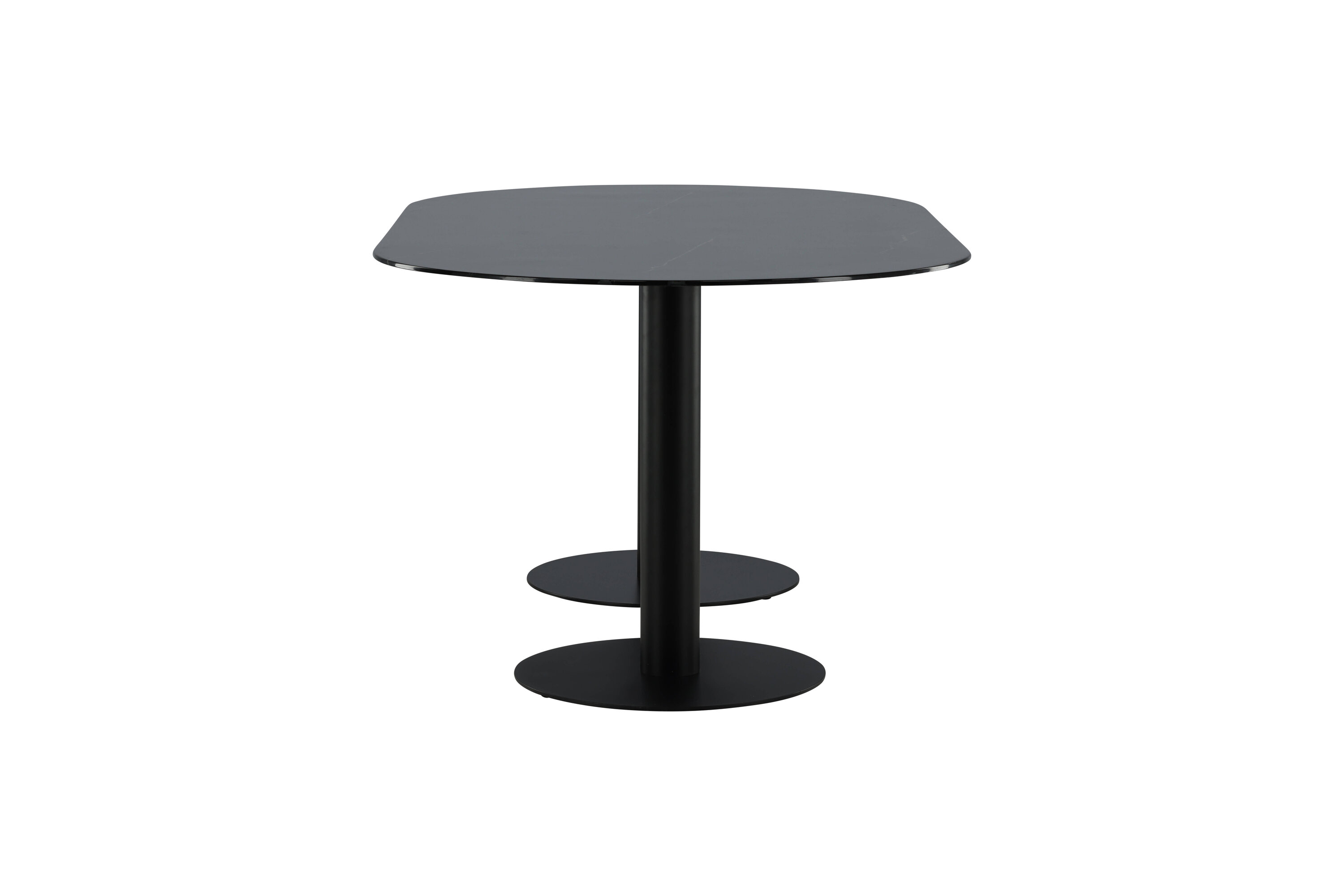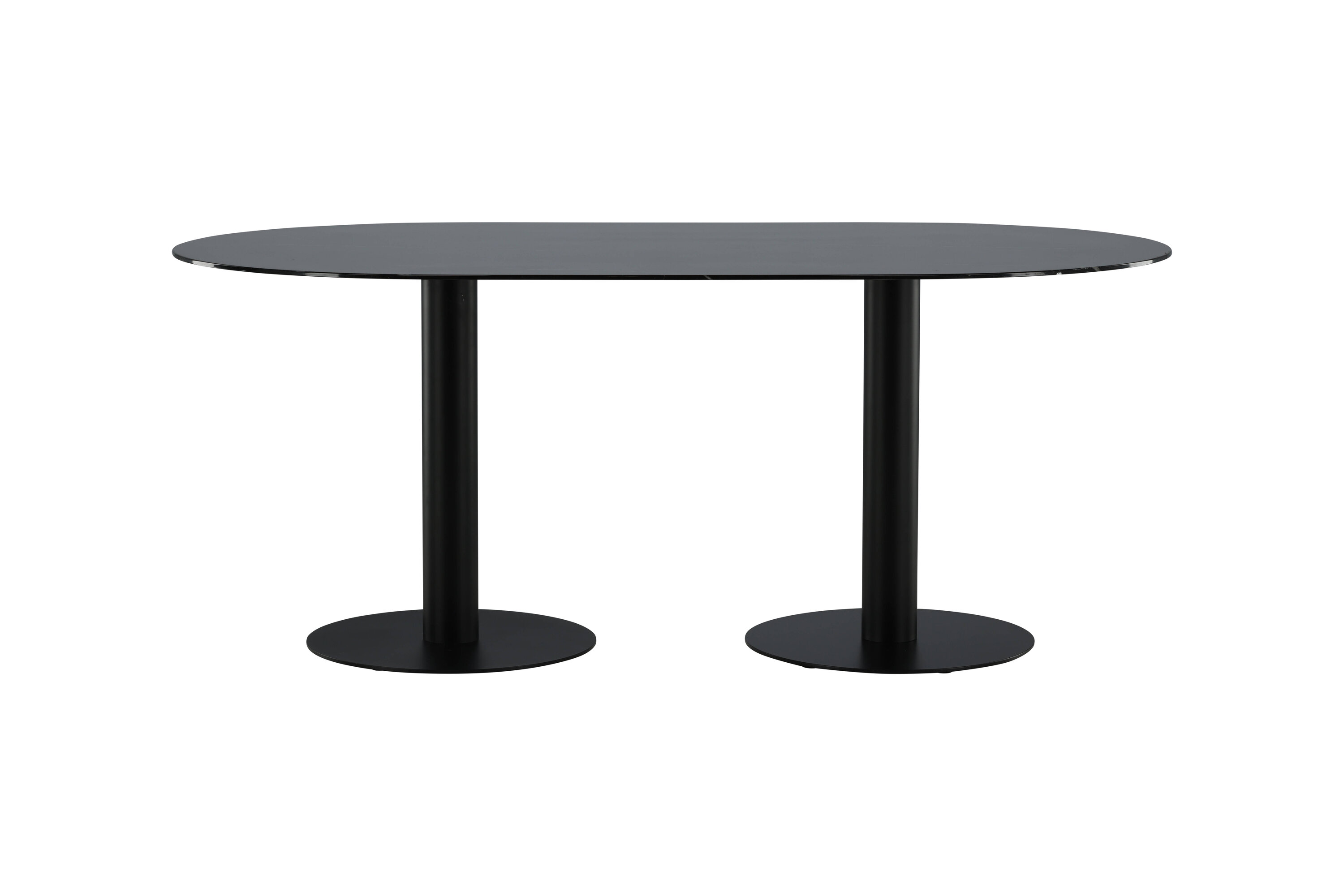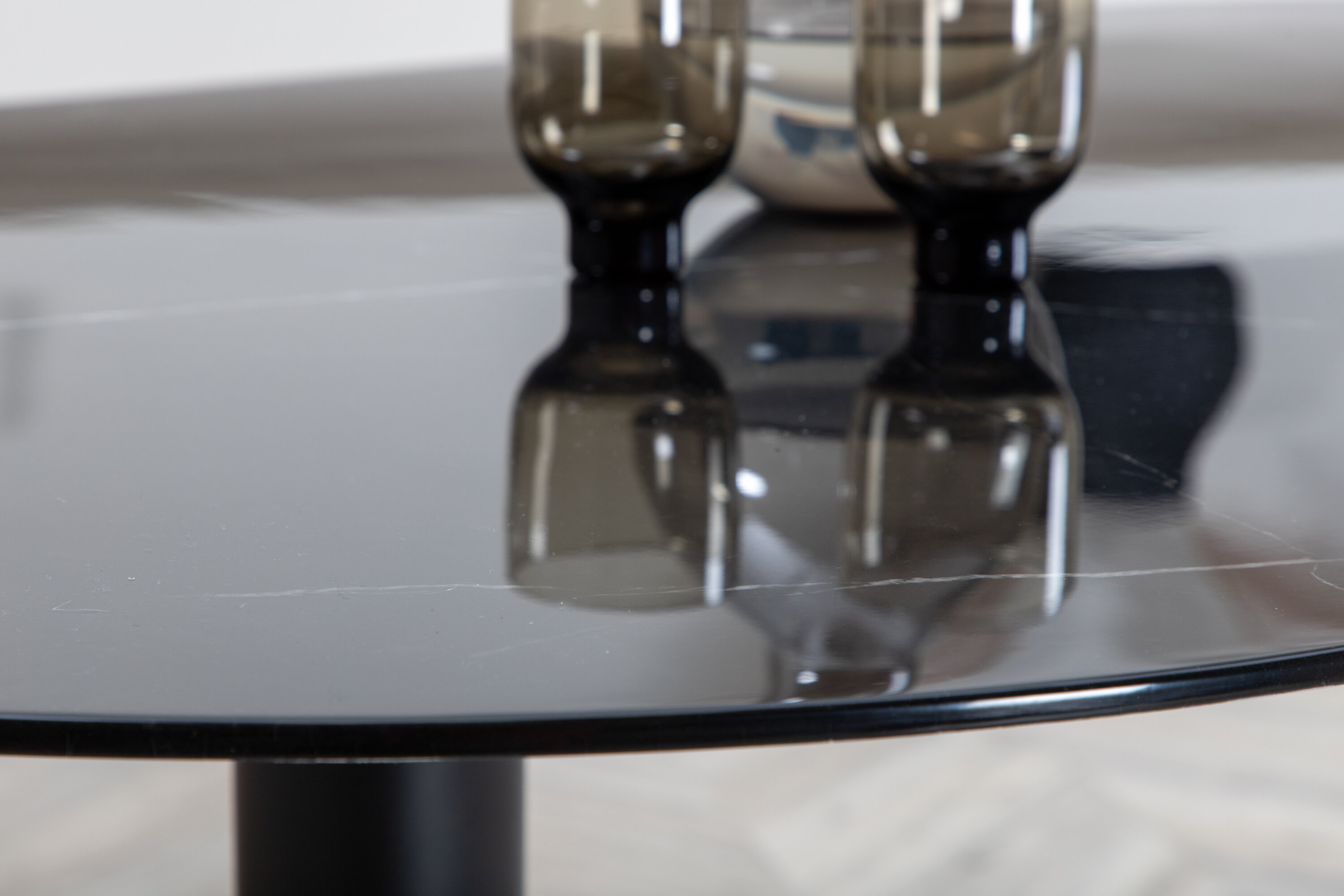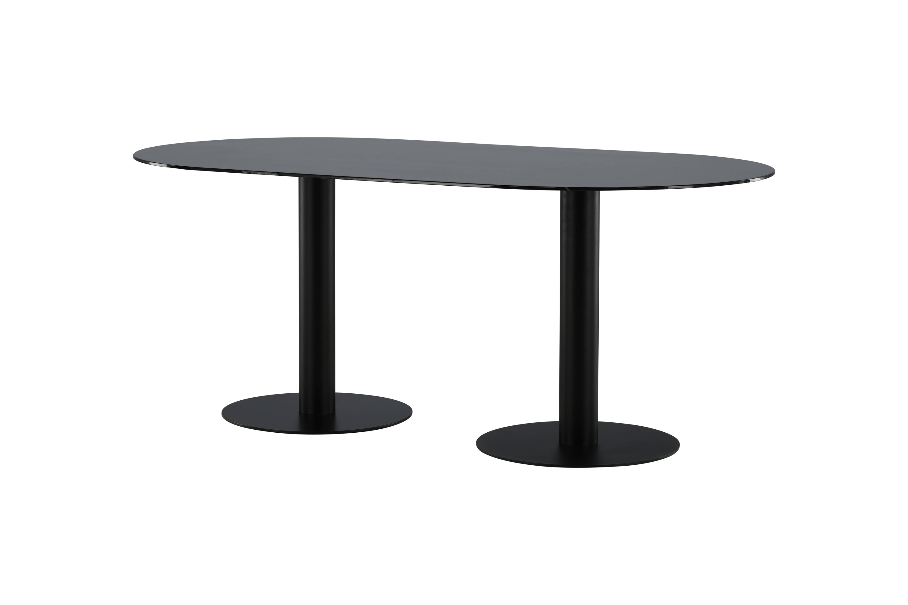 Ein ovaler Designtisch, der die Blicke auf sich zieht und durch seine stilvolle Eleganz besticht. Der Esstisch Pillan vermittelt mit seiner schmalen Tischplatte aus MDF-Furnier mit natürlichem Marmormuster und Trompetenrahmen aus Metall einen luxuriösen Eindruck. Die schwarze Farbe ist so praktisch wie zeitlos und lässt sich leicht mit anderen Dekoren kombinieren. Kombinieren Sie mit einem Paar bequemer Esszimmerstühle und Sie erhalten eine komplette Essensgruppe für alle Mahlzeiten der Woche!