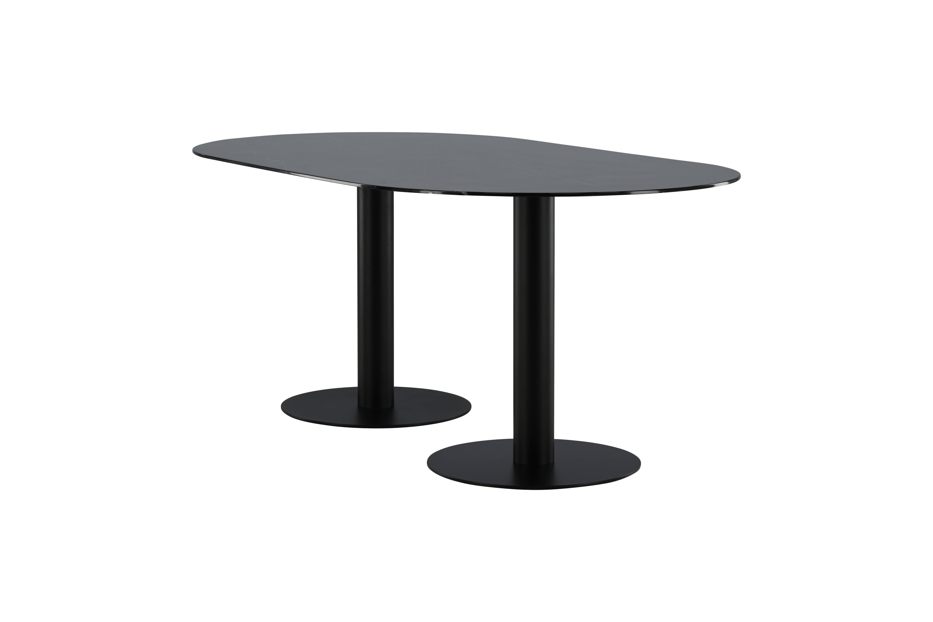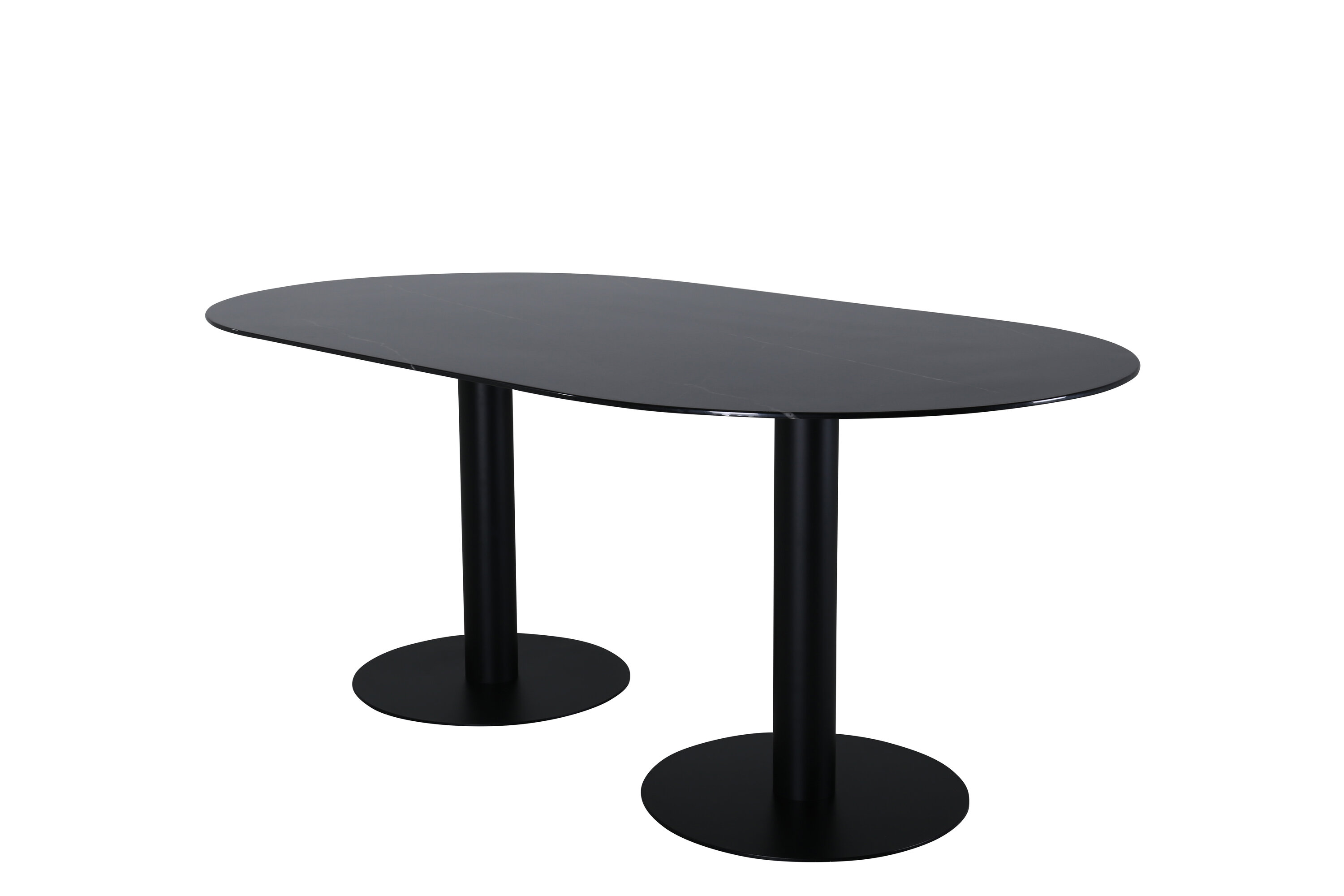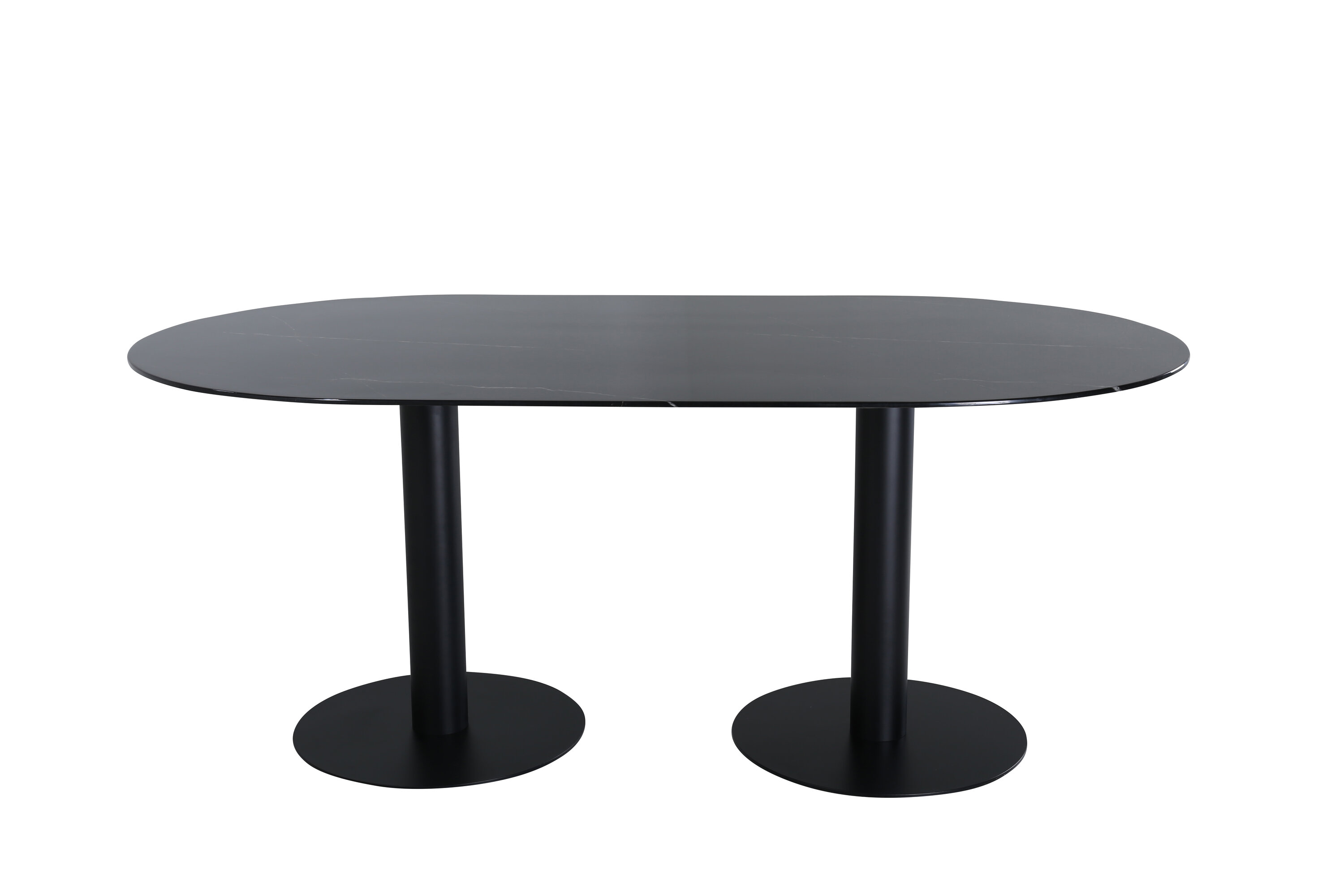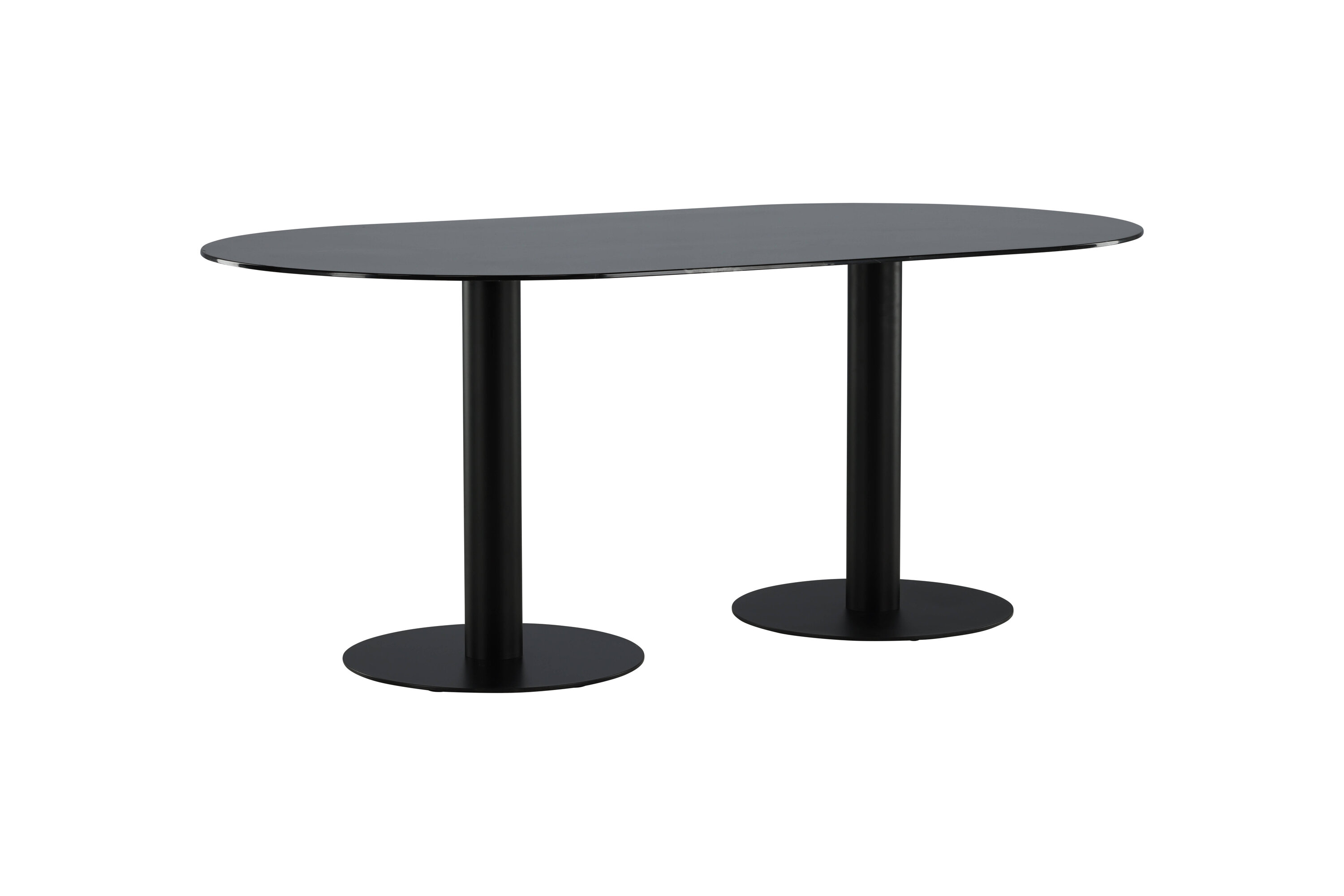 Ein ovaler Designtisch, der die Blicke auf sich zieht und durch seine stilvolle Eleganz besticht. Der Esstisch Pillan vermittelt mit seiner schmalen Tischplatte aus MDF-Furnier mit natürlichem Marmormuster und Trompetenrahmen aus Metall einen luxuriösen Eindruck. Die schwarze Farbe ist so praktisch wie zeitlos und lässt sich leicht mit anderen Dekoren kombinieren. Kombinieren Sie mit einem Paar bequemer Esszimmerstühle und Sie erhalten eine komplette Essensgruppe für alle Mahlzeiten der Woche!