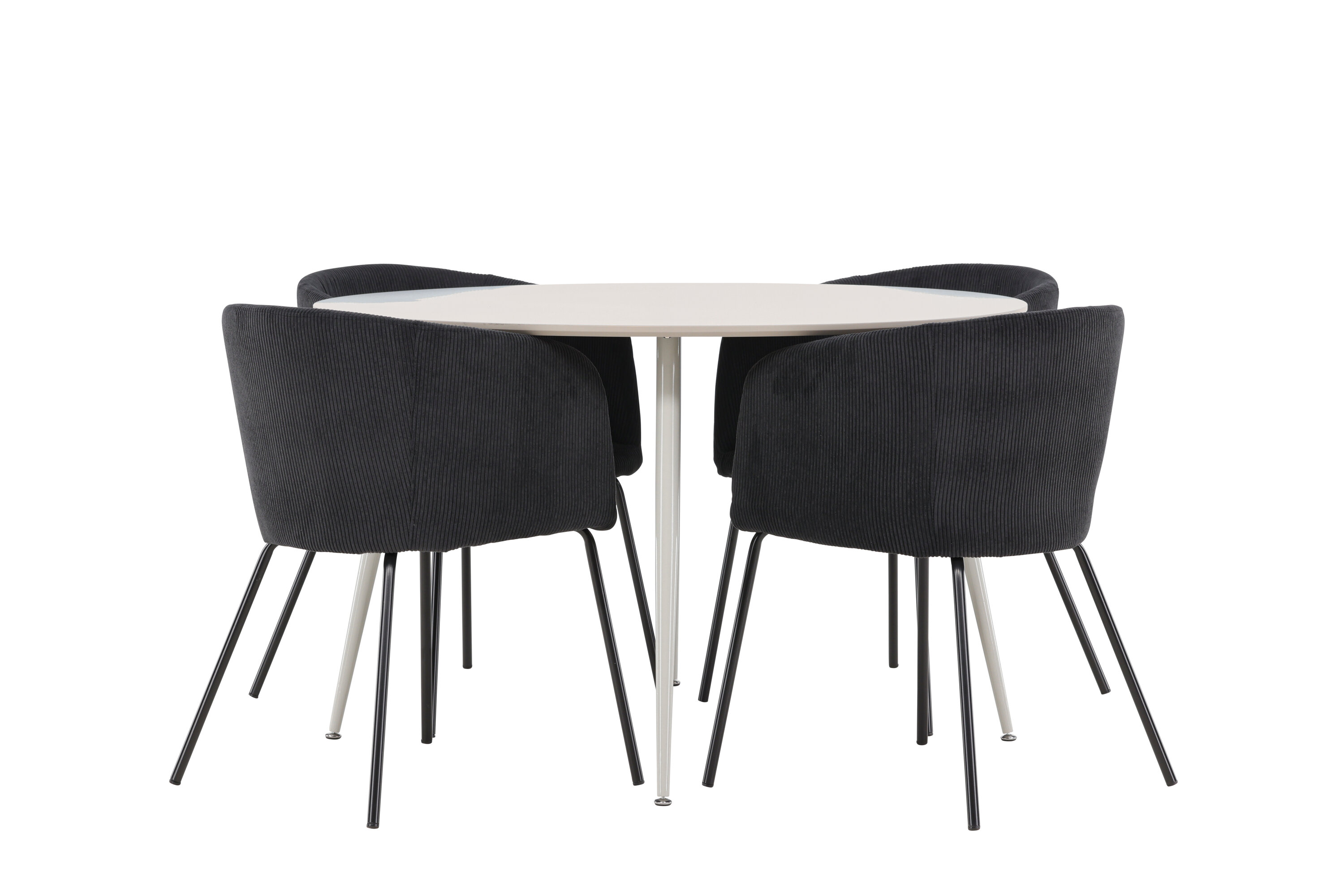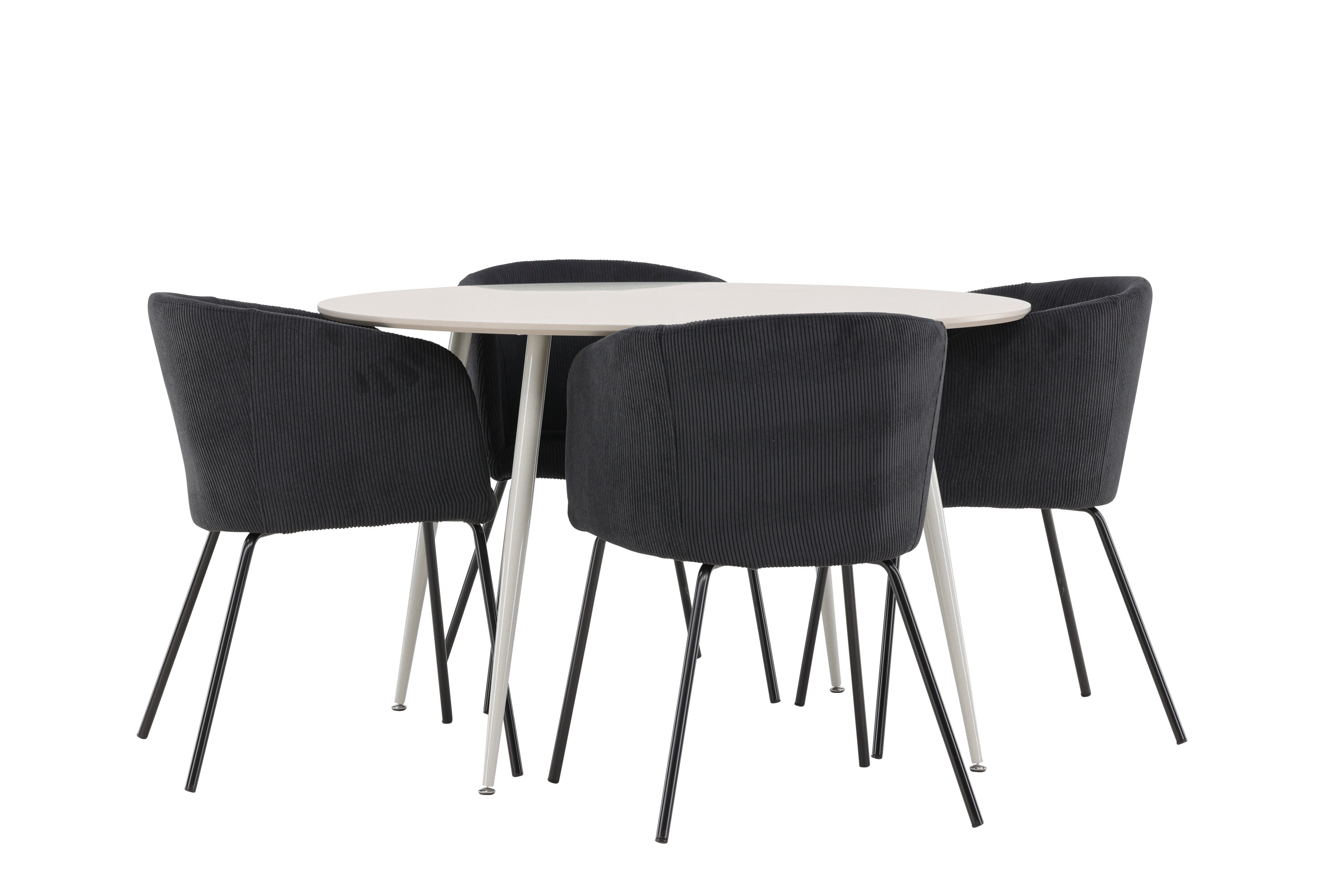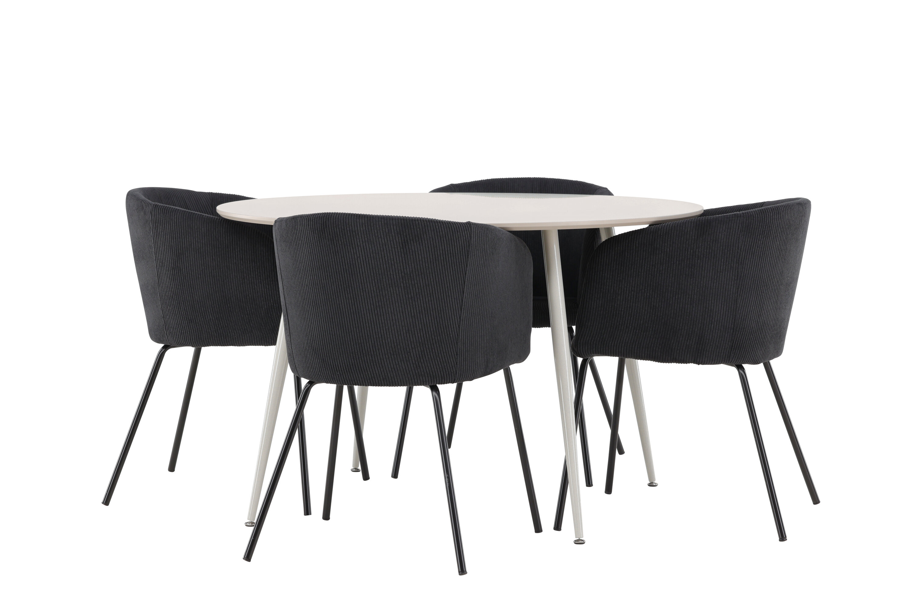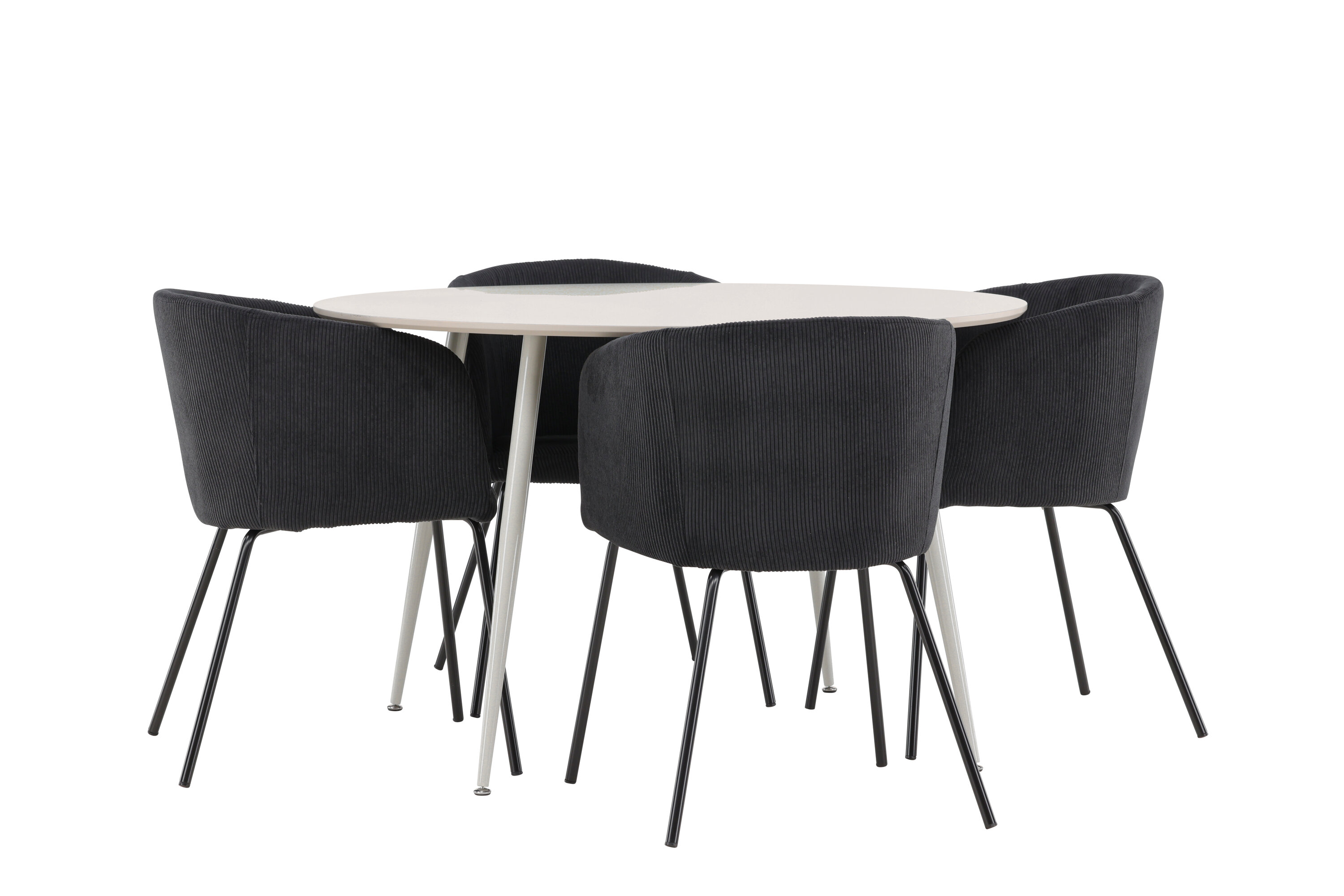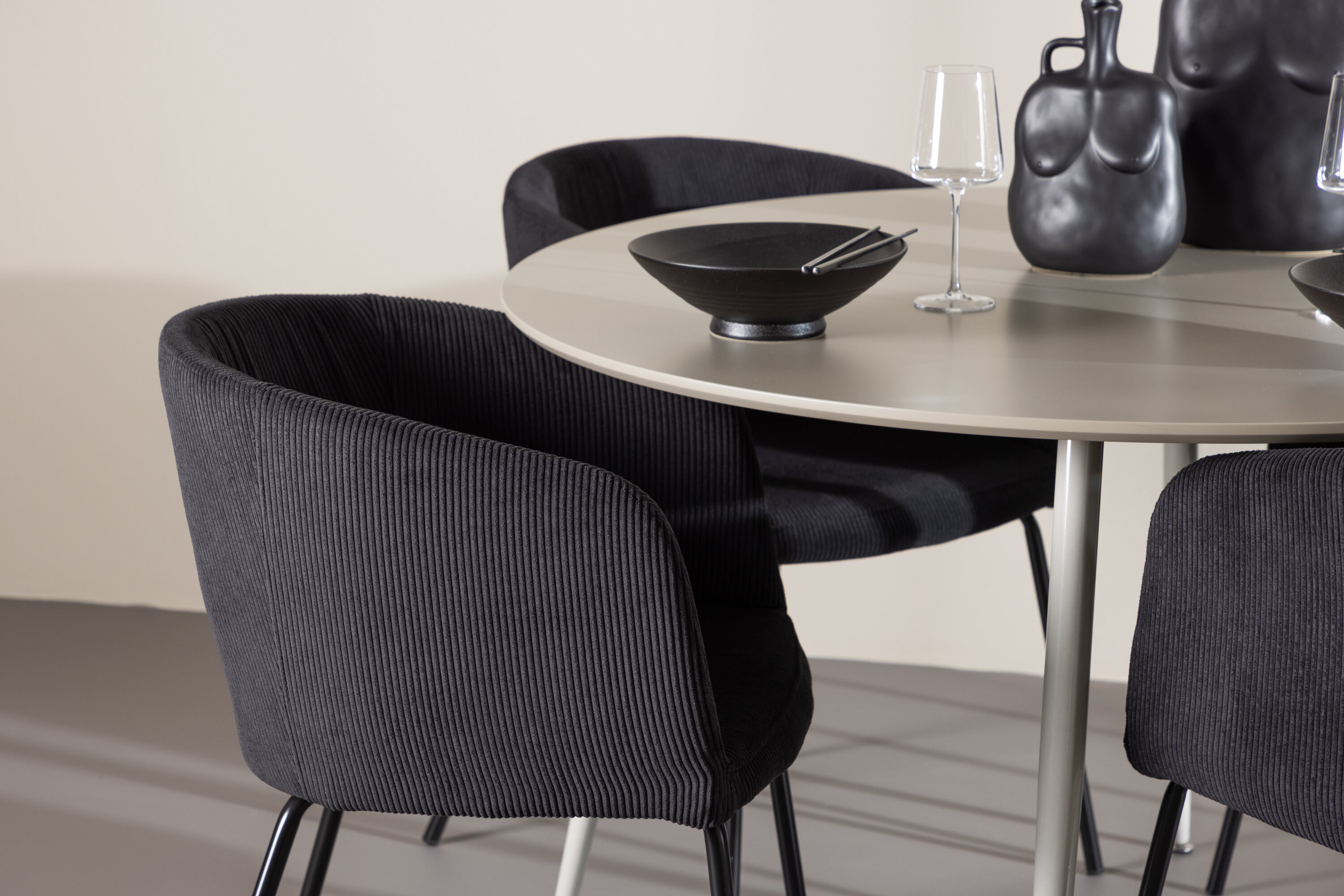 Erstellen Sie einen stilvollen und einladenden Essbereich mit unserem eleganten Ess-Set, das den raffinierten Plaza-Tisch mit den bequemen Berit-Stühlen kombiniert. Dieses Ess-Set ist perfekt für alltägliche Mahlzeiten und festliche Anlässe und verleiht Ihrem Esszimmer ein modernes und raffiniertes Gefühl. Der Plaza-Tisch aus MDF hat eine hellbeige Farbe, die Ihrem Esszimmer ein warmes und einladendes Gefühl verleiht. Mit einem großzügigen Durchmesser von 120 cm bietet der Tisch viel Platz für Essen und Gespräche, während seine runde Form eine harmonische und ausgewogene Atmosphäre schafft. Die robuste Konstruktion des Tisches sorgt für eine langfristige Nutzung und Stabilität. Die vier Berit Stühle ergänzen den Tisch perfekt mit ihren eleganten, mit schwarzem Samt gepolsterten Sitzen. Diese Stühle bieten sowohl Komfort als auch Stil und sind daher ideal für lange, angenehme Mahlzeiten mit Familie und Freunden. Ihr modernes Design mit hohen Rückenlehnen und weichen Sitzen verleiht Ihrem Esszimmer eine raffinierte und zeitgemäße Note. Dieses Ess-Set ist eine perfekte Mischung aus Ästhetik und Funktionalität und damit eine ausgezeichnete Wahl für diejenigen, die einen eleganten und komfortablen Essbereich suchen. Rüsten Sie Ihren Speisesaal mit der stilvollen Kombination aus Plaza-Tisch und Berit-Stühlen auf und schaffen Sie einen Ort, an dem Erinnerungen und Freude geteilt werden.
