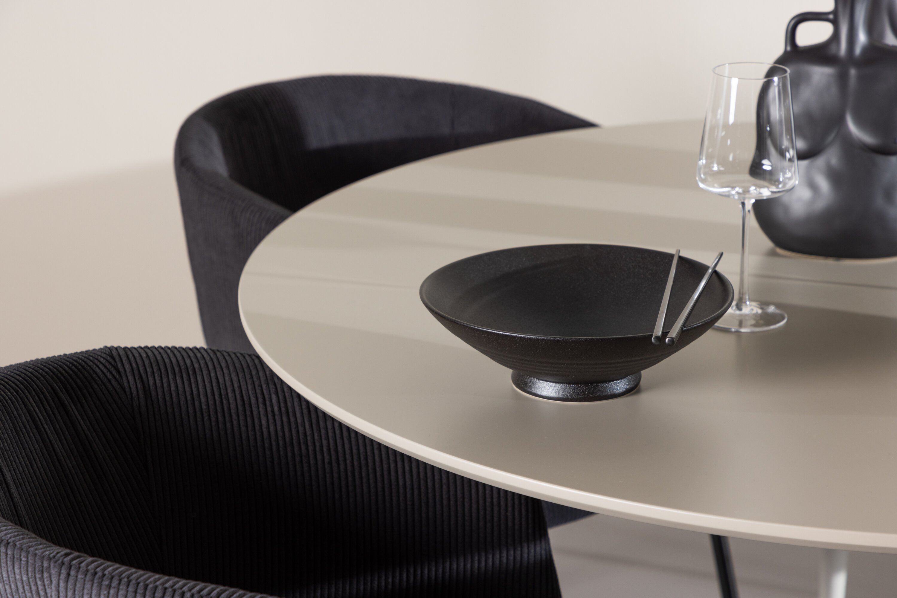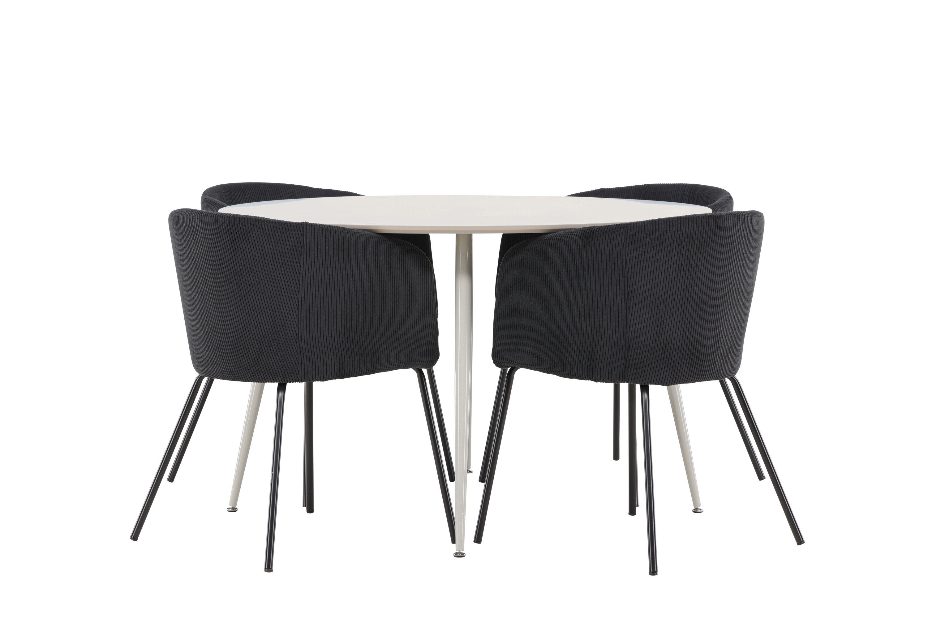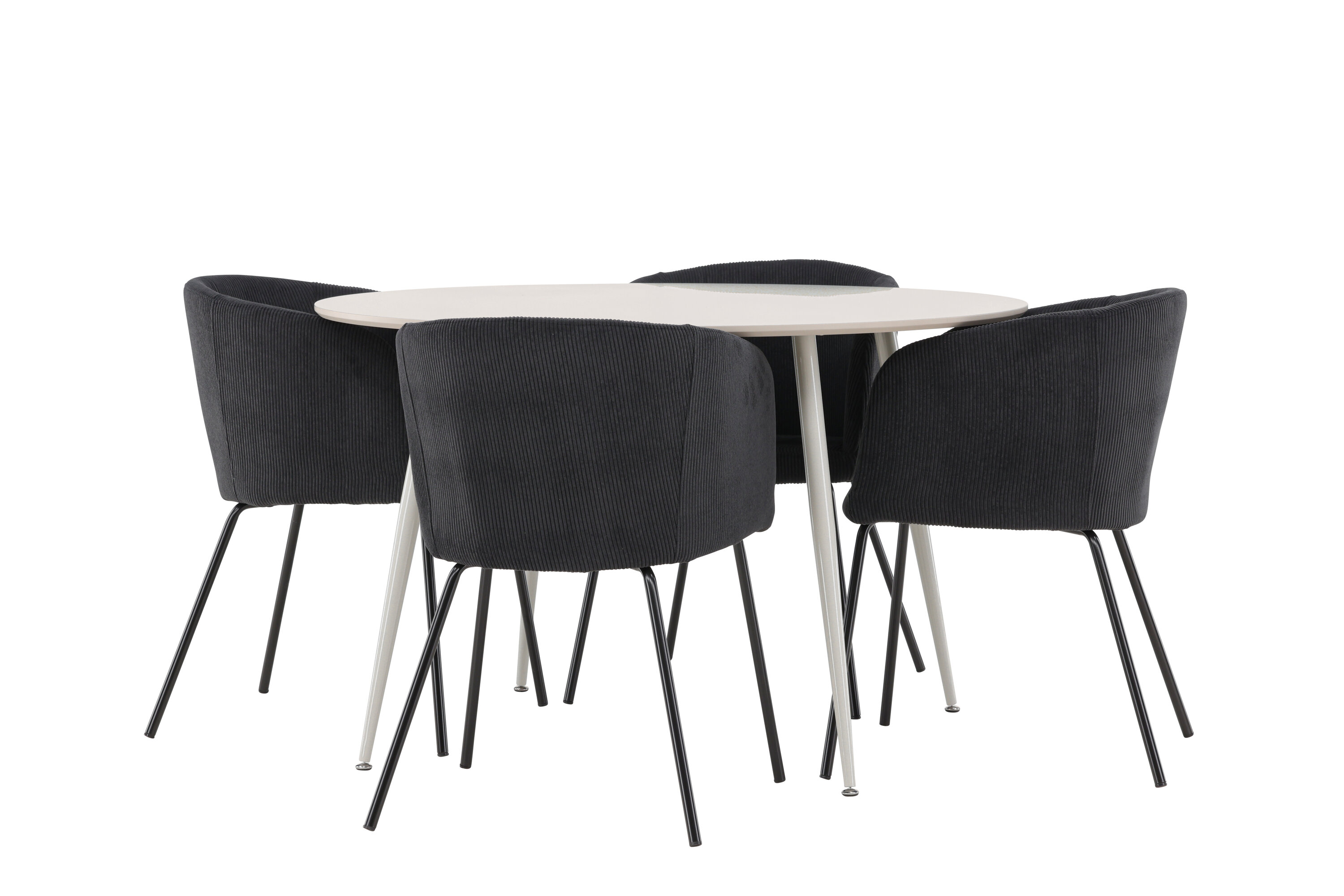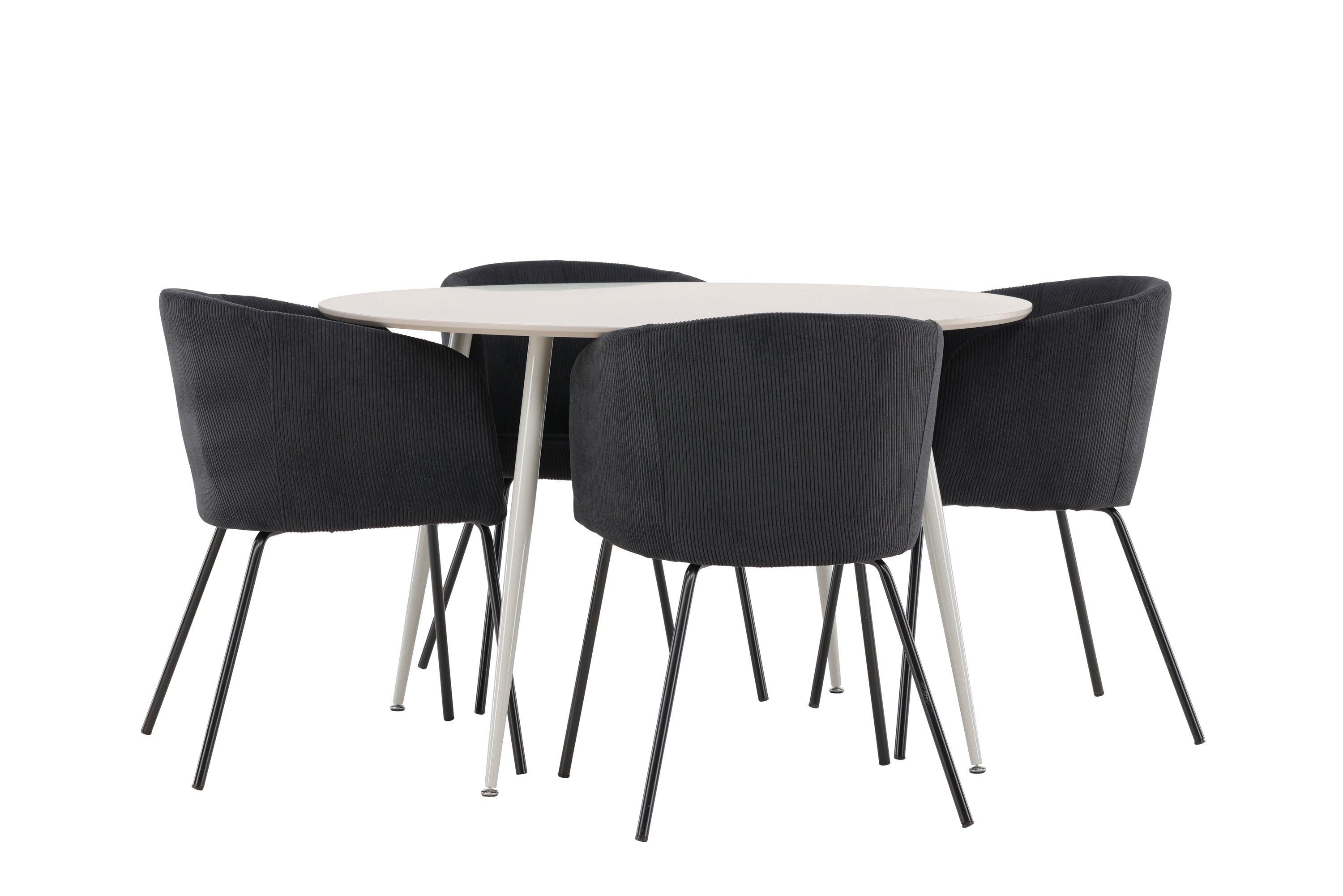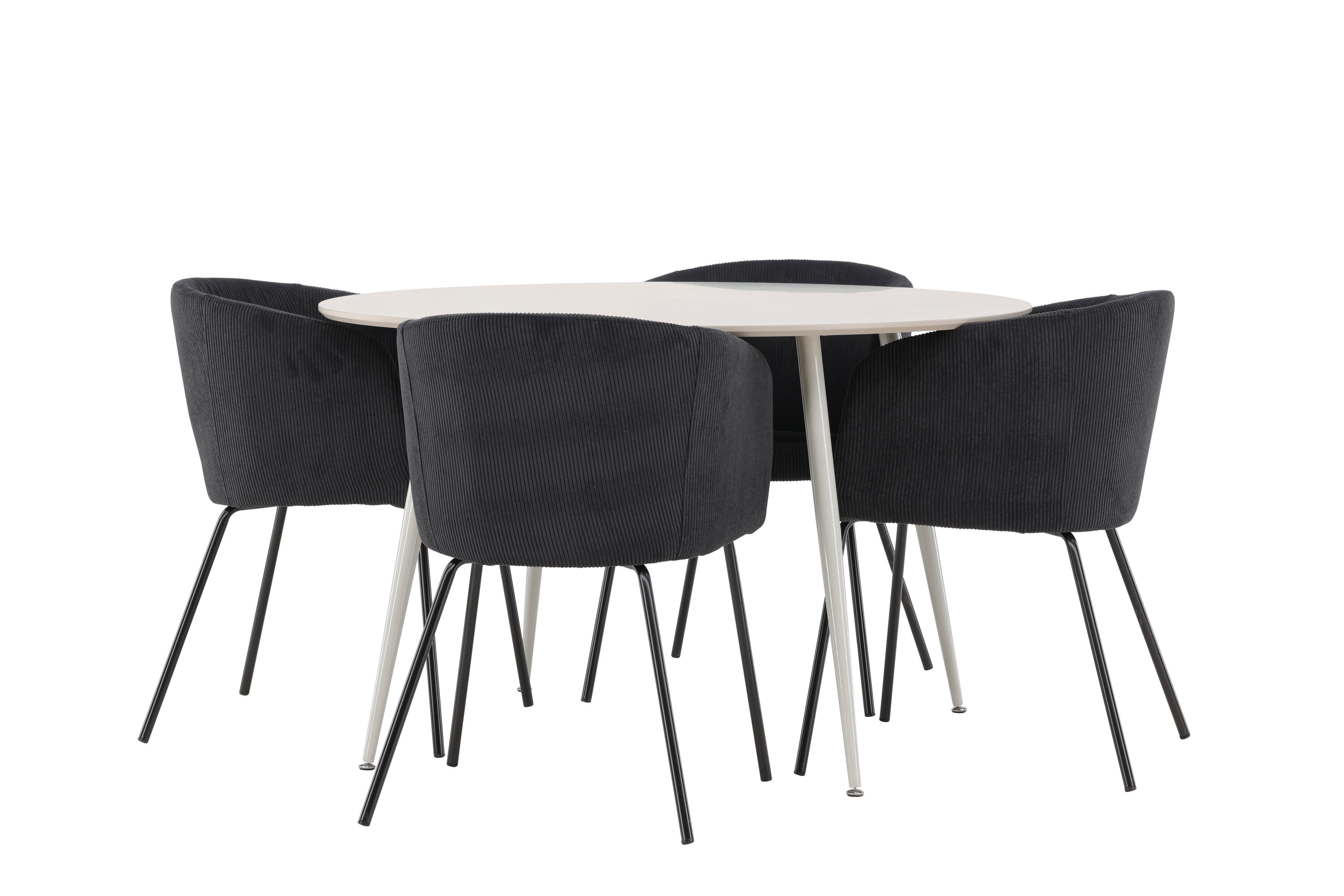 Erstellen Sie einen stilvollen und einladenden Essbereich mit unserem eleganten Ess-Set, das den raffinierten Plaza-Tisch mit den bequemen Berit-Stühlen kombiniert. Dieses Ess-Set ist perfekt für alltägliche Mahlzeiten und festliche Anlässe und verleiht Ihrem Esszimmer ein modernes und raffiniertes Gefühl. Der Plaza-Tisch aus MDF hat eine hellbeige Farbe, die Ihrem Esszimmer ein warmes und einladendes Gefühl verleiht. Mit einem großzügigen Durchmesser von 120 cm bietet der Tisch viel Platz für Essen und Gespräche, während seine runde Form eine harmonische und ausgewogene Atmosphäre schafft. Die robuste Konstruktion des Tisches sorgt für eine langfristige Nutzung und Stabilität. Die vier Berit Stühle ergänzen den Tisch perfekt mit ihren eleganten, mit schwarzem Samt gepolsterten Sitzen. Diese Stühle bieten sowohl Komfort als auch Stil und sind daher ideal für lange, angenehme Mahlzeiten mit Familie und Freunden. Ihr modernes Design mit hohen Rückenlehnen und weichen Sitzen verleiht Ihrem Esszimmer eine raffinierte und zeitgemäße Note. Dieses Ess-Set ist eine perfekte Mischung aus Ästhetik und Funktionalität und damit eine ausgezeichnete Wahl für diejenigen, die einen eleganten und komfortablen Essbereich suchen. Rüsten Sie Ihren Speisesaal mit der stilvollen Kombination aus Plaza-Tisch und Berit-Stühlen auf und schaffen Sie einen Ort, an dem Erinnerungen und Freude geteilt werden.
