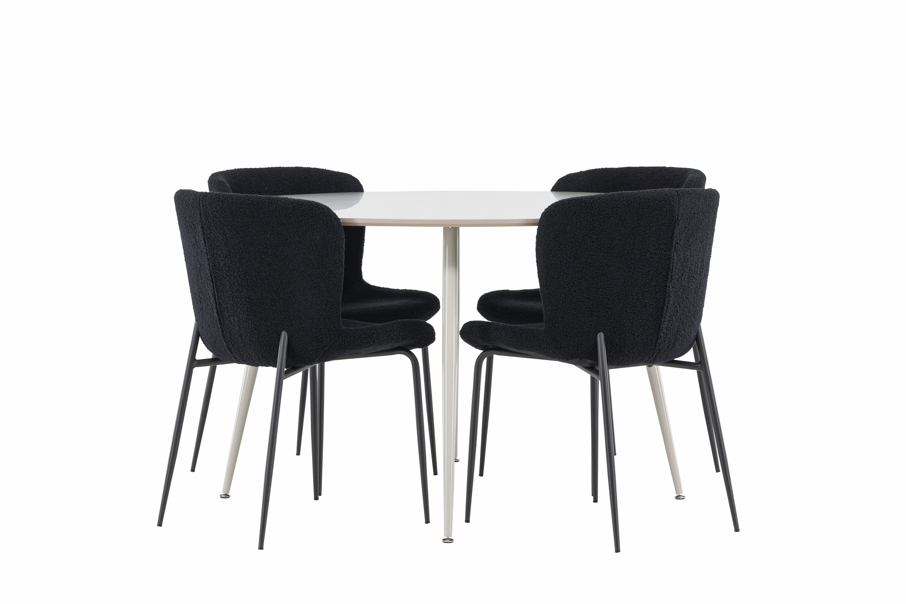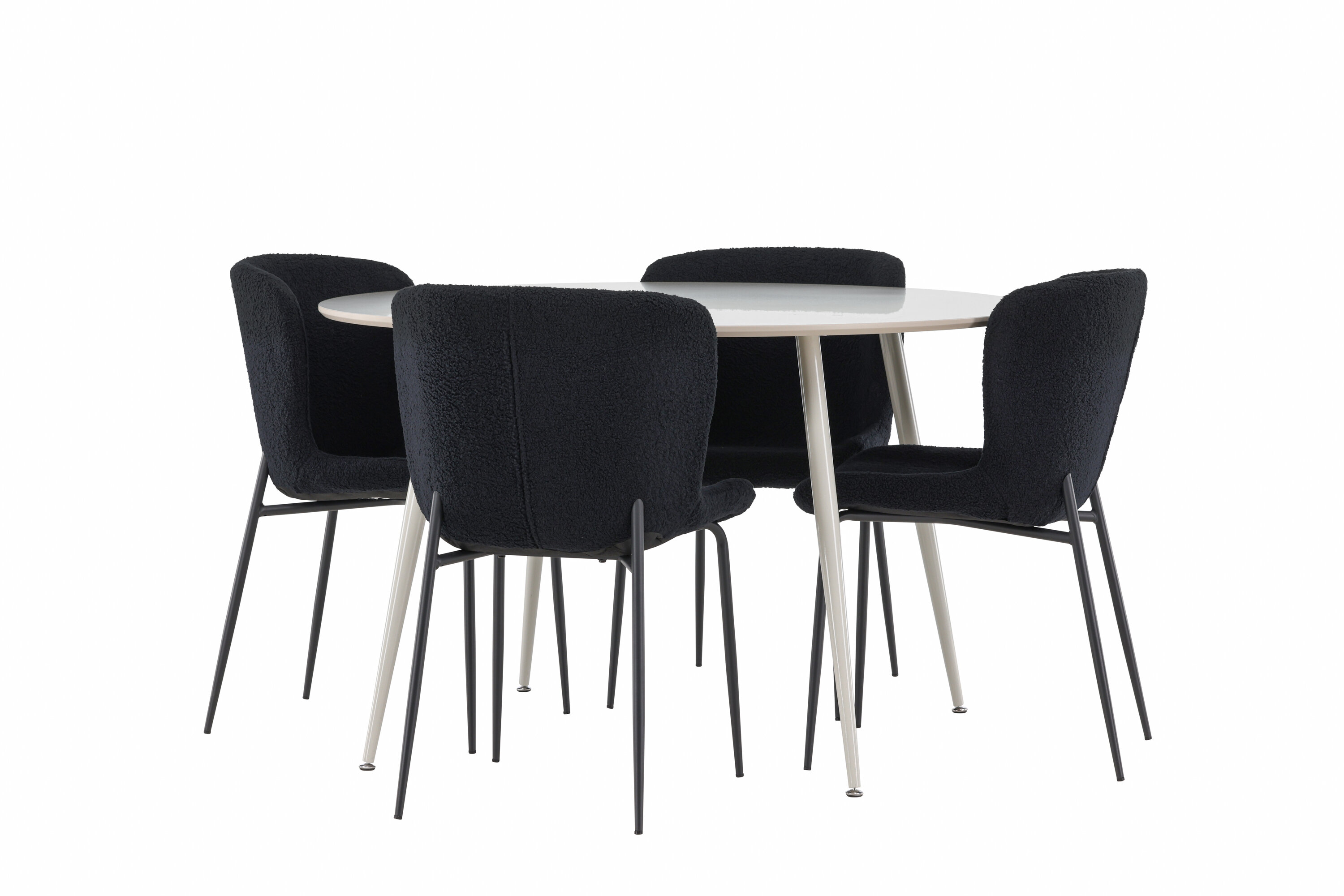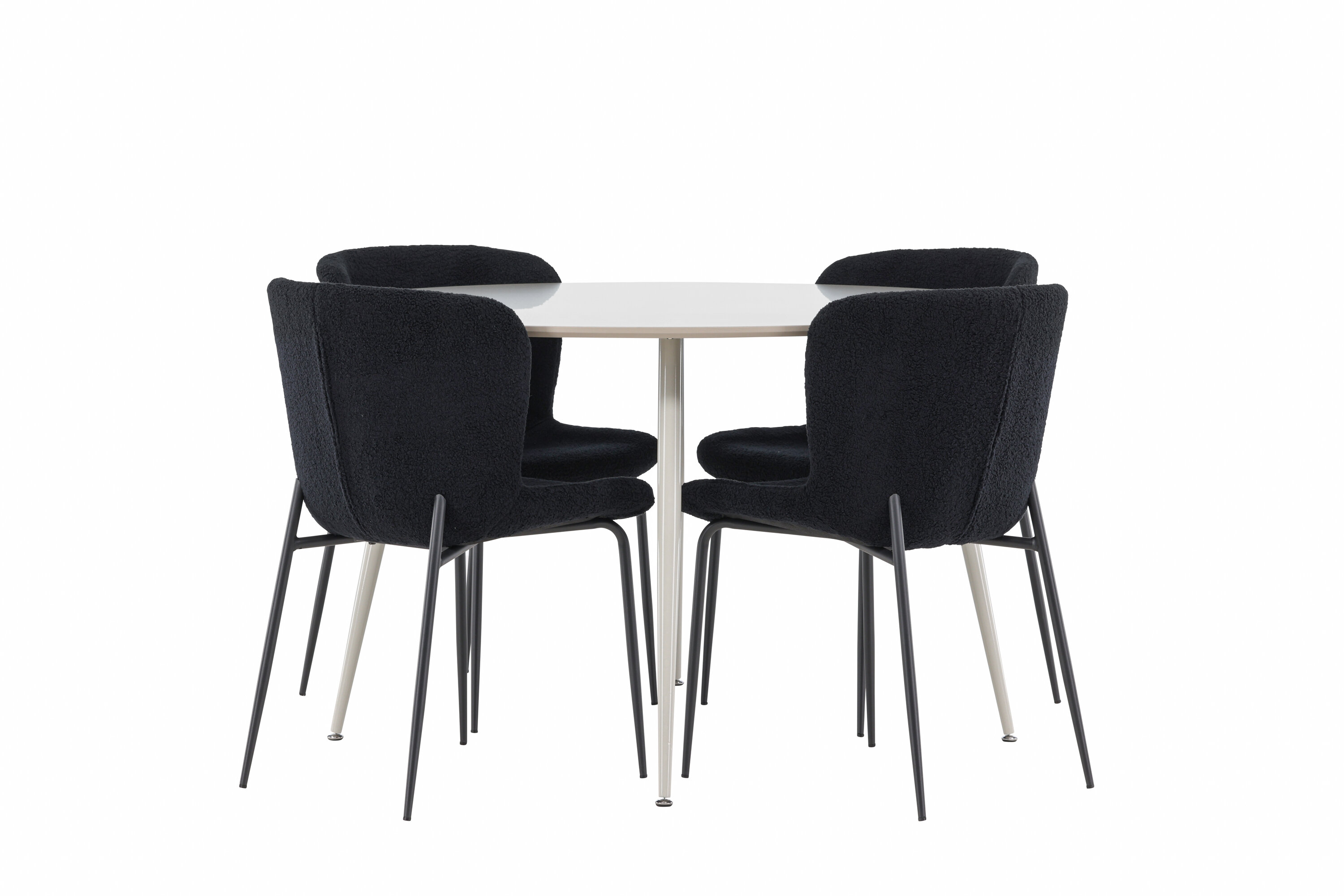 Verleihen Sie Ihrem Esszimmer ein modernes und raffiniertes Upgrade mit unserem eleganten Ess-Set, das den stilvollen Plaza-Tisch mit den luxuriösen Modesto-Stühlen kombiniert. Perfekt für alltägliche Abendessen und besondere Anlässe, schafft dieses Ess-Set eine einladende und elegante Atmosphäre in Ihrem Zuhause. Der Plaza-Tisch aus MDF hat eine hellbeige Farbe, die Ihrem Esszimmer ein weiches und warmes Gefühl verleiht. Mit einem großzügigen Durchmesser von 120 cm bietet der Tisch viel Platz für Essen und Gespräche, während seine runde Form zu einem harmonischen und ausgewogenen Umfeld beiträgt. Die robuste Konstruktion des Tisches sorgt für Haltbarkeit und Stabilität für einen langfristigen Einsatz. Die vier Modesto-Stühle sind mit weichem und bequemem Polyester-Teddy in elegantem Schwarz bezogen. Diese Stühle bieten eine Kombination aus Komfort und Stil und sind daher ideal für lange, angenehme Mahlzeiten mit Familie und Freunden. Ihr modernes Design mit hohen Rückenlehnen und luxuriösen Sitzen verleiht Ihrem Esszimmer eine raffinierte und moderne Note. Dieses Ess-Set ist eine perfekte Mischung aus Ästhetik und Funktionalität und damit eine ausgezeichnete Wahl für diejenigen, die einen eleganten und komfortablen Essbereich suchen. Rüsten Sie Ihren Speisesaal mit der stilvollen Kombination aus Plaza-Tisch und Modesto-Stühlen auf und schaffen Sie einen Ort, an dem Erinnerungen und Freude geteilt werden.