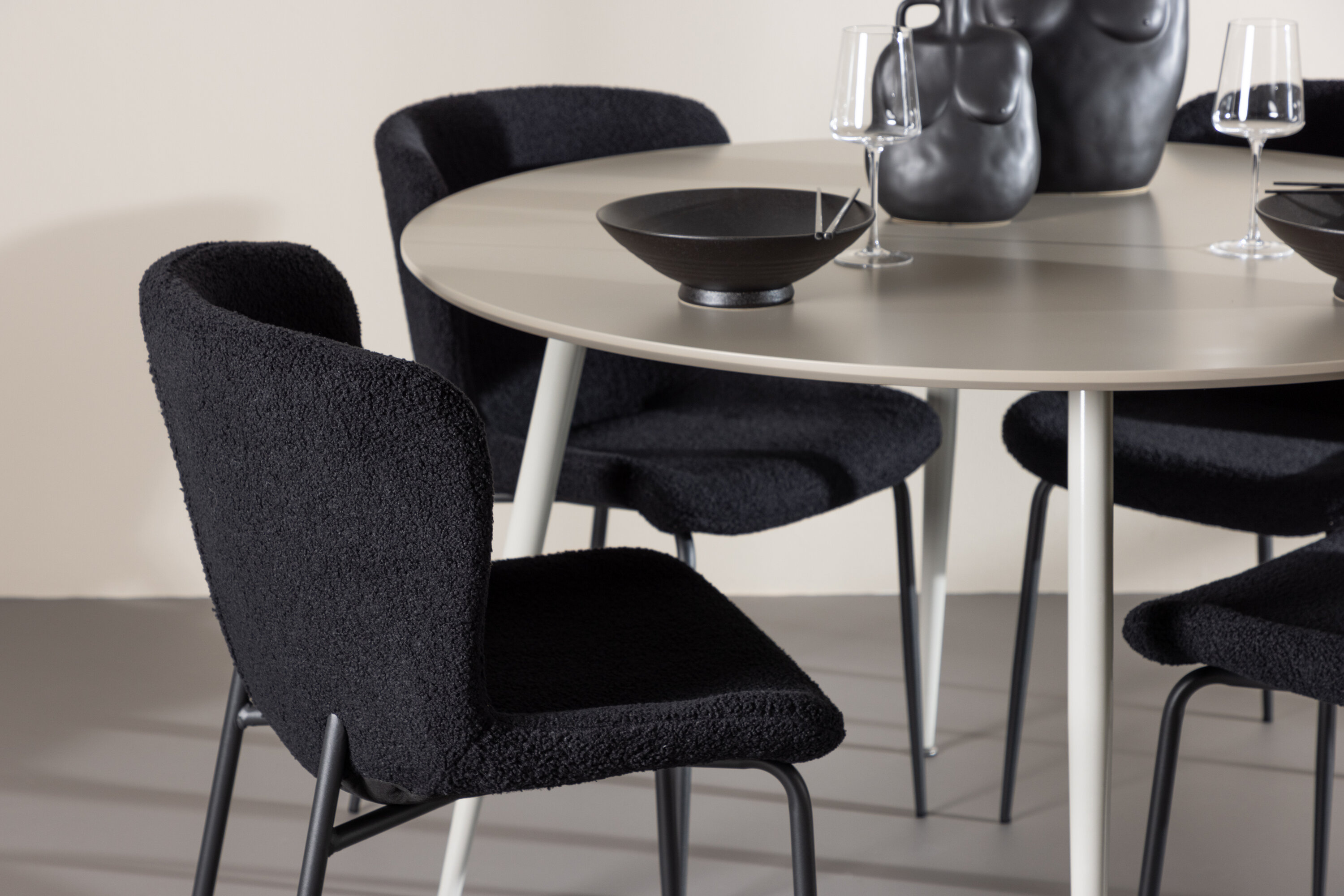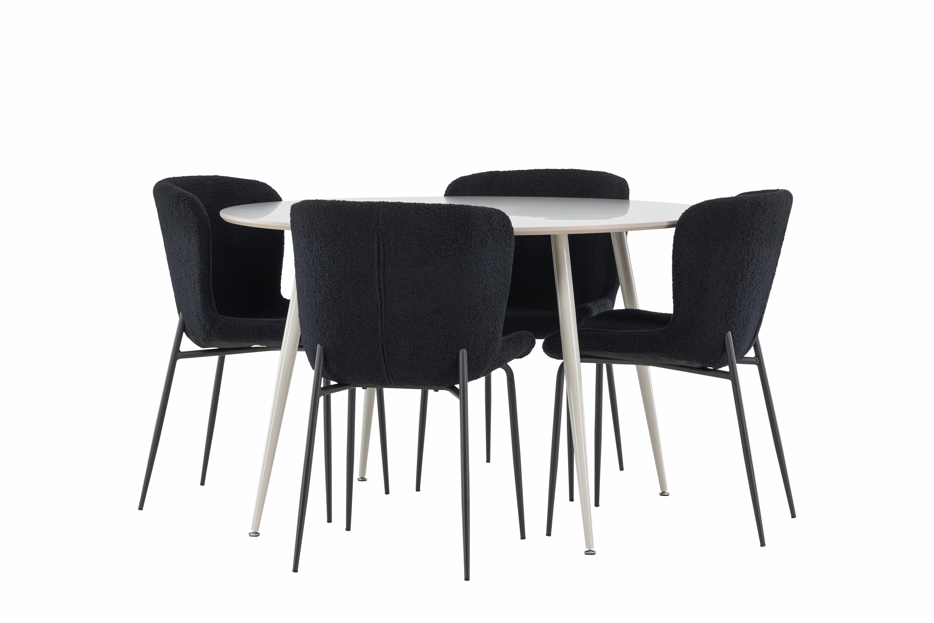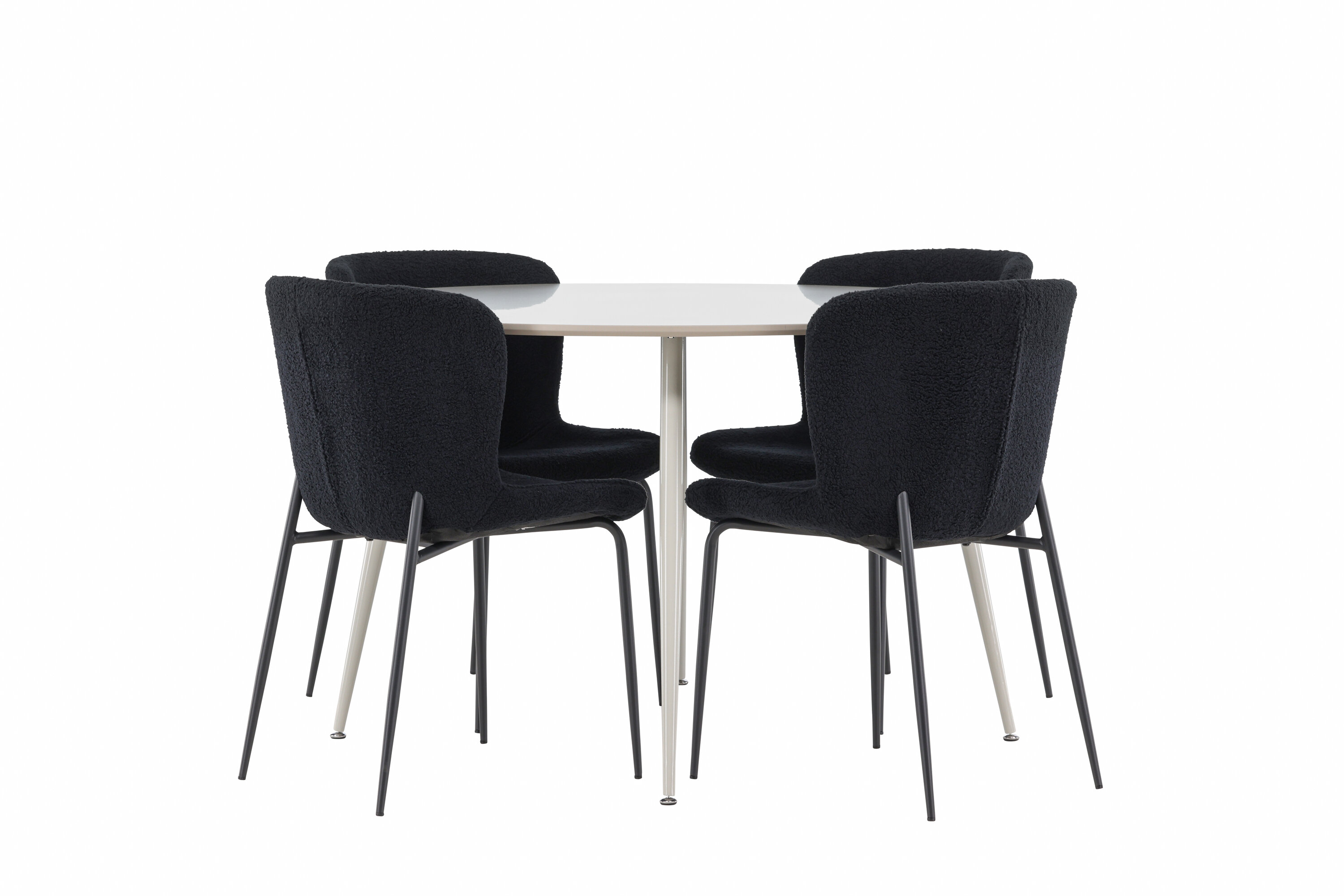 Verleihen Sie Ihrem Esszimmer ein modernes und raffiniertes Upgrade mit unserem eleganten Ess-Set, das den stilvollen Plaza-Tisch mit den luxuriösen Modesto-Stühlen kombiniert. Perfekt für alltägliche Abendessen und besondere Anlässe, schafft dieses Ess-Set eine einladende und elegante Atmosphäre in Ihrem Zuhause. Der Plaza-Tisch aus MDF hat eine hellbeige Farbe, die Ihrem Esszimmer ein weiches und warmes Gefühl verleiht. Mit einem großzügigen Durchmesser von 120 cm bietet der Tisch viel Platz für Essen und Gespräche, während seine runde Form zu einem harmonischen und ausgewogenen Umfeld beiträgt. Die robuste Konstruktion des Tisches sorgt für Haltbarkeit und Stabilität für einen langfristigen Einsatz. Die vier Modesto-Stühle sind mit weichem und bequemem Polyester-Teddy in elegantem Schwarz bezogen. Diese Stühle bieten eine Kombination aus Komfort und Stil und sind daher ideal für lange, angenehme Mahlzeiten mit Familie und Freunden. Ihr modernes Design mit hohen Rückenlehnen und luxuriösen Sitzen verleiht Ihrem Esszimmer eine raffinierte und moderne Note. Dieses Ess-Set ist eine perfekte Mischung aus Ästhetik und Funktionalität und damit eine ausgezeichnete Wahl für diejenigen, die einen eleganten und komfortablen Essbereich suchen. Rüsten Sie Ihren Speisesaal mit der stilvollen Kombination aus Plaza-Tisch und Modesto-Stühlen auf und schaffen Sie einen Ort, an dem Erinnerungen und Freude geteilt werden.