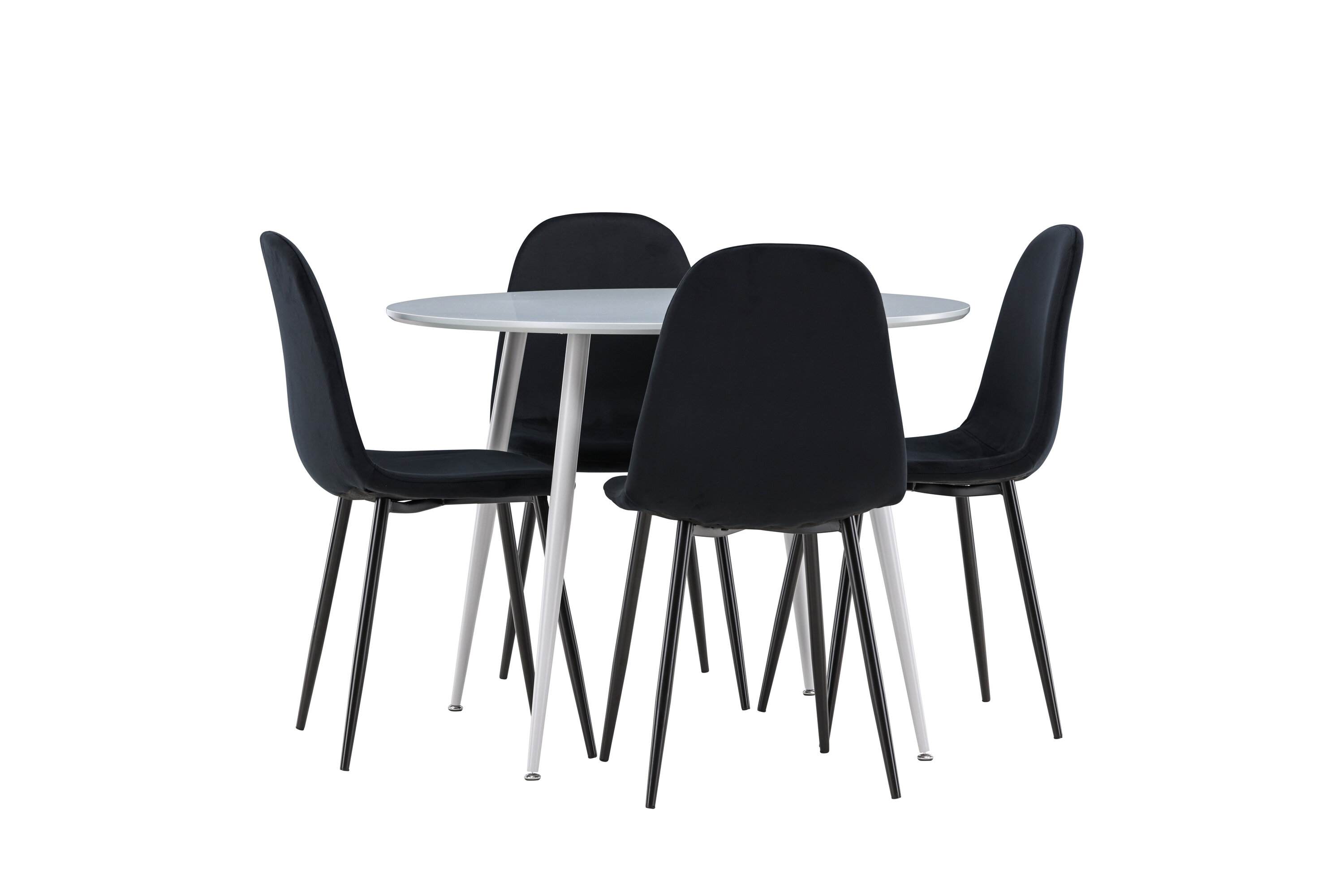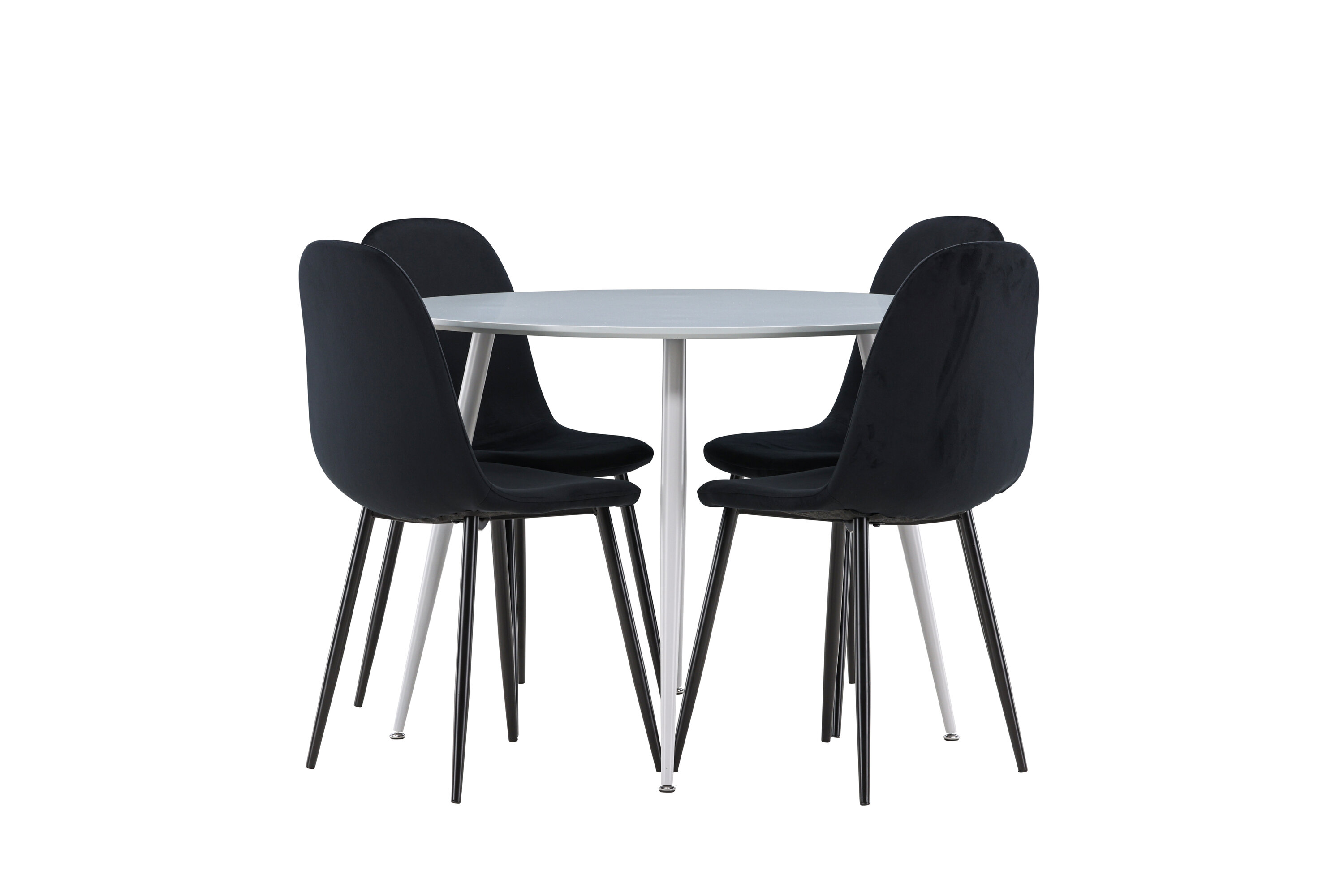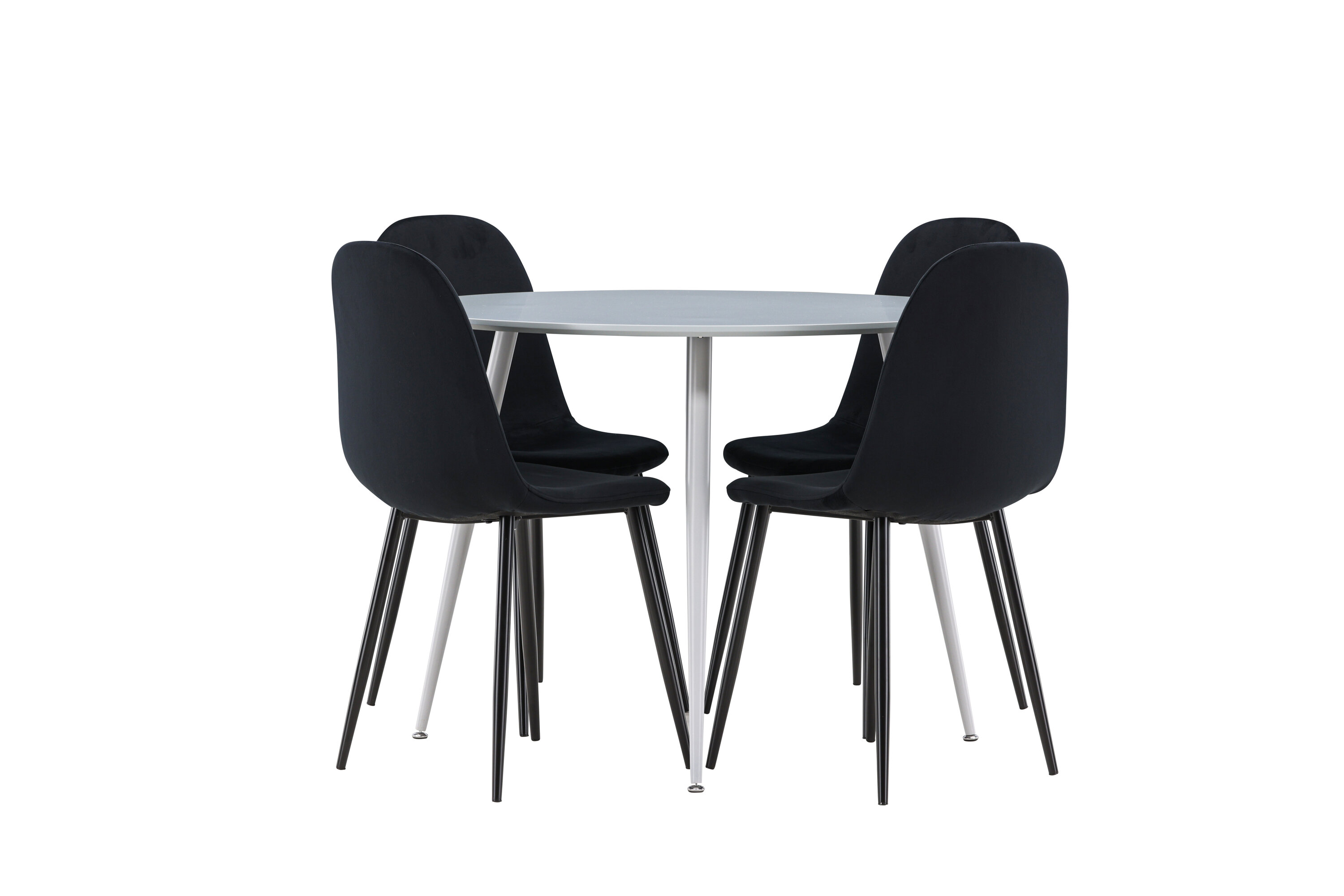 Erstellen Sie einen stilvollen und einladenden Essbereich mit unserem eleganten Ess-Set, das den modernen Plaza-Tisch mit den luxuriösen Polar-Stühlen kombiniert. Dieses Ess-Set ist perfekt für alltägliche Abendessen und festliche Anlässe und verleiht Ihrem Esszimmer eine raffinierte und moderne Atmosphäre. Der Plaza-Tisch ist aus MDF gefertigt und verfügt über eine elegante graue Farbe, die Ihrem Esszimmer ein modernes und stilvolles Gefühl verleiht. Mit einem Durchmesser von 100 cm bietet der Tisch viel Platz für Mahlzeiten und Gespräche, während seine runde Form eine harmonische und einladende Umgebung schafft. Die robuste Konstruktion des Tisches sorgt für langanhaltenden Einsatz und Stabilität. Die vier Polar-Stühle ergänzen den Tisch perfekt mit ihren eleganten, mit schwarzem Samt gepolsterten Sitzen. Diese Stühle bieten sowohl Komfort als auch Stil und sind daher ideal für lange, angenehme Abendessen mit Familie und Freunden. Ihr modernes Design mit hohen Rückenlehnen und weichen Sitzen verleiht Ihrem Esszimmer eine luxuriöse und raffinierte Note. Dieses Ess-Set ist eine perfekte Mischung aus Ästhetik und Funktionalität und damit eine ausgezeichnete Wahl für diejenigen, die einen eleganten und komfortablen Essbereich suchen. Rüsten Sie Ihren Speisesaal mit der stilvollen Kombination aus Plaza-Tisch und Polar-Stühlen auf und schaffen Sie einen Ort, an dem Erinnerungen und Freude geteilt werden.
