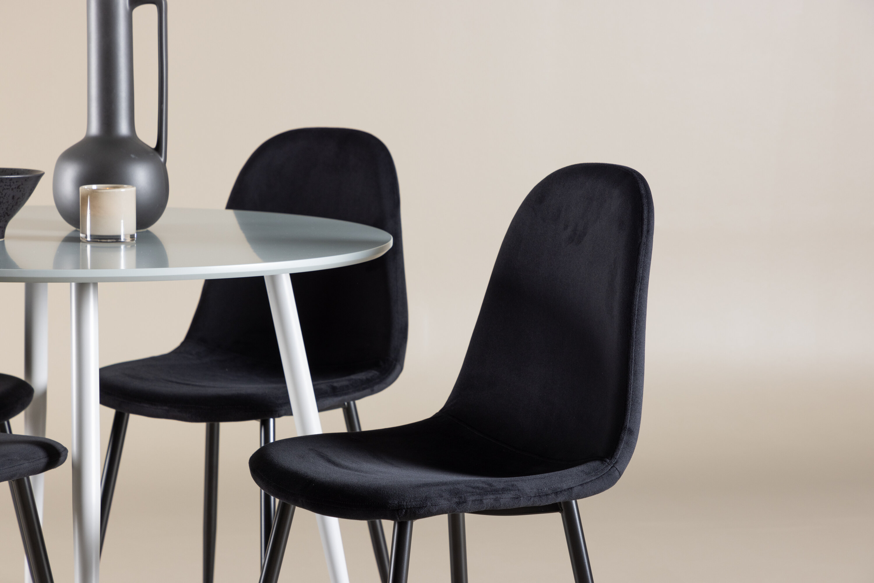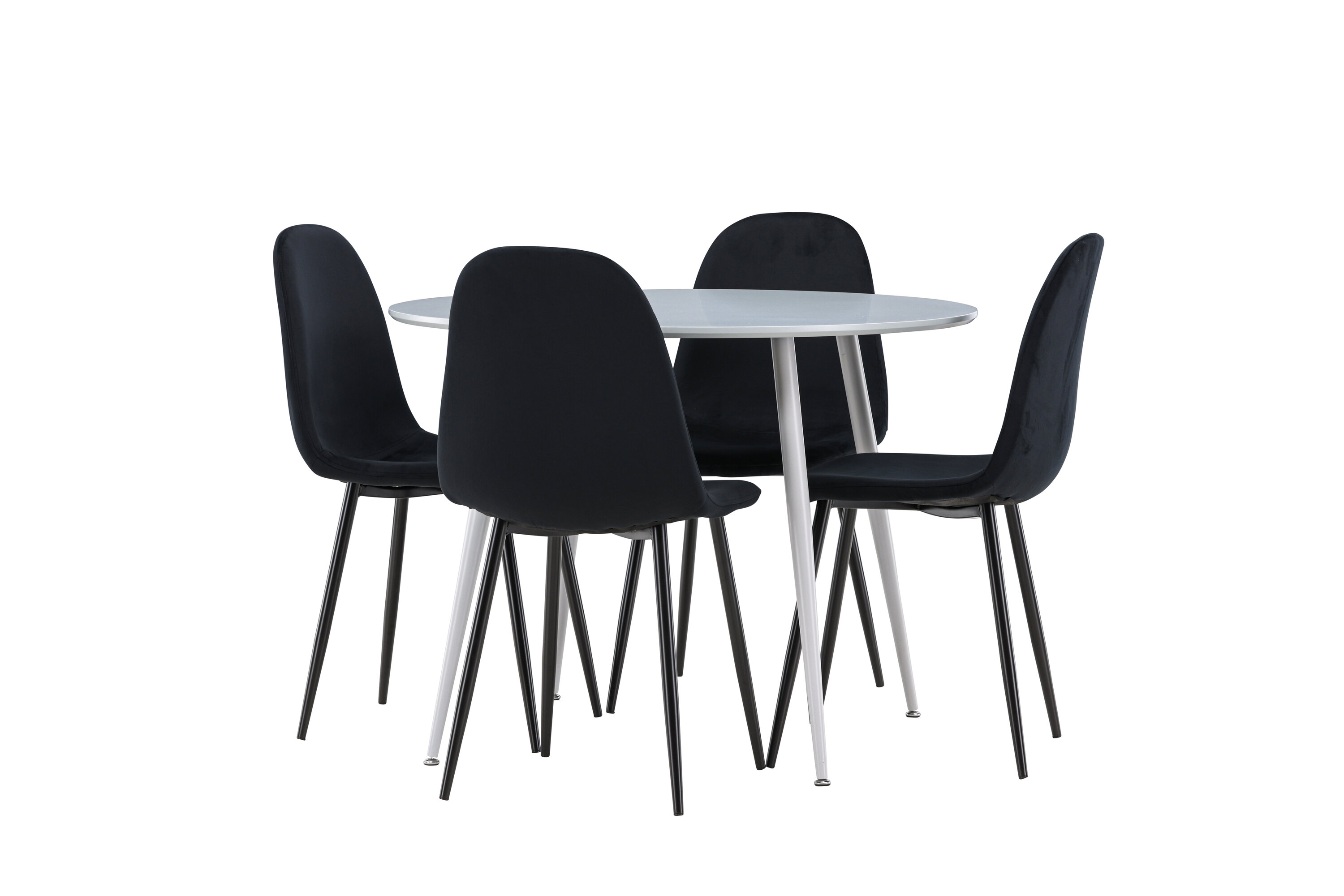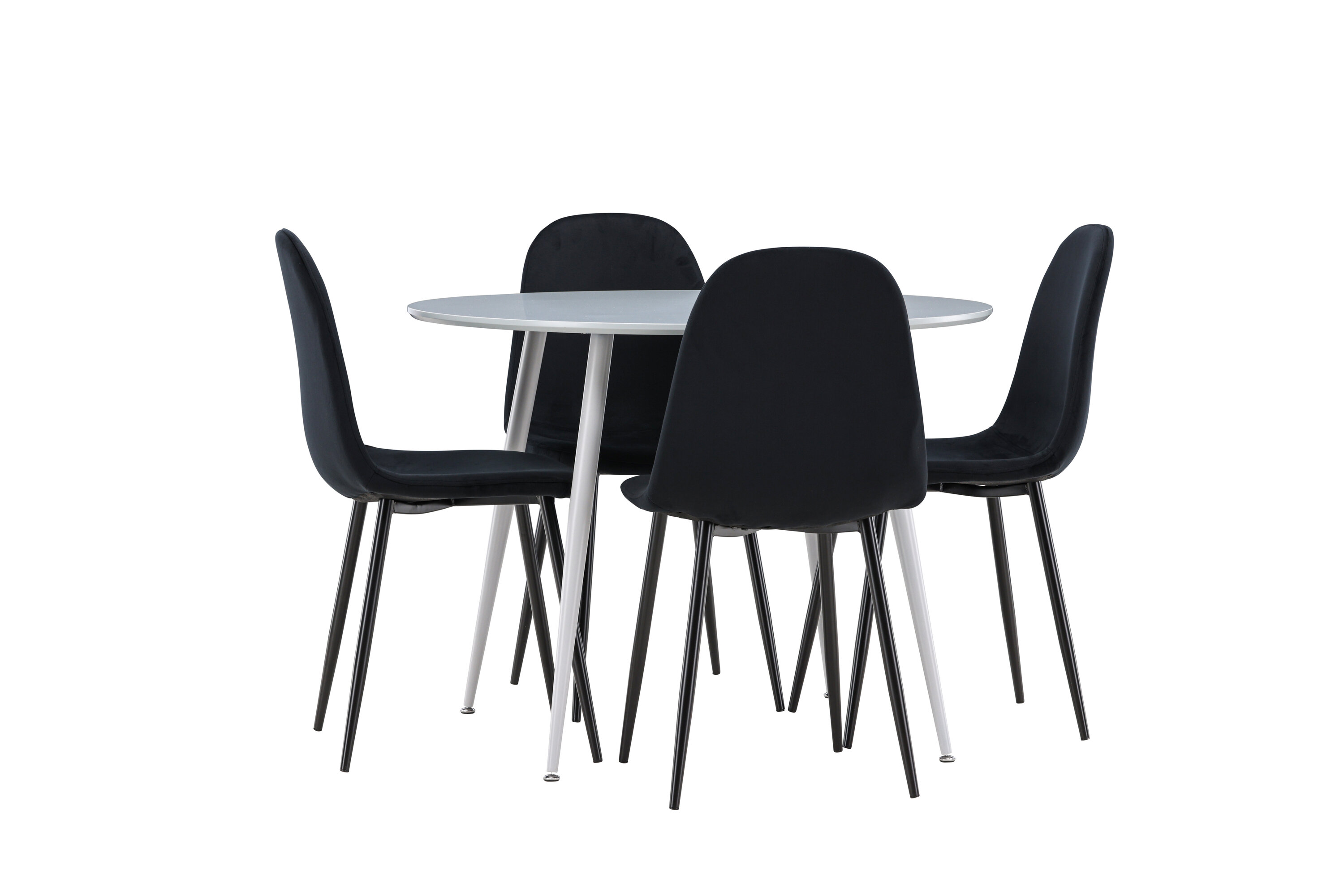 Erstellen Sie einen stilvollen und einladenden Essbereich mit unserem eleganten Ess-Set, das den modernen Plaza-Tisch mit den luxuriösen Polar-Stühlen kombiniert. Dieses Ess-Set ist perfekt für alltägliche Abendessen und festliche Anlässe und verleiht Ihrem Esszimmer eine raffinierte und moderne Atmosphäre. Der Plaza-Tisch ist aus MDF gefertigt und verfügt über eine elegante graue Farbe, die Ihrem Esszimmer ein modernes und stilvolles Gefühl verleiht. Mit einem Durchmesser von 100 cm bietet der Tisch viel Platz für Mahlzeiten und Gespräche, während seine runde Form eine harmonische und einladende Umgebung schafft. Die robuste Konstruktion des Tisches sorgt für langanhaltenden Einsatz und Stabilität. Die vier Polar-Stühle ergänzen den Tisch perfekt mit ihren eleganten, mit schwarzem Samt gepolsterten Sitzen. Diese Stühle bieten sowohl Komfort als auch Stil und sind daher ideal für lange, angenehme Abendessen mit Familie und Freunden. Ihr modernes Design mit hohen Rückenlehnen und weichen Sitzen verleiht Ihrem Esszimmer eine luxuriöse und raffinierte Note. Dieses Ess-Set ist eine perfekte Mischung aus Ästhetik und Funktionalität und damit eine ausgezeichnete Wahl für diejenigen, die einen eleganten und komfortablen Essbereich suchen. Rüsten Sie Ihren Speisesaal mit der stilvollen Kombination aus Plaza-Tisch und Polar-Stühlen auf und schaffen Sie einen Ort, an dem Erinnerungen und Freude geteilt werden.