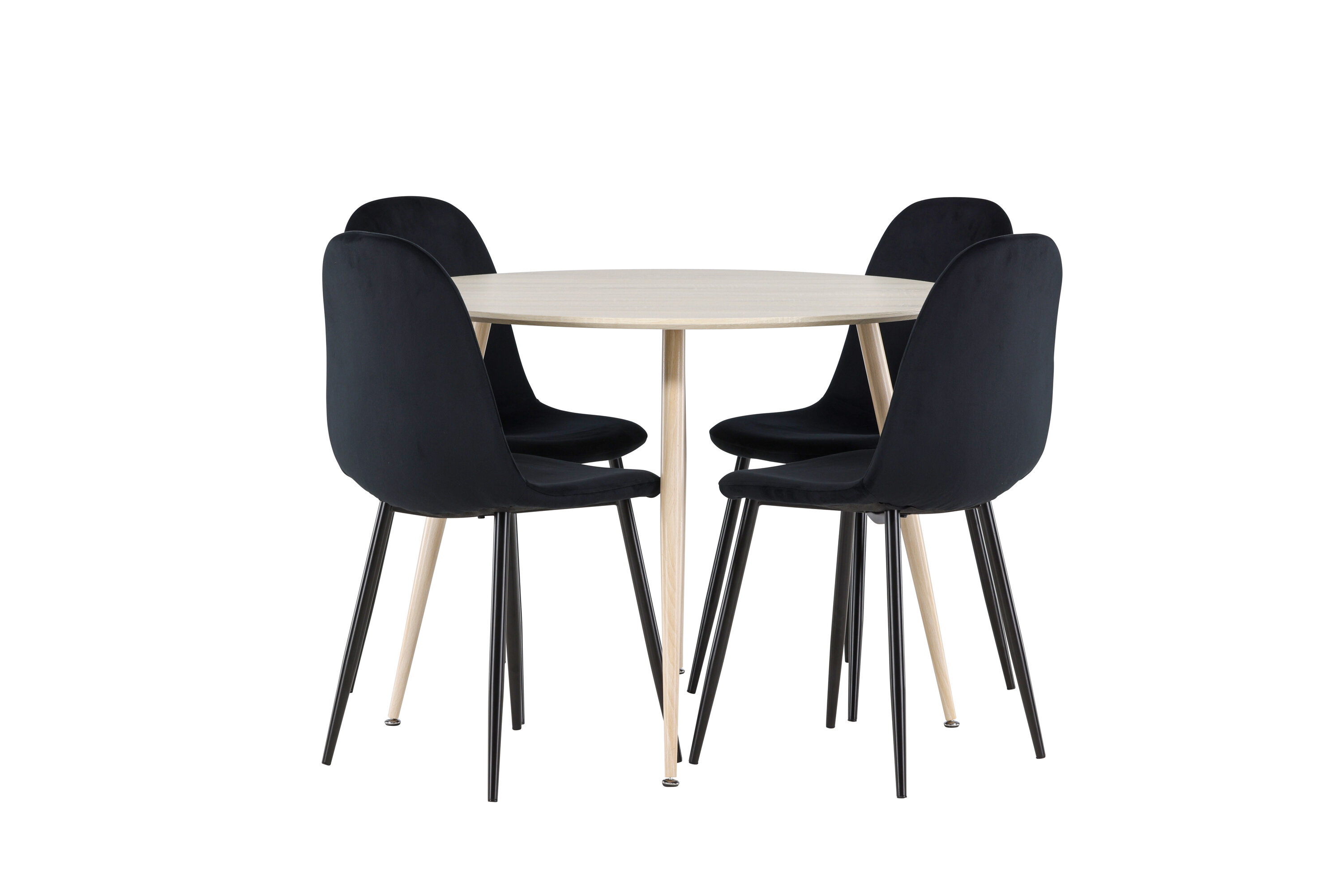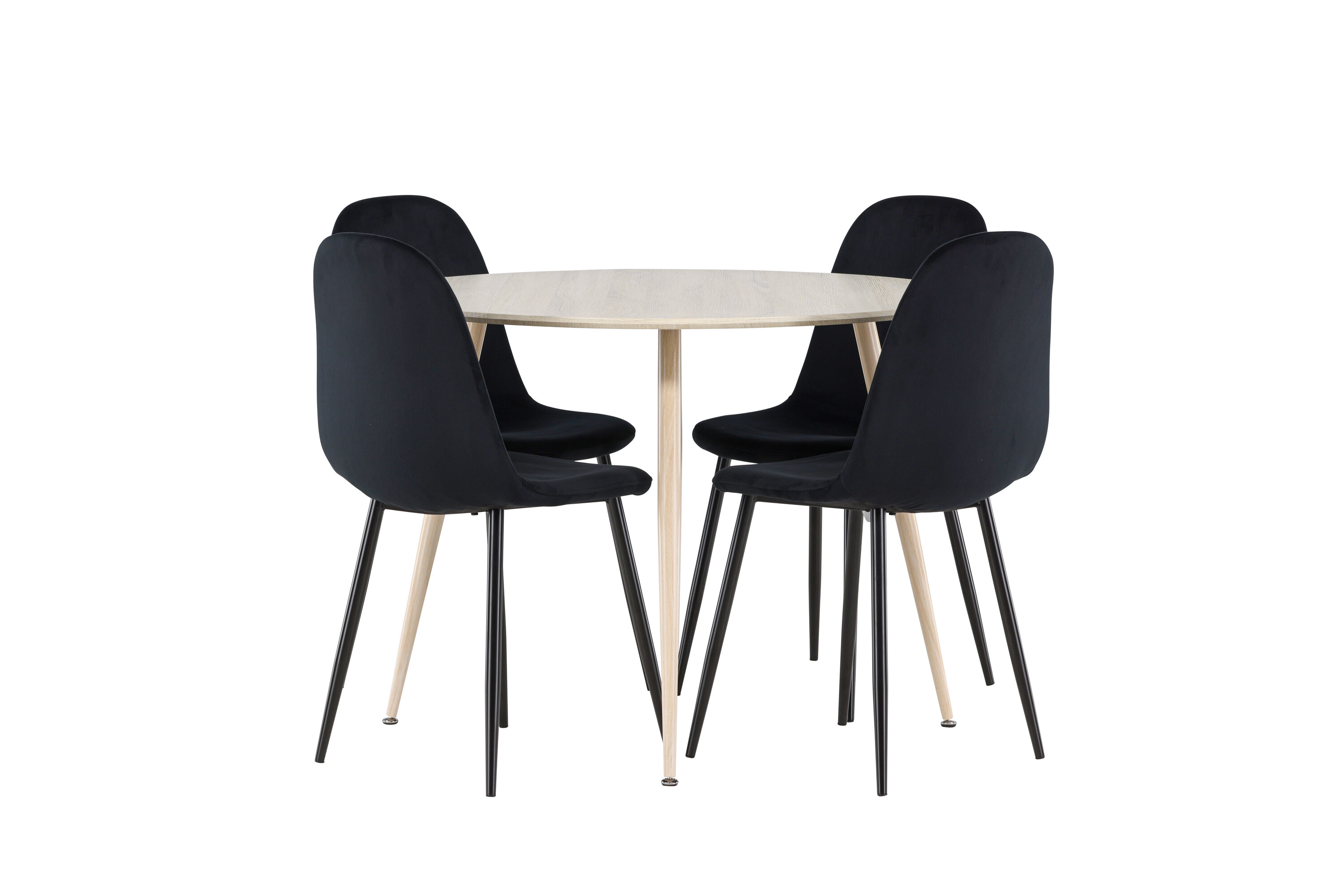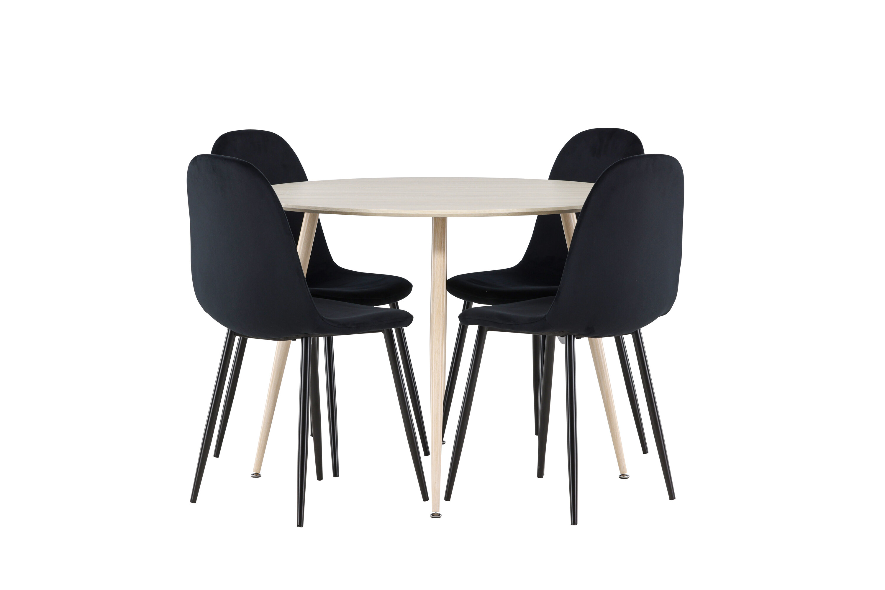 Entdecken Sie mit dem Plaza-Esstisch und den Polar-Essstühlen das perfekte Ess-Set für Ihr Zuhause. Der Esstisch Plaza mit einem großzügigen Durchmesser von 100 cm ist aus strapazierfähigem MDF-Material gefertigt und hat eine weiß pigmentierte Farbe, die dem Raum ein warmes und einladendes Gefühl verleiht. Sein modernes Design und seine klaren Linien schaffen eine ruhige und harmonische Atmosphäre, die jede Mahlzeit zu einem entspannenden Erlebnis macht. Das kompakte Format macht Plaza perfekt für kleinere Räume und bietet gleichzeitig genügend Platz für komfortable Mahlzeiten mit Familie und Freunden. Ergänzen Sie Ihren Esstisch mit den stilvollen Polar-Essstühlen in Schwarz. Die Stühle haben ein vollständig gepolstertes Design, Beine aus schwarzem pulverbeschichtetem Metall und eine abgerundete Rückenlehne und Sitzfläche aus schwarzem Samt mit weicher Polsterung. Hier erhalten Sie einen Esszimmerstuhl, der Komfort und modernes Design auf beste Weise verbindet. Der Samt kann Druckstellen bekommen, wenn der Flor liegt, was für dieses Material völlig normal ist und je nach Lichteinfall eine charmante Variation der Stofftöne ergibt. Einfache Montage erforderlich. Verleihen Sie Ihrem Zuhause mit dem Plaza Esstisch und den Polar Esstischen eine moderne und stilvolle Note - eine perfekte Kombination für diejenigen, die Stil und Funktion in ihrer Inneneinrichtung zu schätzen wissen.