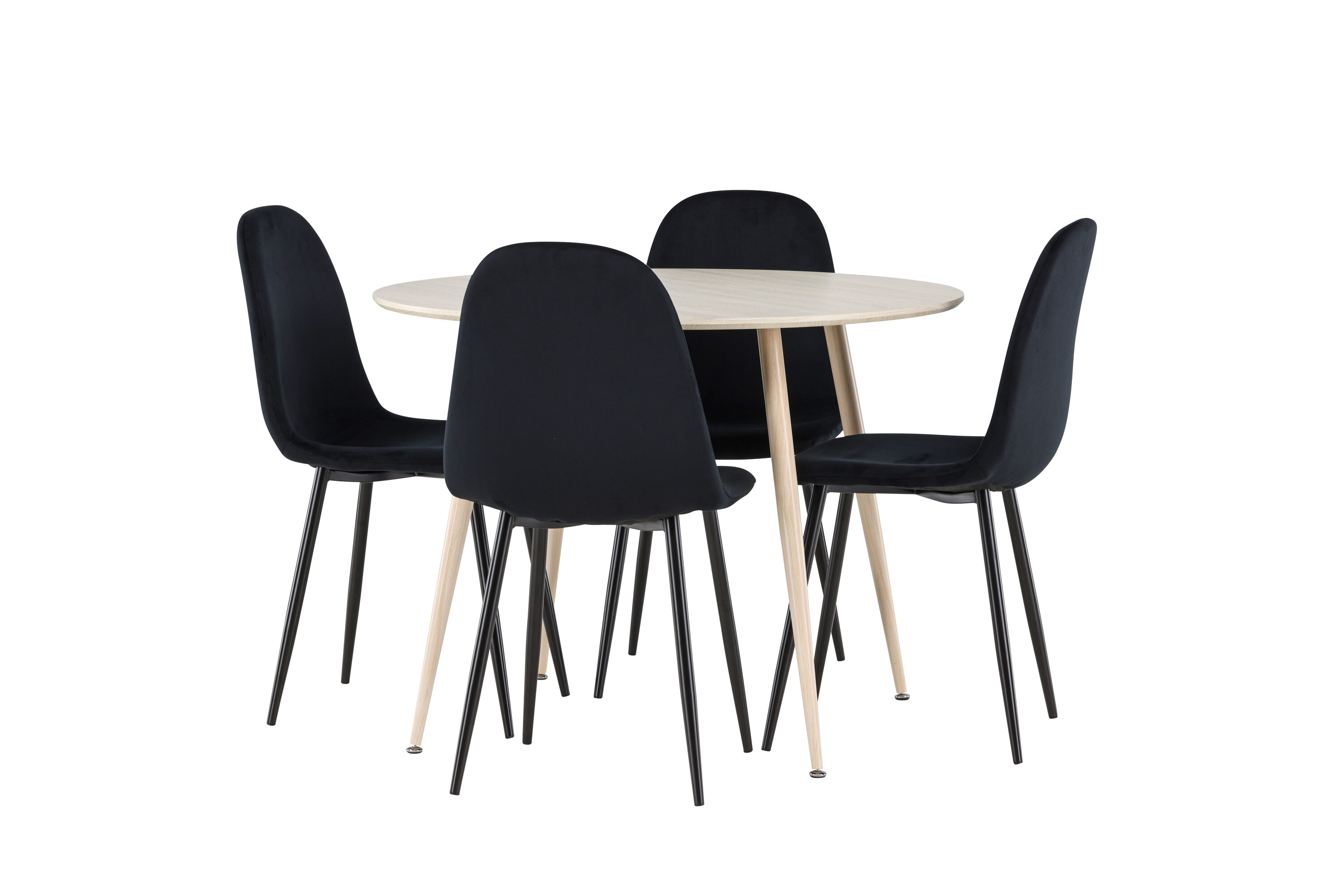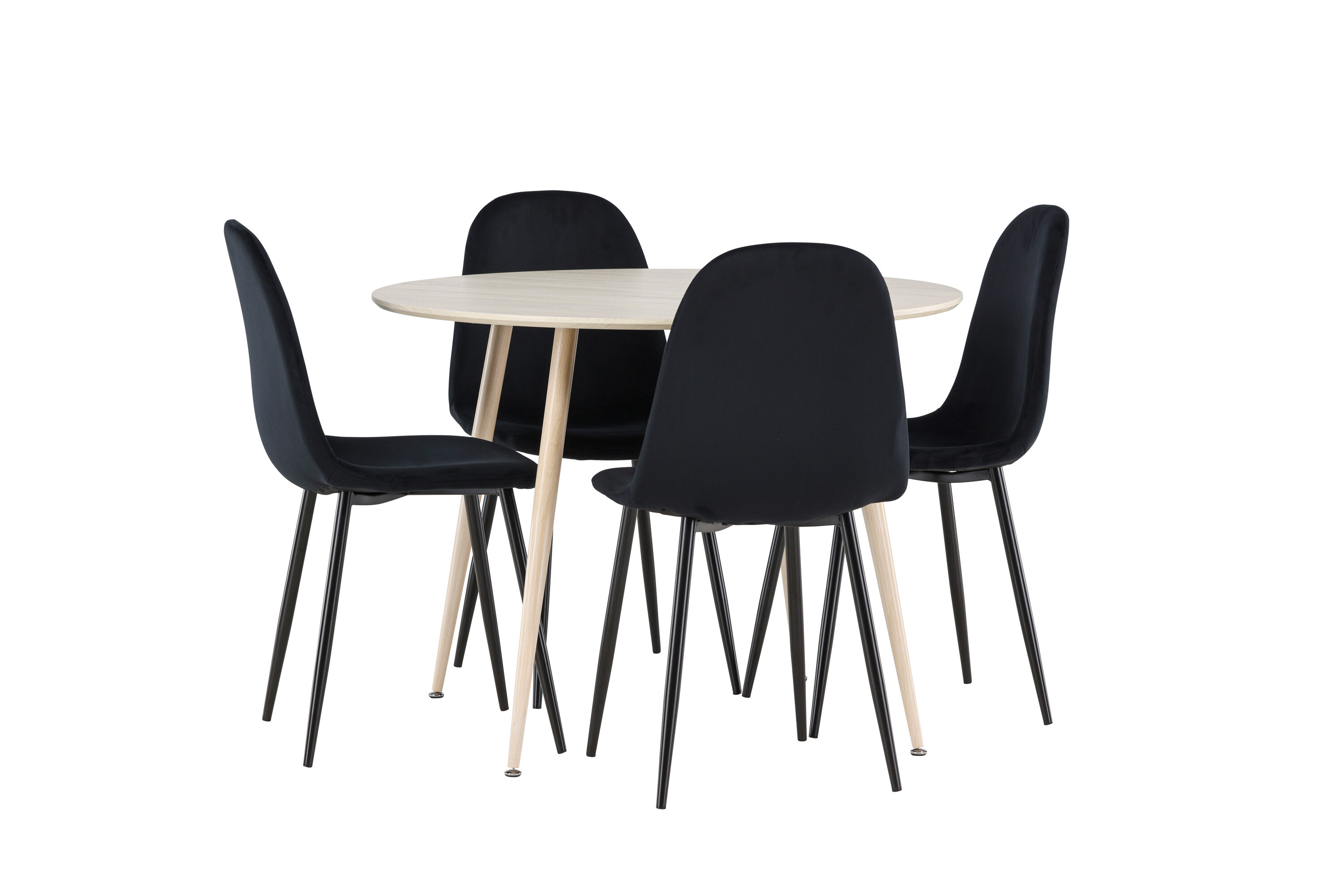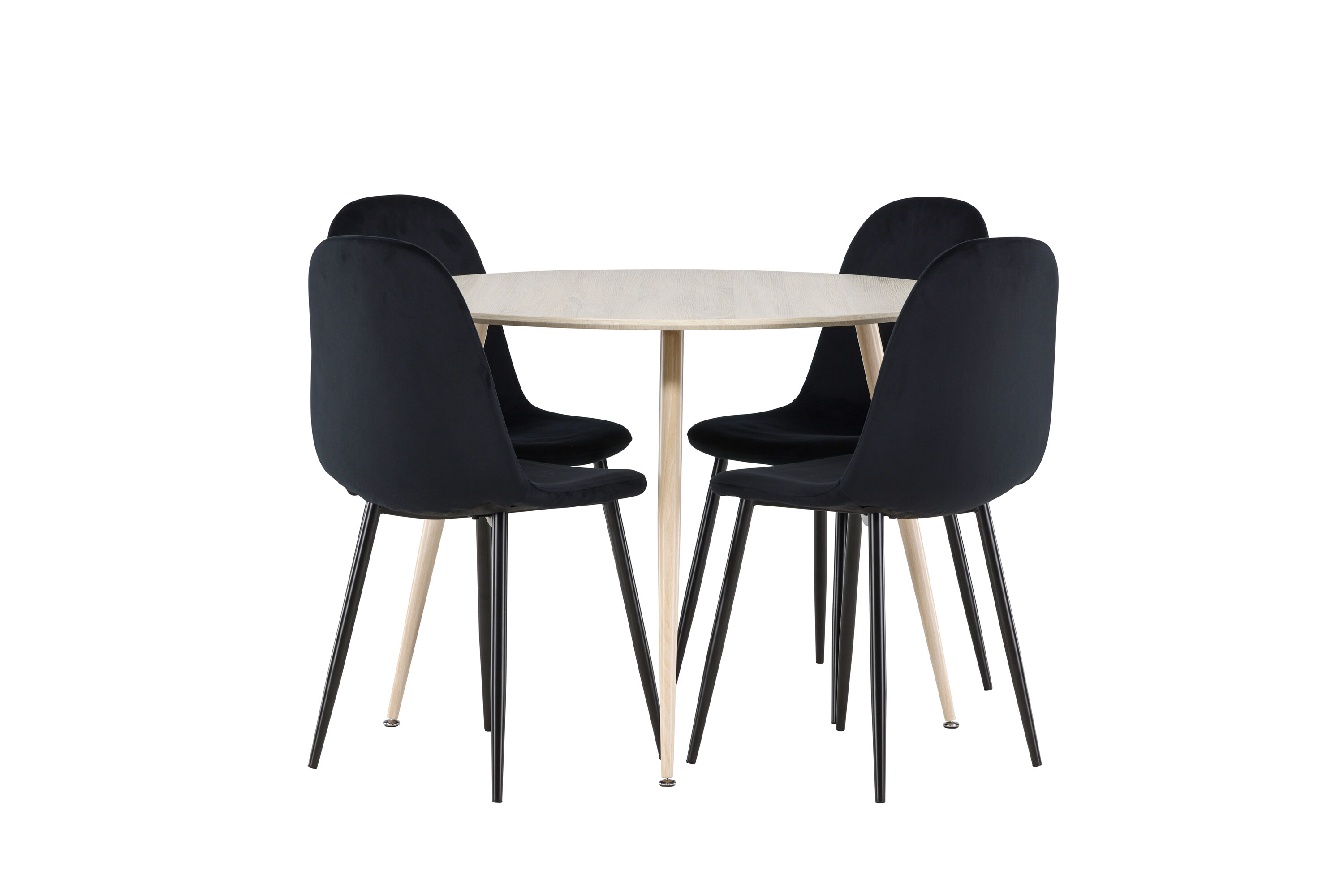 Entdecken Sie mit dem Plaza-Esstisch und den Polar-Essstühlen das perfekte Ess-Set für Ihr Zuhause. Der Esstisch Plaza mit einem großzügigen Durchmesser von 100 cm ist aus strapazierfähigem MDF-Material gefertigt und hat eine weiß pigmentierte Farbe, die dem Raum ein warmes und einladendes Gefühl verleiht. Sein modernes Design und seine klaren Linien schaffen eine ruhige und harmonische Atmosphäre, die jede Mahlzeit zu einem entspannenden Erlebnis macht. Das kompakte Format macht Plaza perfekt für kleinere Räume und bietet gleichzeitig genügend Platz für komfortable Mahlzeiten mit Familie und Freunden. Ergänzen Sie Ihren Esstisch mit den stilvollen Polar-Essstühlen in Schwarz. Die Stühle haben ein vollständig gepolstertes Design, Beine aus schwarzem pulverbeschichtetem Metall und eine abgerundete Rückenlehne und Sitzfläche aus schwarzem Samt mit weicher Polsterung. Hier erhalten Sie einen Esszimmerstuhl, der Komfort und modernes Design auf beste Weise verbindet. Der Samt kann Druckstellen bekommen, wenn der Flor liegt, was für dieses Material völlig normal ist und je nach Lichteinfall eine charmante Variation der Stofftöne ergibt. Einfache Montage erforderlich. Verleihen Sie Ihrem Zuhause mit dem Plaza Esstisch und den Polar Esstischen eine moderne und stilvolle Note - eine perfekte Kombination für diejenigen, die Stil und Funktion in ihrer Inneneinrichtung zu schätzen wissen.