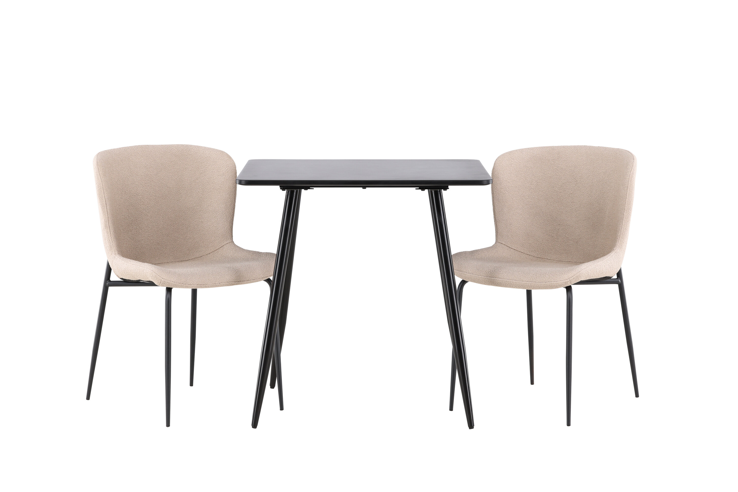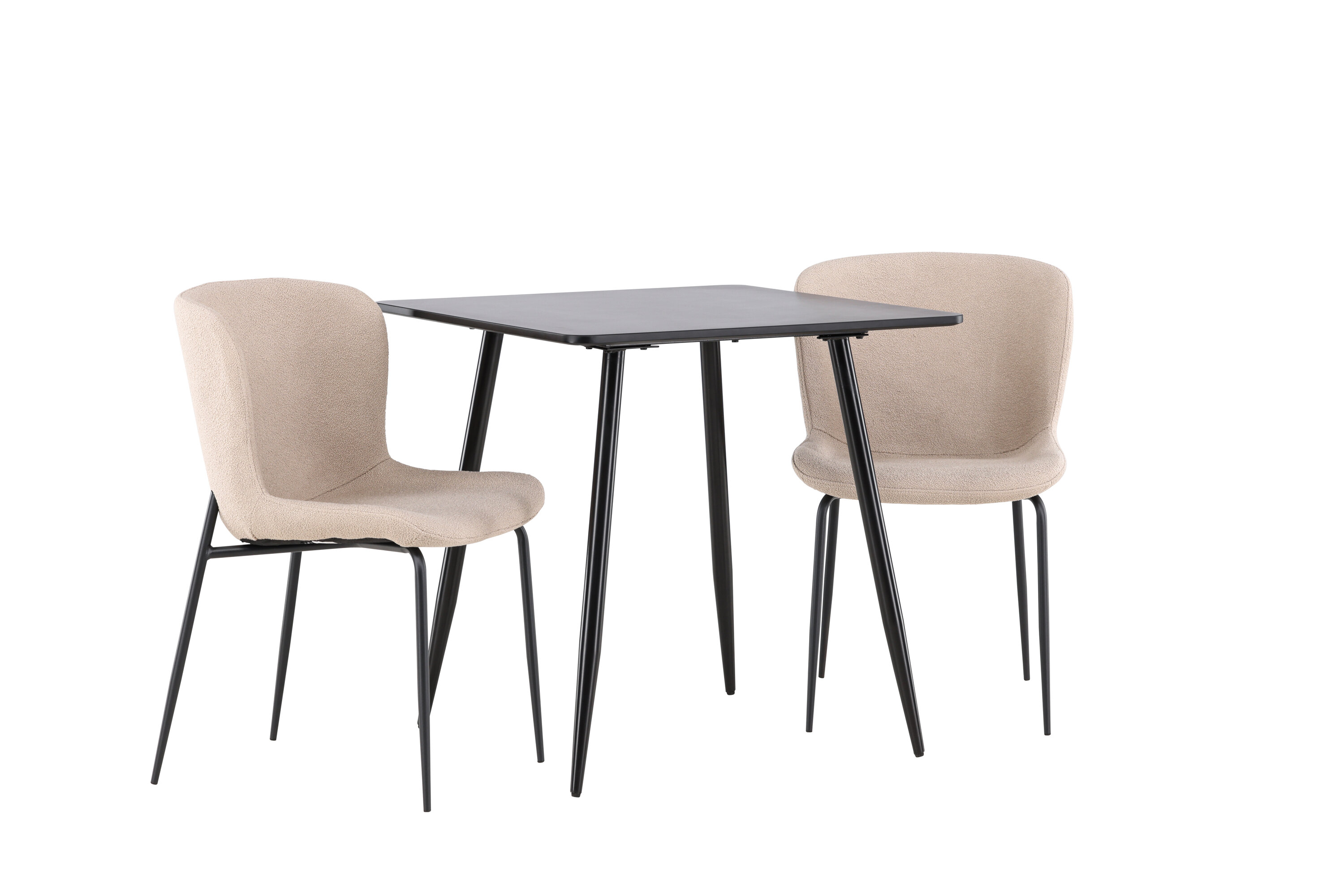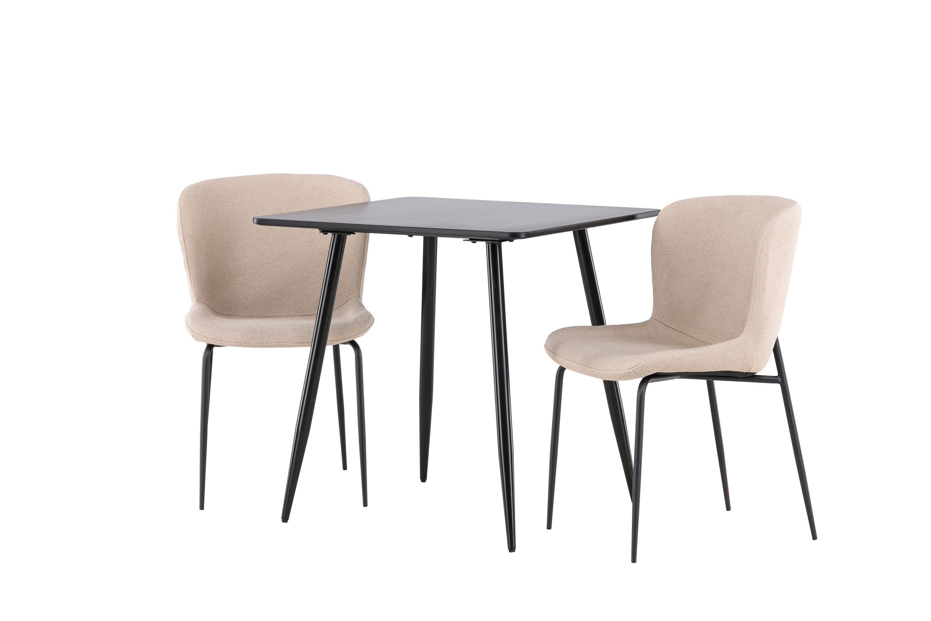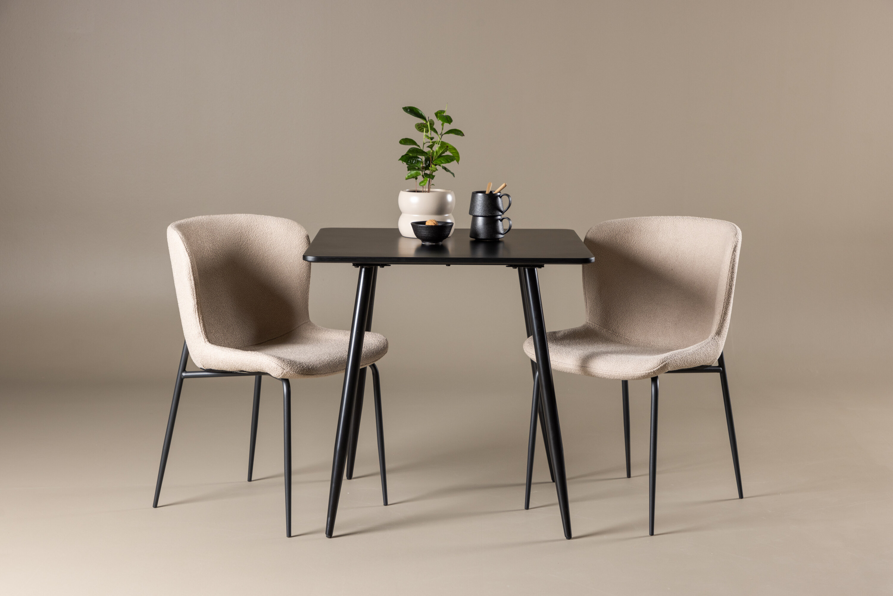 Erstellen Sie einen modernen und einladenden Essbereich mit unserem eleganten Ess-Set, das den eleganten Polartisch mit den bequemen Modesto-Stühlen kombiniert. Dieses Ess-Set eignet sich sowohl für kleine Mahlzeiten als auch für gemütliche Abendessen und verleiht Ihrem Esszimmer oder Ihrer Küche eine raffinierte und harmonische Atmosphäre. Der Polare Esstisch aus MDF hat eine elegante schwarze Farbe, die Ihrem Zuhause ein modernes und elegantes Gefühl verleiht. Mit den Abmessungen von 75x75 cm bietet der Tisch eine kompakte und dennoch geräumige Oberfläche für Essen und Unterhaltung und ist somit ideal für kleinere Räume oder intime Essbereiche. Die robuste Konstruktion des Tisches sorgt für langanhaltenden Einsatz und Stabilität. Die beiden Modesto-Stühle ergänzen den Tisch perfekt mit ihren eleganten Sitzen, die mit beigefarbenem Bouclé gepolstert sind, und den eleganten schwarzen Beinen. Diese Stühle bieten sowohl Komfort als auch Stil und sind daher ideal für lange, angenehme Mahlzeiten. Ihr modernes Design mit hohen Rückenlehnen und weichen Sitzen verleiht Ihrem Esszimmer oder Ihrer Küche eine raffinierte und moderne Note. Dieses Ess-Set ist eine perfekte Kombination aus Ästhetik und Funktionalität und damit eine ausgezeichnete Wahl für diejenigen, die einen eleganten und komfortablen Essbereich in einem kleineren Format suchen. Werten Sie Ihr Zuhause mit der Kombination aus Polartisch und Modesto-Stühlen auf und schaffen Sie einen Ort, an dem Erinnerungen und Freude geteilt werden.