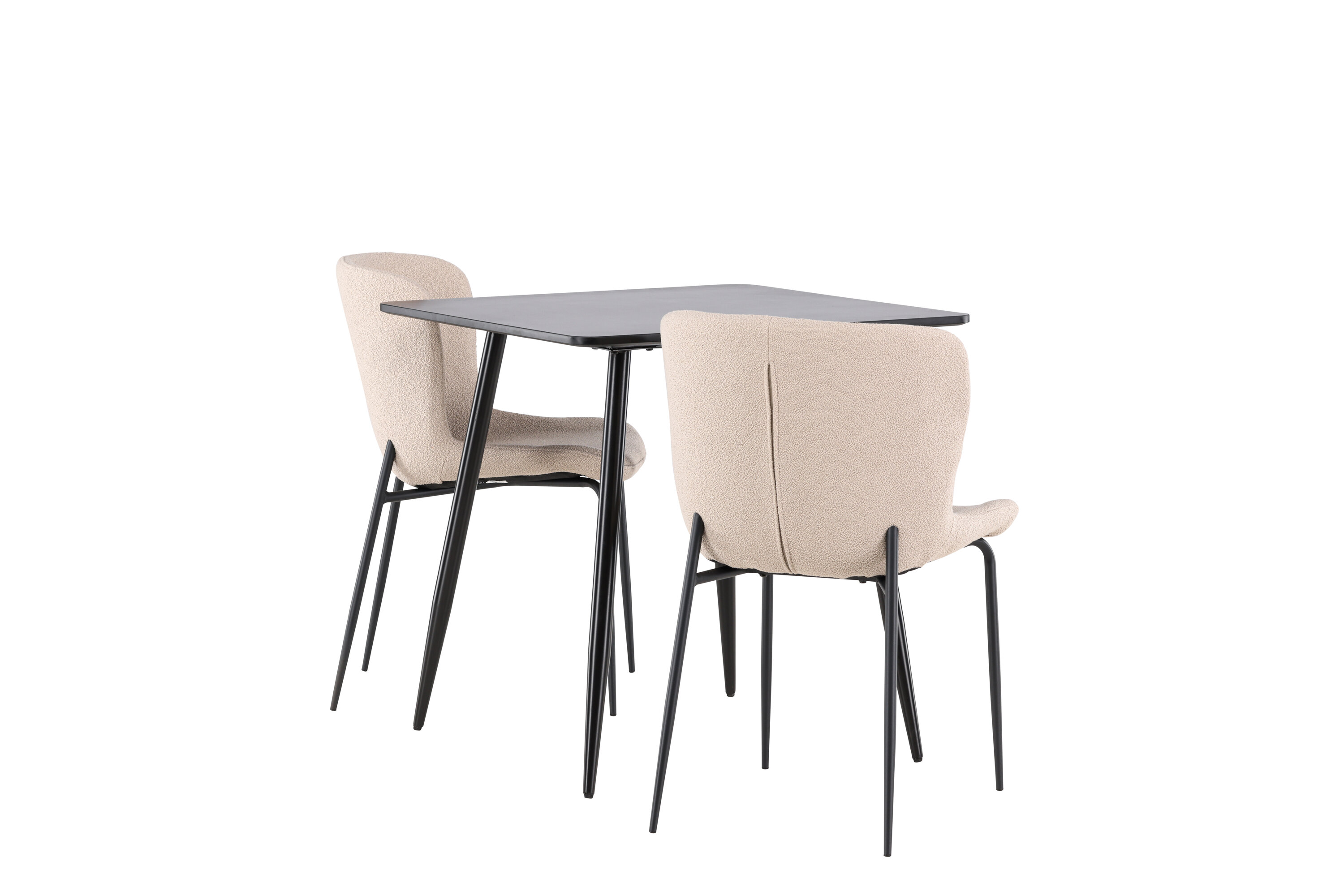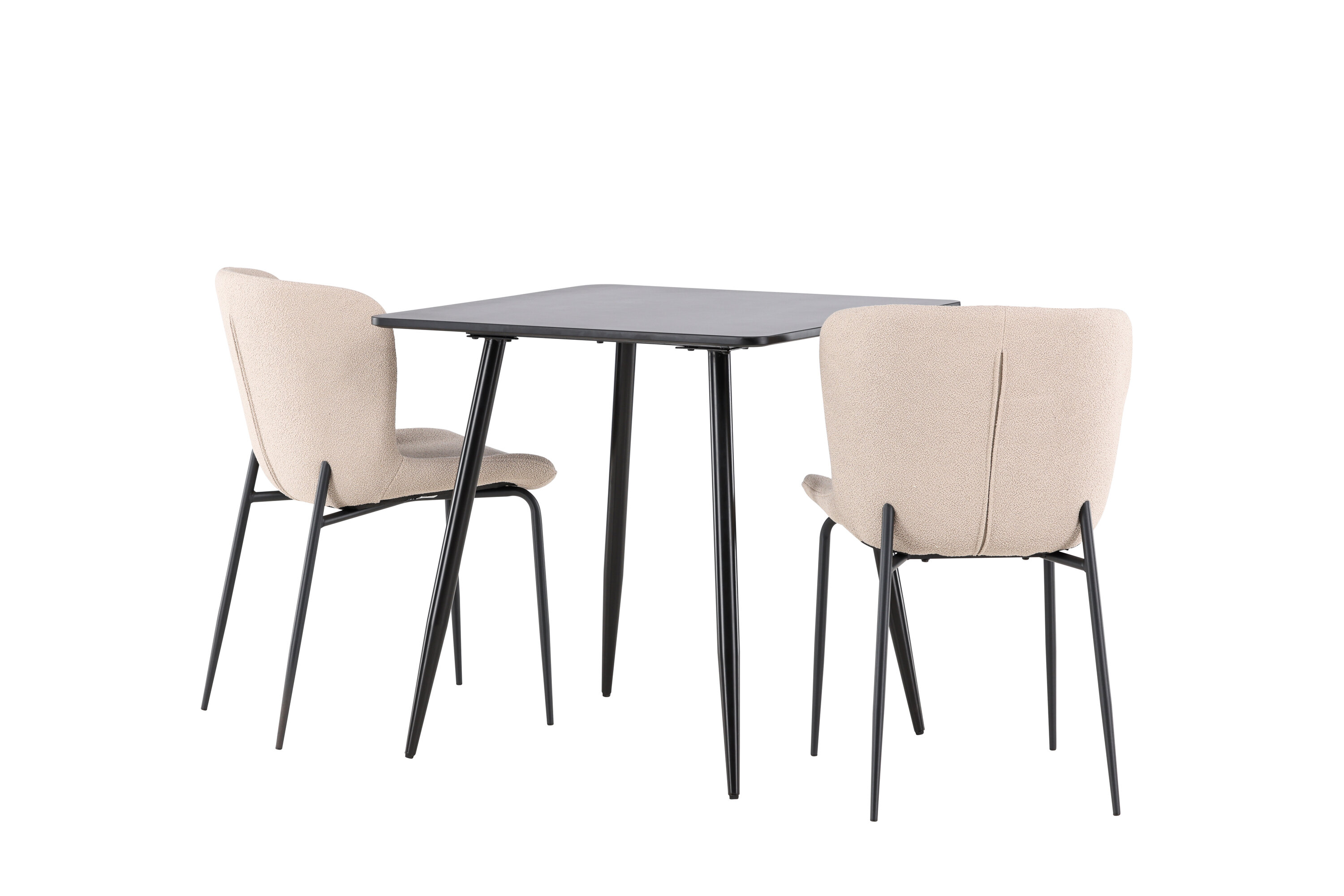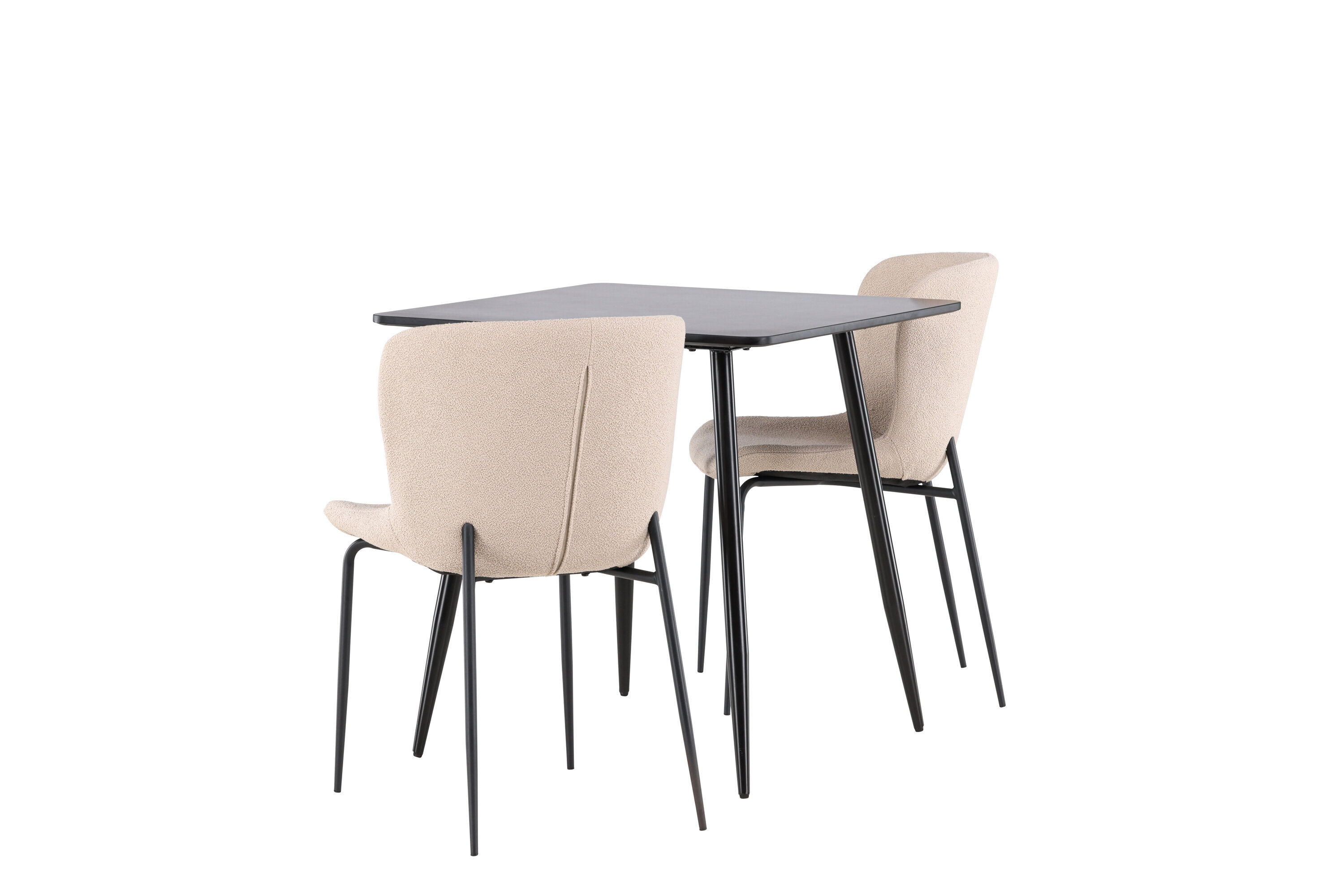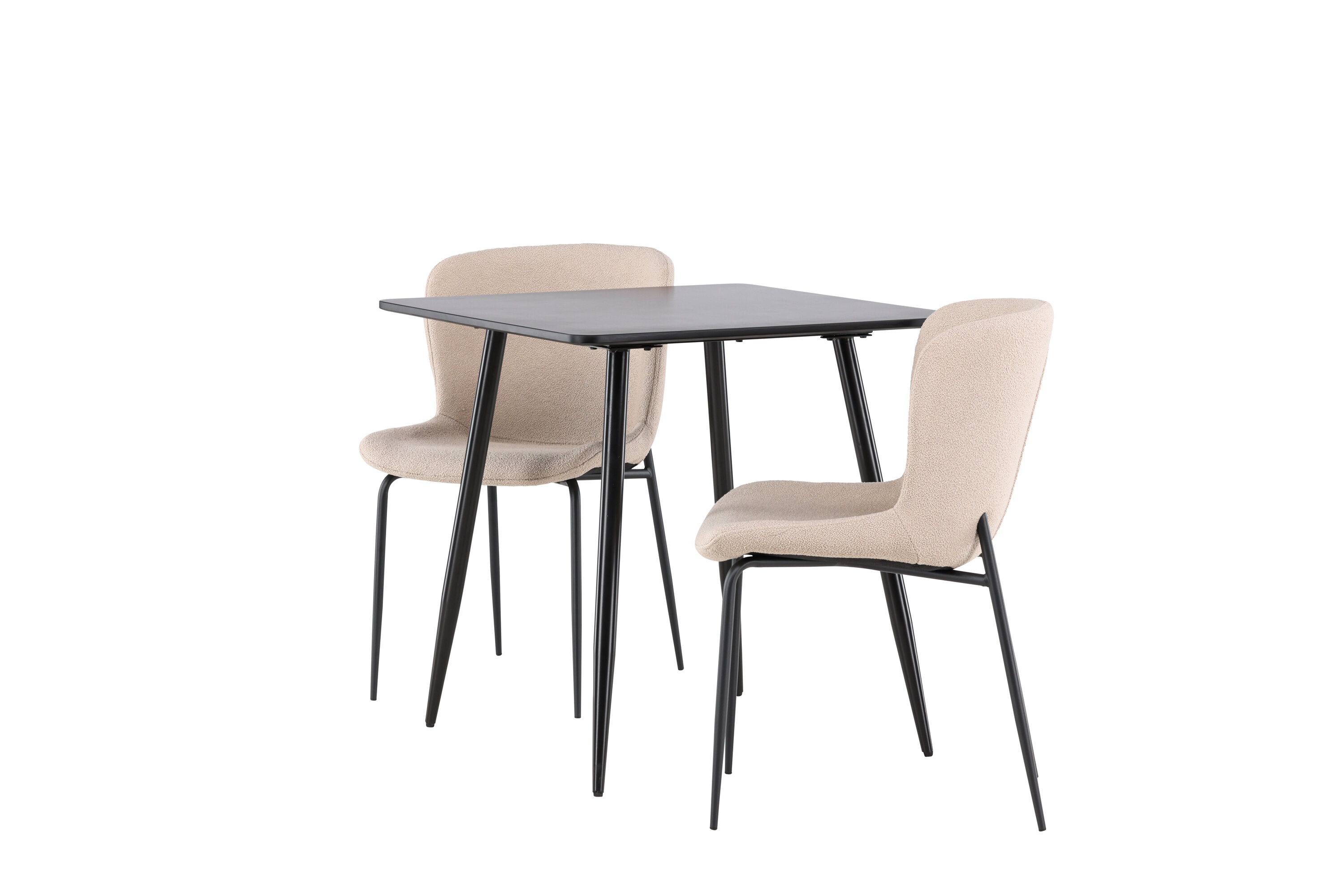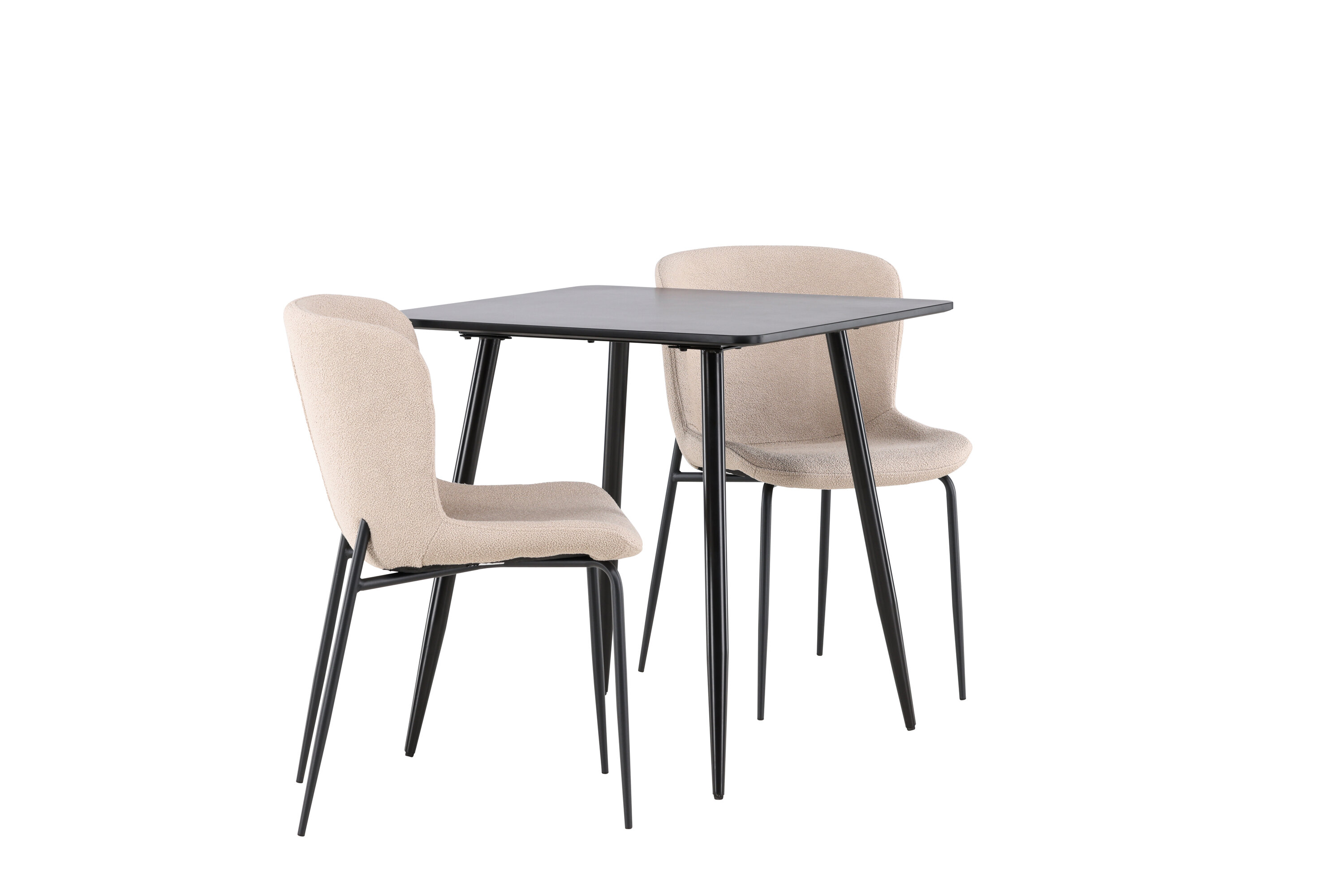 Erstellen Sie einen modernen und einladenden Essbereich mit unserem eleganten Ess-Set, das den eleganten Polartisch mit den bequemen Modesto-Stühlen kombiniert. Dieses Ess-Set eignet sich sowohl für kleine Mahlzeiten als auch für gemütliche Abendessen und verleiht Ihrem Esszimmer oder Ihrer Küche eine raffinierte und harmonische Atmosphäre. Der Polare Esstisch aus MDF hat eine elegante schwarze Farbe, die Ihrem Zuhause ein modernes und elegantes Gefühl verleiht. Mit den Abmessungen von 75x75 cm bietet der Tisch eine kompakte und dennoch geräumige Oberfläche für Essen und Unterhaltung und ist somit ideal für kleinere Räume oder intime Essbereiche. Die robuste Konstruktion des Tisches sorgt für langanhaltenden Einsatz und Stabilität. Die beiden Modesto-Stühle ergänzen den Tisch perfekt mit ihren eleganten Sitzen, die mit beigefarbenem Bouclé gepolstert sind, und den eleganten schwarzen Beinen. Diese Stühle bieten sowohl Komfort als auch Stil und sind daher ideal für lange, angenehme Mahlzeiten. Ihr modernes Design mit hohen Rückenlehnen und weichen Sitzen verleiht Ihrem Esszimmer oder Ihrer Küche eine raffinierte und moderne Note. Dieses Ess-Set ist eine perfekte Kombination aus Ästhetik und Funktionalität und damit eine ausgezeichnete Wahl für diejenigen, die einen eleganten und komfortablen Essbereich in einem kleineren Format suchen. Werten Sie Ihr Zuhause mit der Kombination aus Polartisch und Modesto-Stühlen auf und schaffen Sie einen Ort, an dem Erinnerungen und Freude geteilt werden.