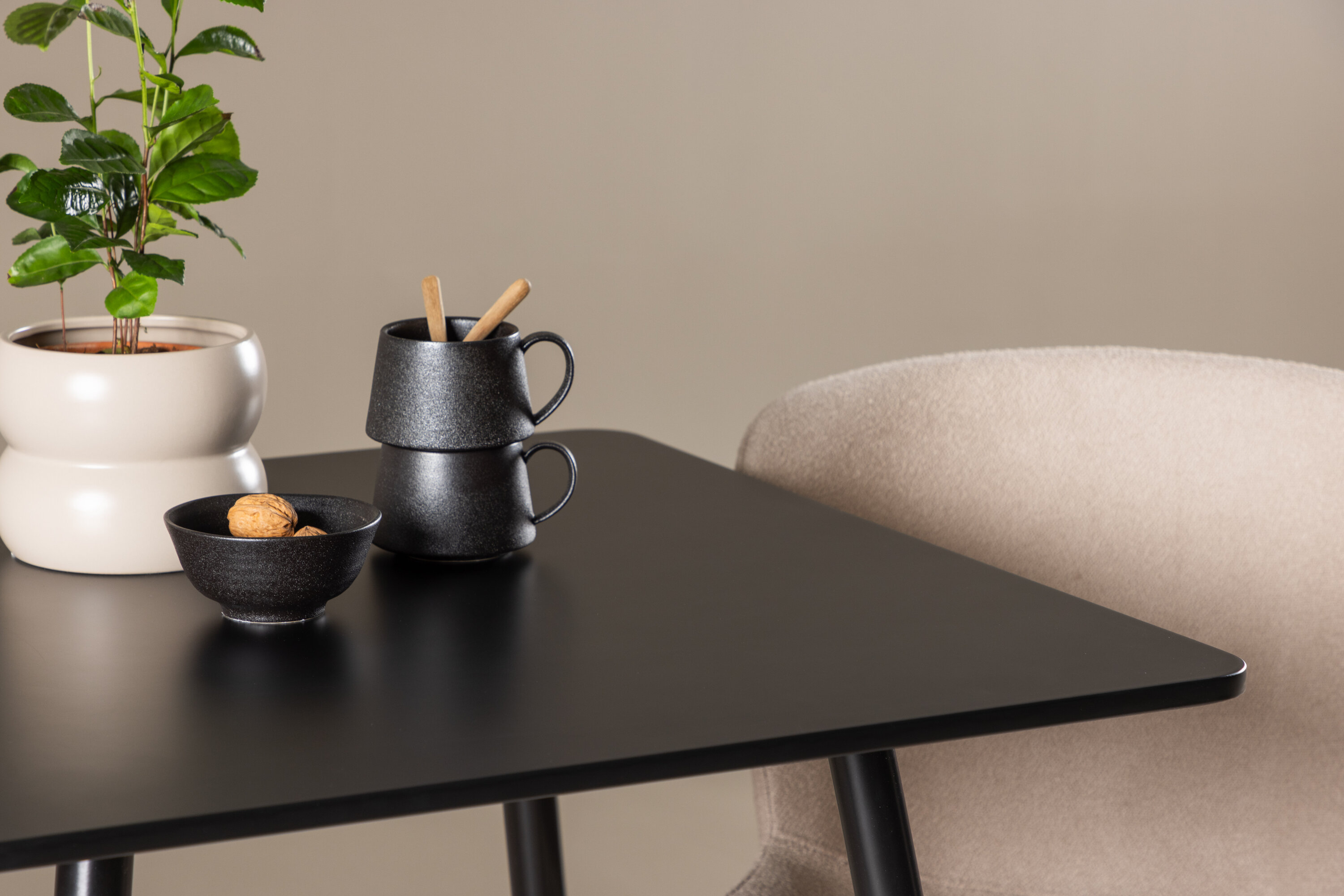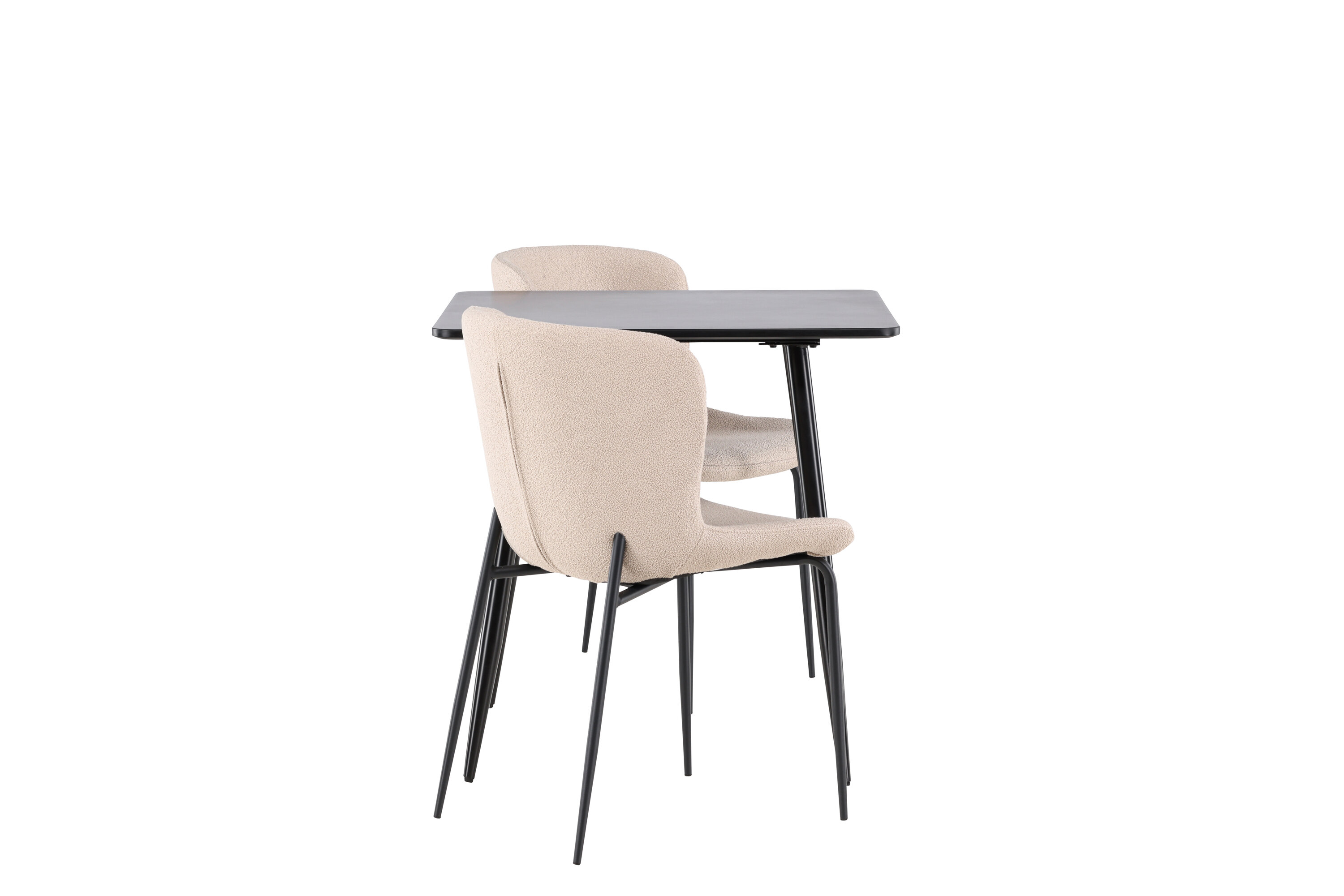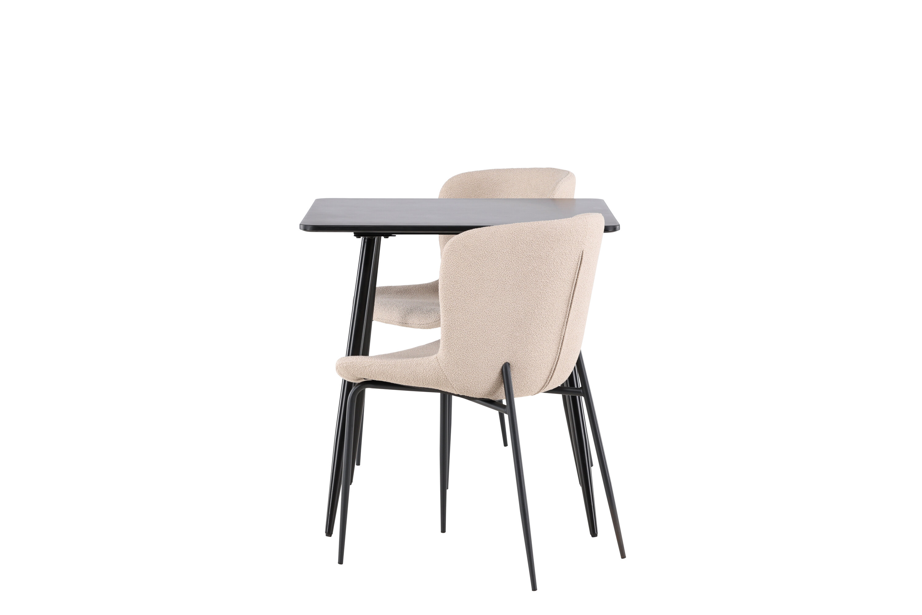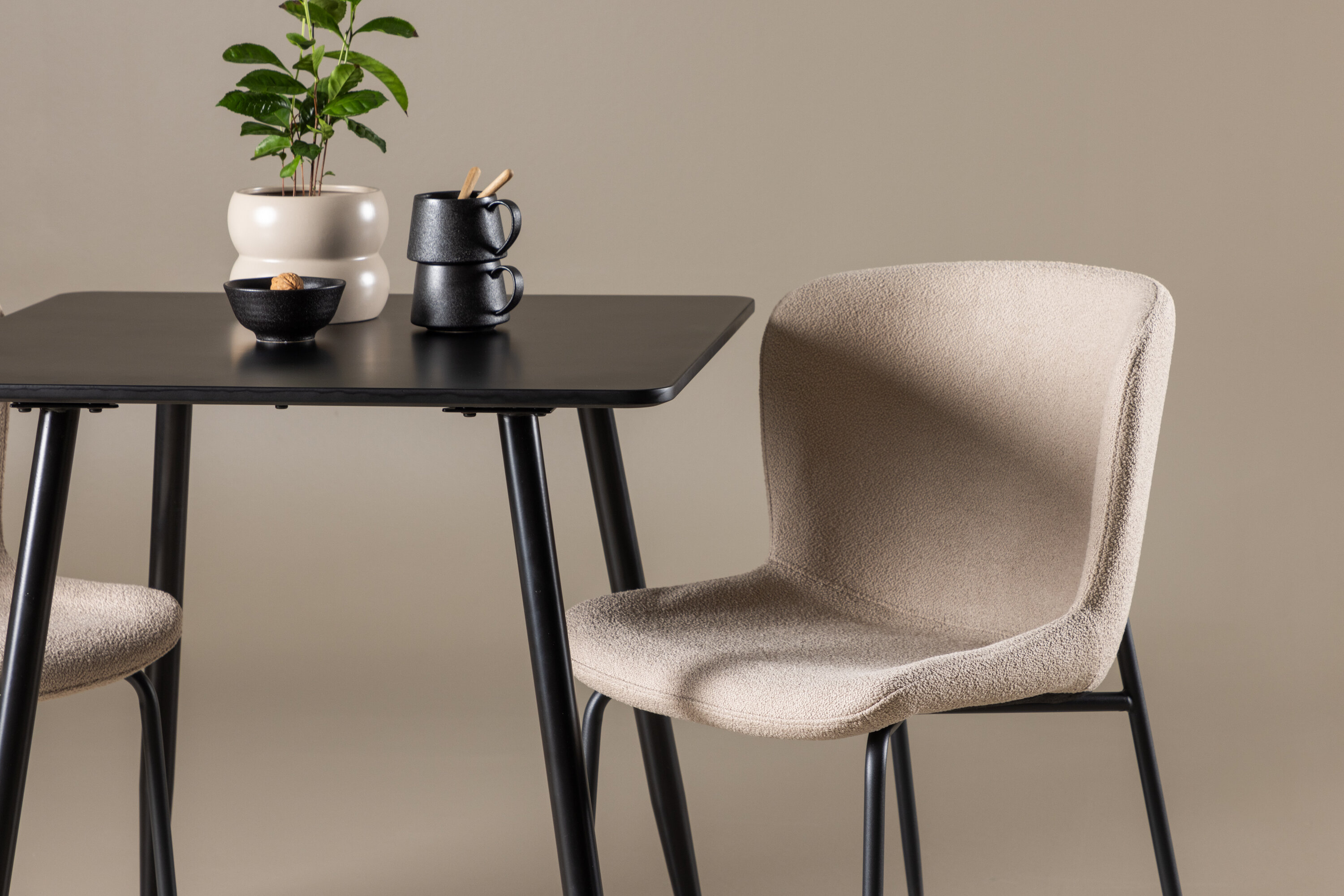 Erstellen Sie einen modernen und einladenden Essbereich mit unserem eleganten Ess-Set, das den eleganten Polartisch mit den bequemen Modesto-Stühlen kombiniert. Dieses Ess-Set eignet sich sowohl für kleine Mahlzeiten als auch für gemütliche Abendessen und verleiht Ihrem Esszimmer oder Ihrer Küche eine raffinierte und harmonische Atmosphäre. Der Polare Esstisch aus MDF hat eine elegante schwarze Farbe, die Ihrem Zuhause ein modernes und elegantes Gefühl verleiht. Mit den Abmessungen von 75x75 cm bietet der Tisch eine kompakte und dennoch geräumige Oberfläche für Essen und Unterhaltung und ist somit ideal für kleinere Räume oder intime Essbereiche. Die robuste Konstruktion des Tisches sorgt für langanhaltenden Einsatz und Stabilität. Die beiden Modesto-Stühle ergänzen den Tisch perfekt mit ihren eleganten Sitzen, die mit beigefarbenem Bouclé gepolstert sind, und den eleganten schwarzen Beinen. Diese Stühle bieten sowohl Komfort als auch Stil und sind daher ideal für lange, angenehme Mahlzeiten. Ihr modernes Design mit hohen Rückenlehnen und weichen Sitzen verleiht Ihrem Esszimmer oder Ihrer Küche eine raffinierte und moderne Note. Dieses Ess-Set ist eine perfekte Kombination aus Ästhetik und Funktionalität und damit eine ausgezeichnete Wahl für diejenigen, die einen eleganten und komfortablen Essbereich in einem kleineren Format suchen. Werten Sie Ihr Zuhause mit der Kombination aus Polartisch und Modesto-Stühlen auf und schaffen Sie einen Ort, an dem Erinnerungen und Freude geteilt werden.