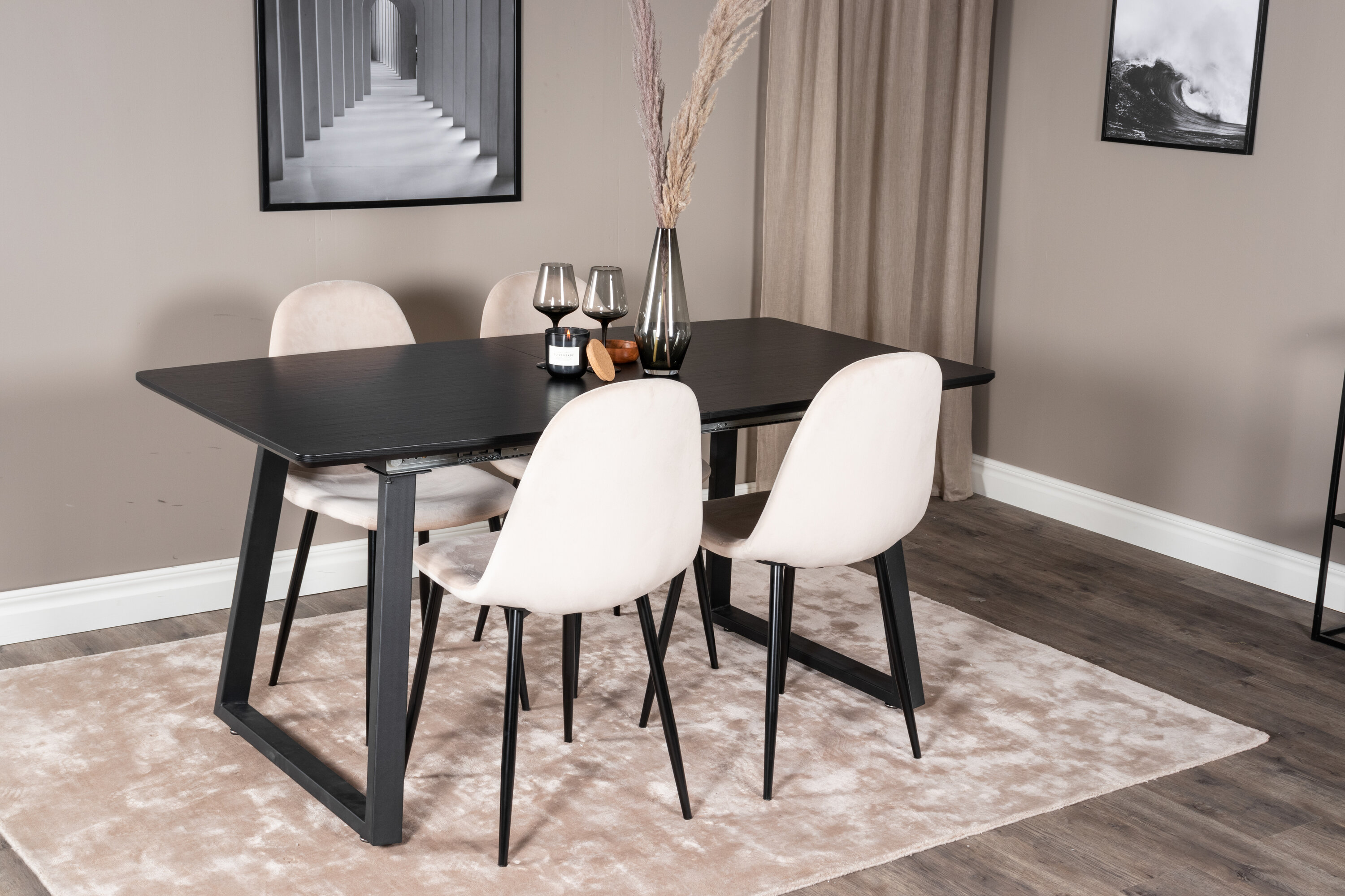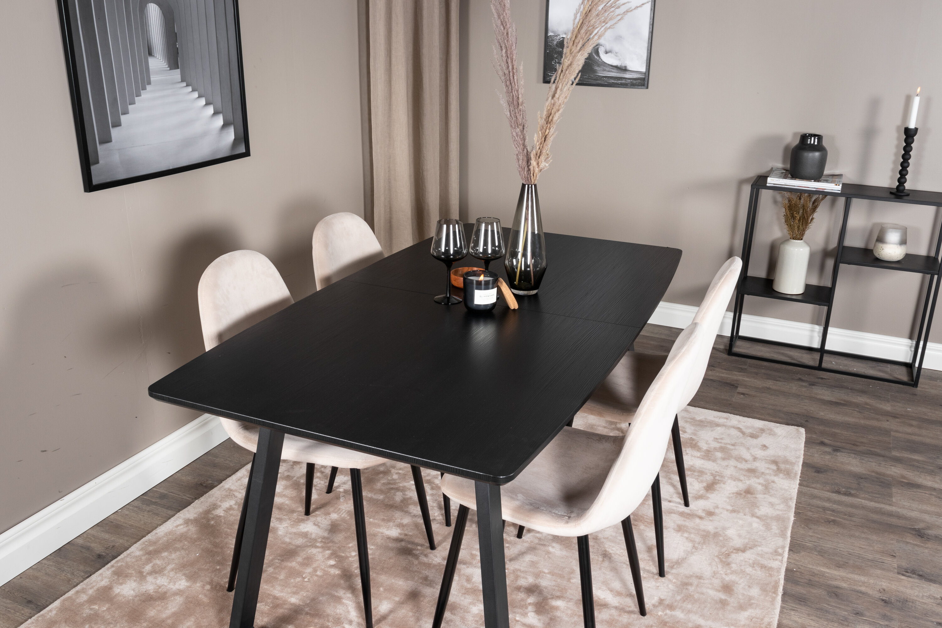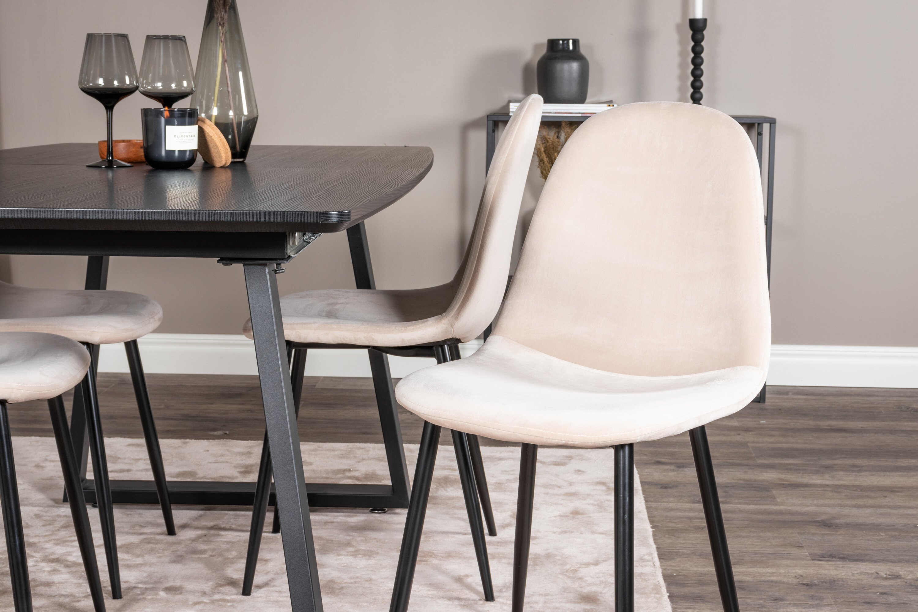 Unser beliebter Esstisch Inca in eleganter schwarzer Tischplatte lässt sich perfekt mit komfortablen Samtstühlen der Polar-Serie kombinieren. Eine stilvolle Foodgruppe in zeitloser Farbskala und mit modernem Feeling - ist für einen gemütlichen Alltag genauso gut wie für ein schönes Festmahl.