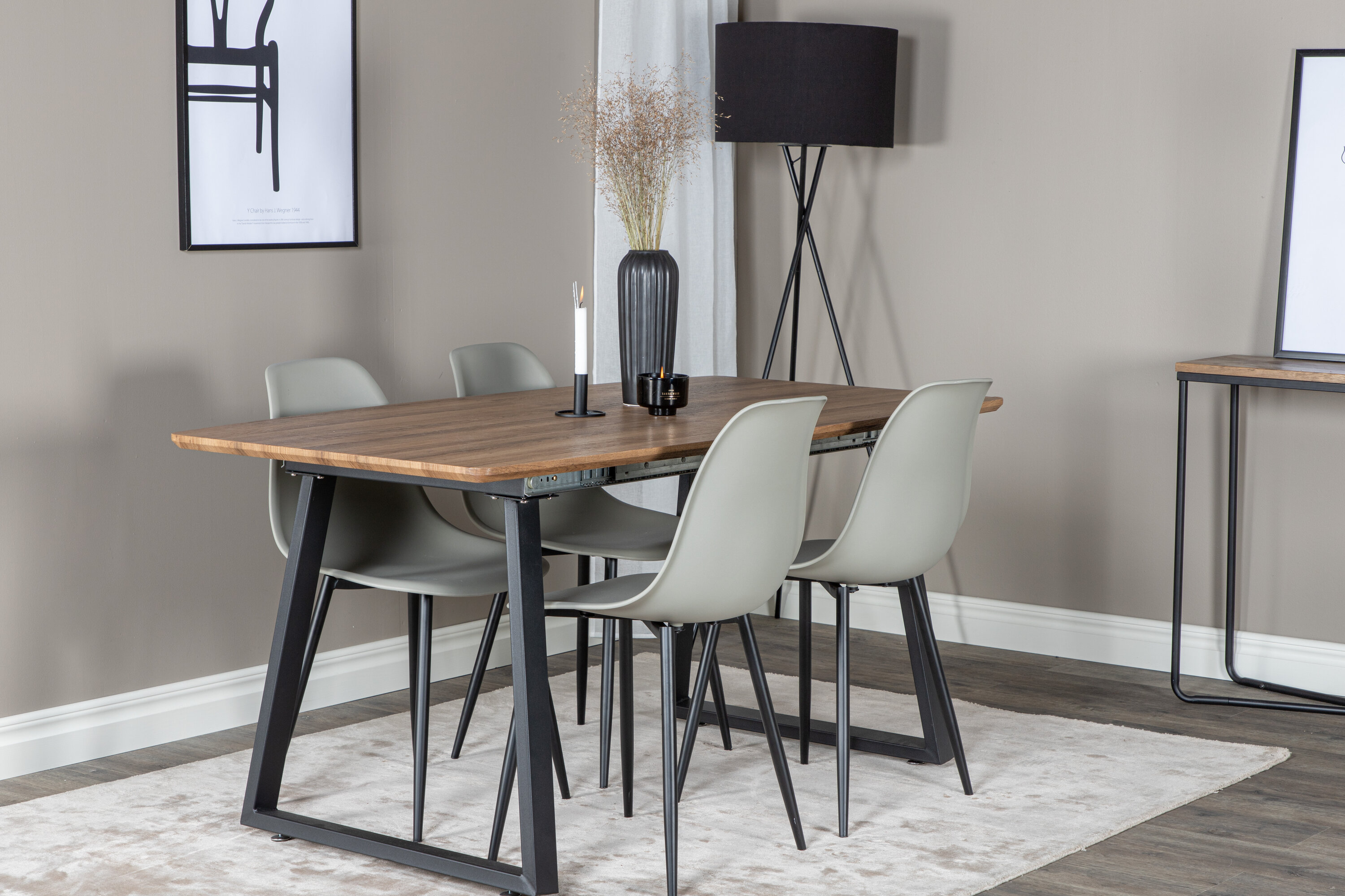 Ausstattung des Wohnzimmers mit einer modernen Lebensmittelgruppe in leckerer Farbskala. Hier werden graue Esszimmerstühle der Serie Polar mit unserem Esstisch Inca in leckerem Holz kombiniert. Versammeln Sie die Familie und erhöhen Sie die Dinner-Momente in dieser ausgefallenen Essensgruppe!