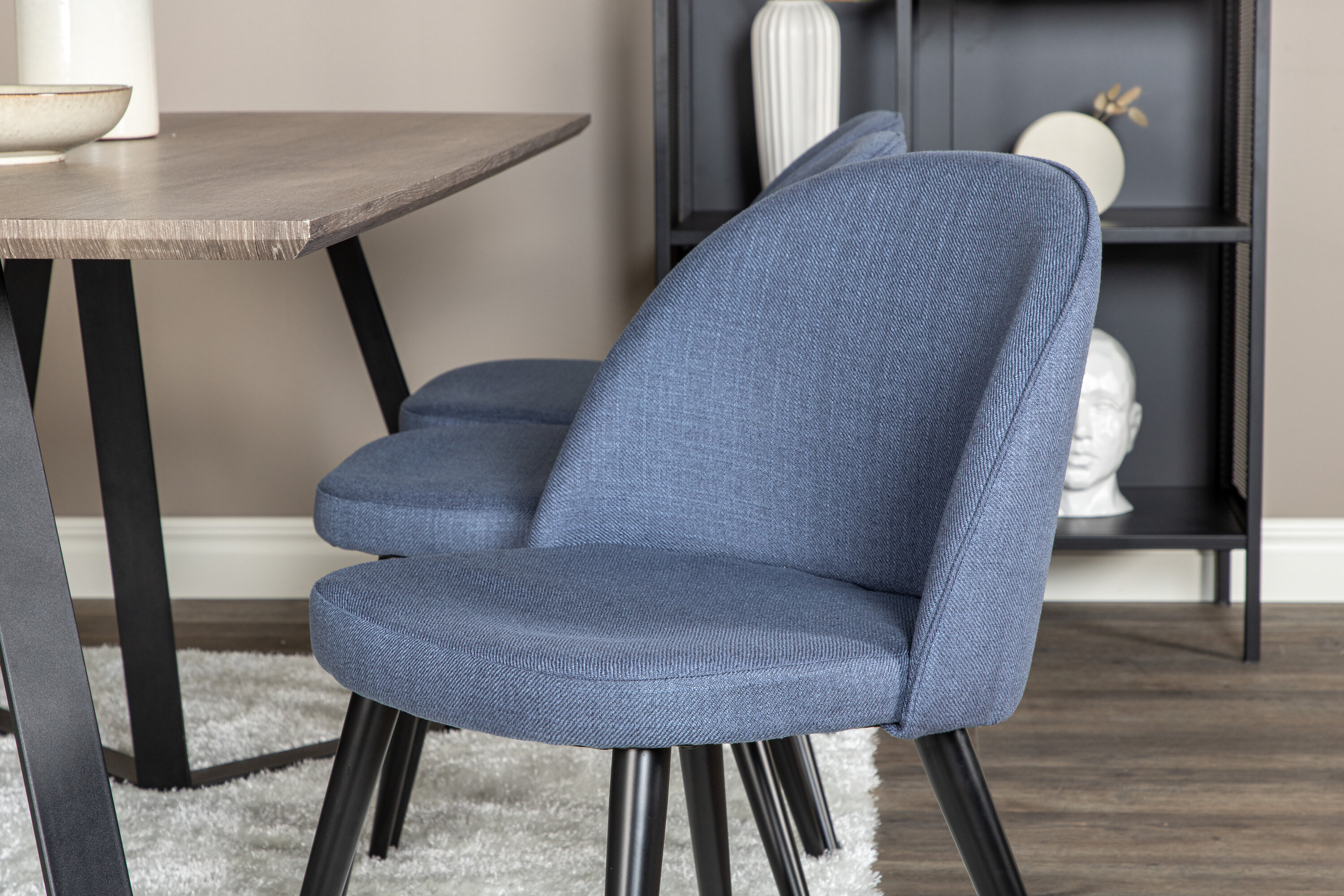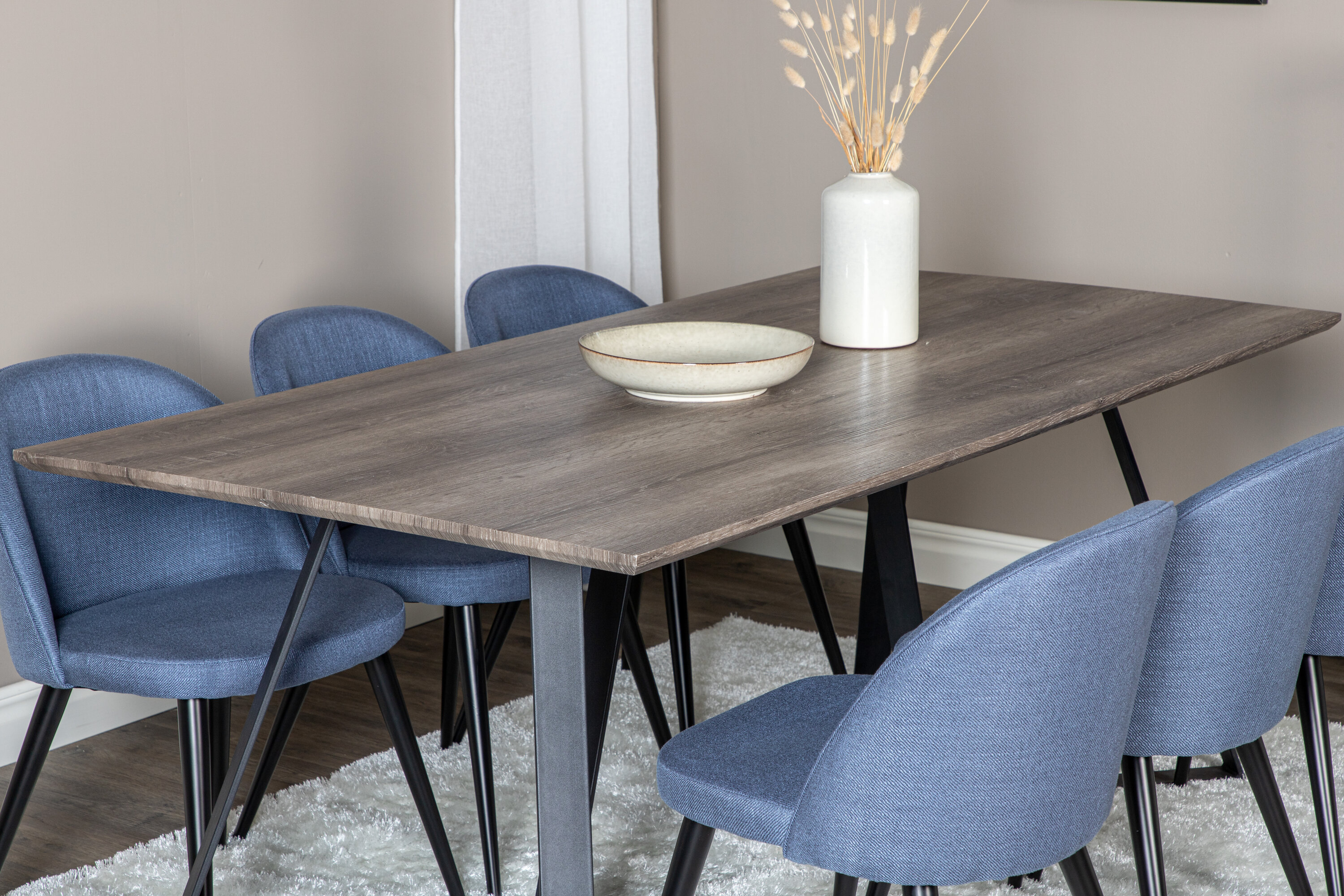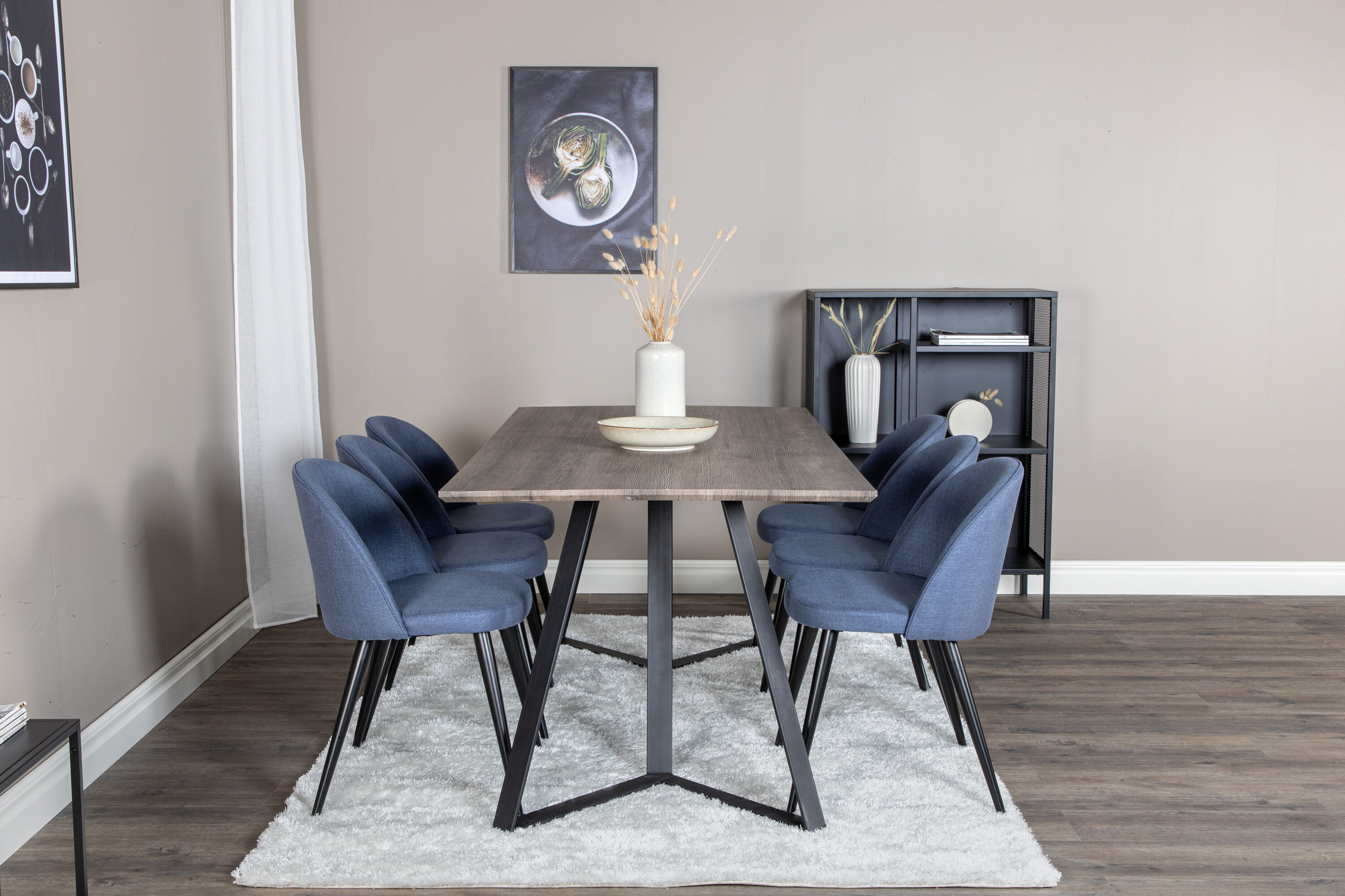 Eine trendfeste und praktische Lebensmittelgruppe in leckerer Farbskala. Der Esstisch Marina aus Holz wird in der Serie Velvet mit blauen Esstischen kombiniert. Erweitern Sie Ihre Einladungen zum Abendessen und machen Sie sich keine Sorgen, dass alle untergebracht werden.