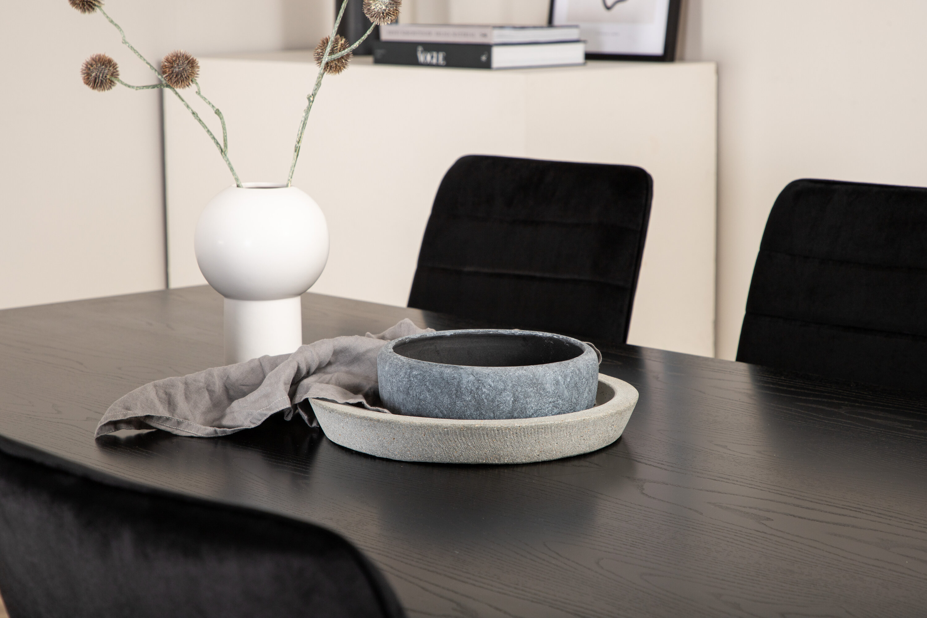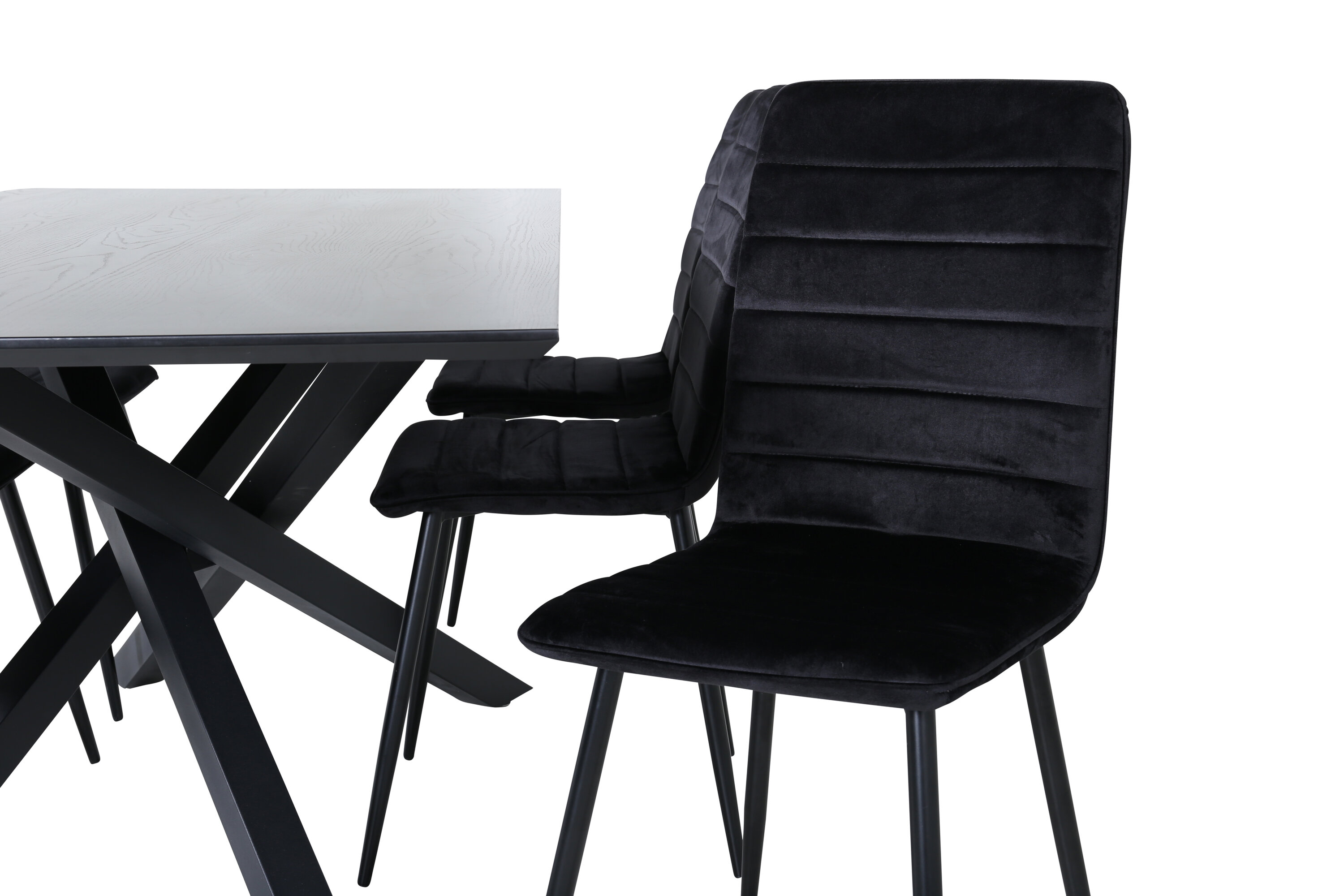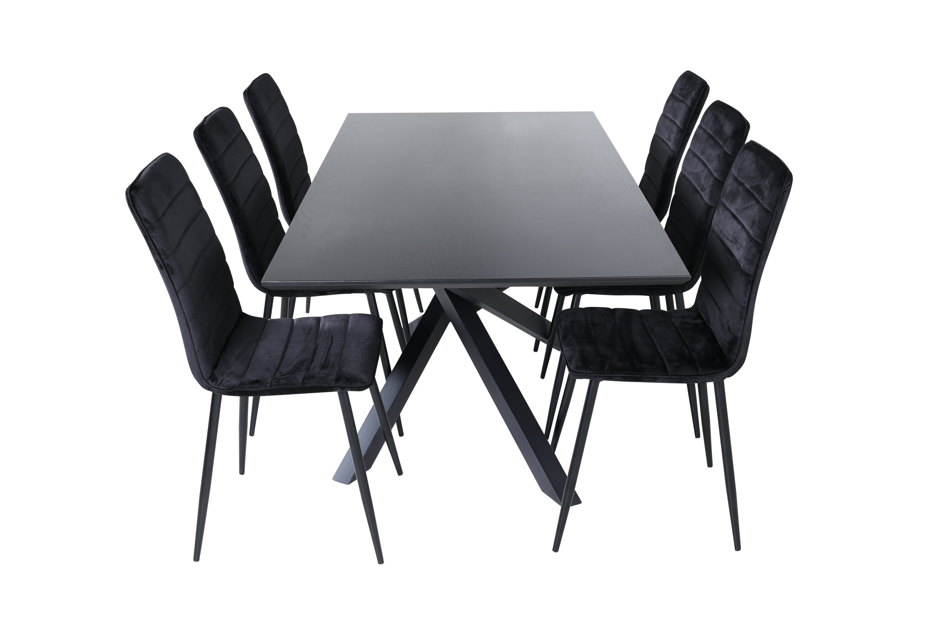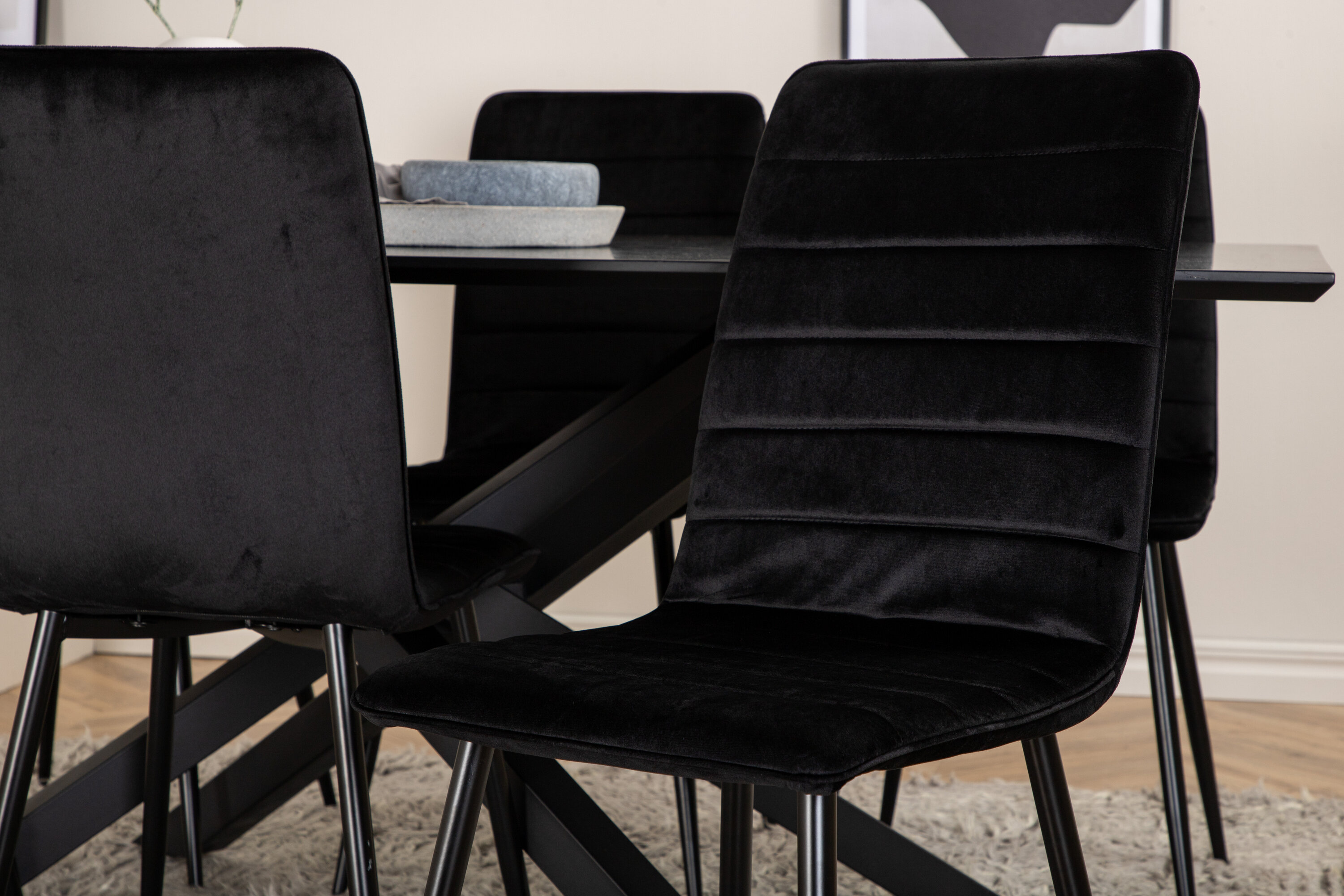 Eine vollständige Gruppe schwarzer Lebensmittel läuft nie aus der Zeit! Piazza ist unser beliebter rechteckiger Esstisch mit luxuriöser Haptik und trendigen Details im Design. Die Tischplatte besteht aus MDF-Furnieren in einer verschmierten schwarzen Farbe und der Korpus schafft einen stetigen Blickfang mit überkreuzten Beinen in schwarzem Eisen. Hier zusammen mit 6 Windu Luxus-Essstühlen im geraden Design. Die Stühle haben schwarze Sitze aus Samt, die dem Raum einen schönen Glanz verleihen, und schmale Stuhlbeine aus Eisen. Hier sitzen Sie und Ihre Gäste gemütlich lange!