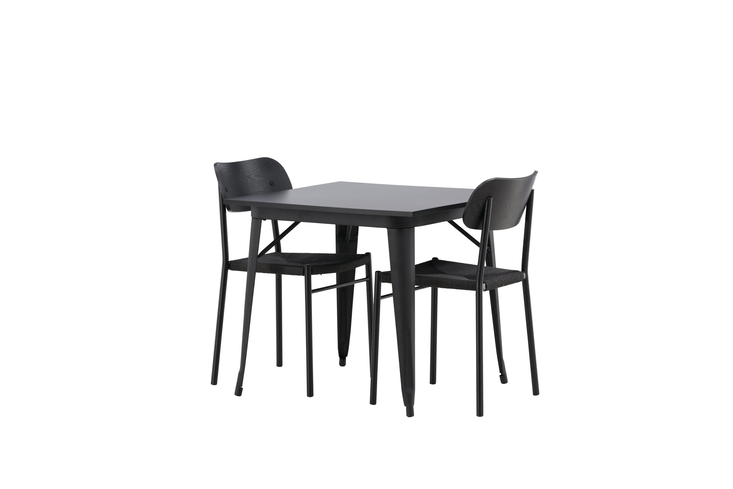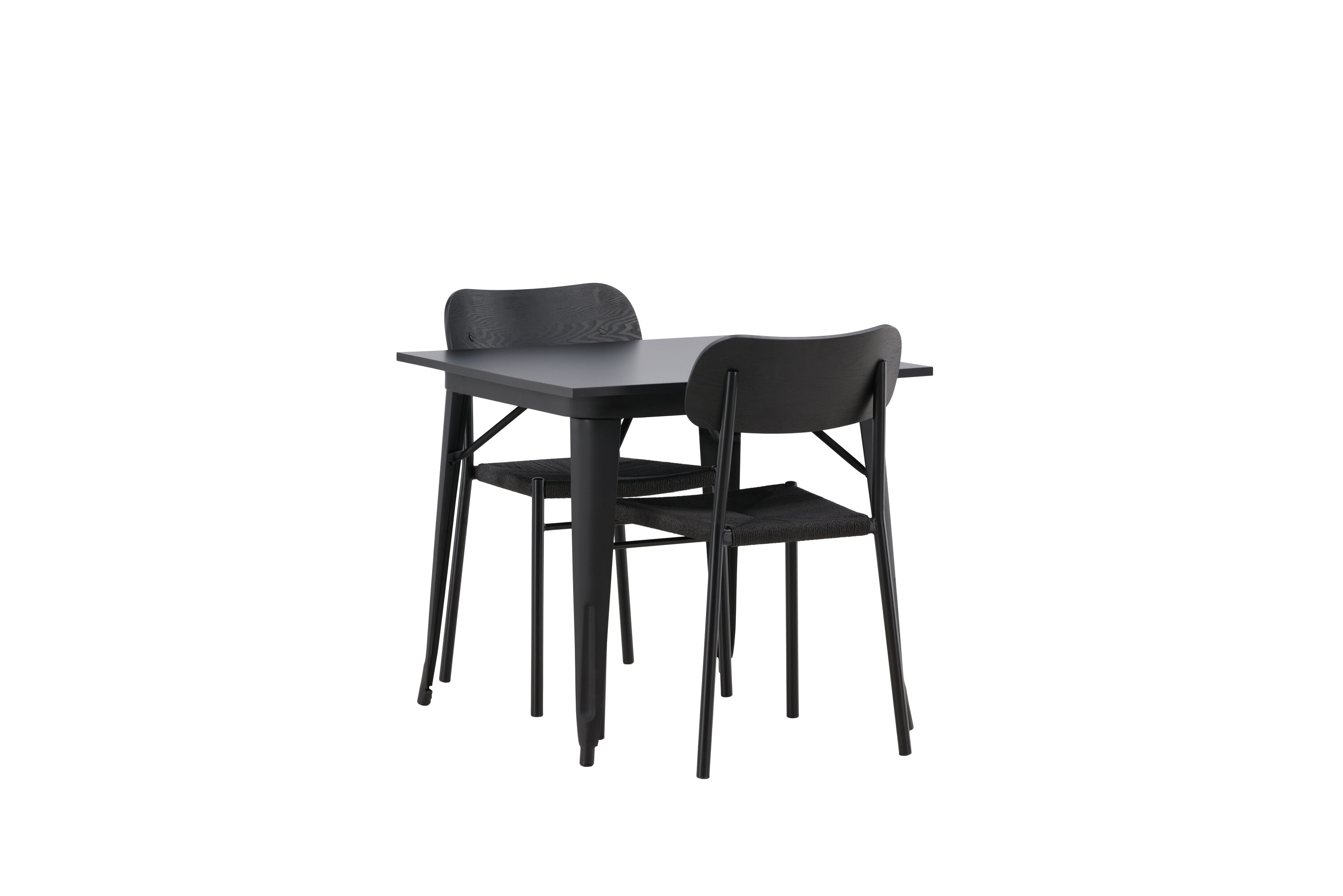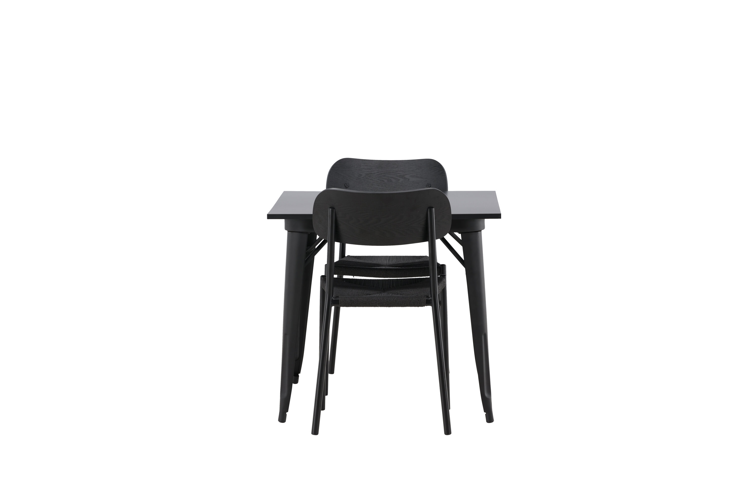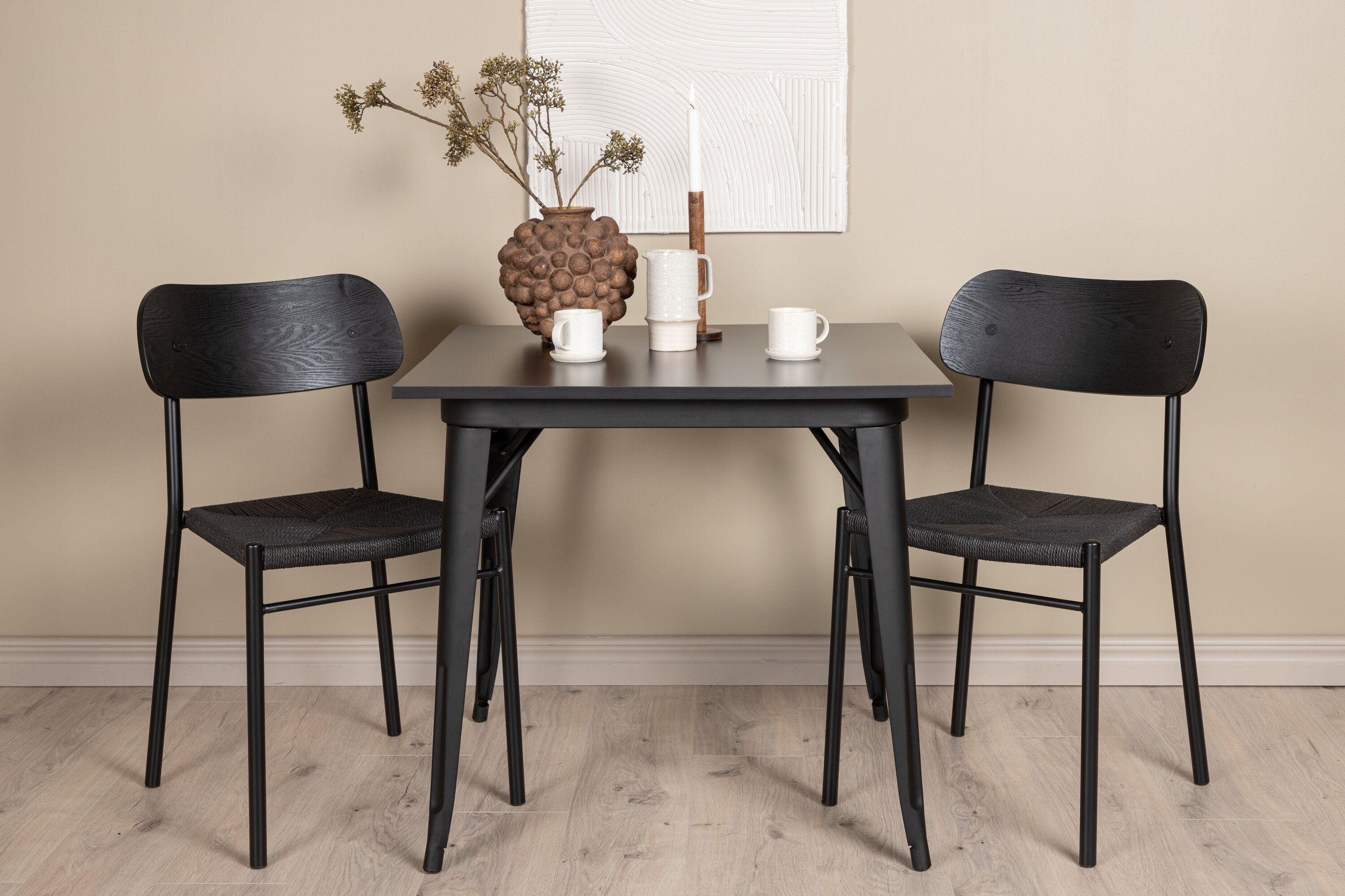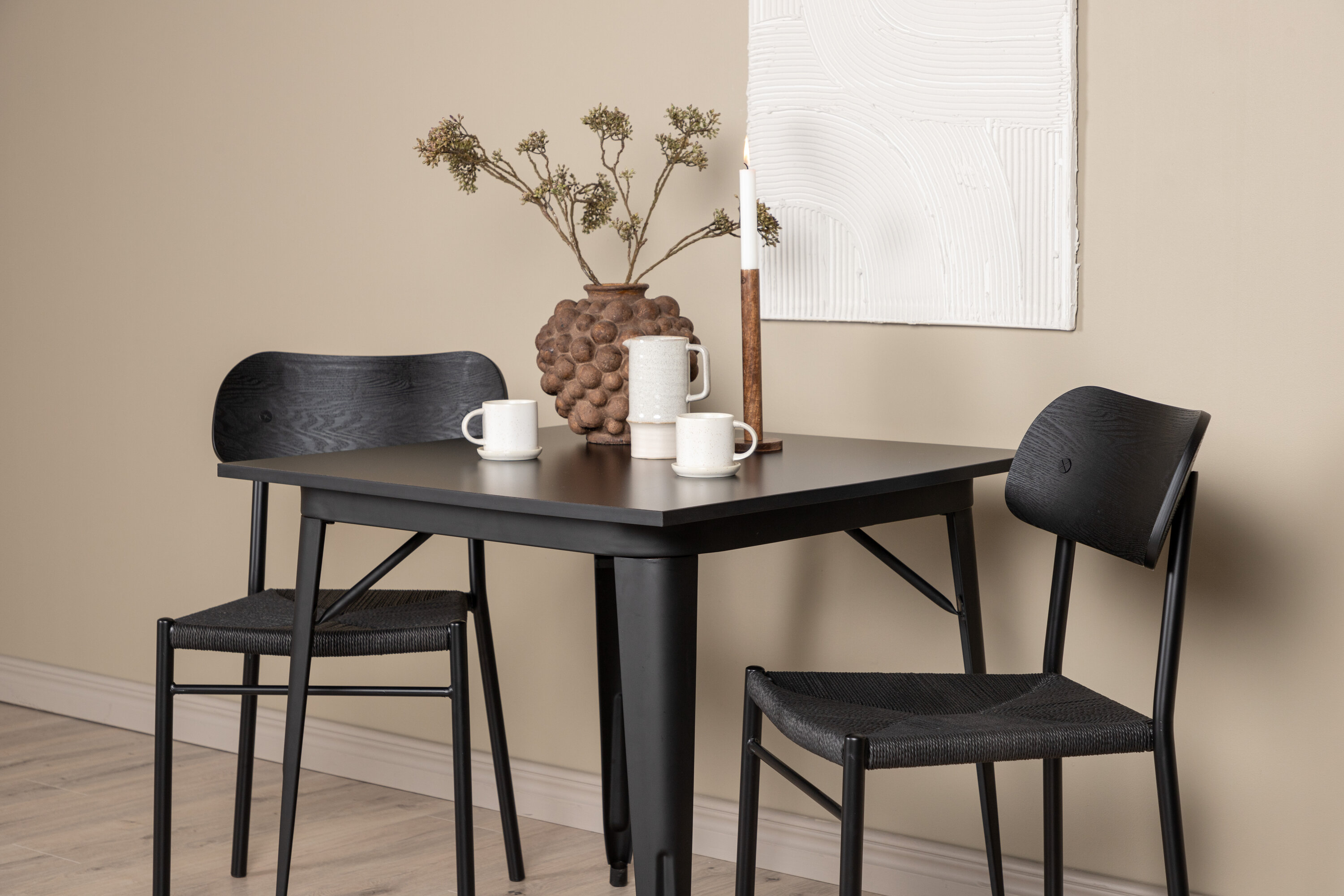 Richten Sie Ihr Zuhause elegant und stilvoll ein - diese kleine Essgruppe passt perfekt in die kleinere Küche! Dieser Esstisch aus der Tempe-Serie hat ein klassisches, quadratisches Design und eine zeitlose schwarze Farbe. Die Tischplatte ist aus schwarzem MDF und die Tischbeine aus schwarzem Metall. Hier in geschmackvoller Kombination mit zwei Esszimmerstühlen aus der Serie Polly, ganz nach den Trends minimalistischer Formen gestaltet. Die Rückenlehne ist aus schwarzem MDF mit Furnier, der Sitz aus trendigem schwarzem Naturfasergewebe und die Beine aus schwarzem pulverbeschichtetem Metall. Erstelle ein charmantes Herzstück im Herzen deines Zuhauses!