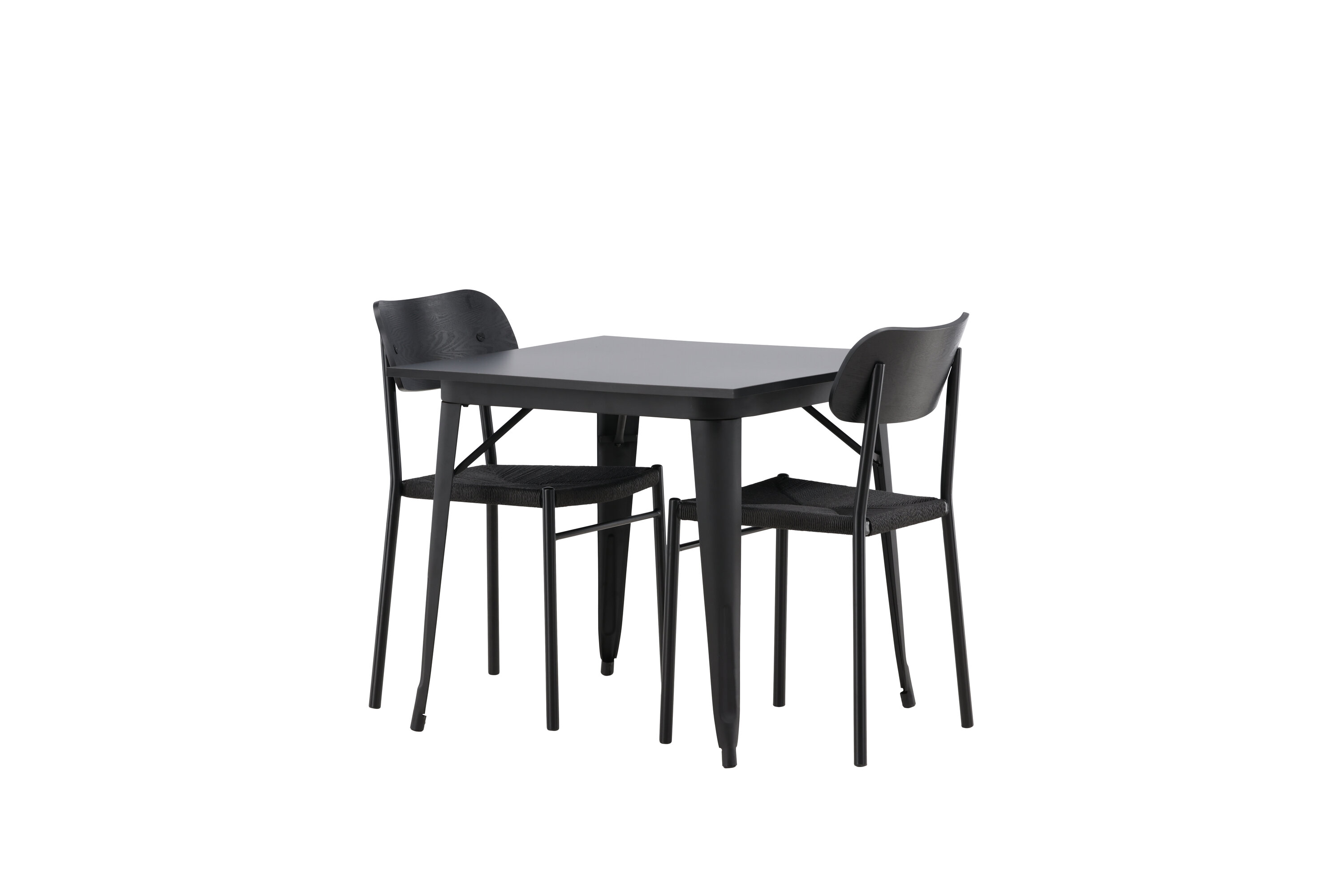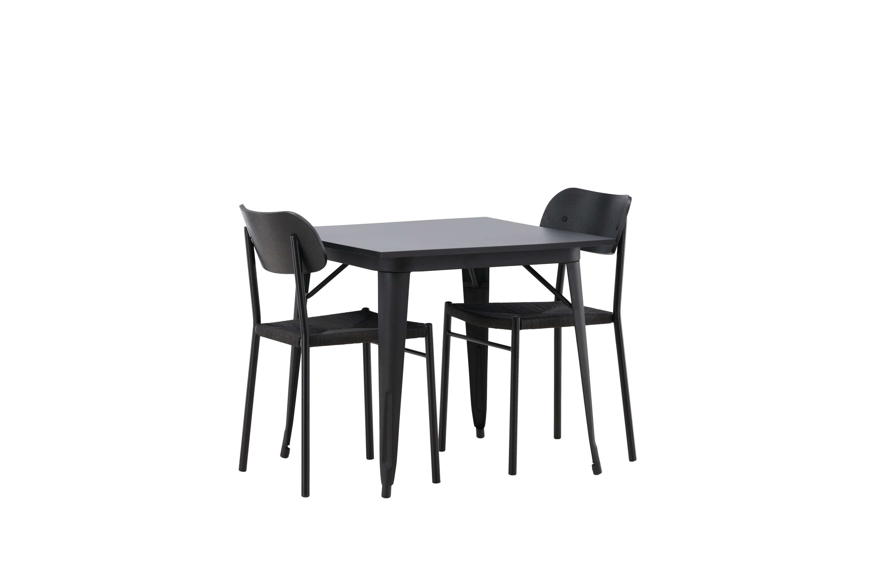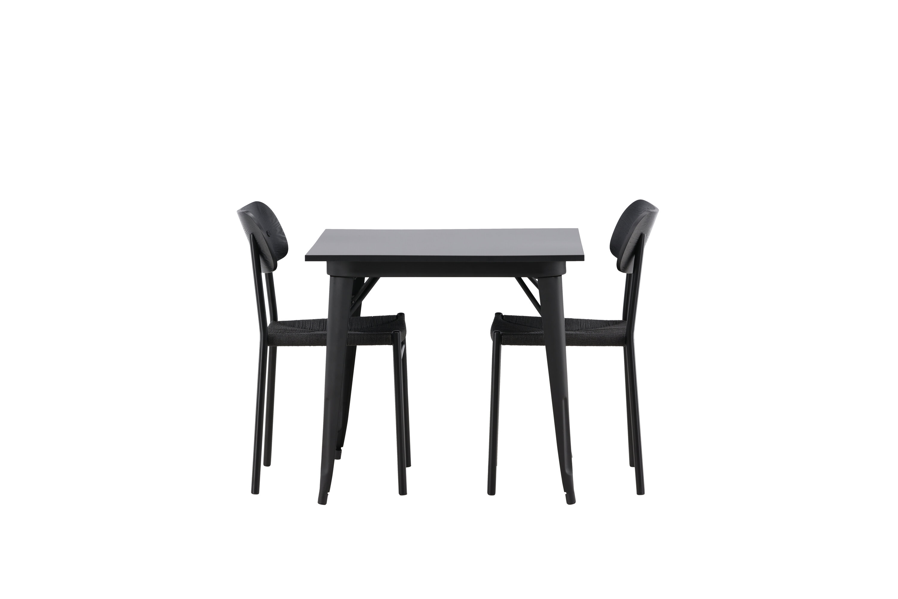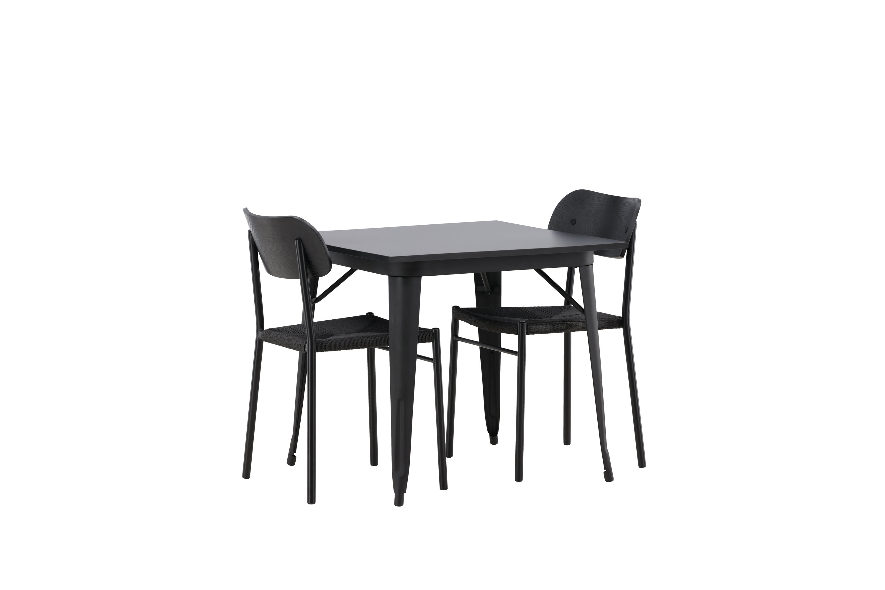 Richten Sie Ihr Zuhause elegant und stilvoll ein - diese kleine Essgruppe passt perfekt in die kleinere Küche! Dieser Esstisch aus der Tempe-Serie hat ein klassisches, quadratisches Design und eine zeitlose schwarze Farbe. Die Tischplatte ist aus schwarzem MDF und die Tischbeine aus schwarzem Metall. Hier in geschmackvoller Kombination mit zwei Esszimmerstühlen aus der Serie Polly, ganz nach den Trends minimalistischer Formen gestaltet. Die Rückenlehne ist aus schwarzem MDF mit Furnier, der Sitz aus trendigem schwarzem Naturfasergewebe und die Beine aus schwarzem pulverbeschichtetem Metall. Erstelle ein charmantes Herzstück im Herzen deines Zuhauses!