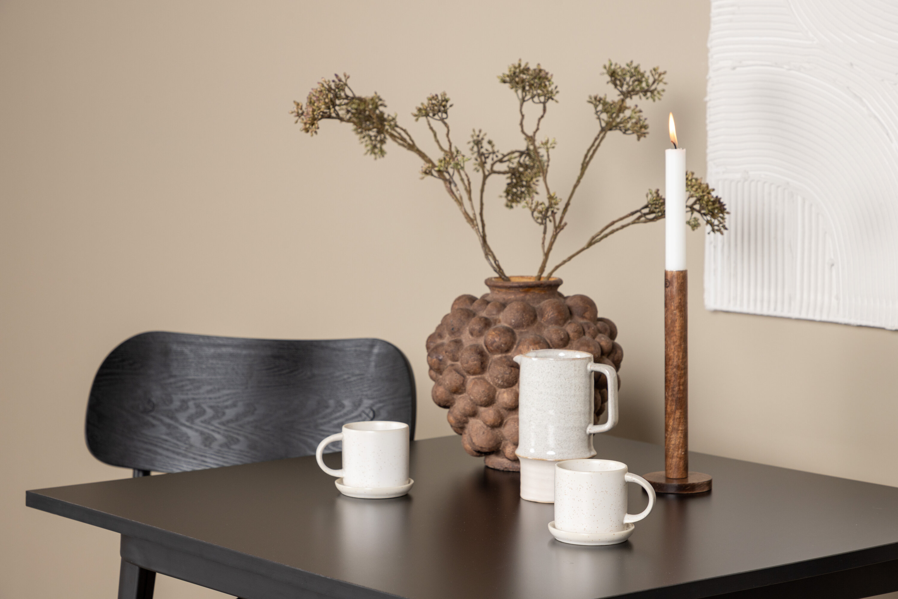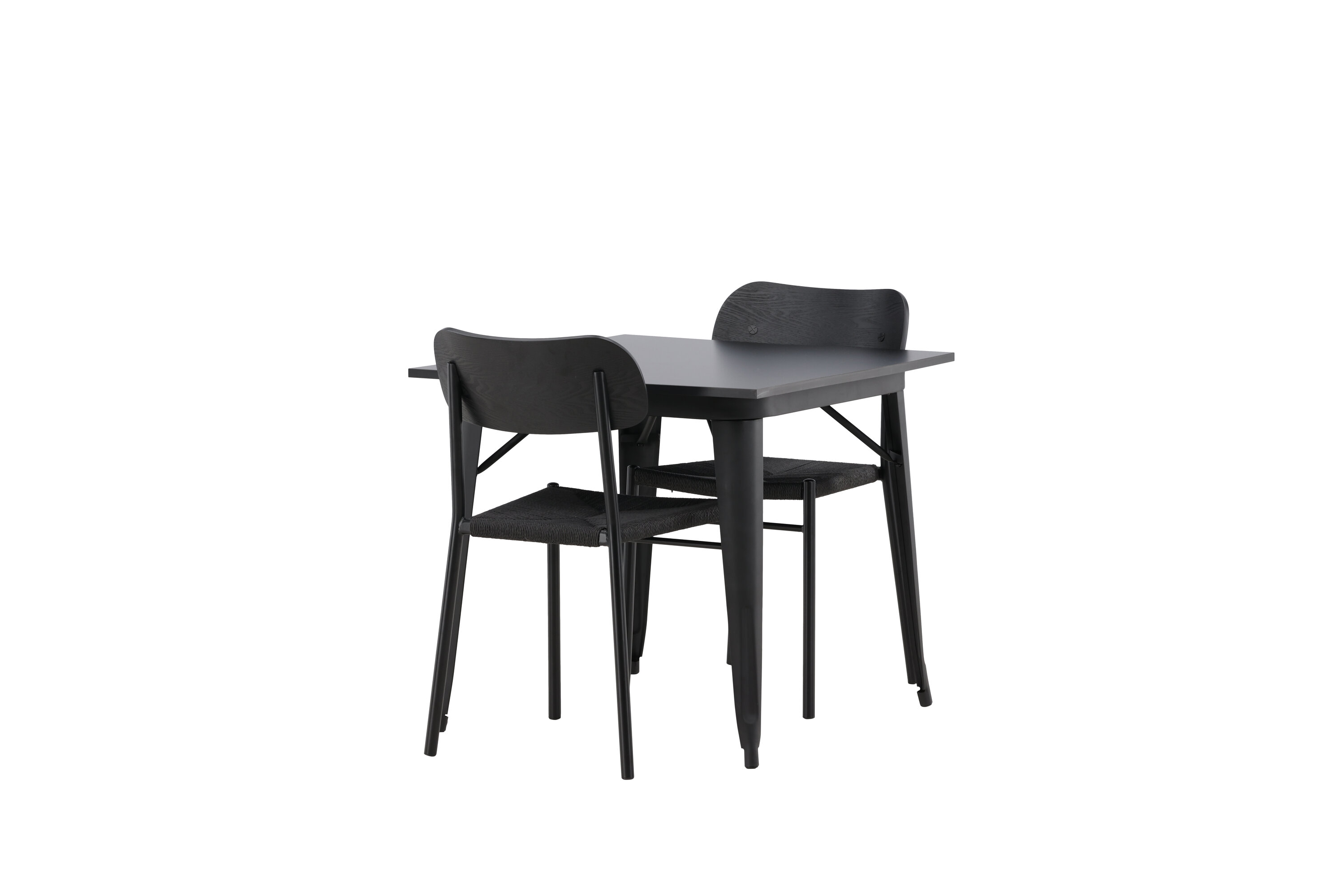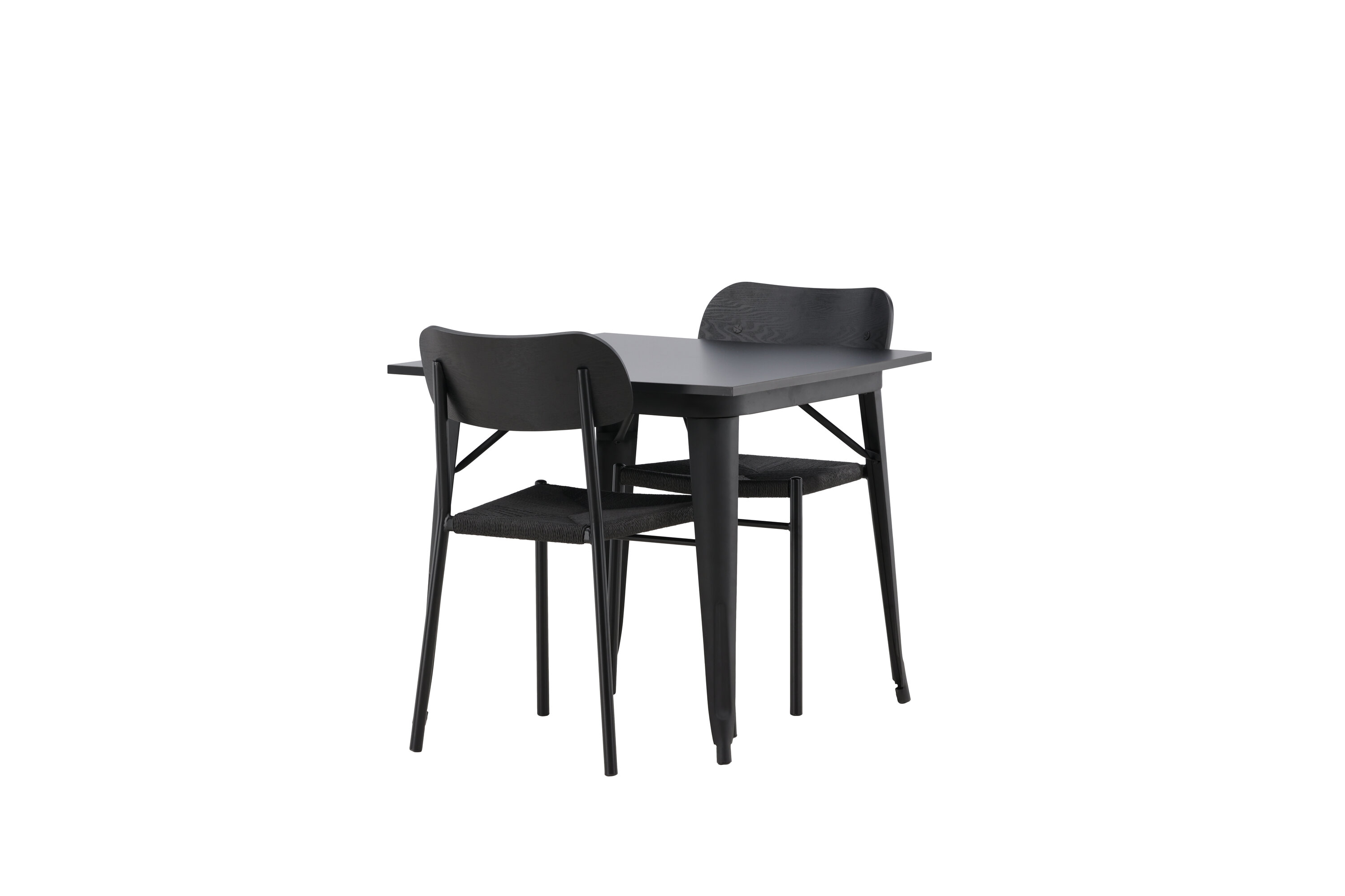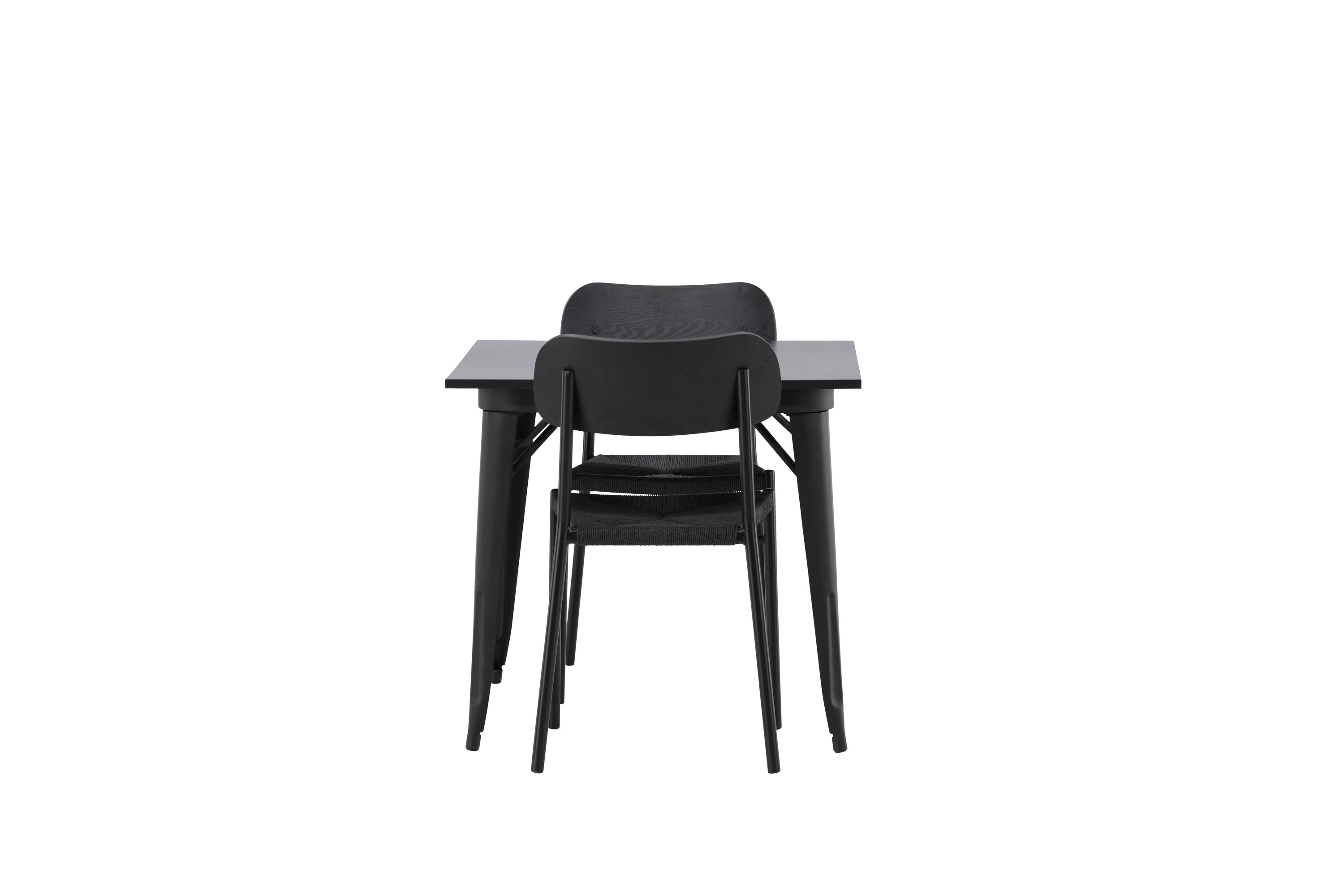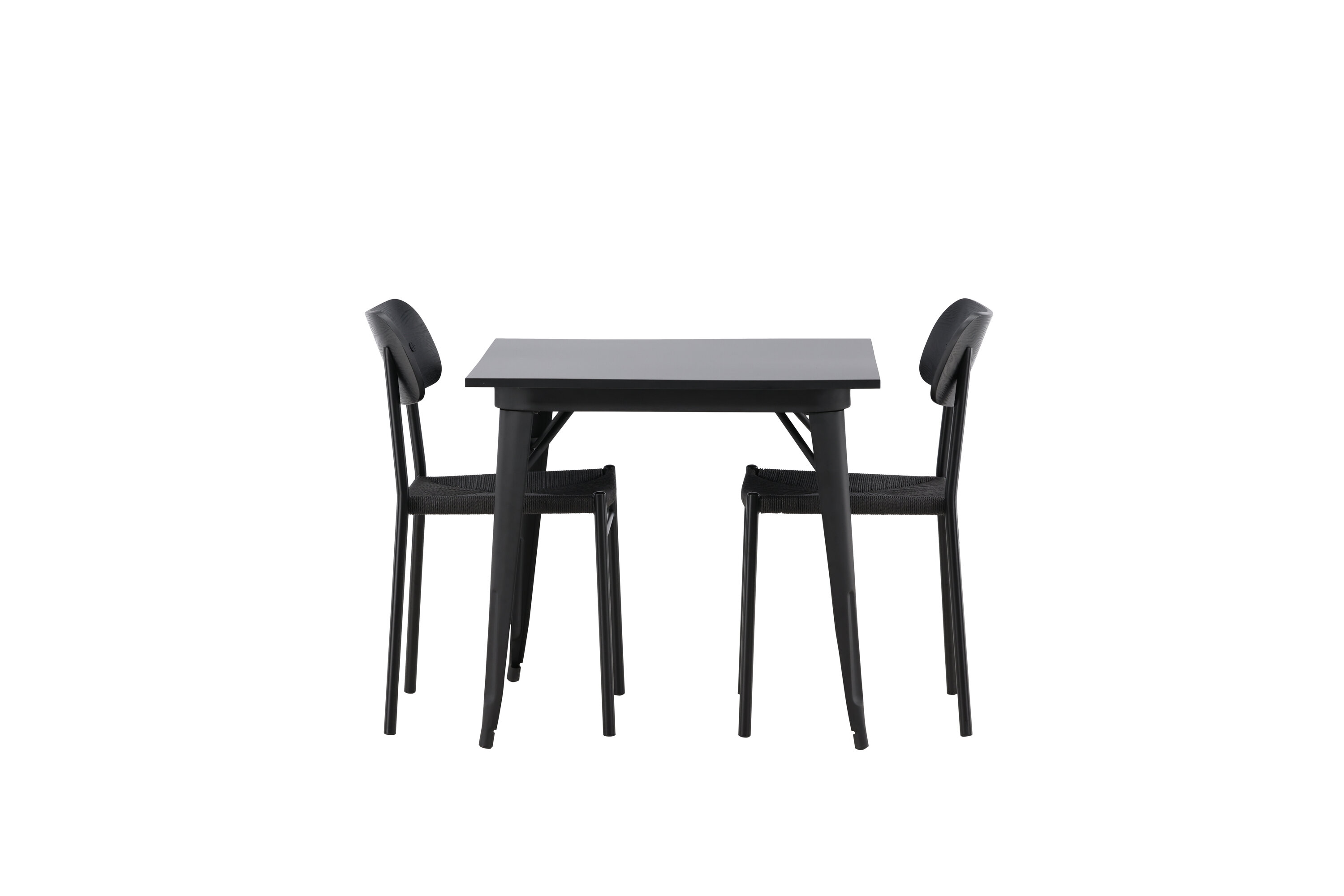 Richten Sie Ihr Zuhause elegant und stilvoll ein - diese kleine Essgruppe passt perfekt in die kleinere Küche! Dieser Esstisch aus der Tempe-Serie hat ein klassisches, quadratisches Design und eine zeitlose schwarze Farbe. Die Tischplatte ist aus schwarzem MDF und die Tischbeine aus schwarzem Metall. Hier in geschmackvoller Kombination mit zwei Esszimmerstühlen aus der Serie Polly, ganz nach den Trends minimalistischer Formen gestaltet. Die Rückenlehne ist aus schwarzem MDF mit Furnier, der Sitz aus trendigem schwarzem Naturfasergewebe und die Beine aus schwarzem pulverbeschichtetem Metall. Erstelle ein charmantes Herzstück im Herzen deines Zuhauses!