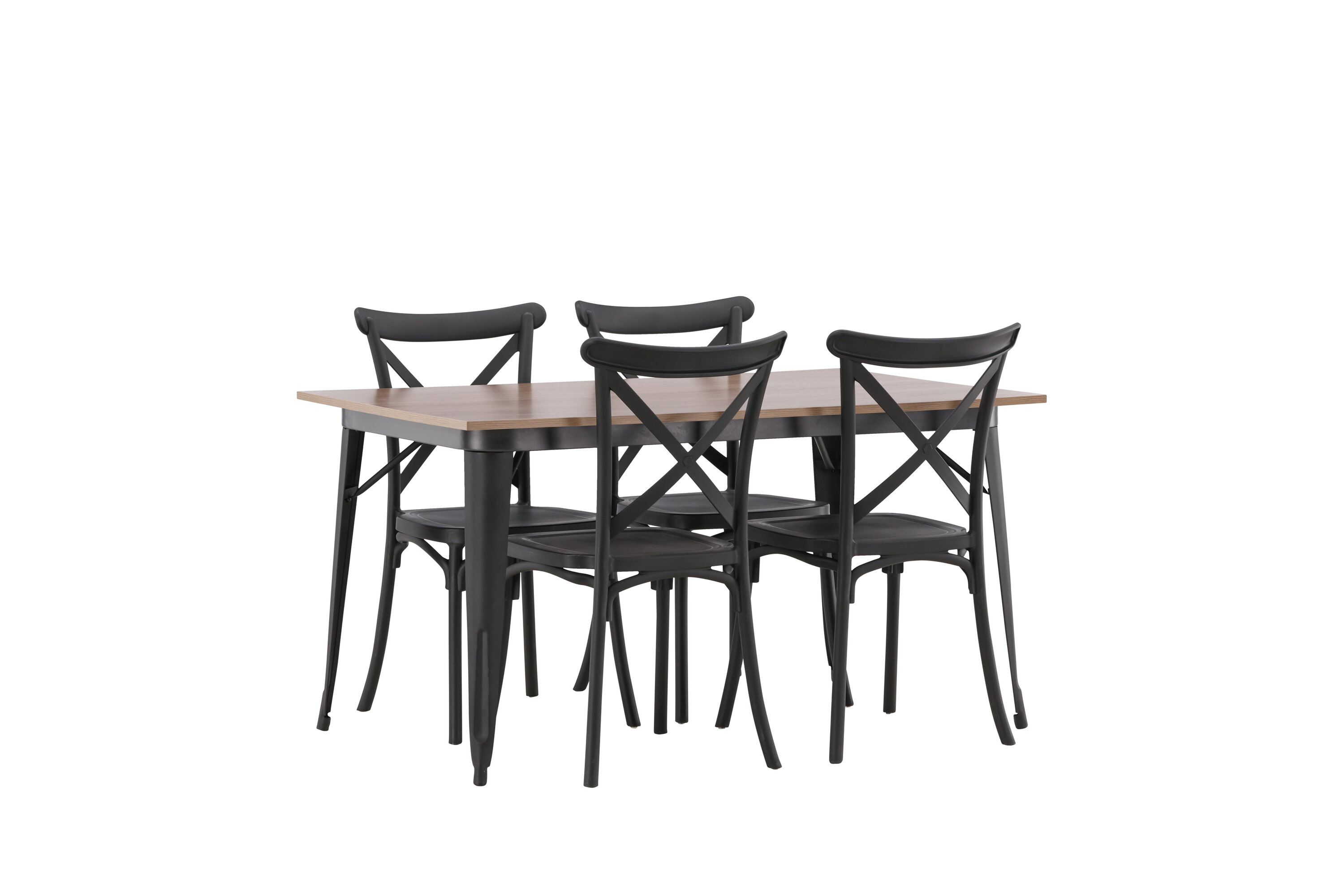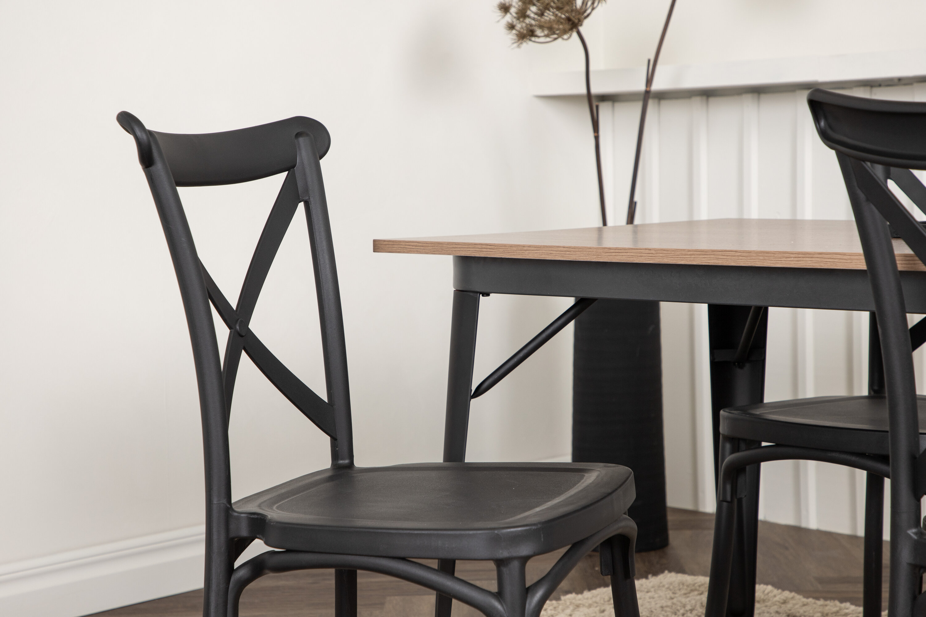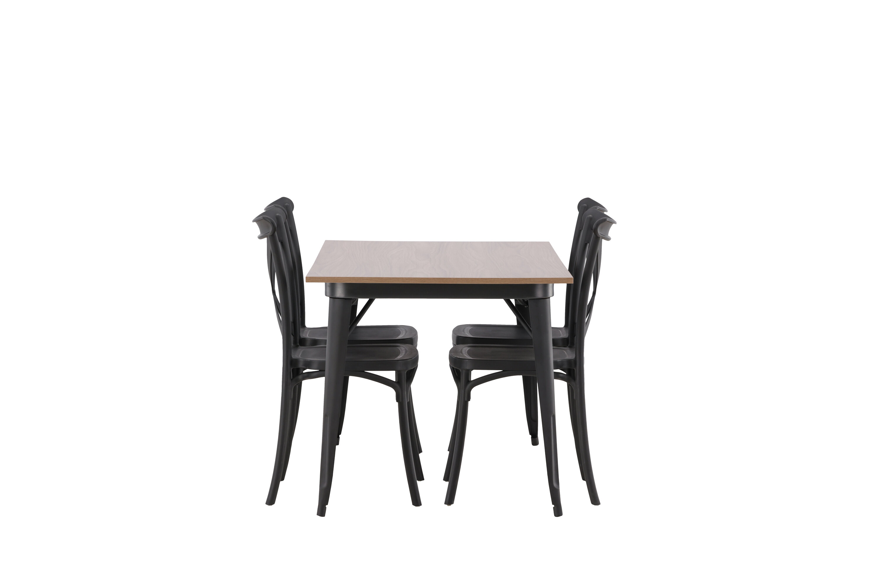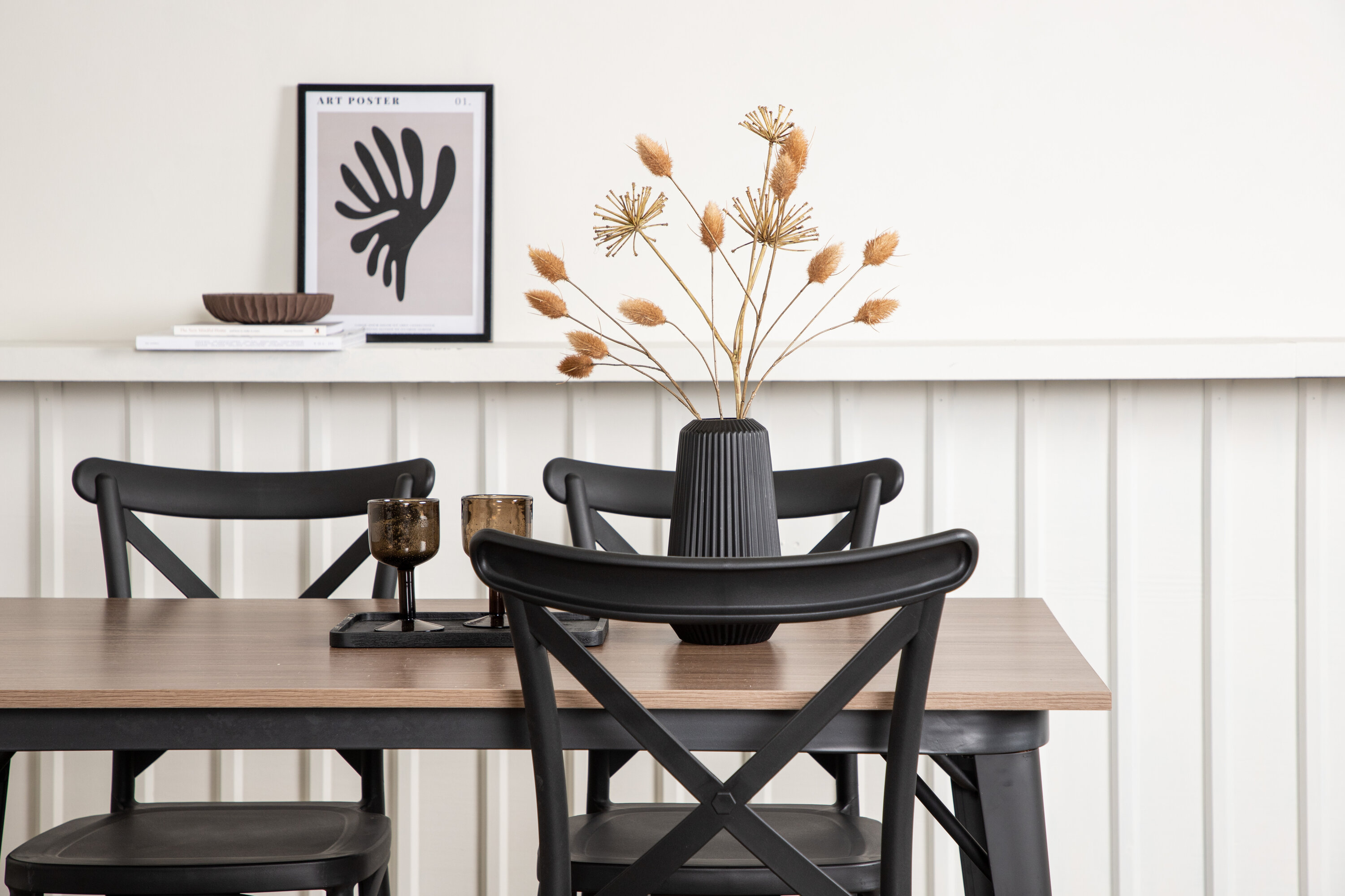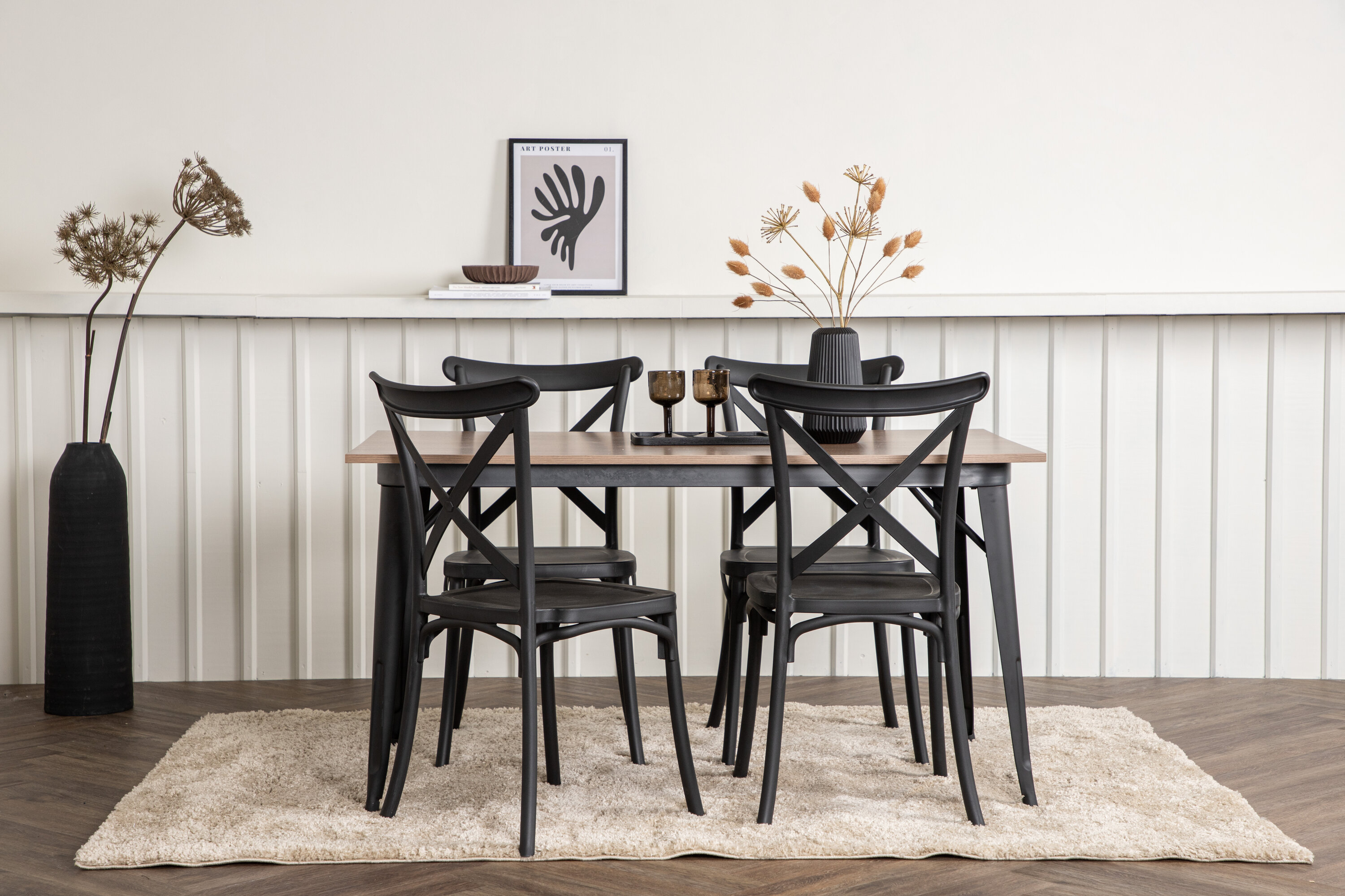 Eine Essgruppe, die klassisches Design und moderne Formen vereint! Der Esstisch aus der Serie Tempe gehört zur Kollektion Venture Home und hat ein auffälliges, skandinavisches Design. Hergestellt mit einer quadratischen Tischplatte aus schwarzem MDF und Tischbeinen aus schwarzem Metall. Hier zusammen mit Esszimmerstühlen aus der Serie Crosett. Die Stühle haben ein nostalgisches Design mit gekreuztem Rücken und geraden Linien, durchweg aus schwarzem Kunststoff. Hier erhalten Sie eine stilvolle Essgruppe, mit der Sie Ihr Zuhause einrichten können!