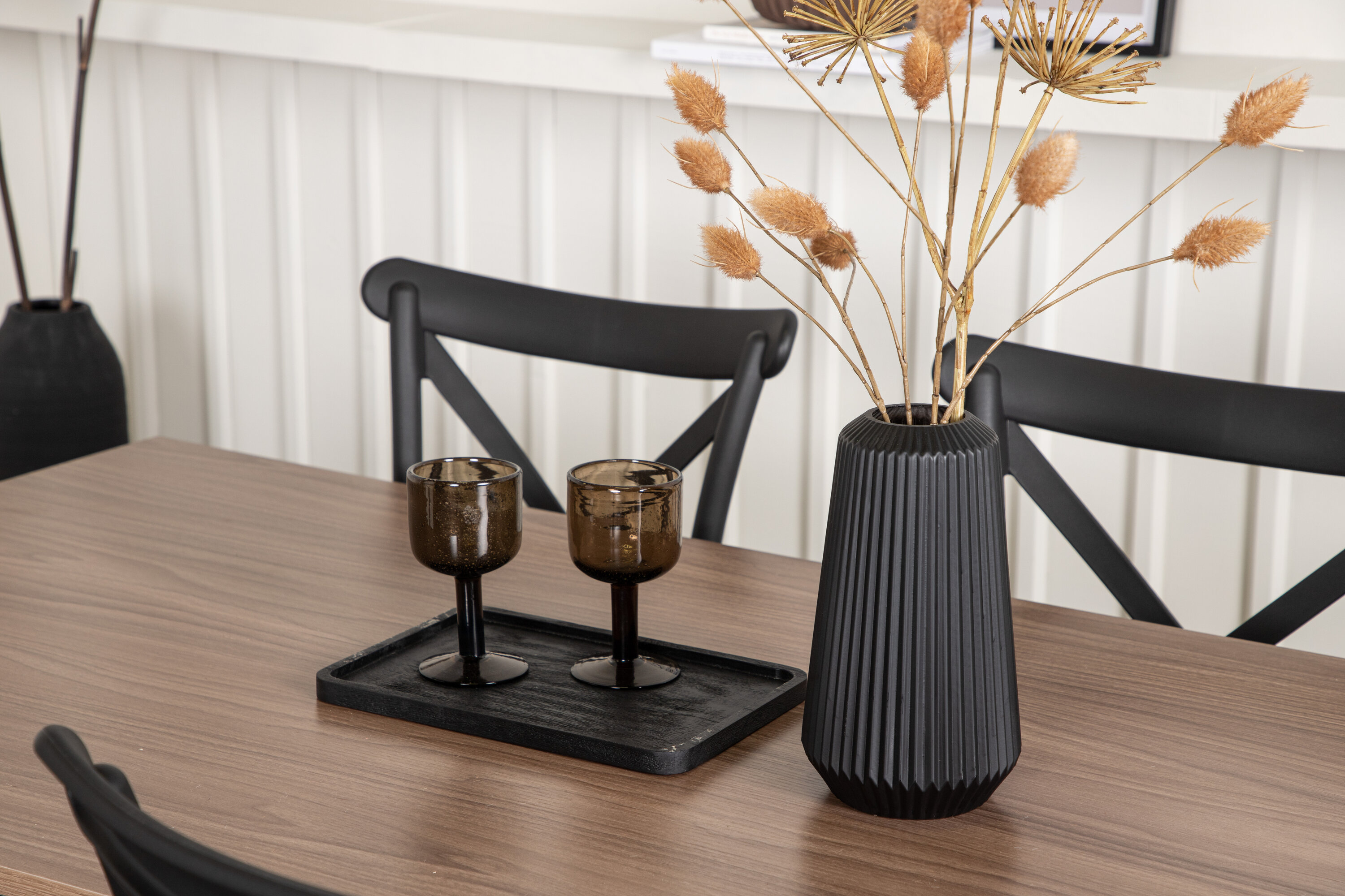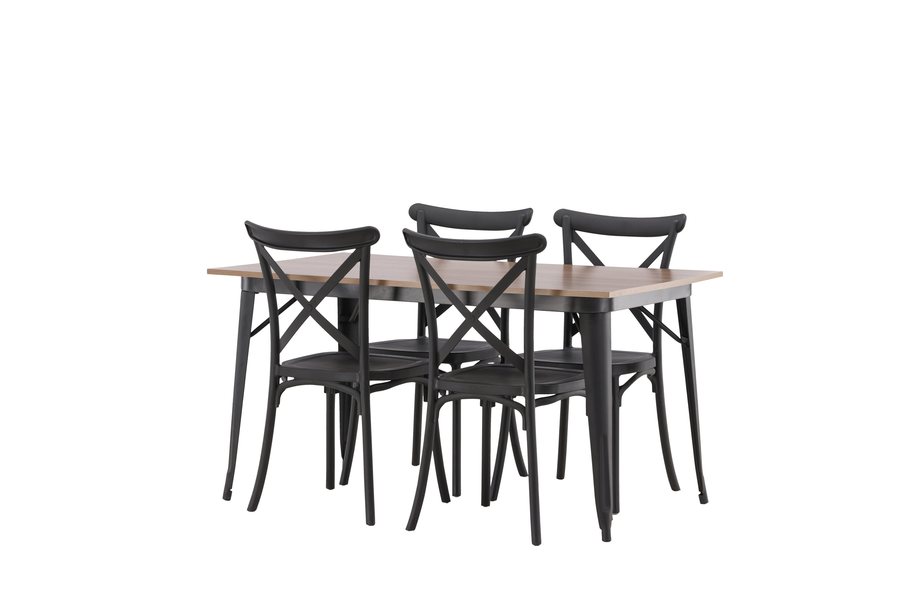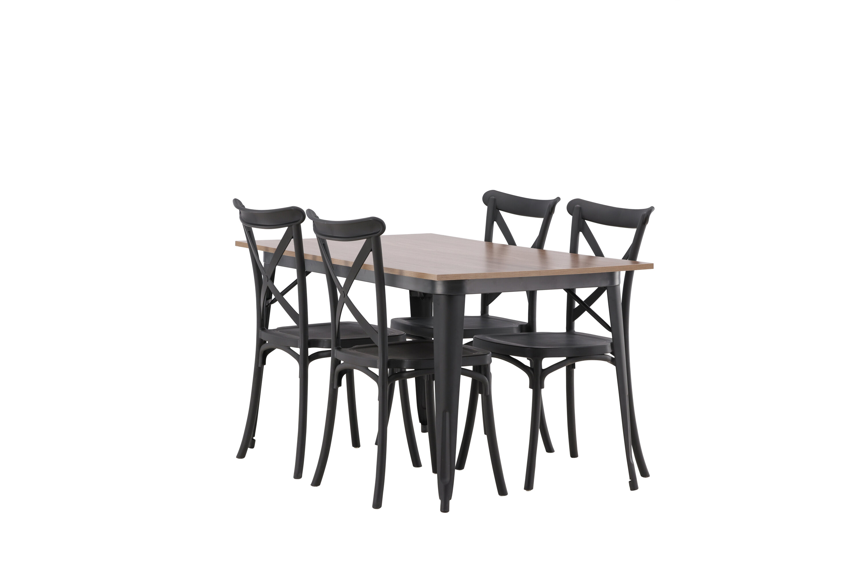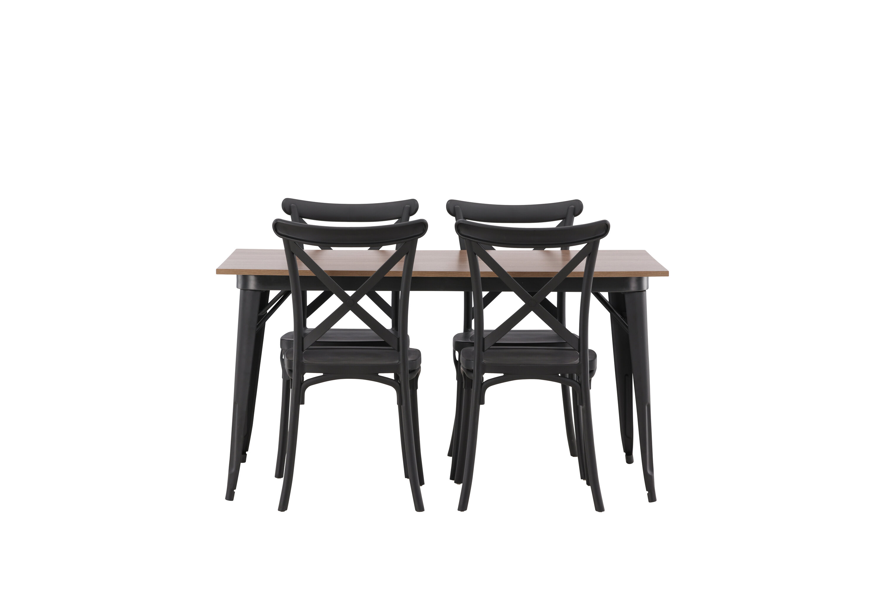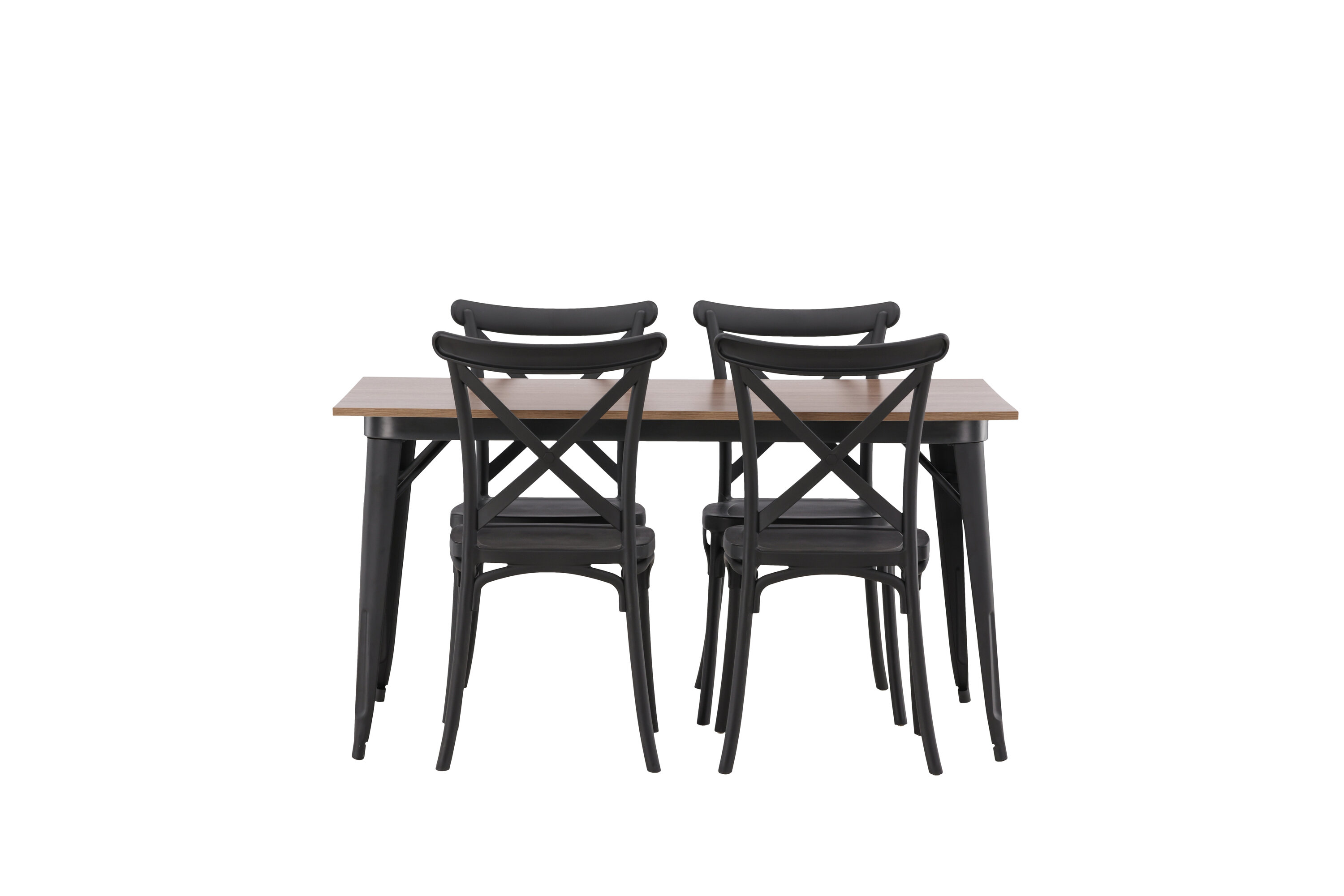 Eine Essgruppe, die klassisches Design und moderne Formen vereint! Der Esstisch aus der Serie Tempe gehört zur Kollektion Venture Home und hat ein auffälliges, skandinavisches Design. Hergestellt mit einer quadratischen Tischplatte aus schwarzem MDF und Tischbeinen aus schwarzem Metall. Hier zusammen mit Esszimmerstühlen aus der Serie Crosett. Die Stühle haben ein nostalgisches Design mit gekreuztem Rücken und geraden Linien, durchweg aus schwarzem Kunststoff. Hier erhalten Sie eine stilvolle Essgruppe, mit der Sie Ihr Zuhause einrichten können!