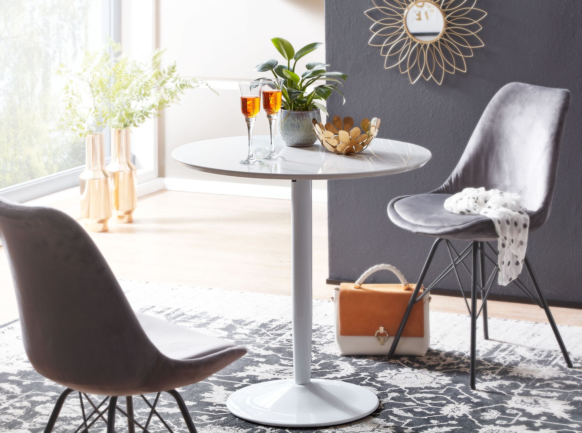 Dieser runde Esstisch vereint Eleganz und Modernität mit seiner weiß hochglänzend lackierten MDF-Platte und dem trompetenförmigen weißen Metallgestell. Ideal für kleine Räume oder Küchenbereiche, bietet er bequem Platz für zwei Personen.