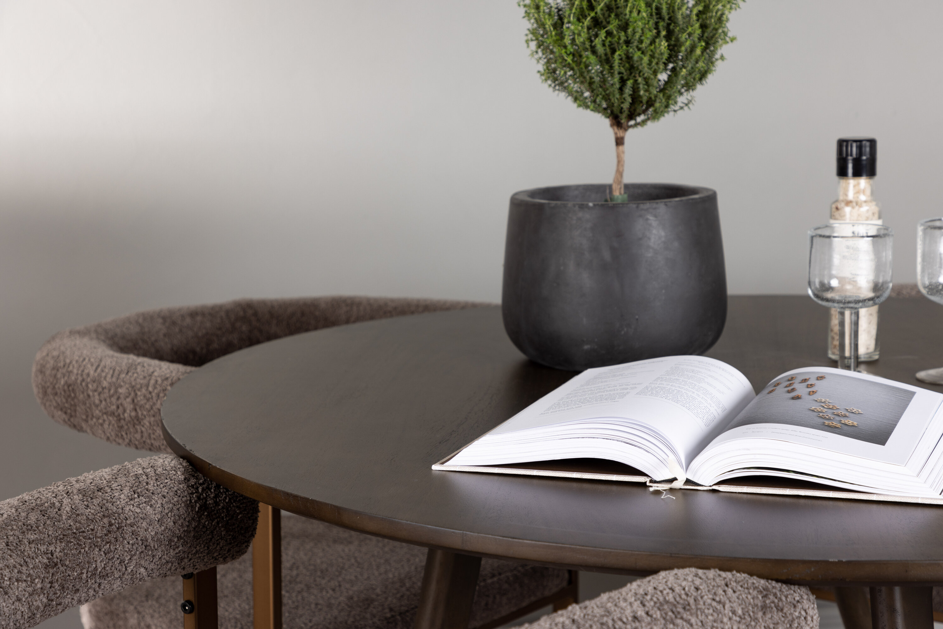 Ergänzt wird der Esstisch hier durch unsere trendigen Morning-Essstühle. Der Stuhl verbindet Komfort und schlichte Eleganz auf bestmögliche Weise. Die abgerundete Rückenlehne und der gepolsterte Sitz, der mit grauem Boucléstoff gepolstert ist, sorgen für ein luxuriöses und einladendes Gefühl. Der braune Stahlrahmen hat ein minimalistisches Design, das den Tisch perfekt ergänzt.