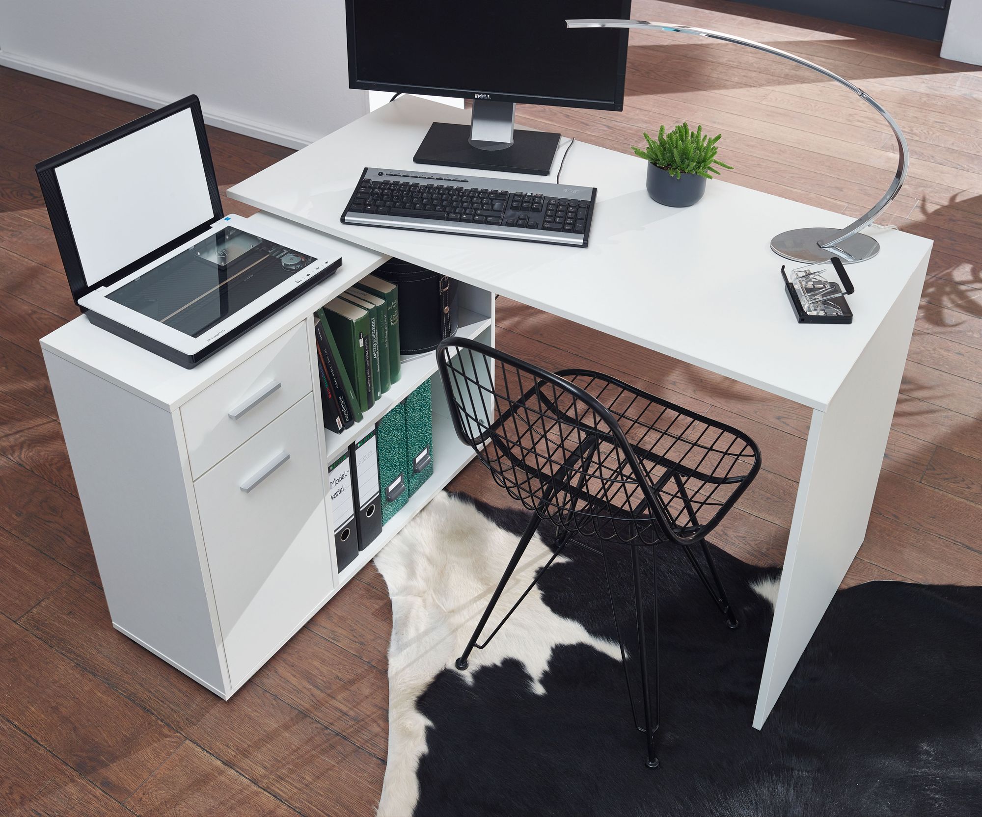 Moderner Design-Eckschreibtisch mit integriertem Regal – die ideale Kombination aus Funktionalität und Stil für Ihr Zuhause oder Büro.